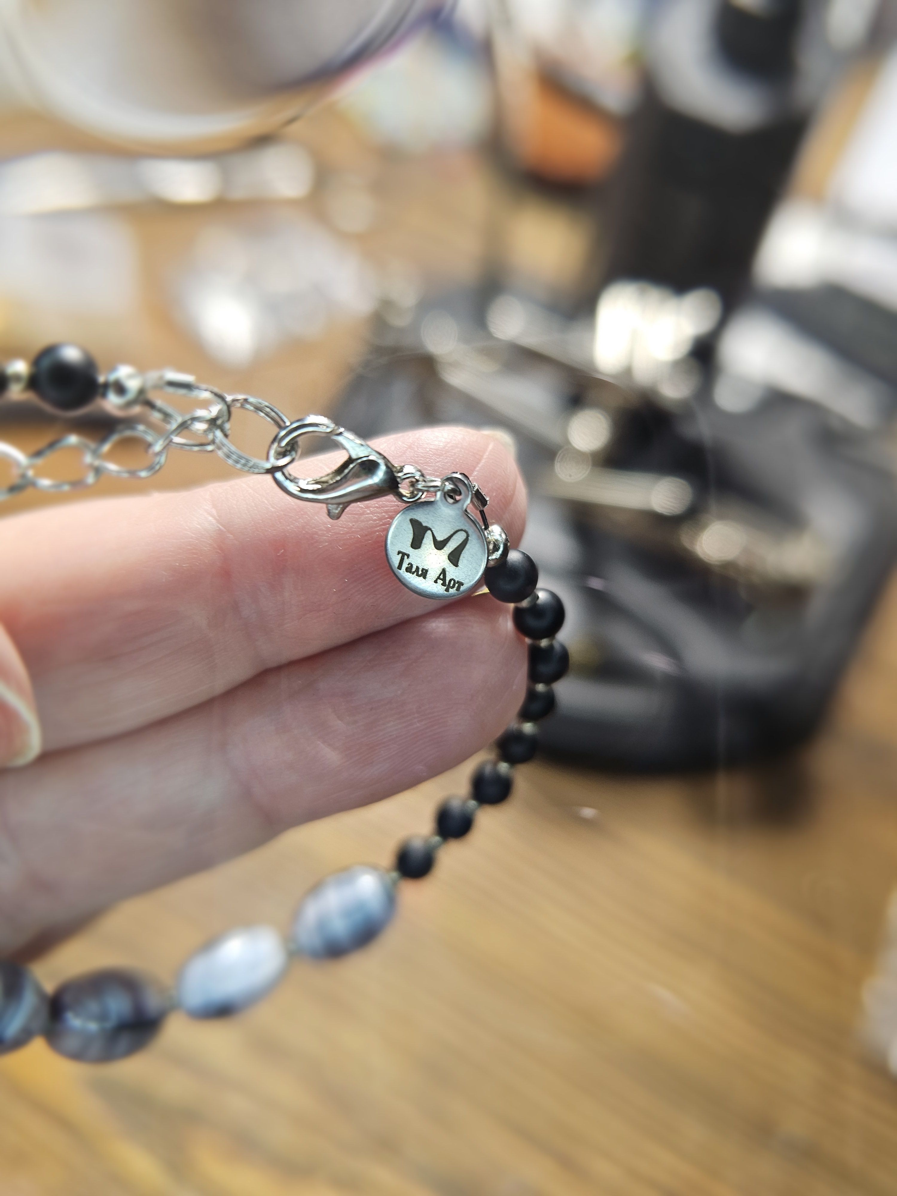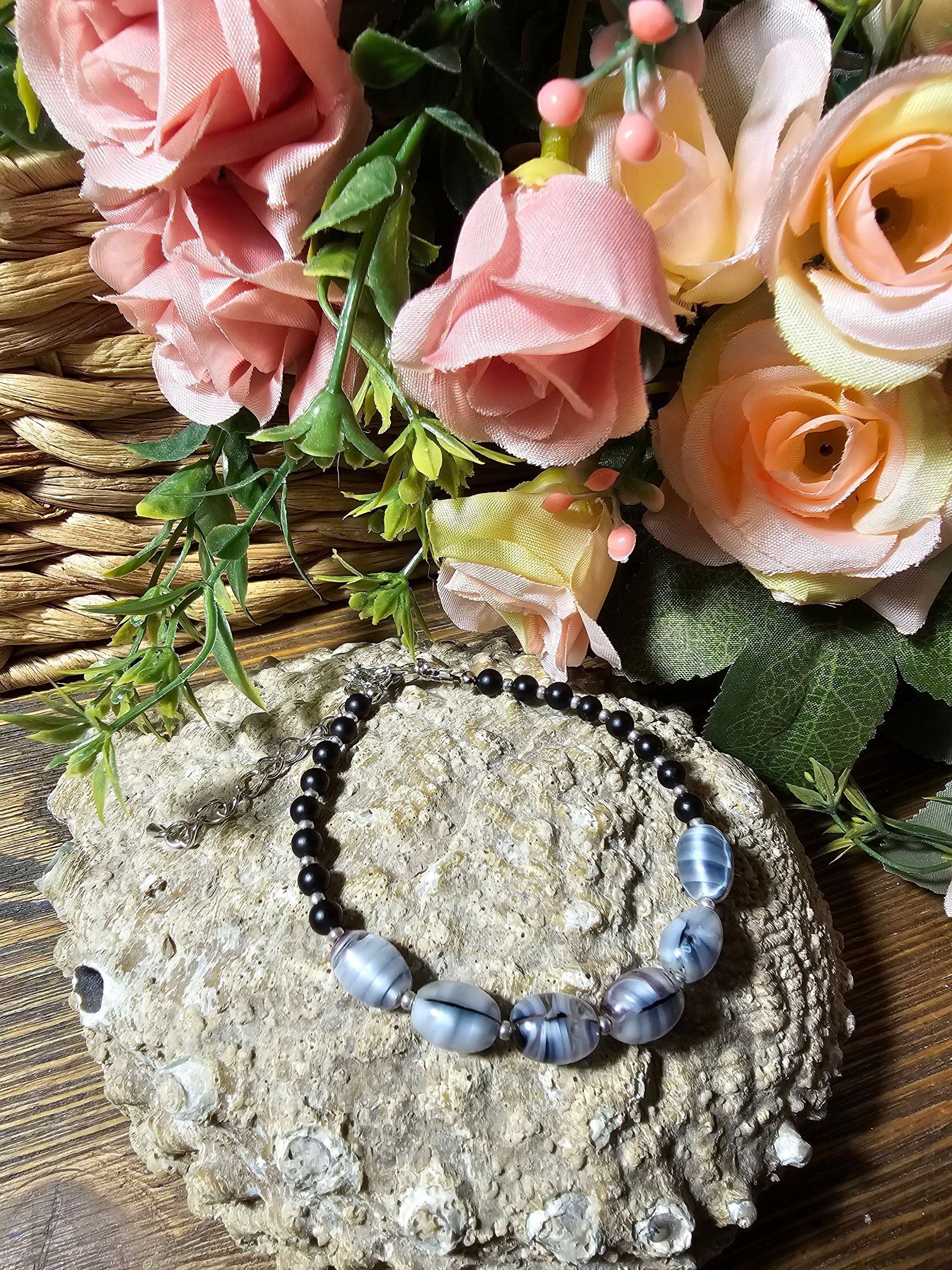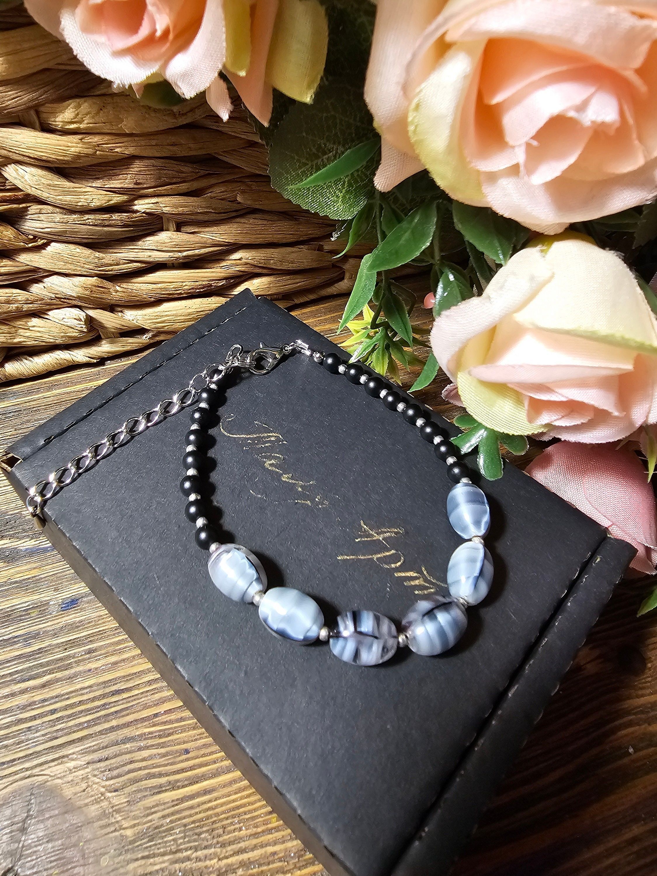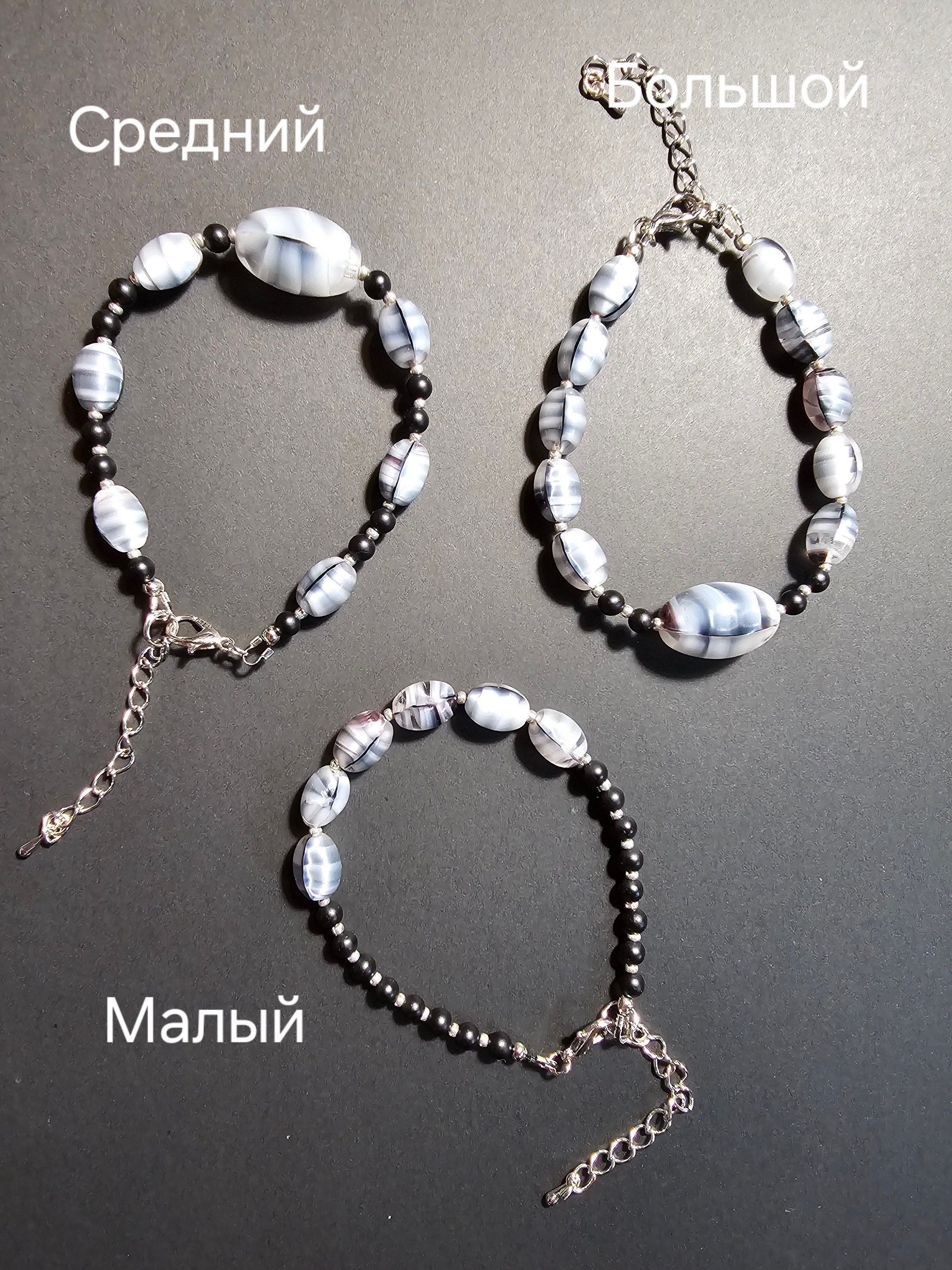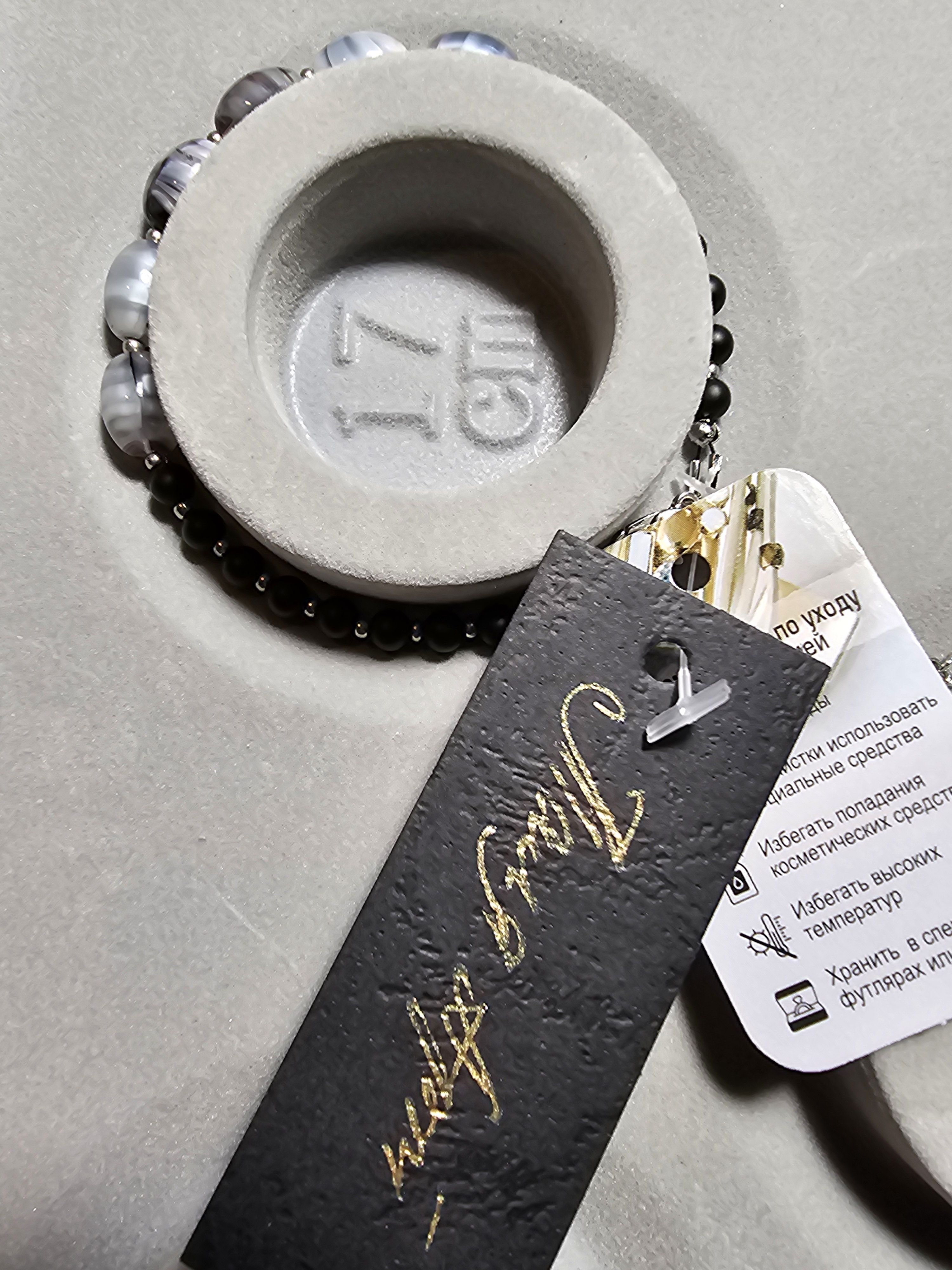 Браслет, состоящий из из разноцветных полудрагоценных камней. Камни имеют овальную и округлую форму и выложены в цепочку. Между камнями также размещены небольшие светлые бусины натурального жемчуга. Магнитная застежка золотистого цвета. Бусины равномерно нанизаны, создавая плавный переход оттенков.