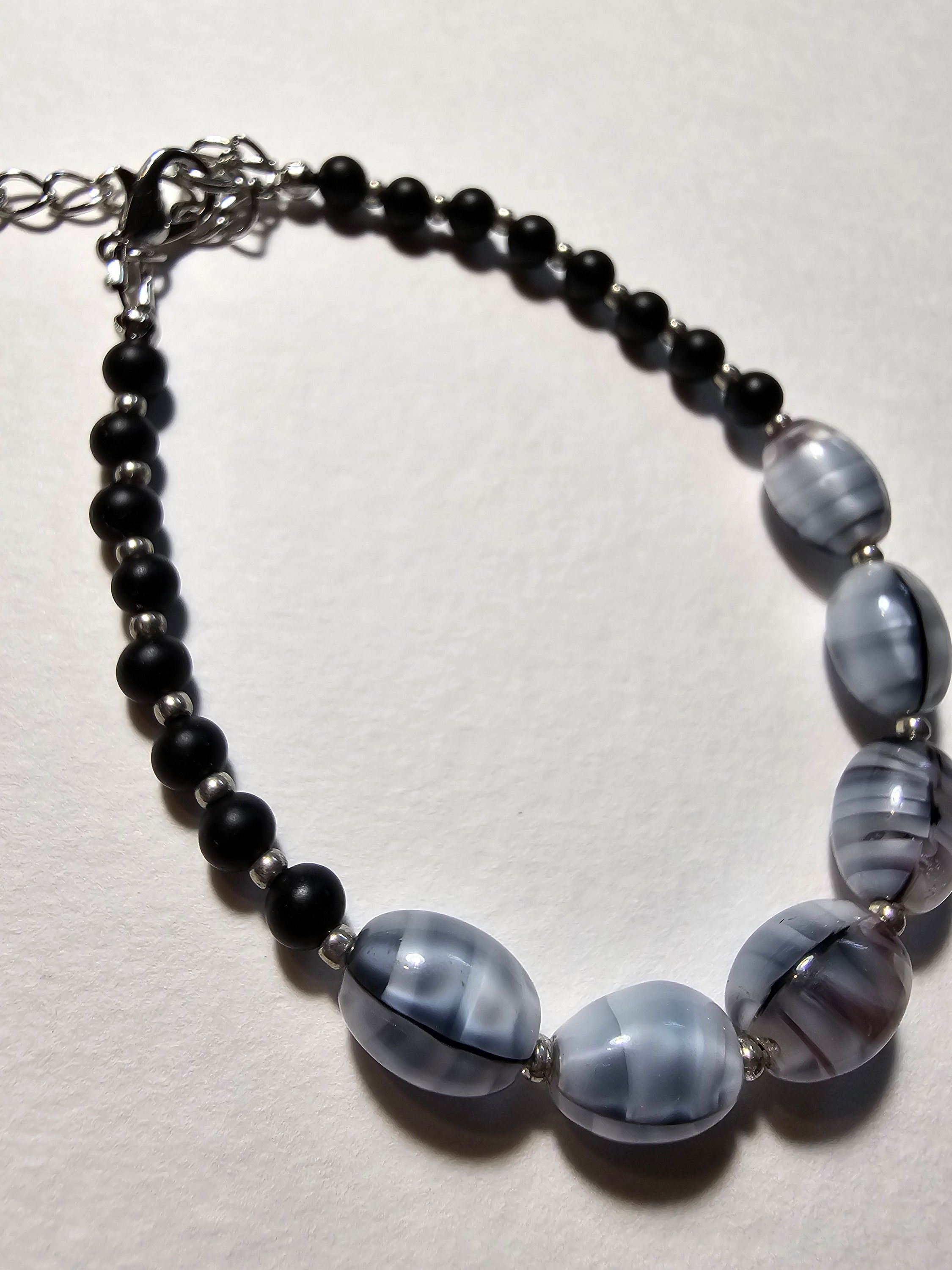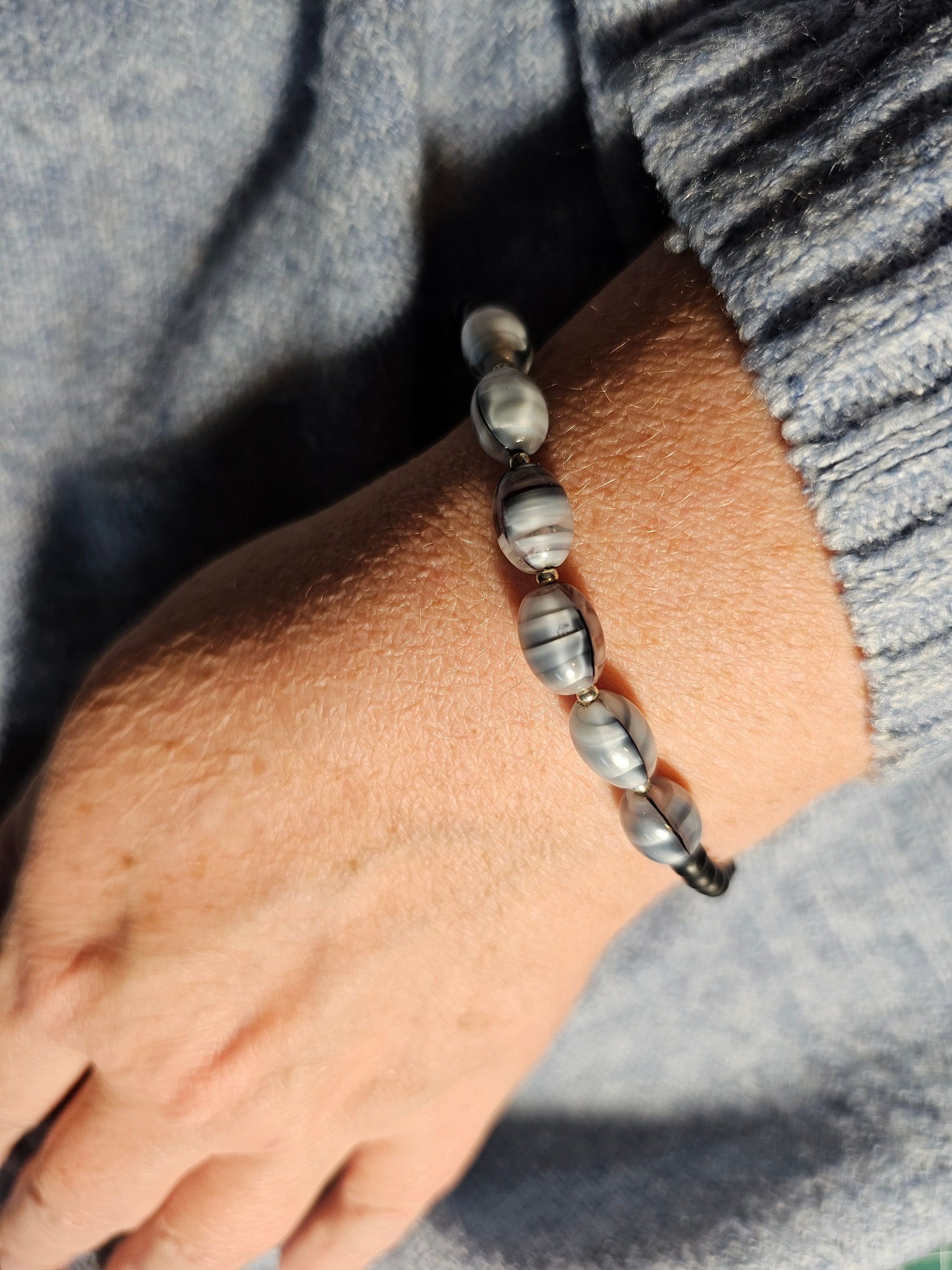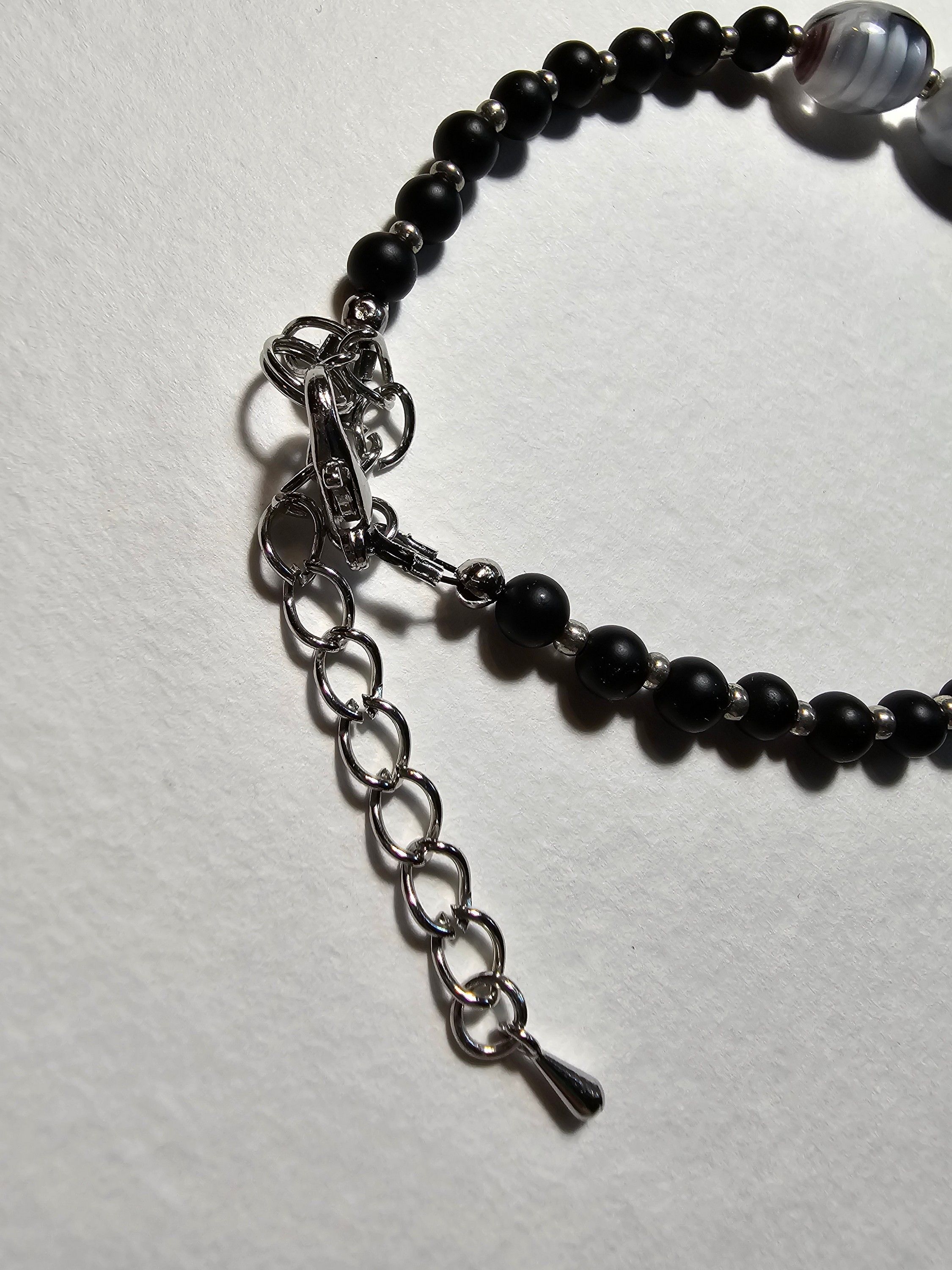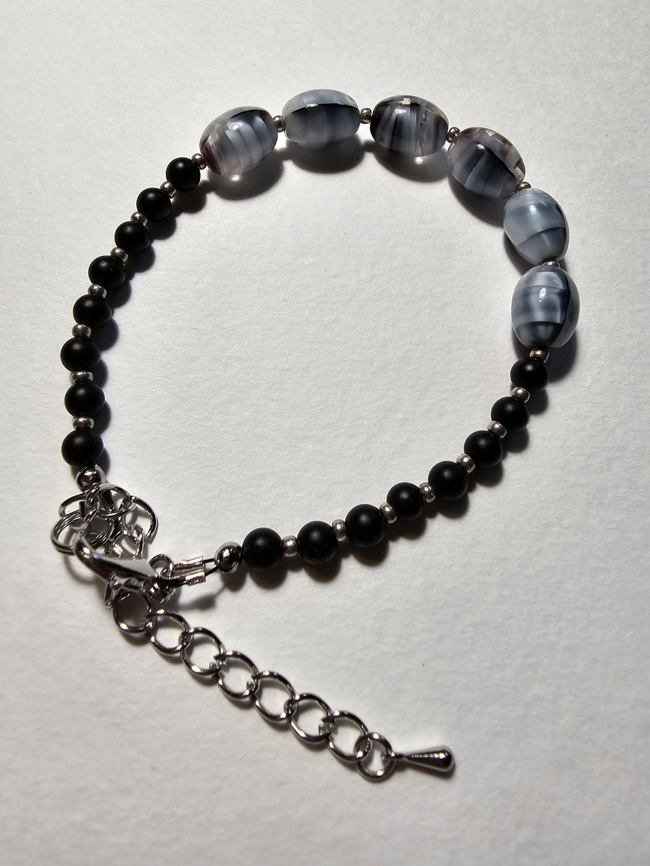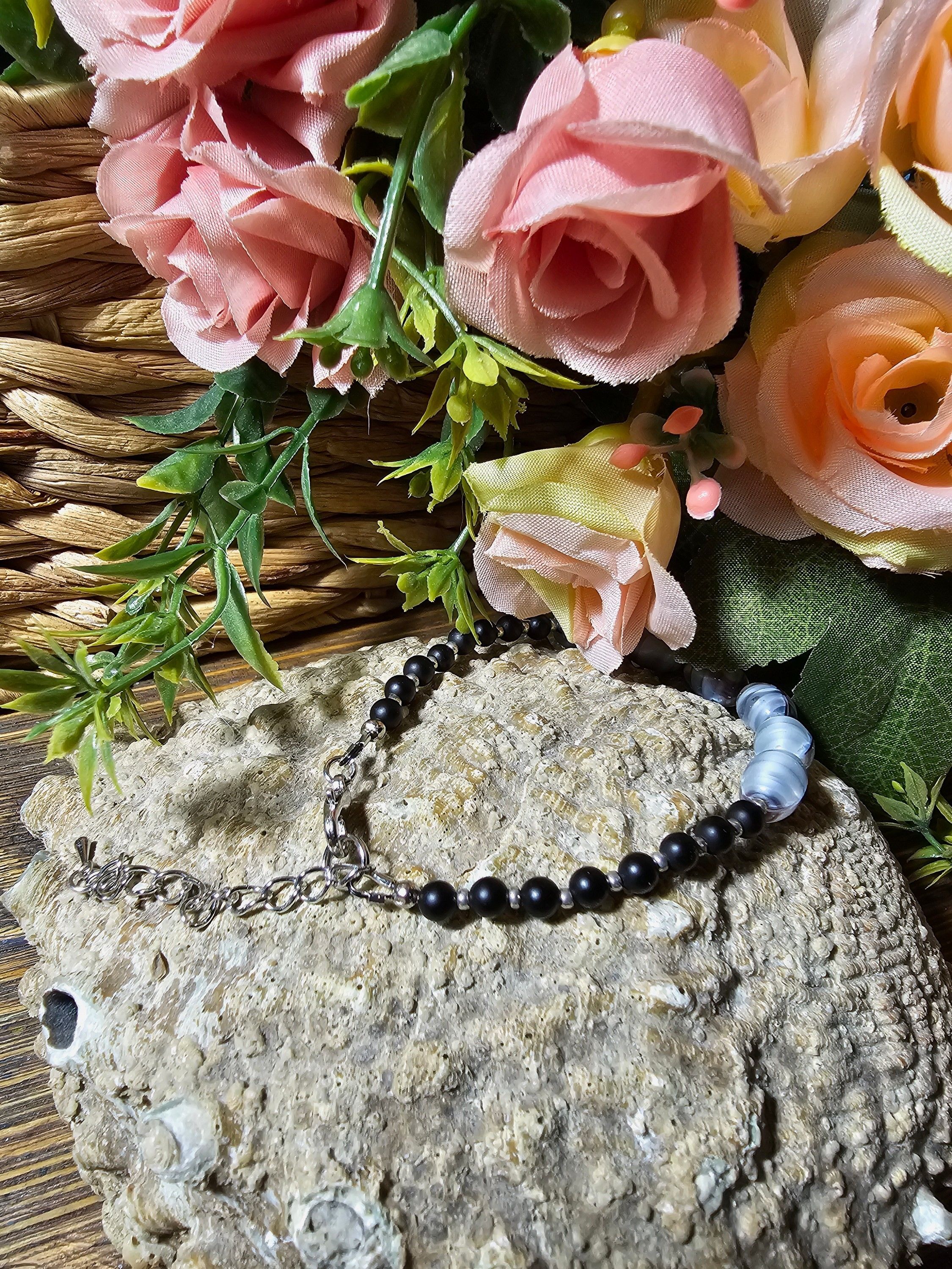 Браслет, состоящий из из разноцветных полудрагоценных камней. Камни имеют овальную и округлую форму и выложены в цепочку. Между камнями также размещены небольшие светлые бусины натурального жемчуга. Магнитная застежка золотистого цвета. Бусины равномерно нанизаны, создавая плавный переход оттенков.