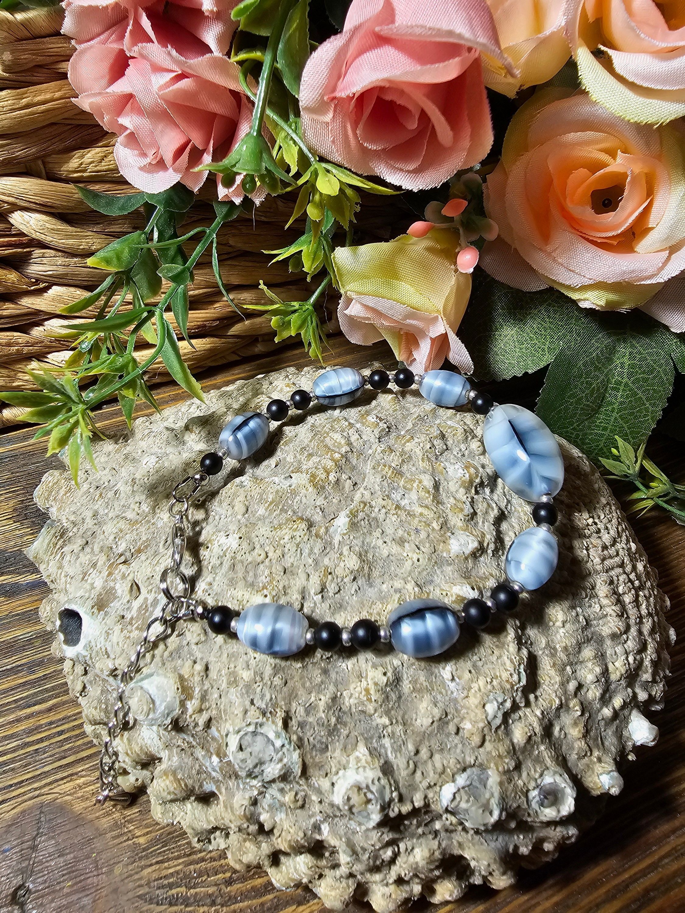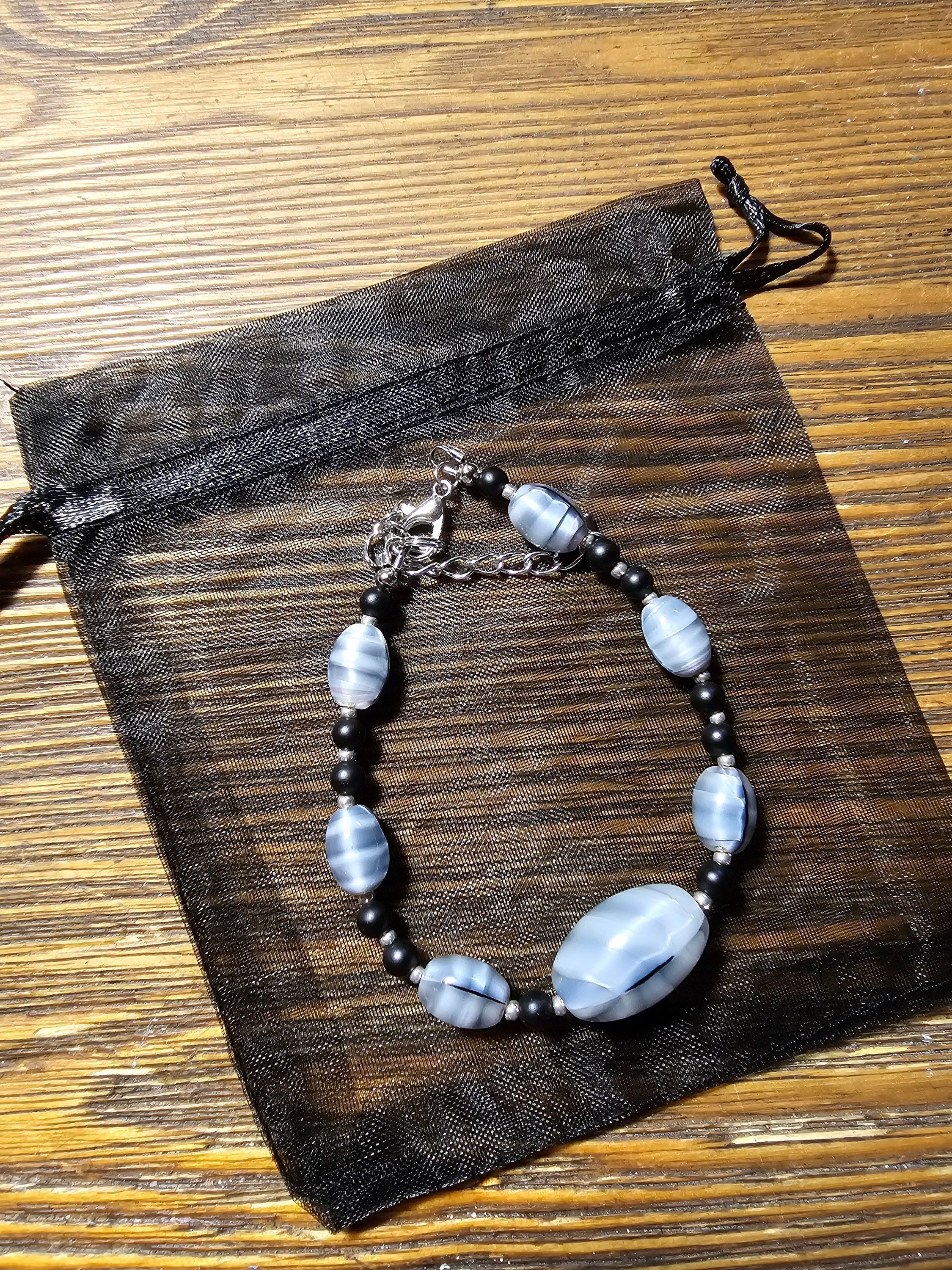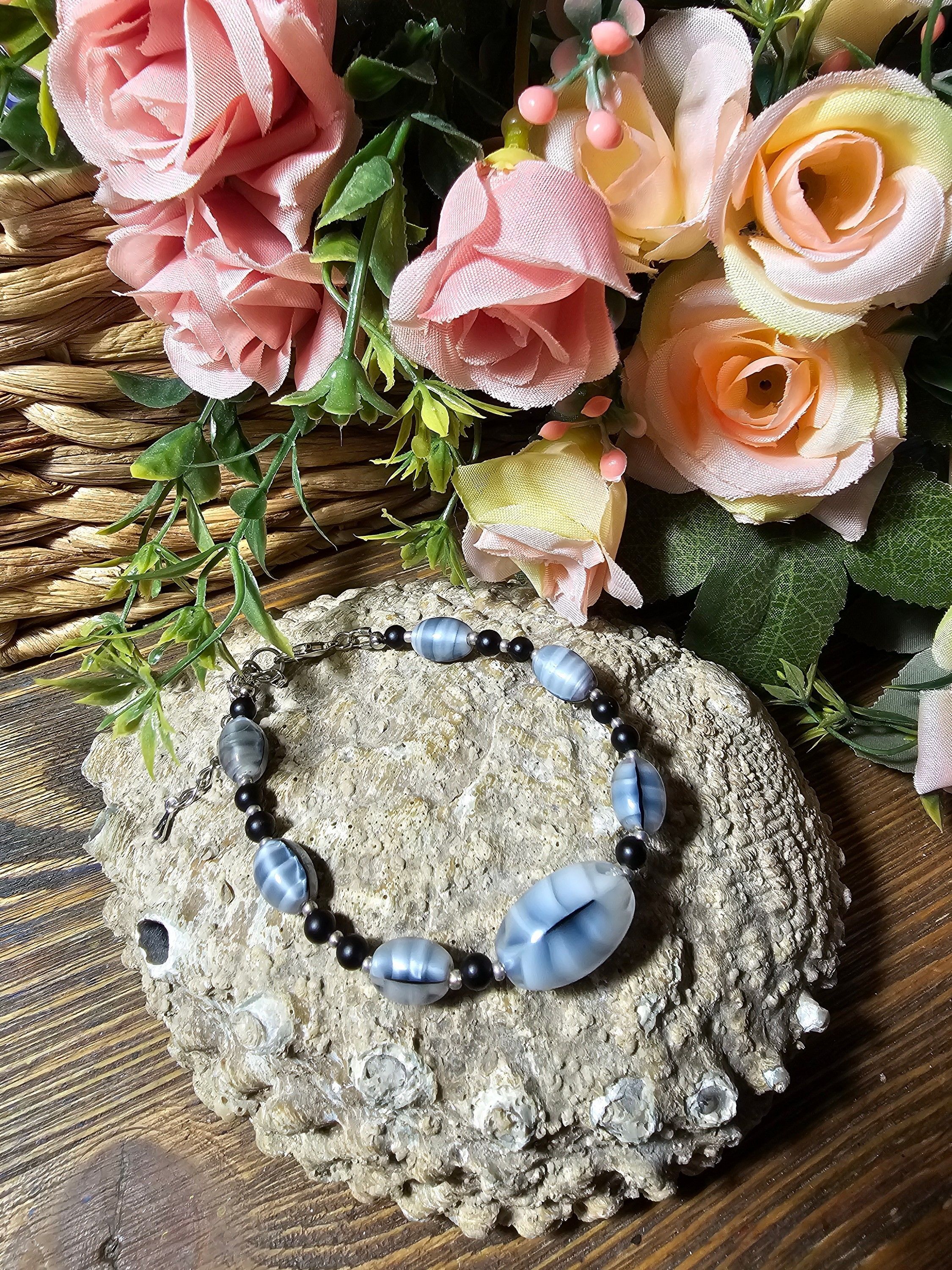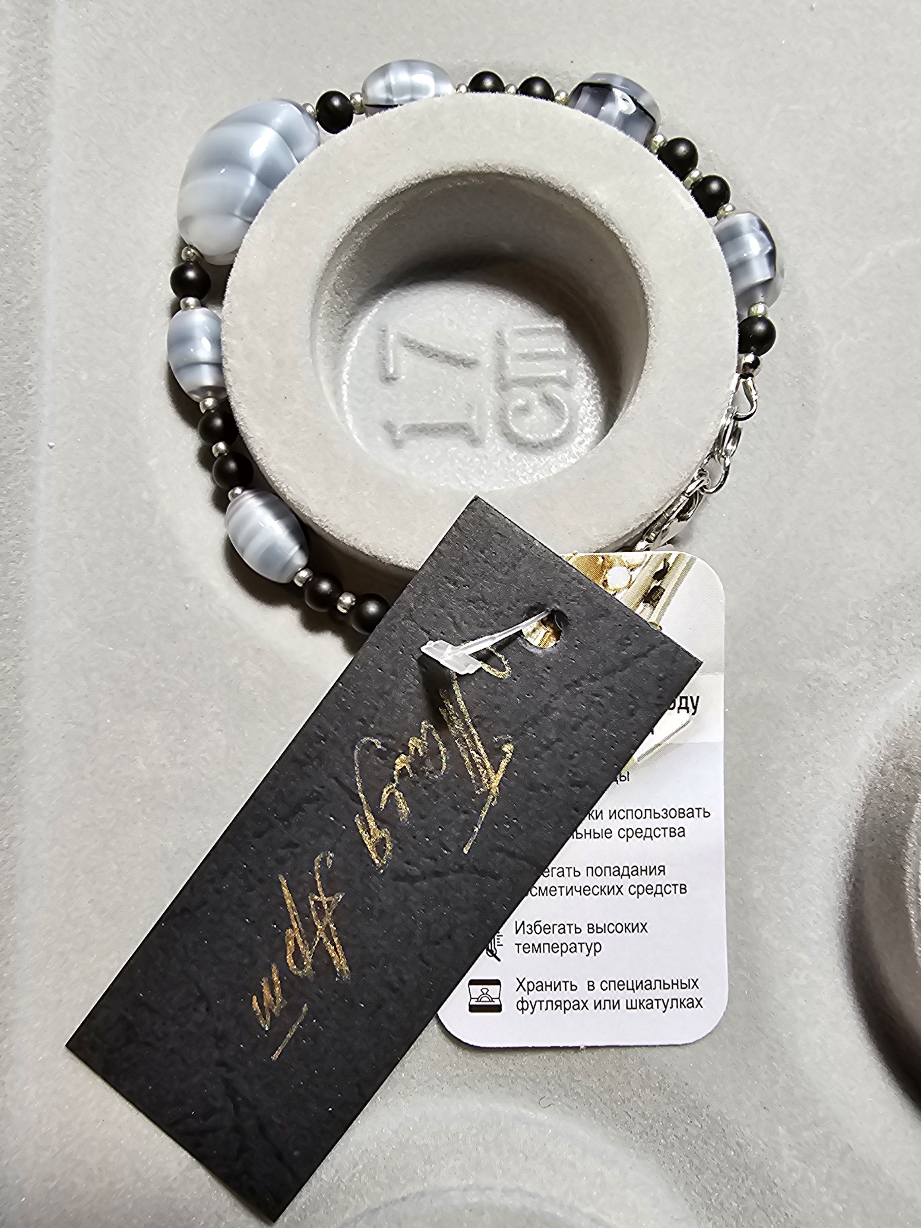 Браслет, состоящий из из разноцветных полудрагоценных камней. Камни имеют овальную и округлую форму и выложены в цепочку. Между камнями также размещены небольшие светлые бусины натурального жемчуга. Магнитная застежка золотистого цвета. Бусины равномерно нанизаны, создавая плавный переход оттенков.