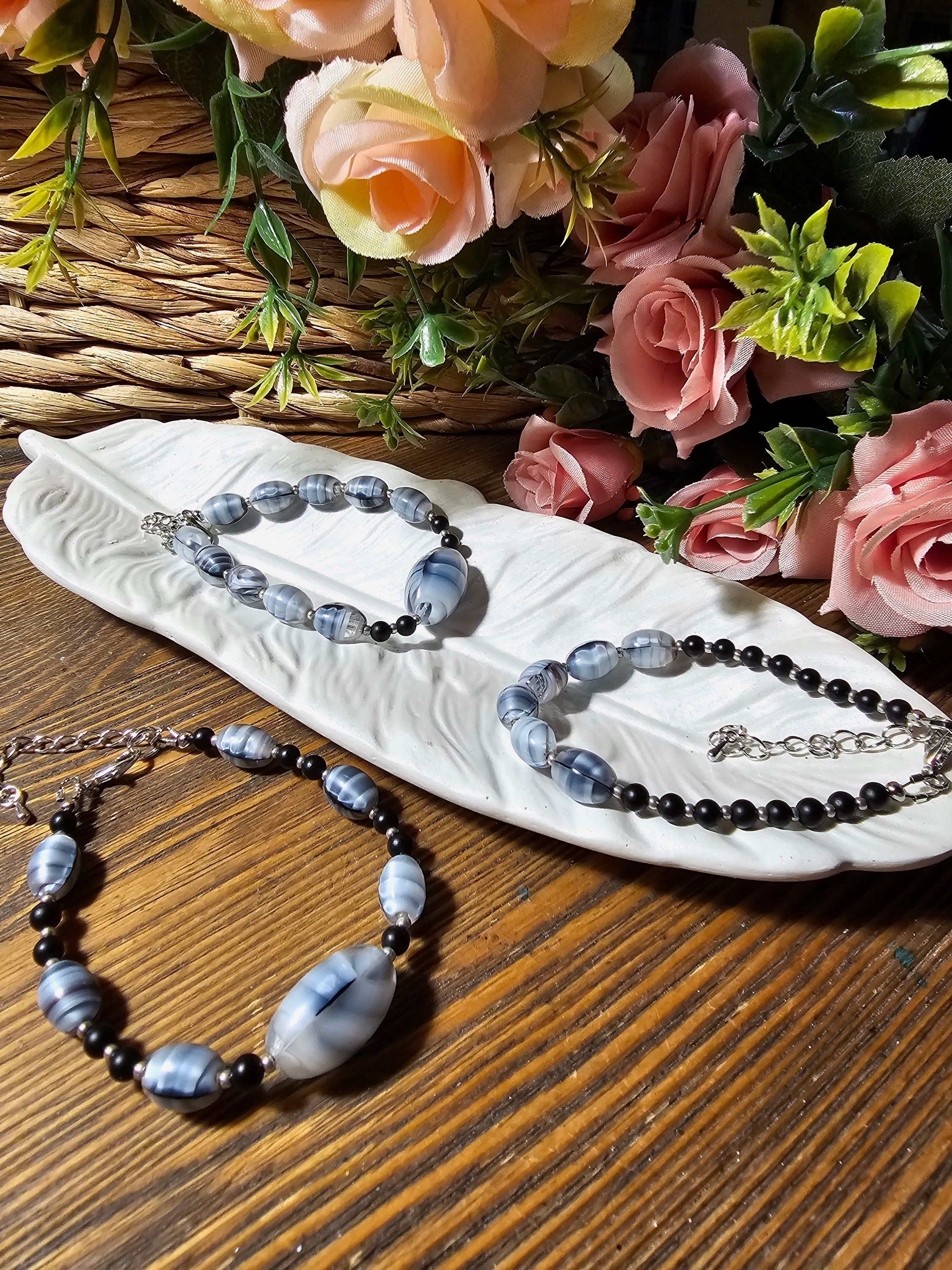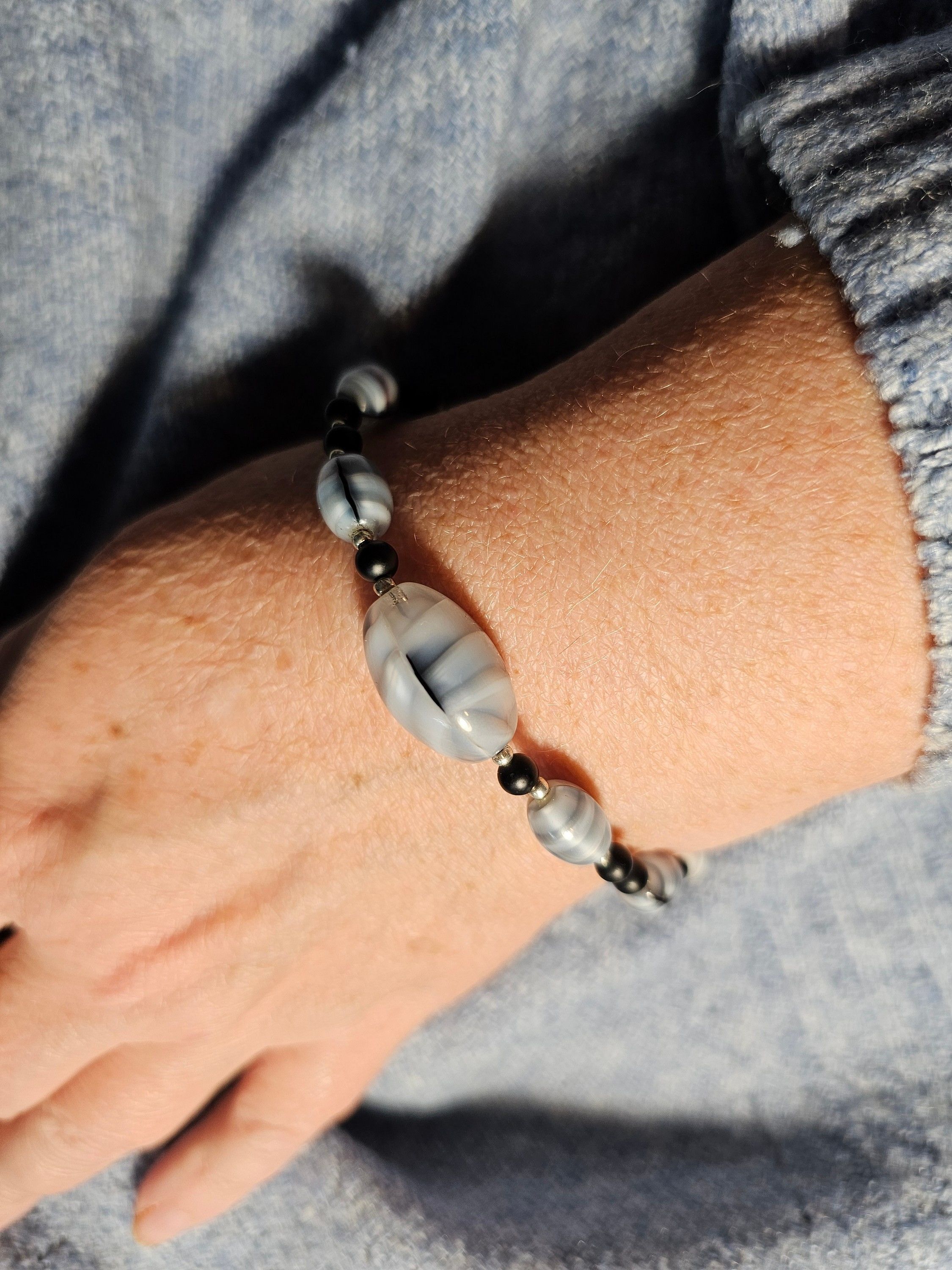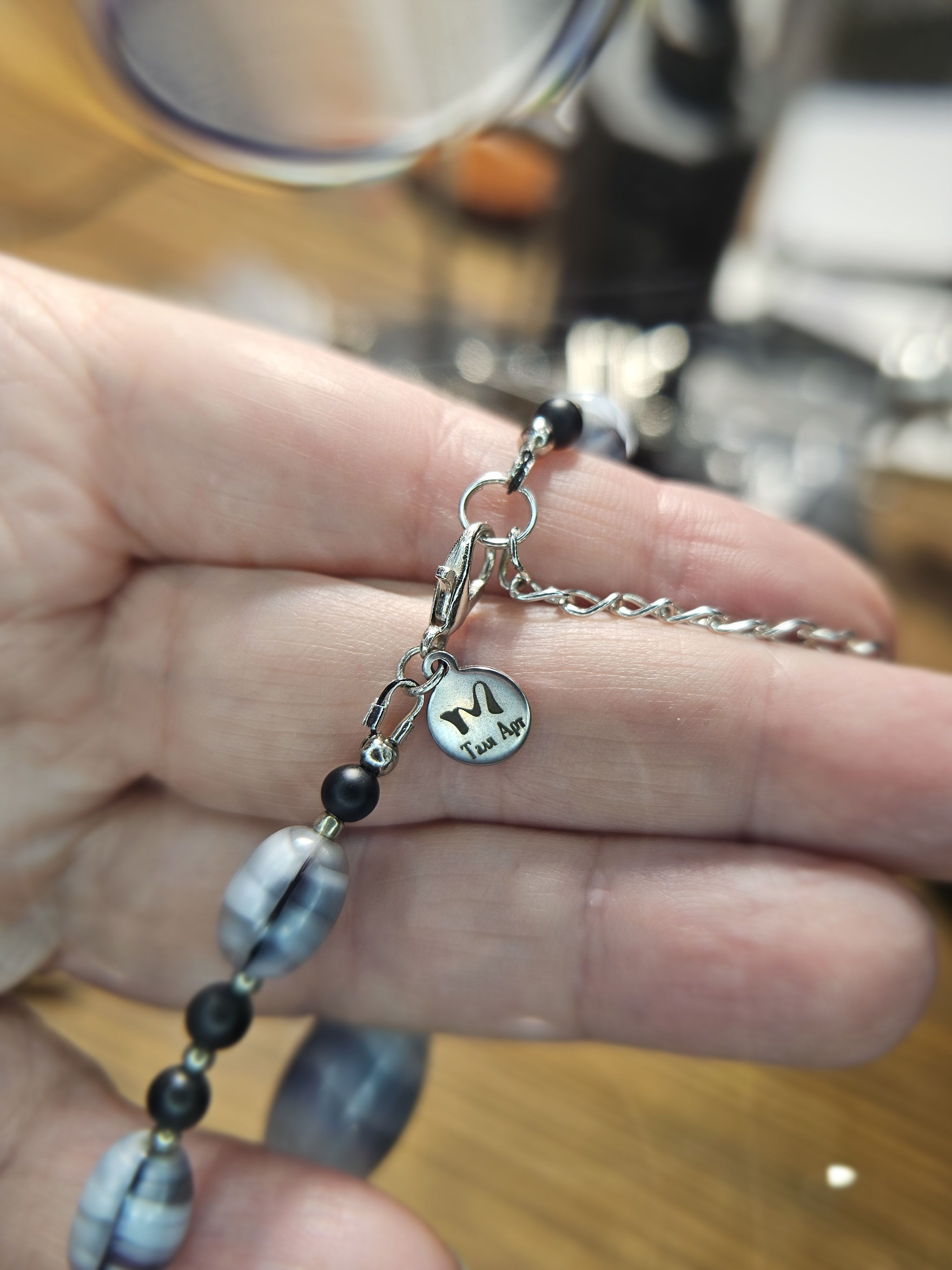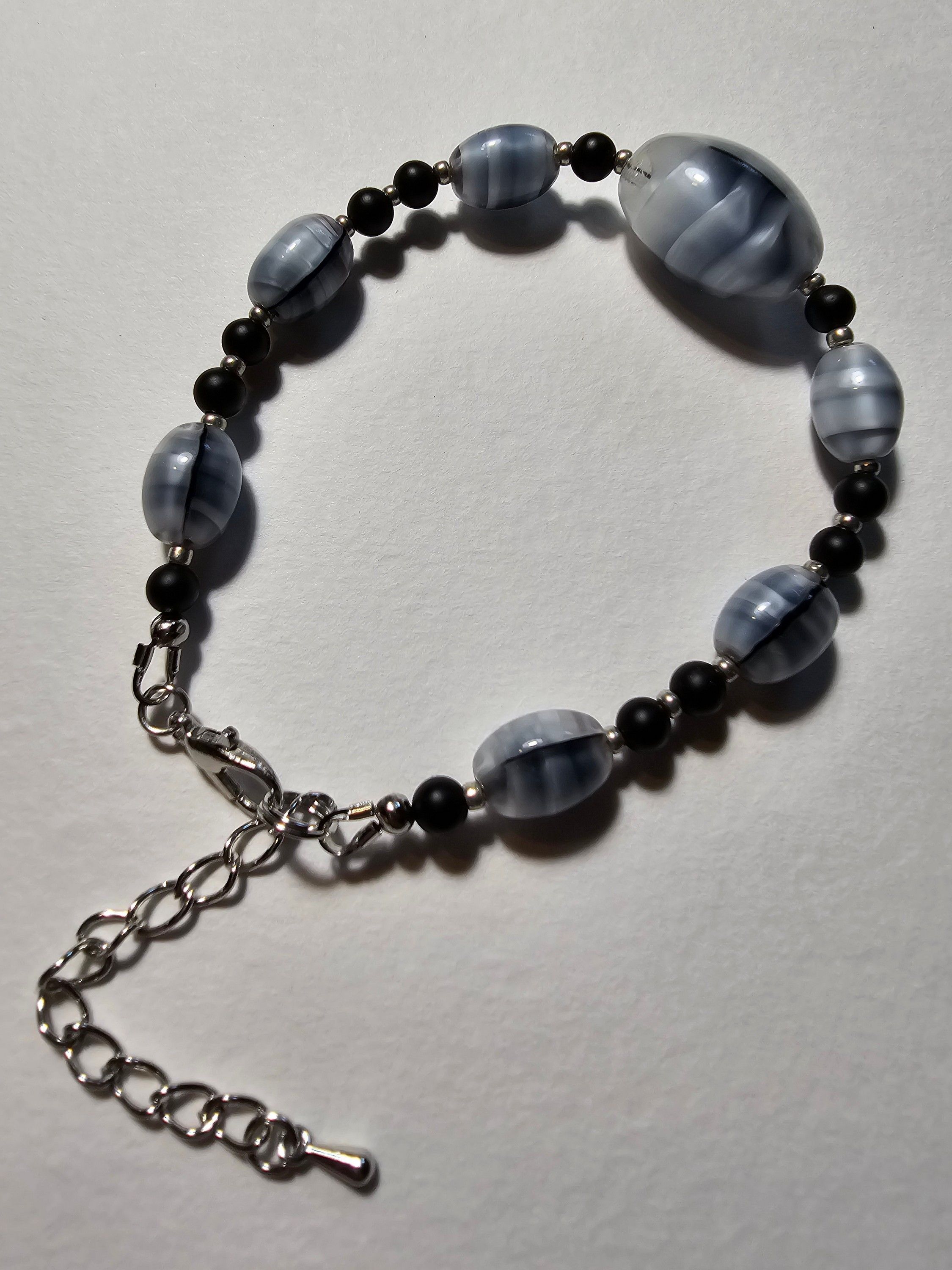 Браслет, состоящий из из разноцветных полудрагоценных камней. Камни имеют овальную и округлую форму и выложены в цепочку. Между камнями также размещены небольшие светлые бусины натурального жемчуга. Магнитная застежка золотистого цвета. Бусины равномерно нанизаны, создавая плавный переход оттенков.