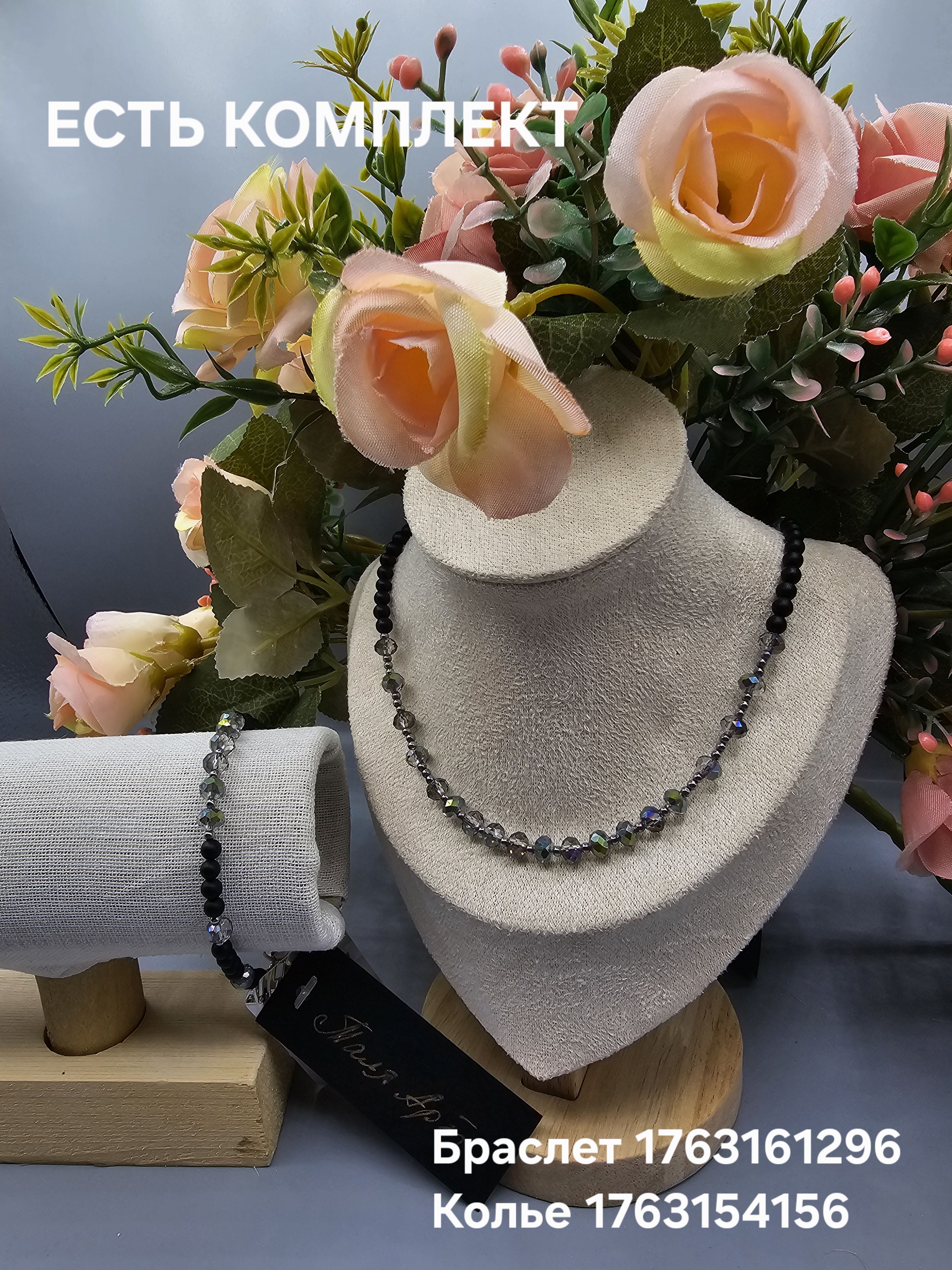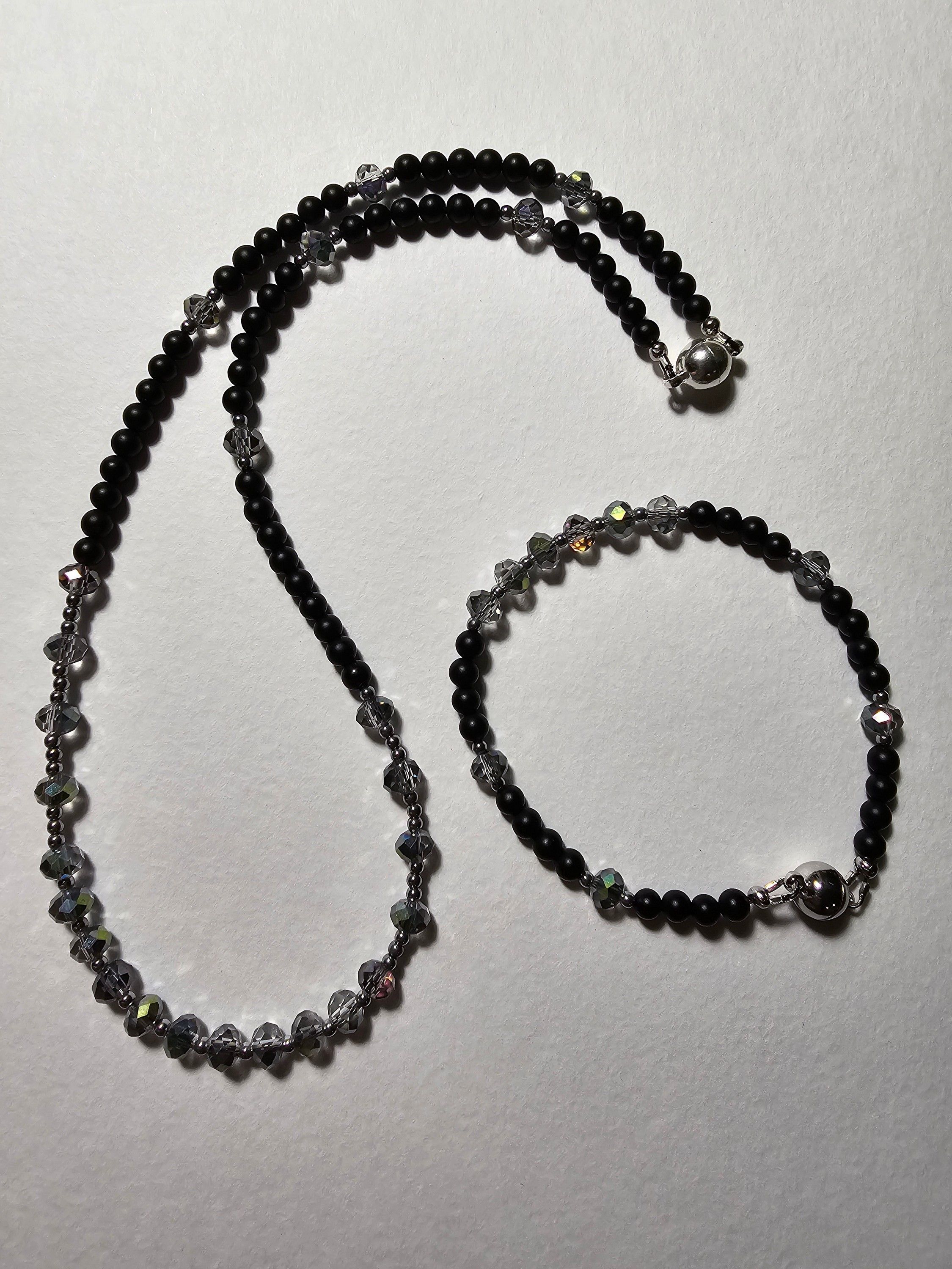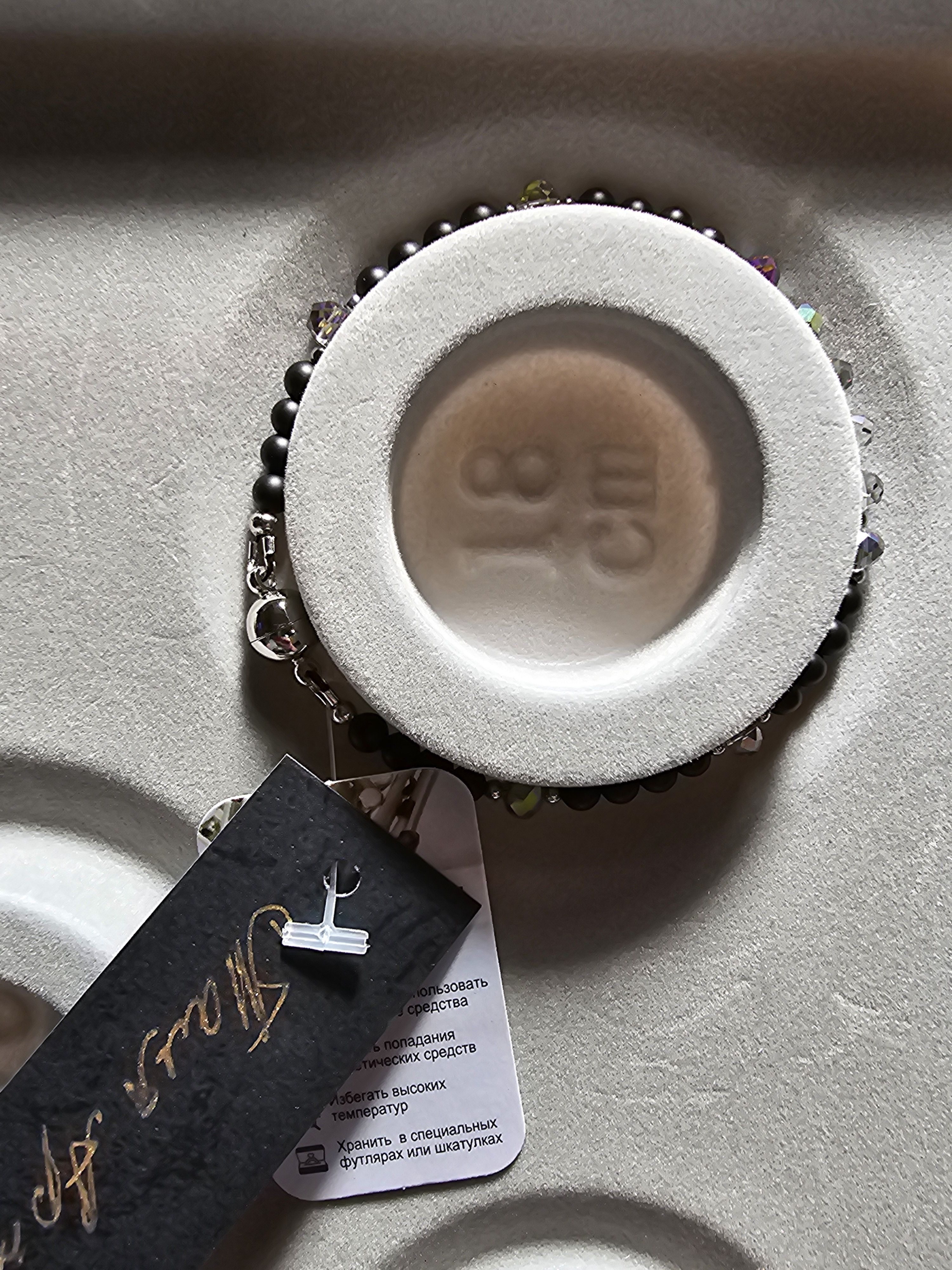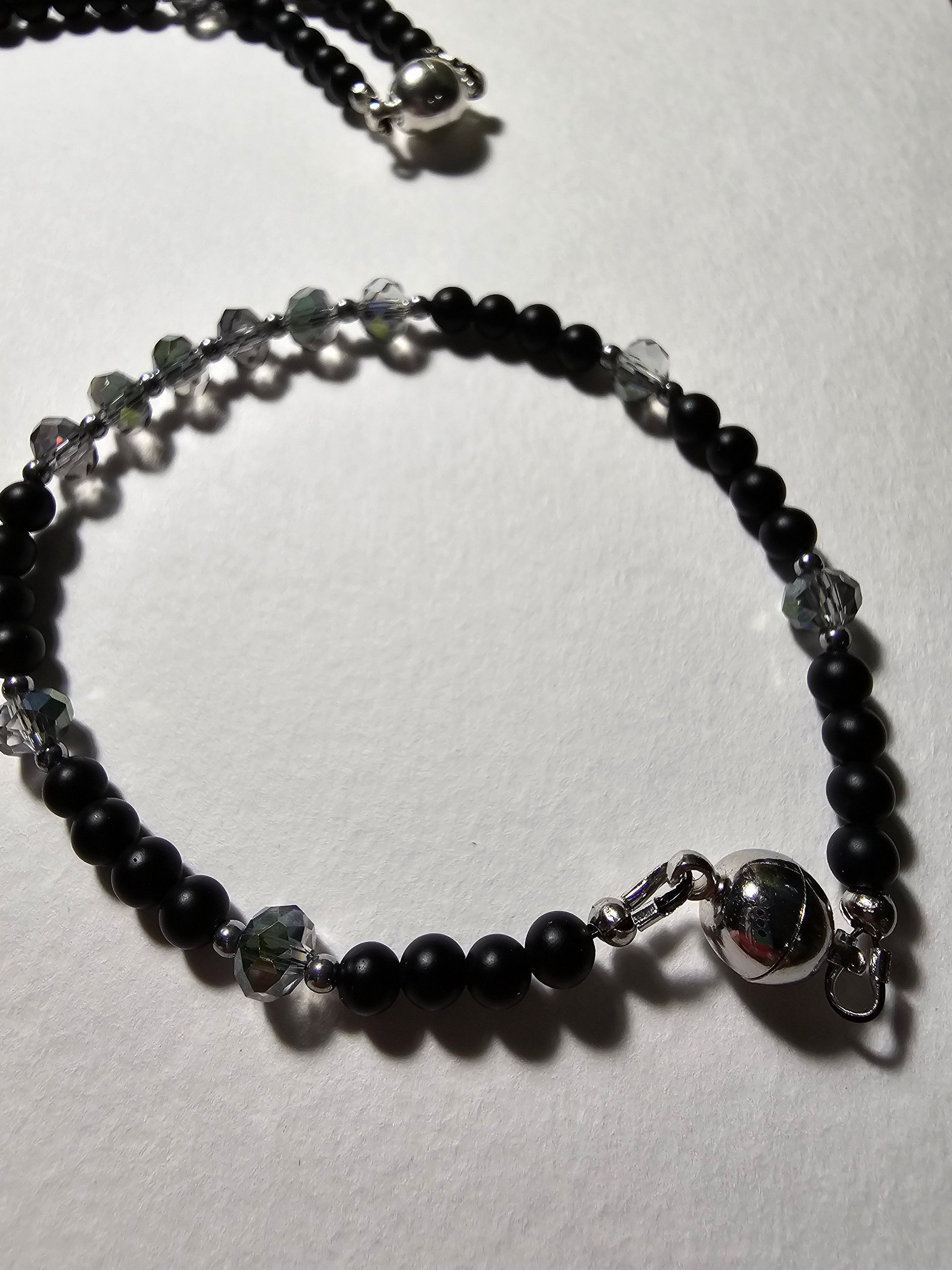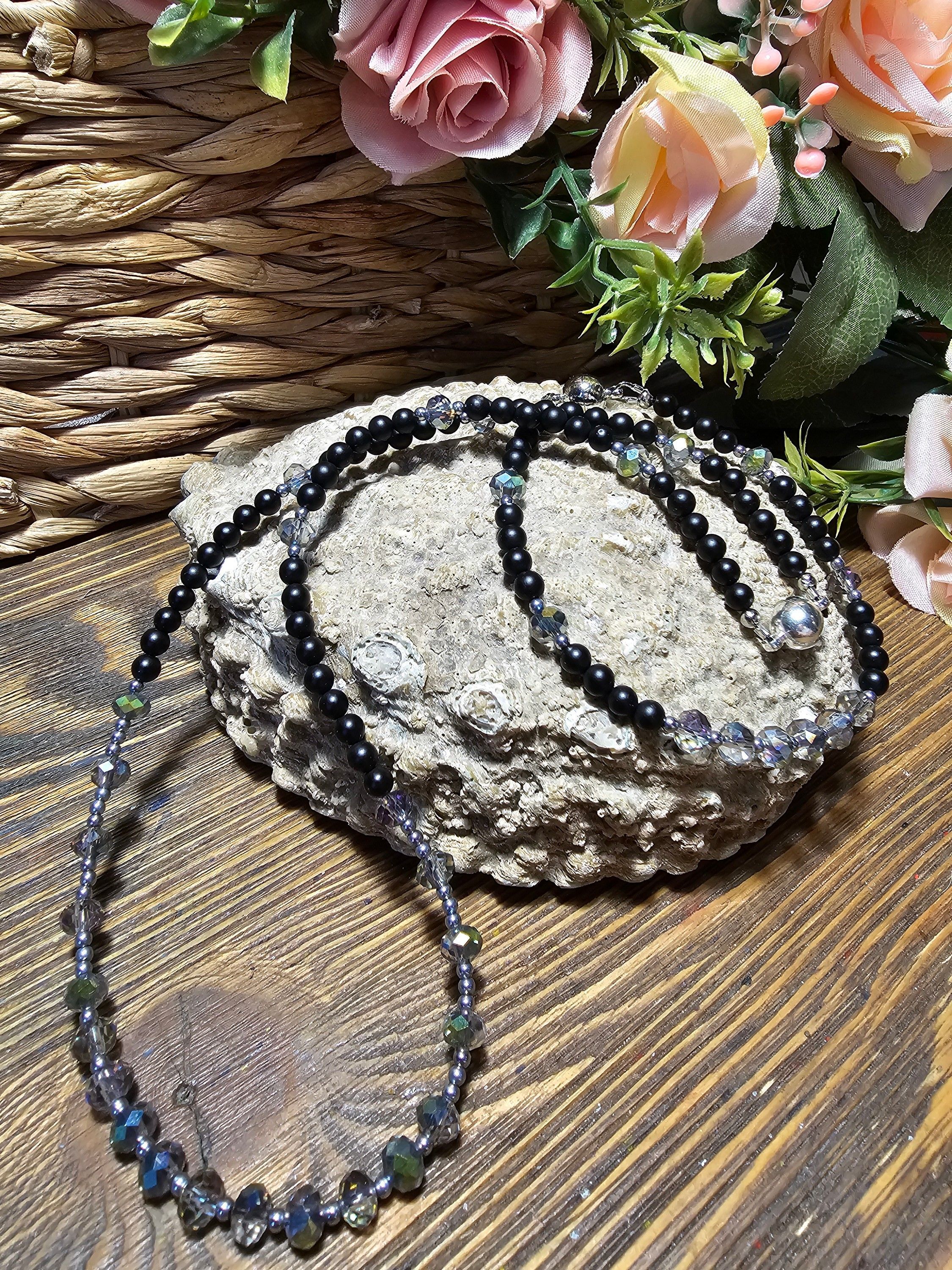Ожерелье сделано из чередующихся круглых черных матовых бусин, а также овальных серо-белых бусин с узорами. Это натуральный агат двух видов разбавленный серебристым бисером. В центре ожерелья висит декоративная подвеска в виде собаки-шарика. Магнитная застёжка серебристого цвета позволит одеть и снять ожерелье за секунды.
