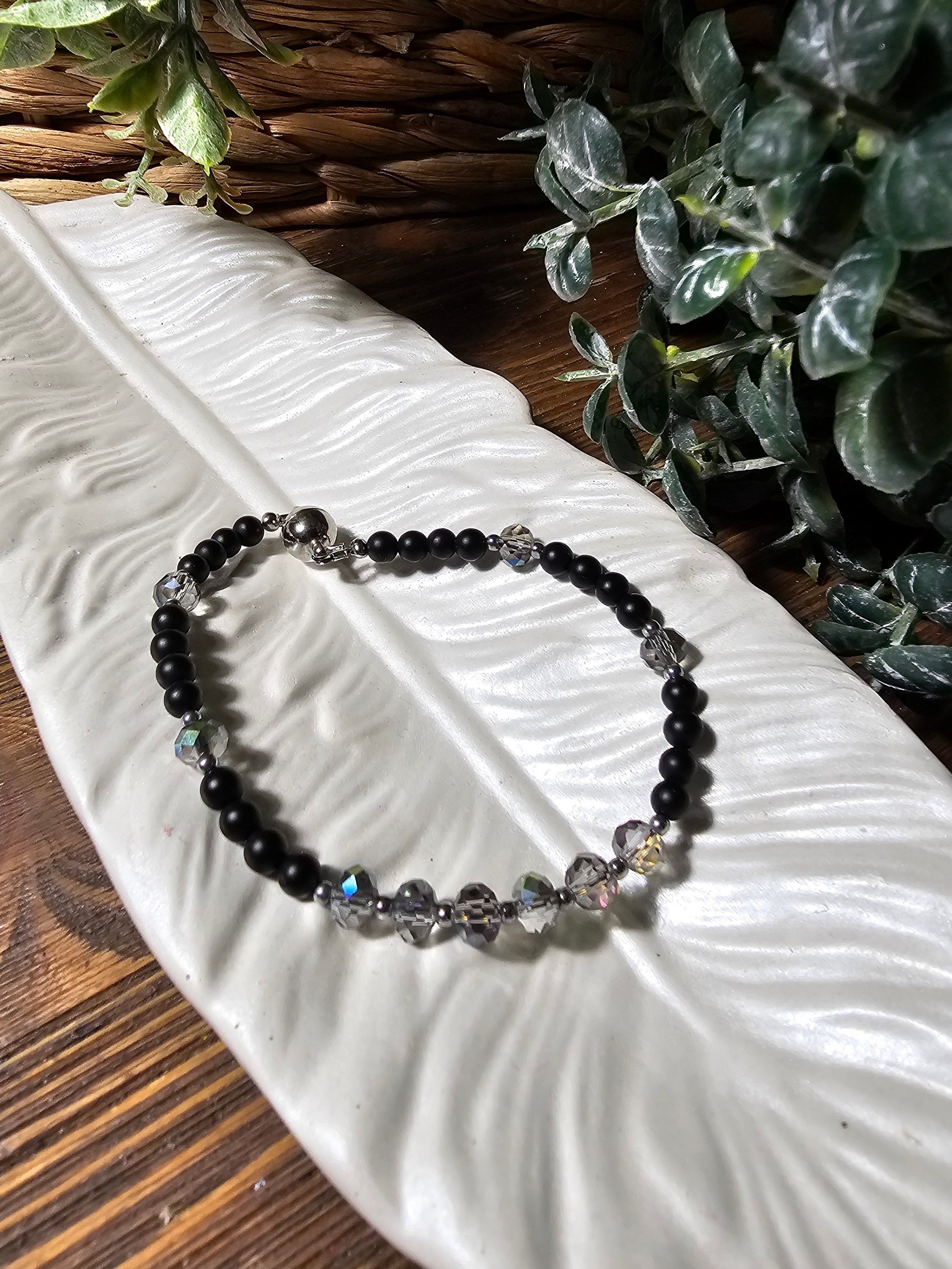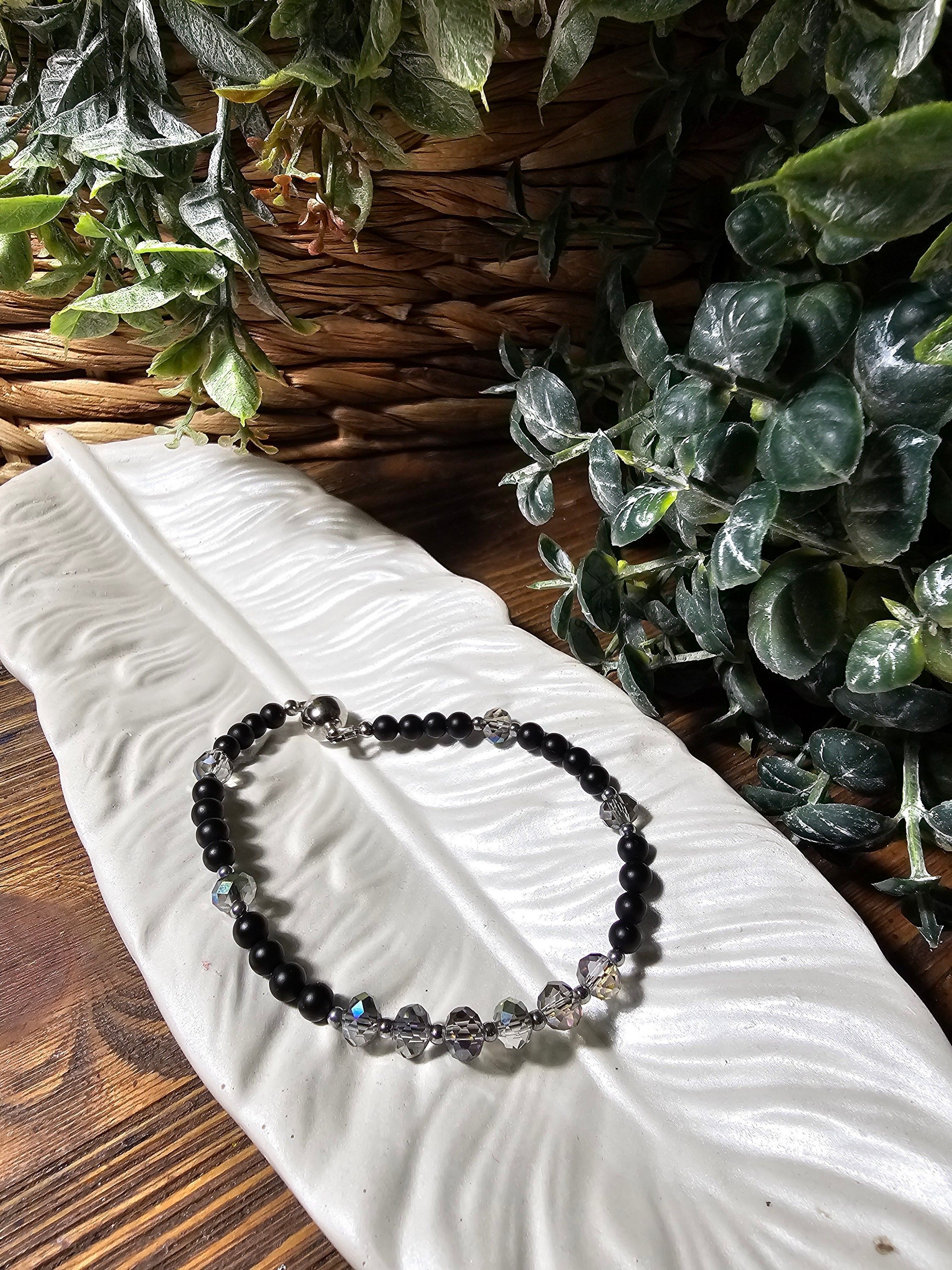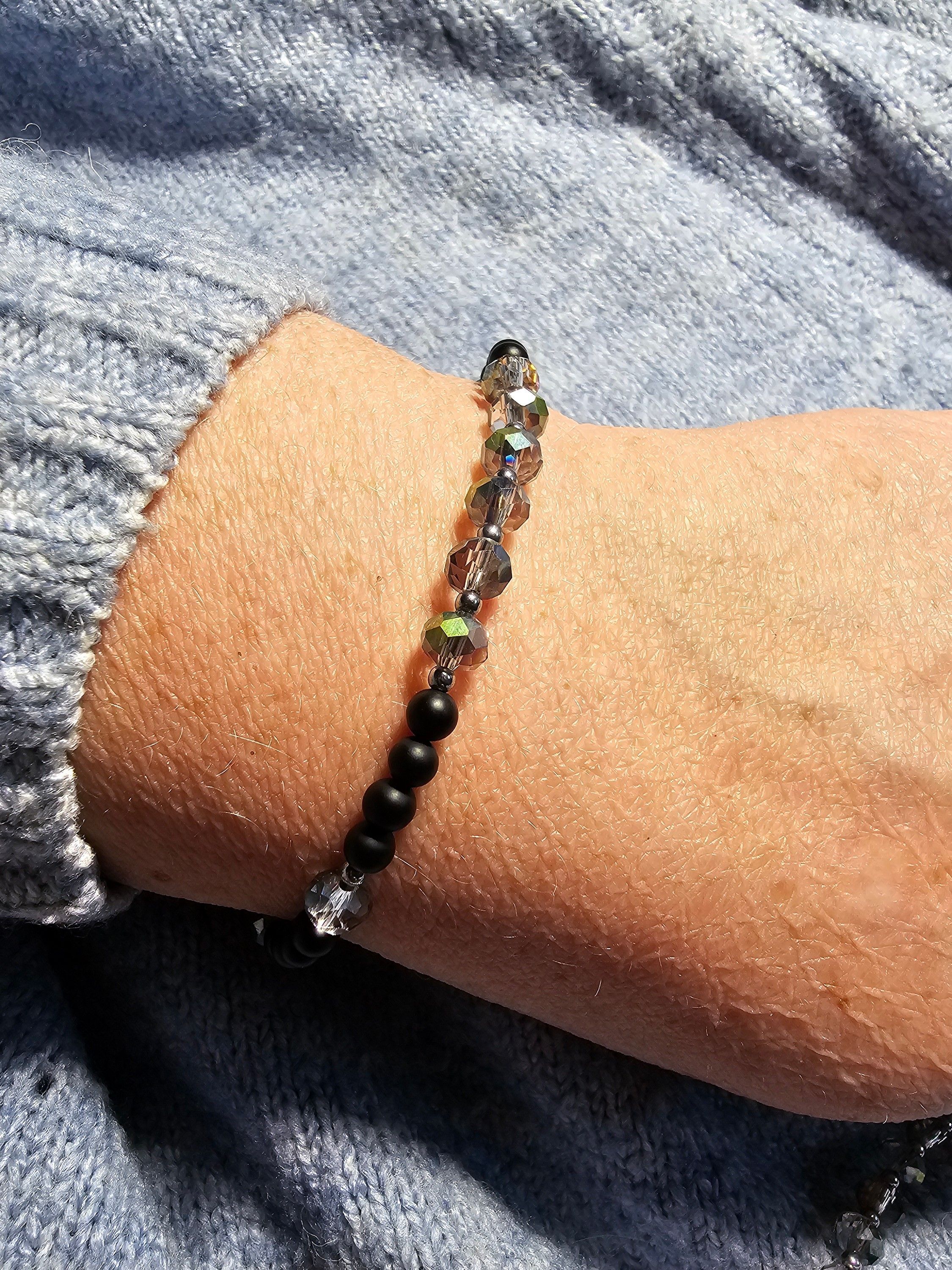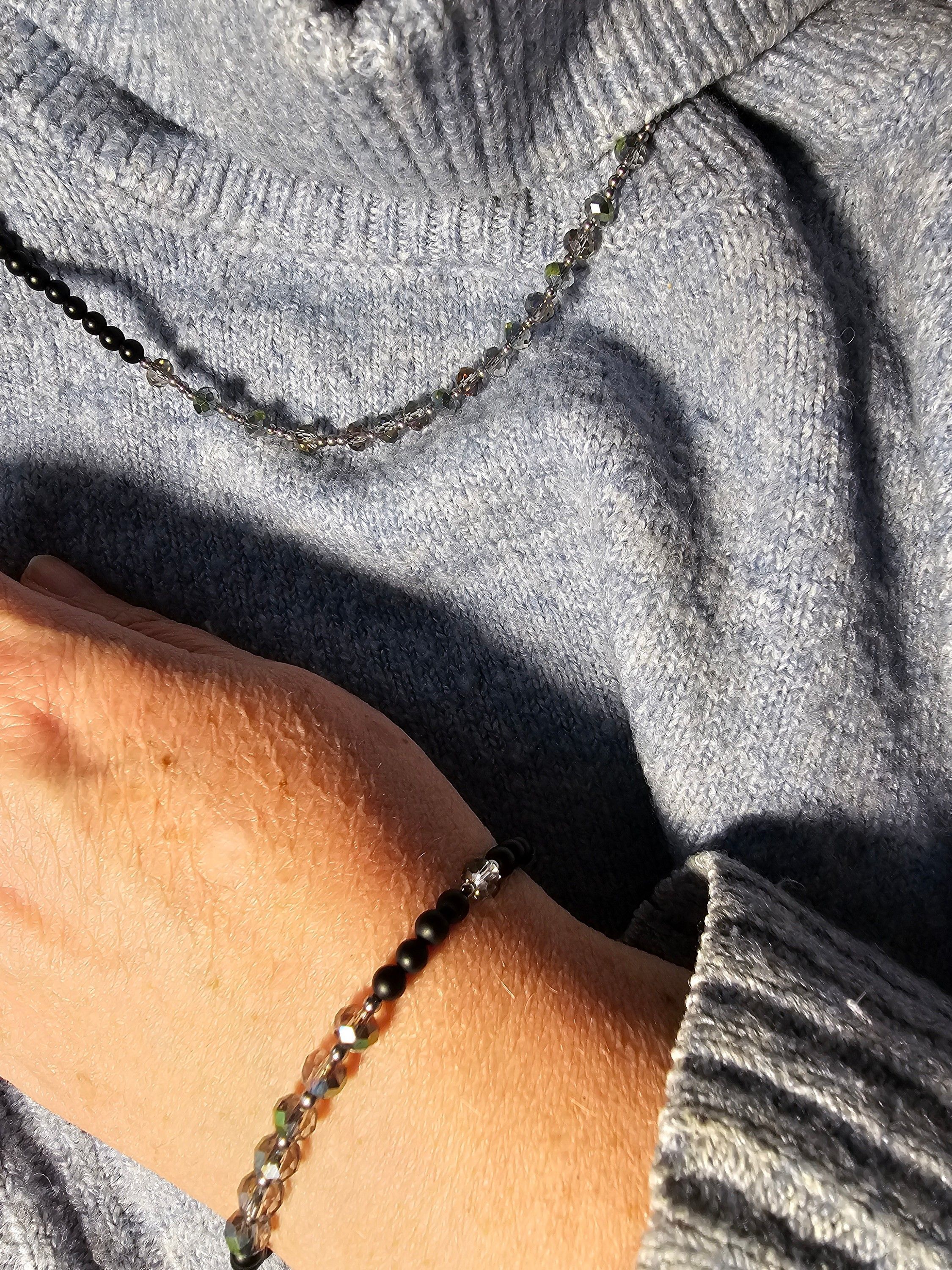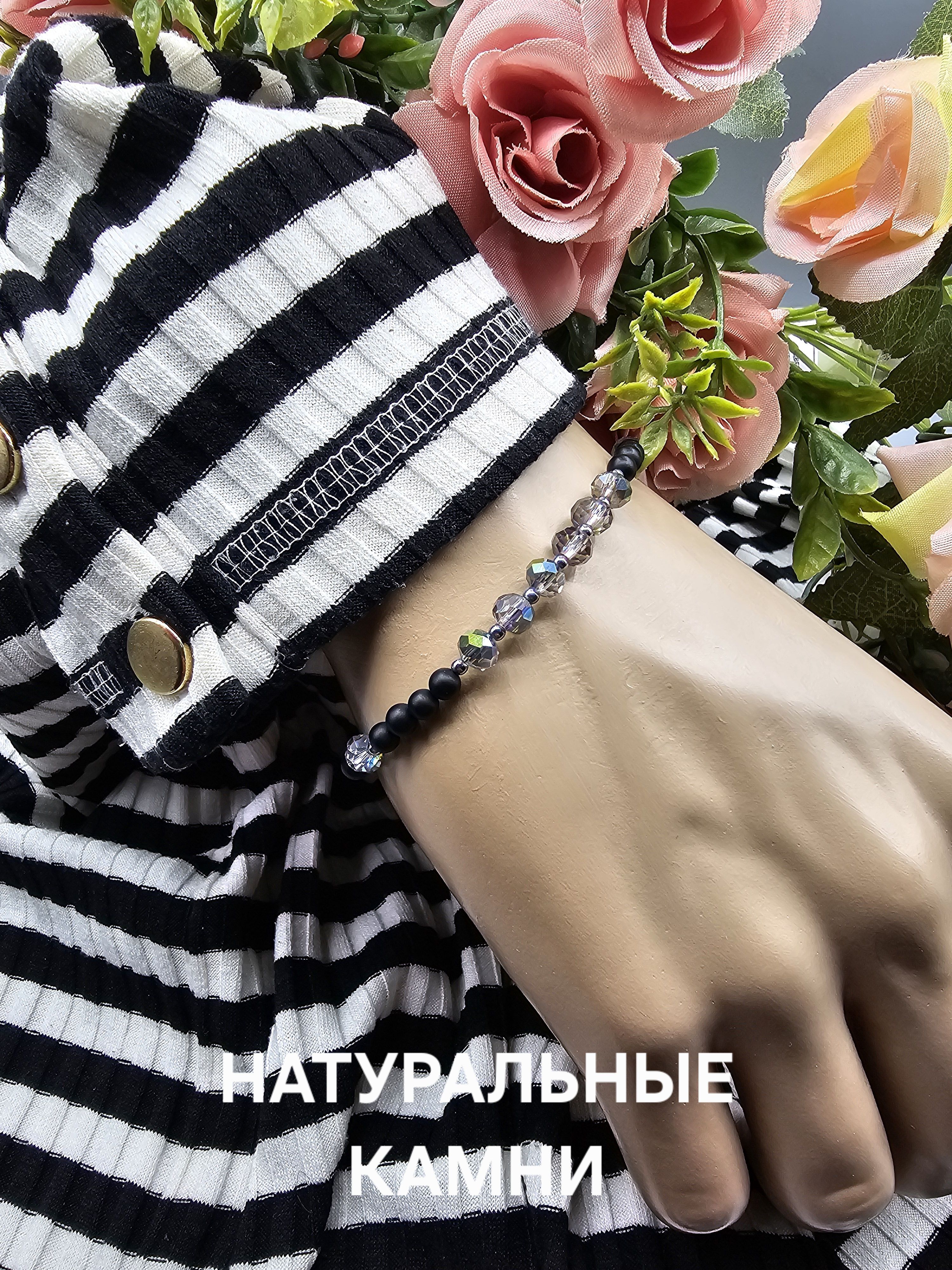 Ожерелье сделано из чередующихся круглых черных матовых бусин, а также овальных серо-белых бусин с узорами. Это натуральный агат двух видов разбавленный серебристым бисером. В центре ожерелья висит декоративная подвеска в виде собаки-шарика. Магнитная застёжка серебристого цвета позволит одеть и снять ожерелье за секунды.
