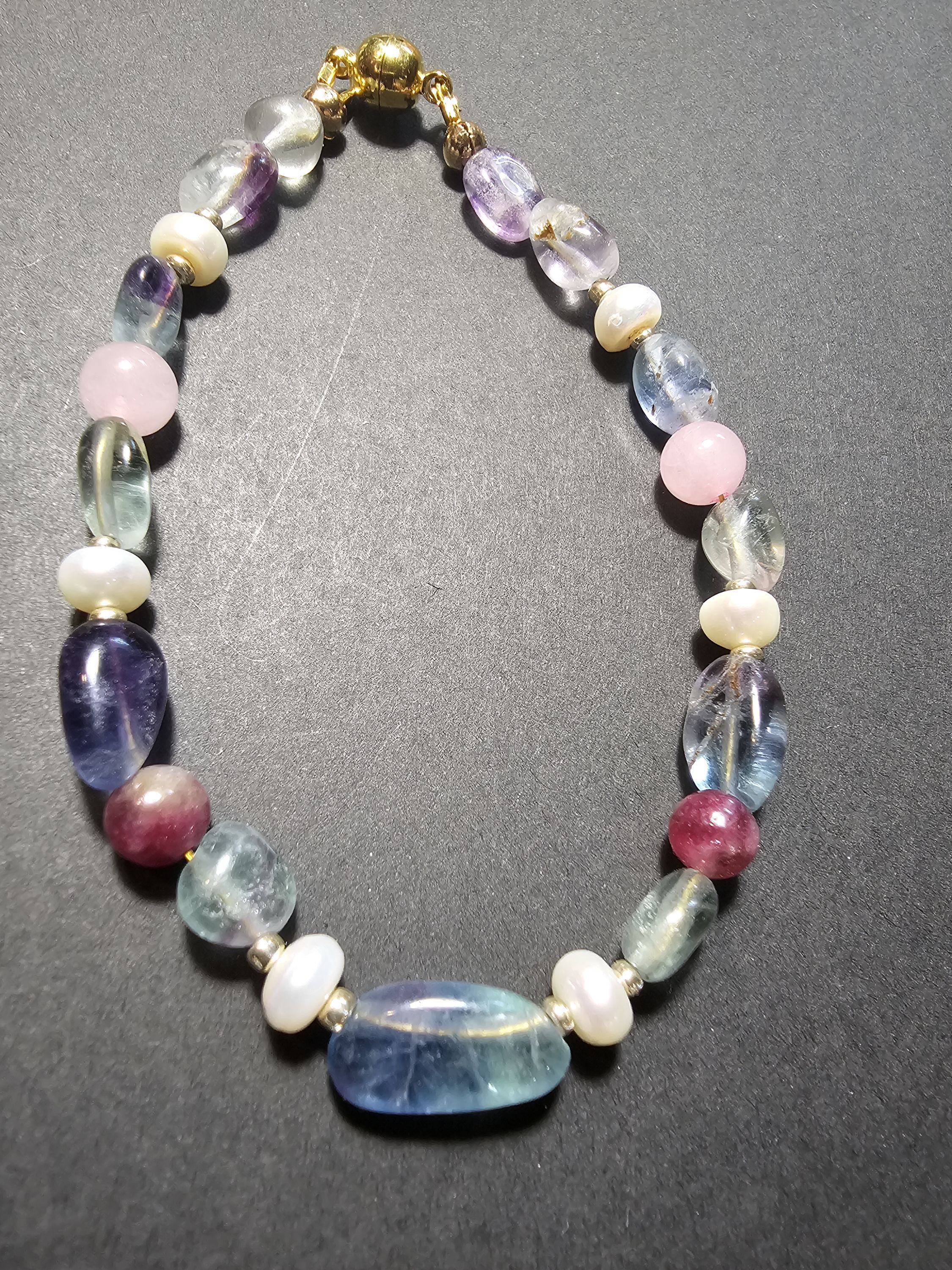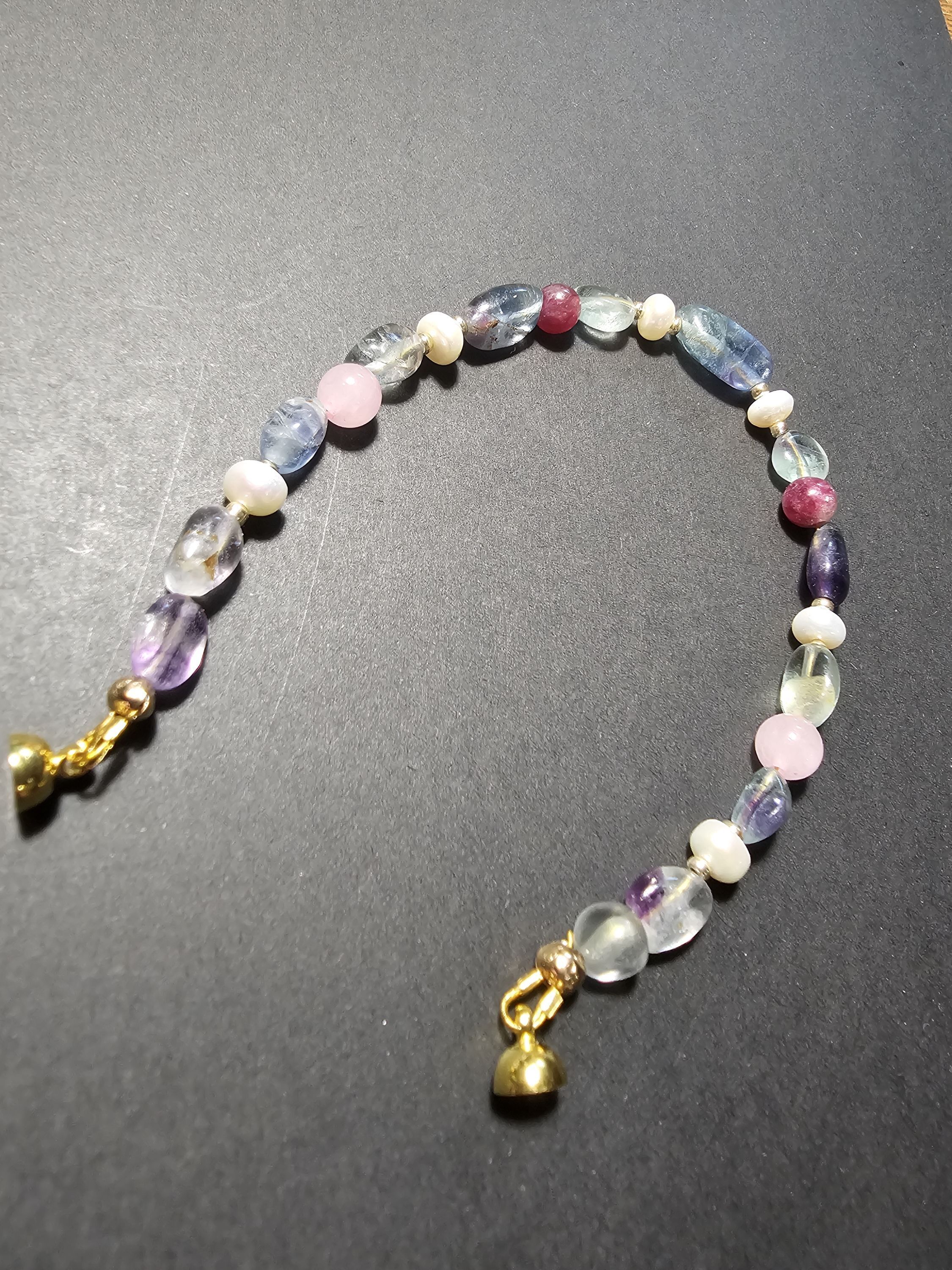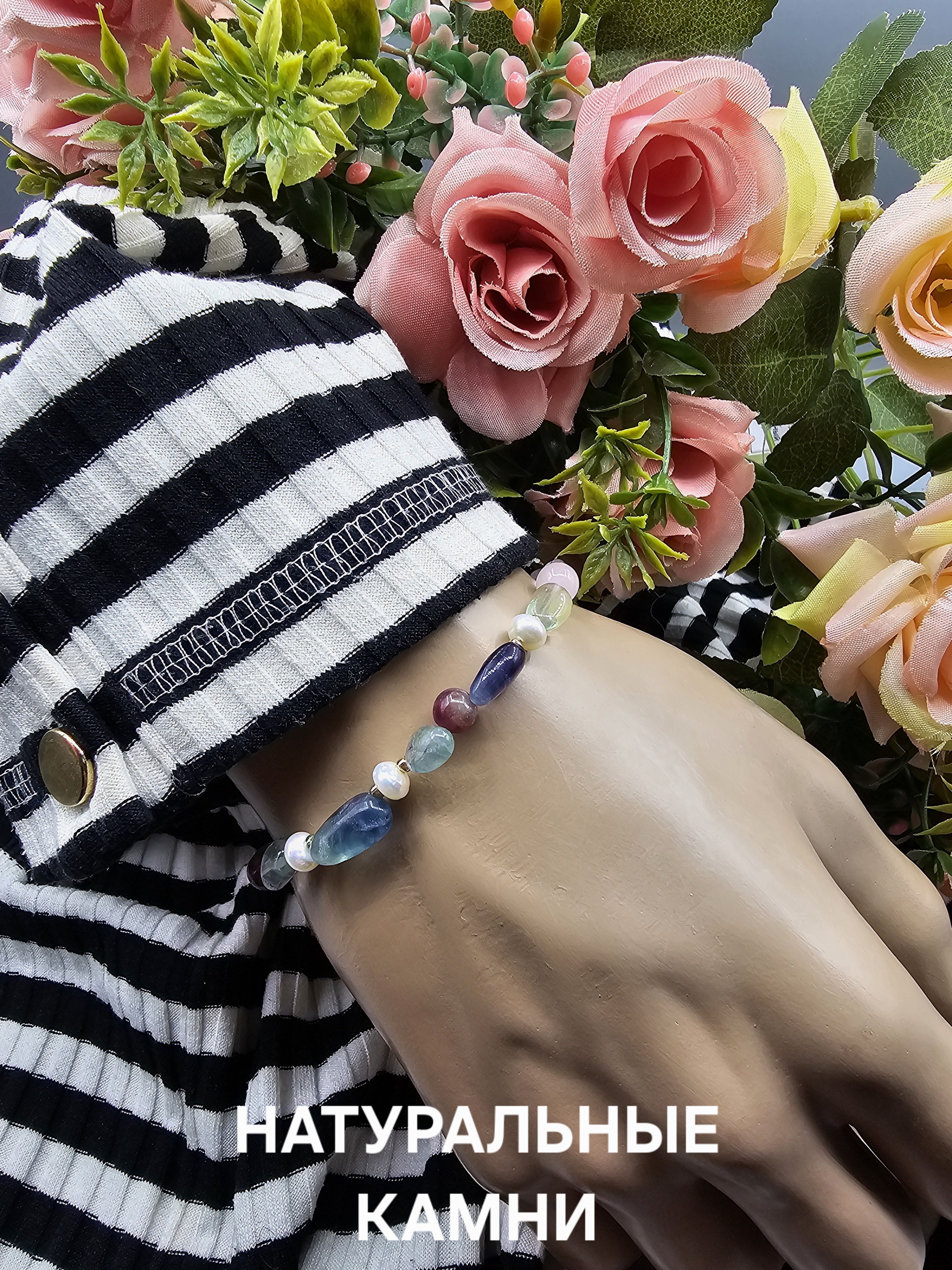 Браслет, состоящий из из разноцветных полудрагоценных камней. Камни имеют овальную и округлую форму и выложены в цепочку. Между камнями также размещены небольшие светлые бусины натурального жемчуга. Магнитная застежка золотистого цвета. Бусины равномерно нанизаны, создавая плавный переход оттенков.