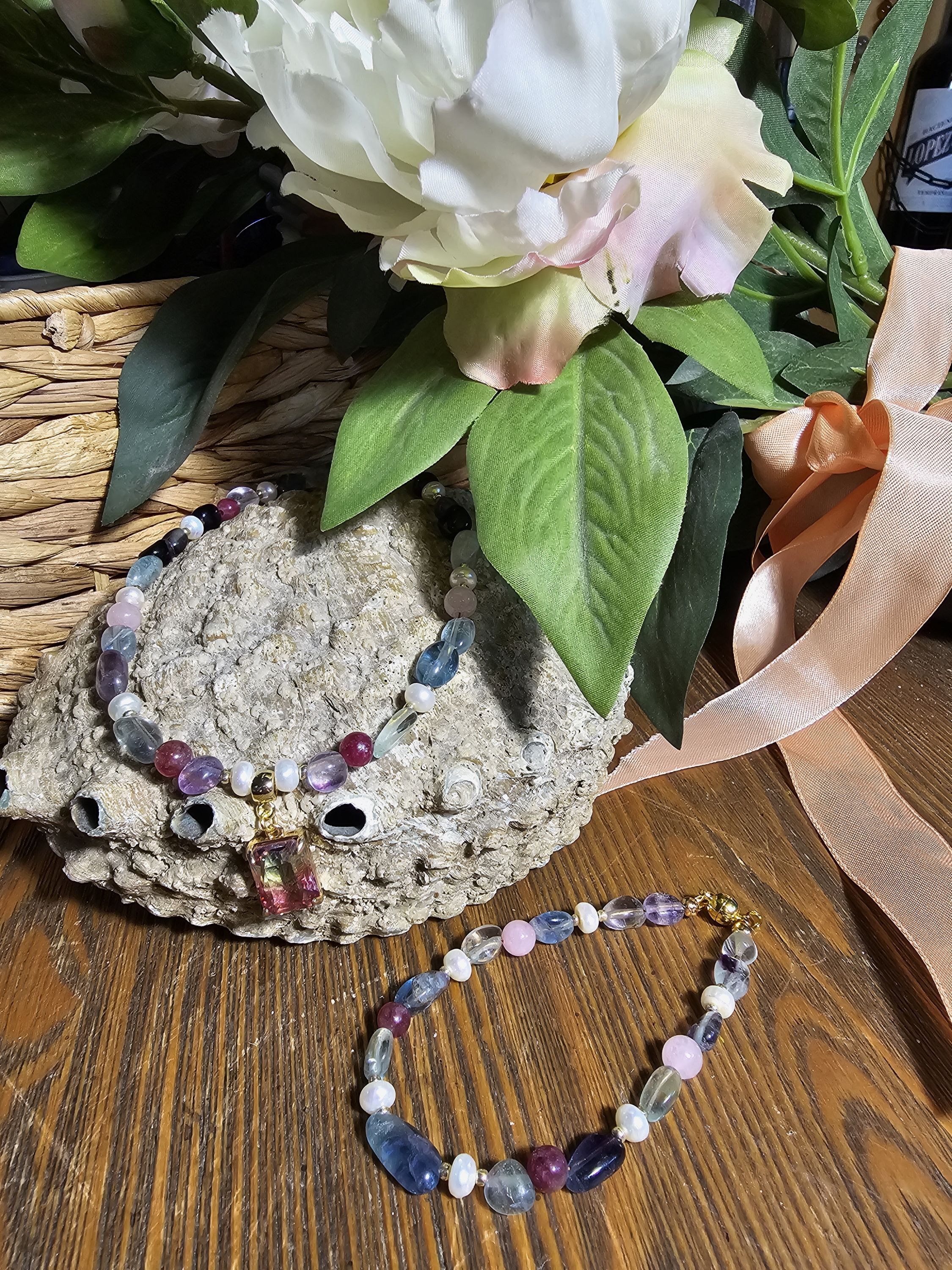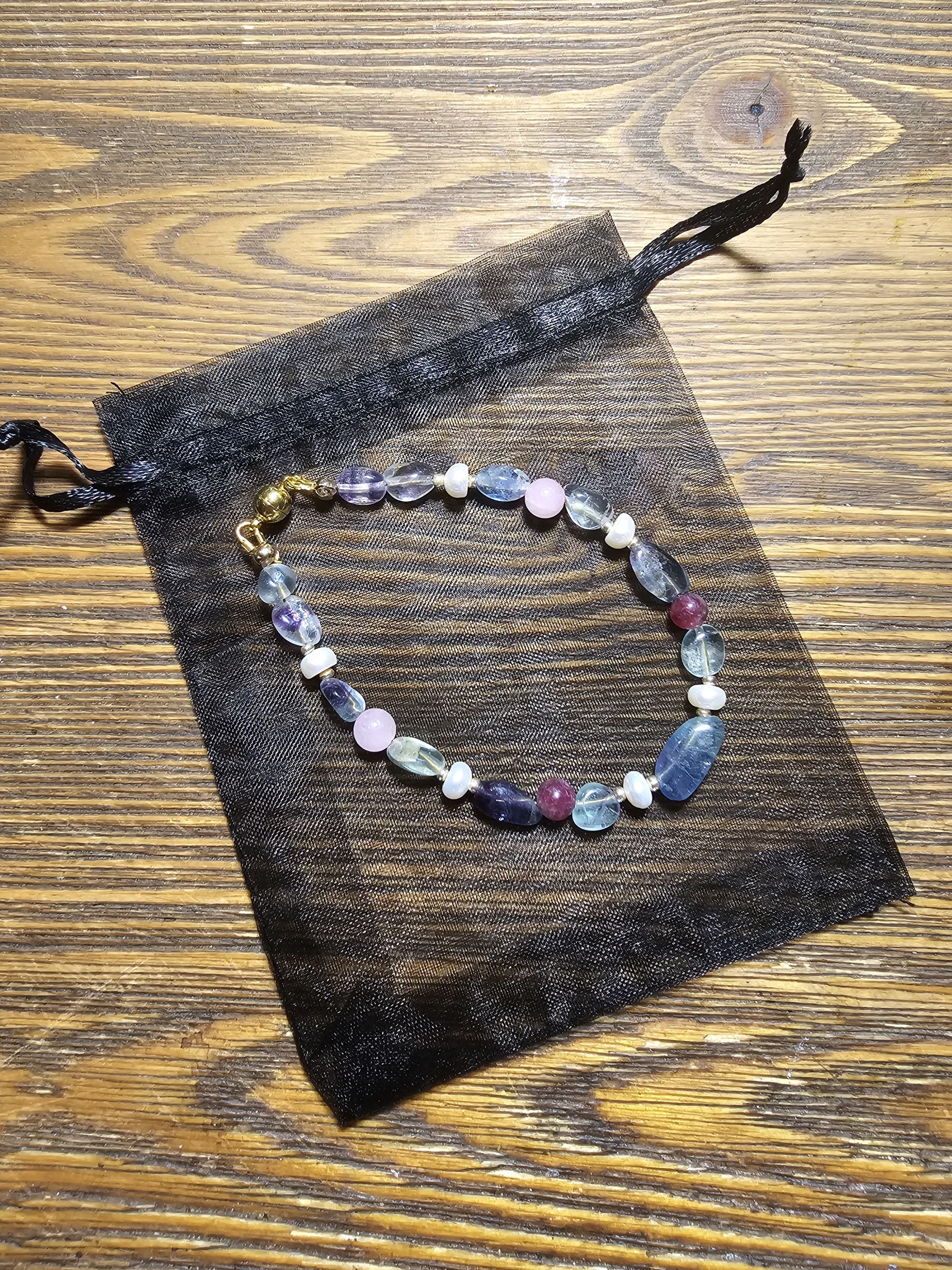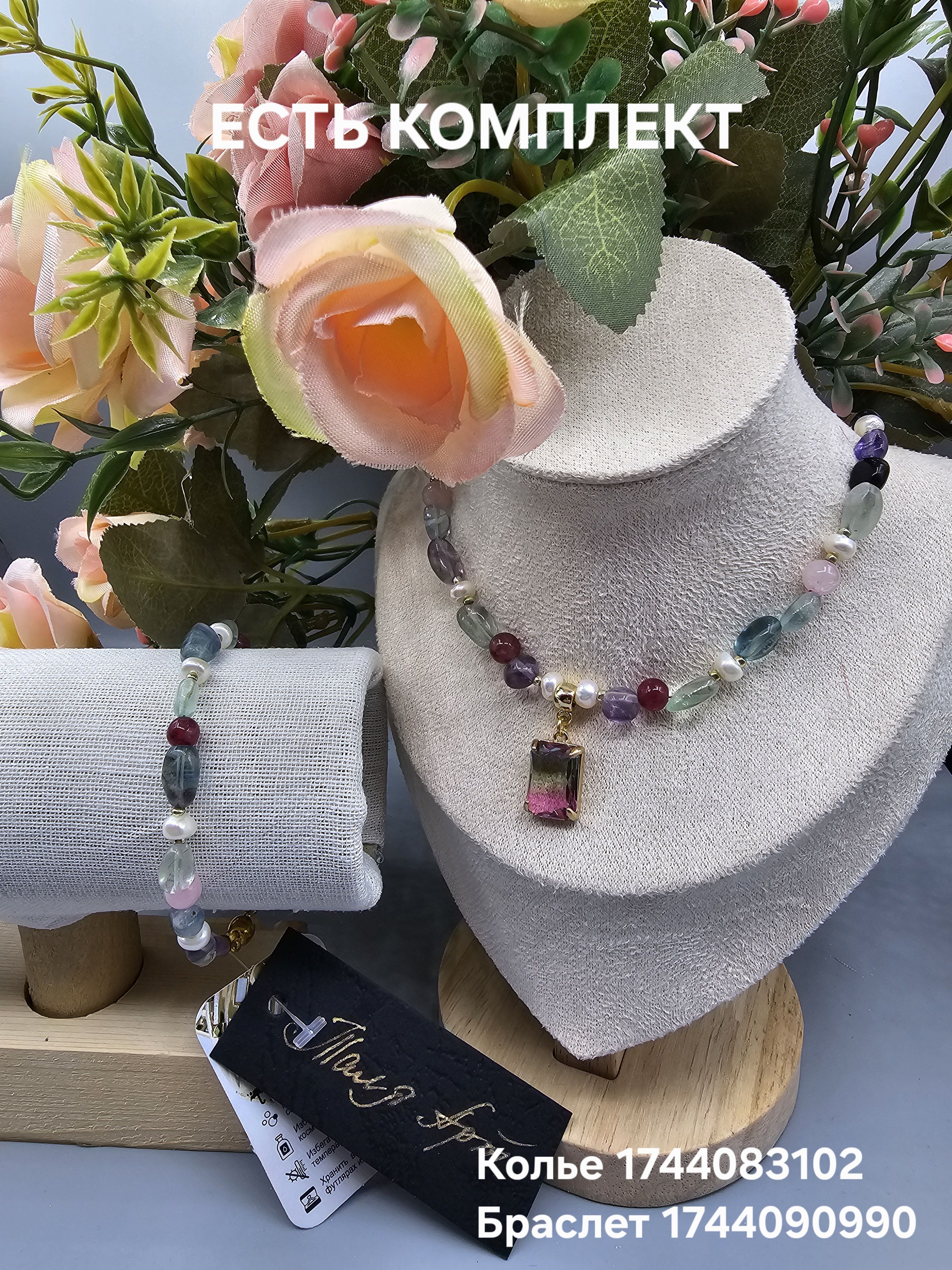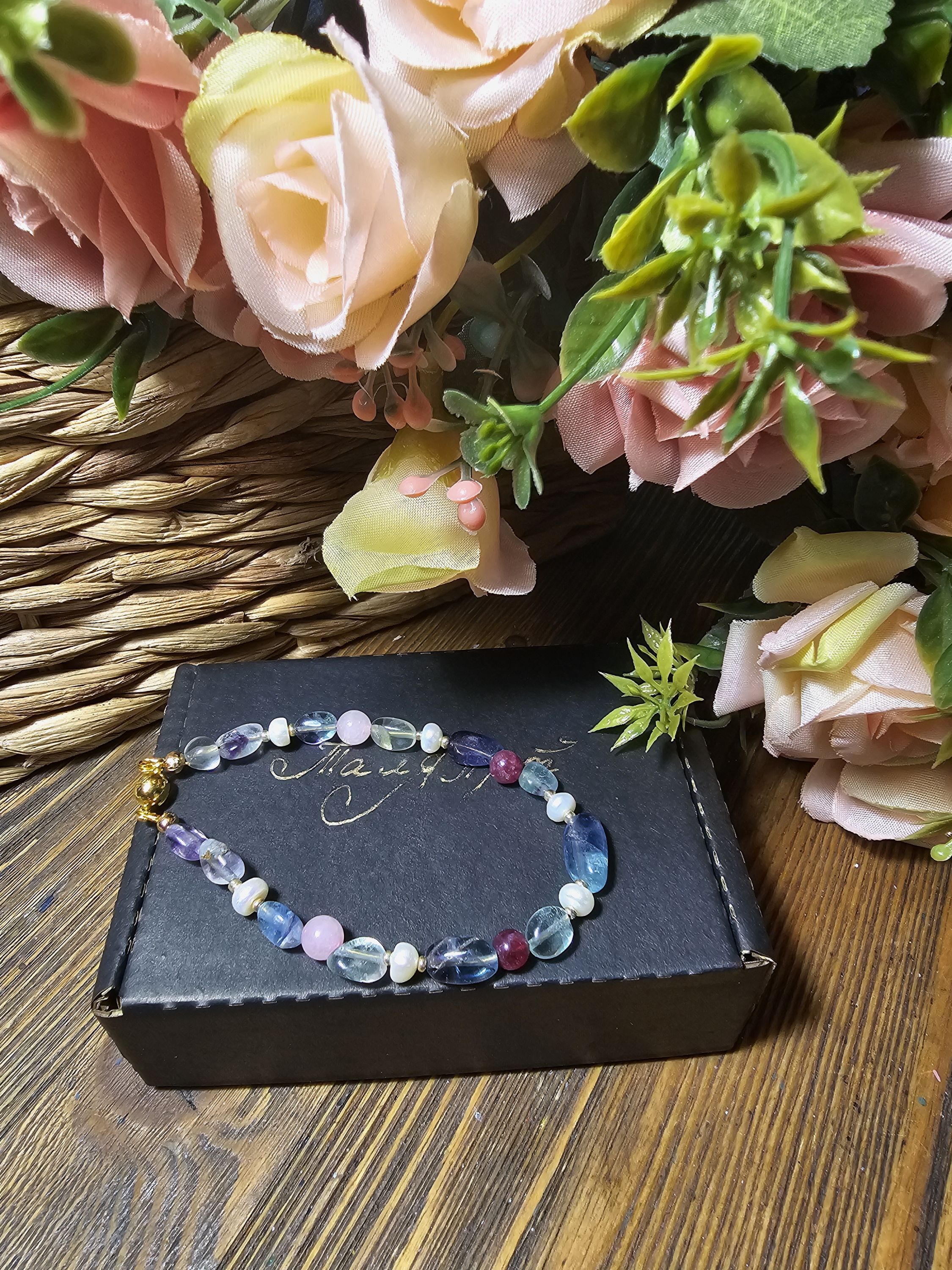 Браслет, состоящий из из разноцветных полудрагоценных камней. Камни имеют овальную и округлую форму и выложены в цепочку. Между камнями также размещены небольшие светлые бусины натурального жемчуга. Магнитная застежка золотистого цвета. Бусины равномерно нанизаны, создавая плавный переход оттенков.
