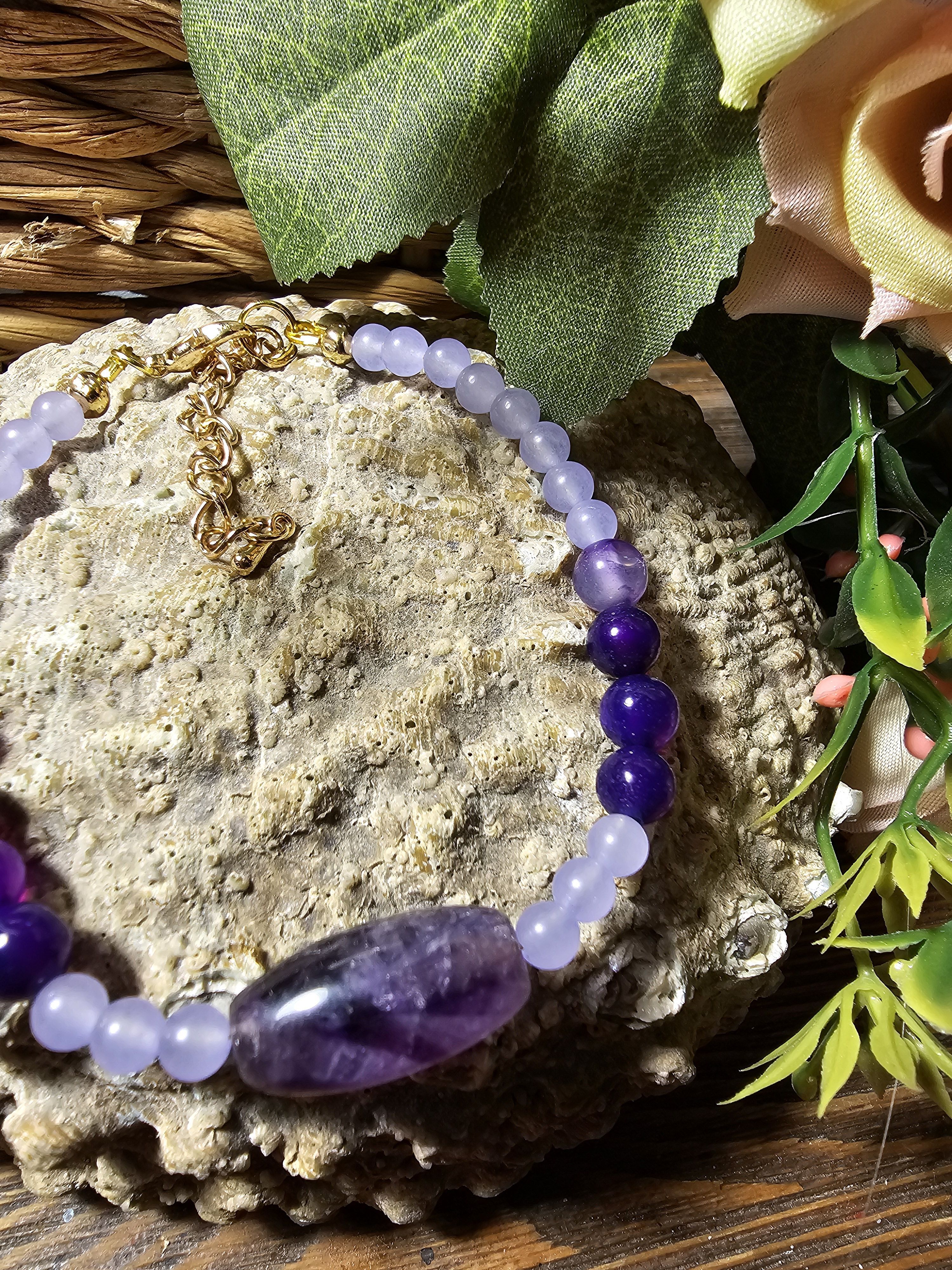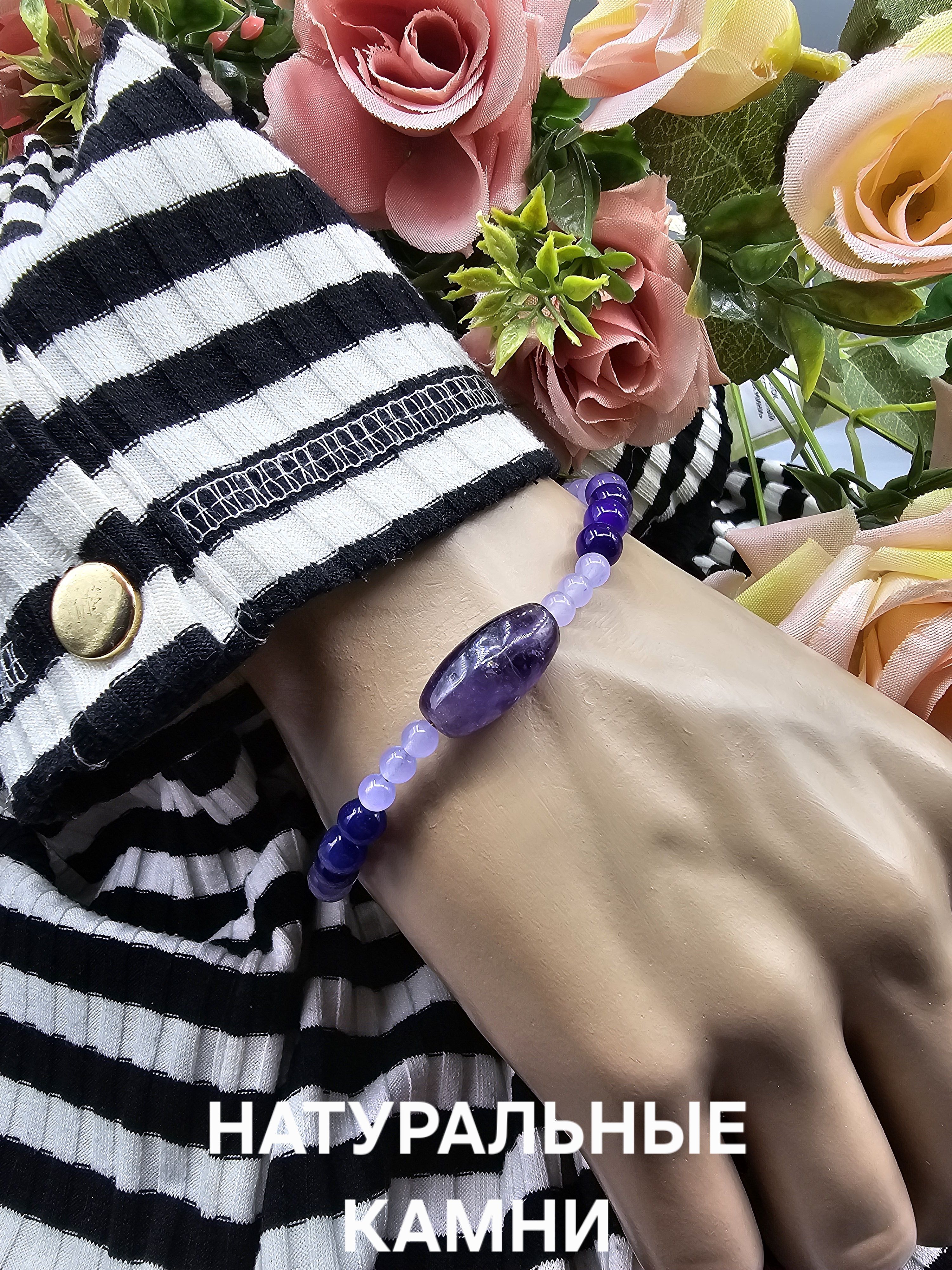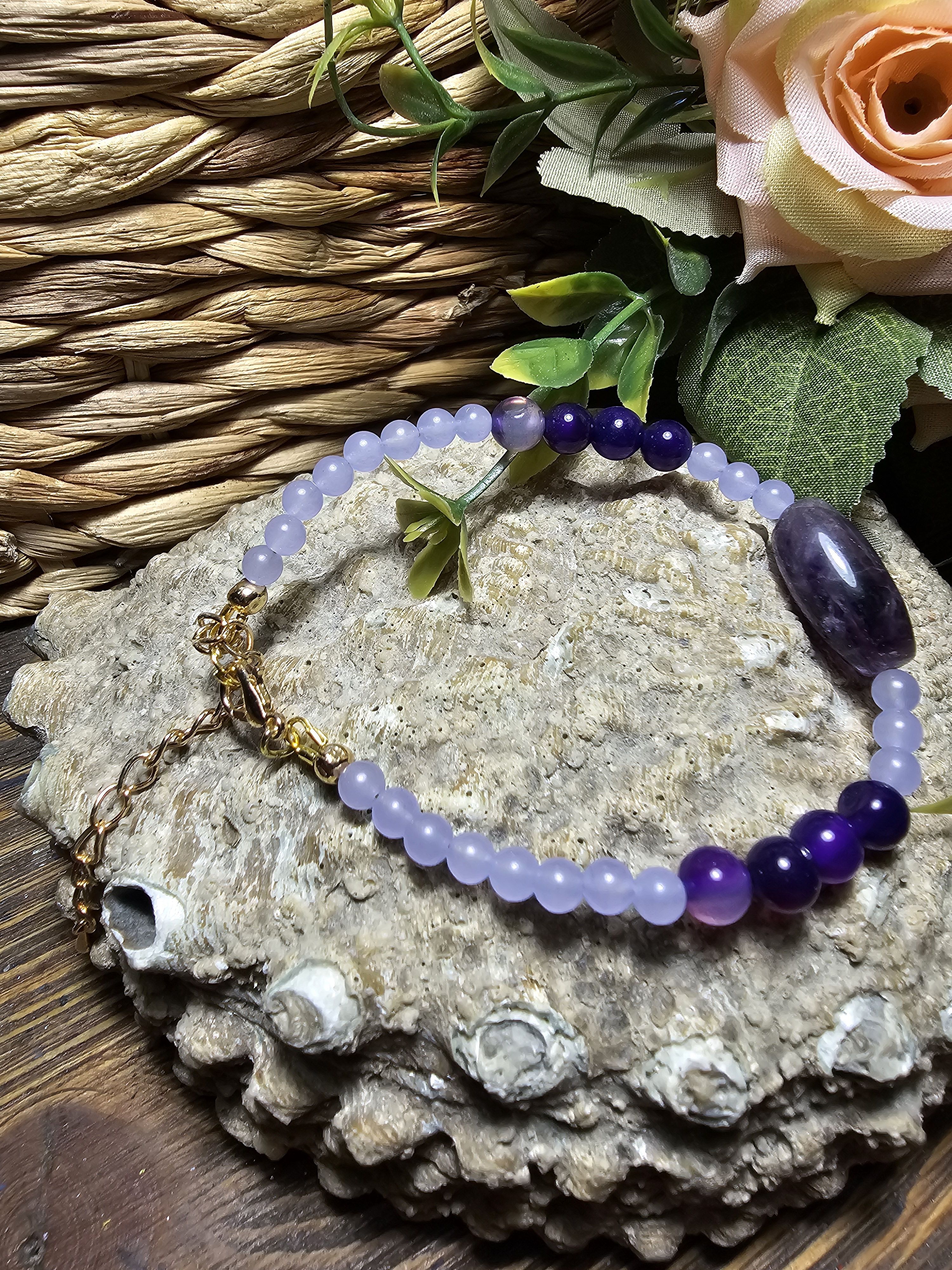 Браслет, состоящий из бусин сиреневого халцедона и фиолетового цвета агата. Он украшен крупной бусиной агата с фиолетовым отливом . Застёжка золотистого цвета с удлинительной цепочкой. Бусины равномерно нанизаны, создавая плавный переход оттенков.