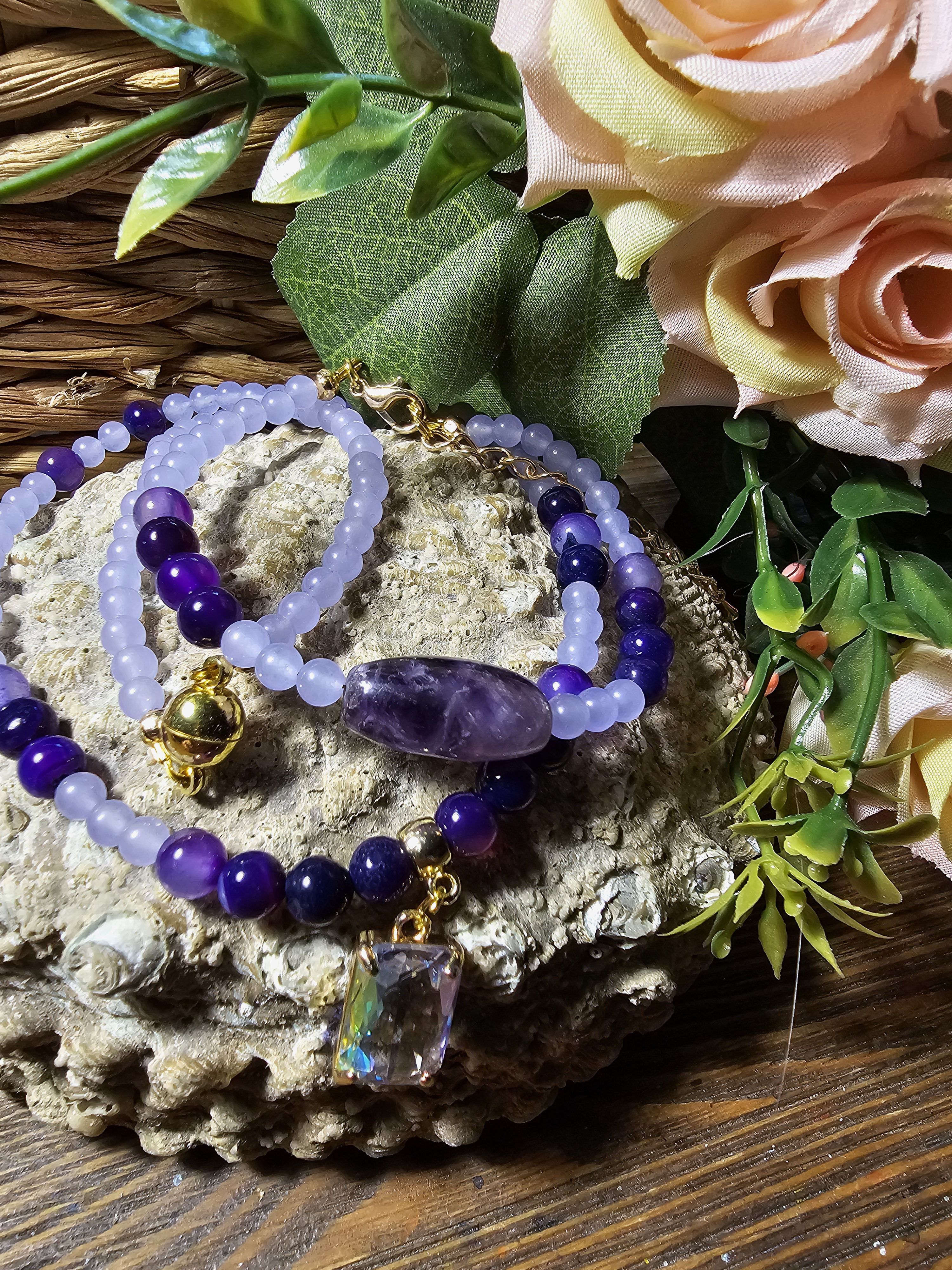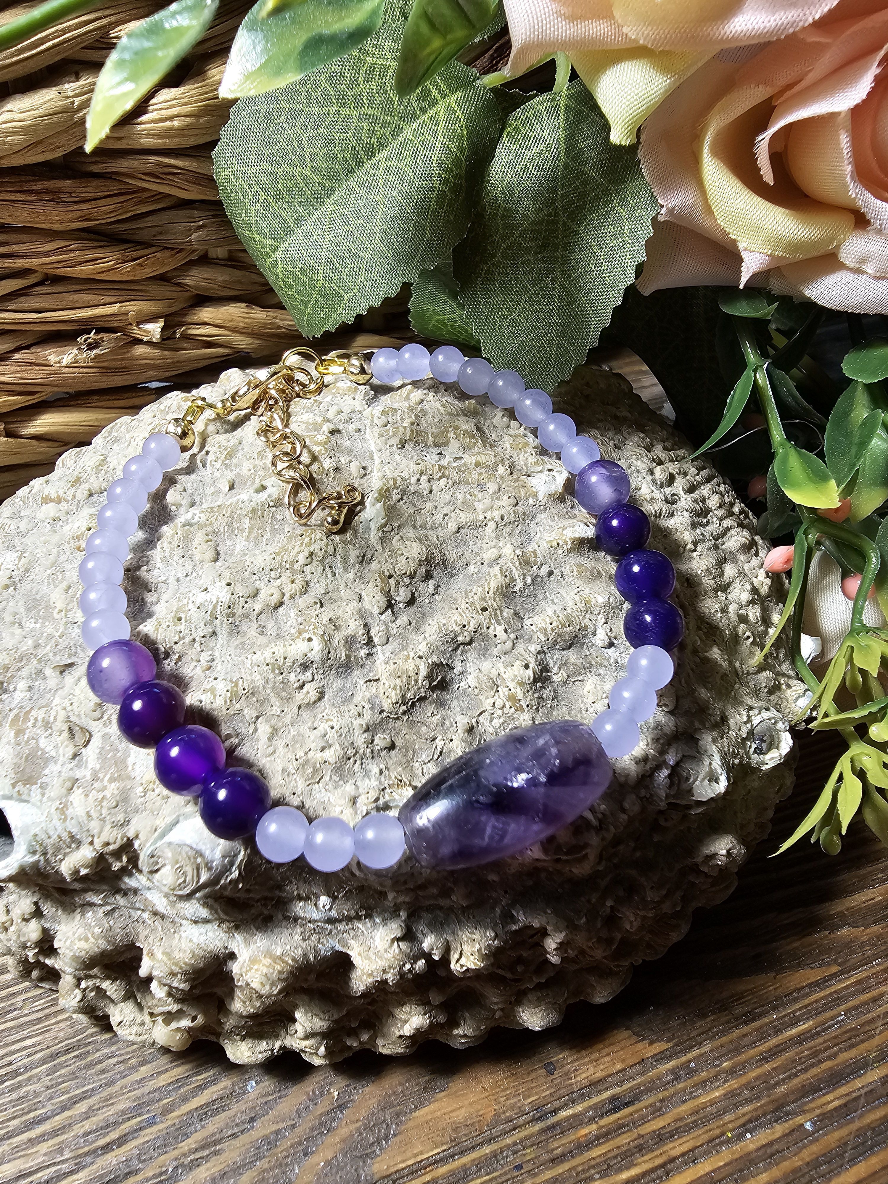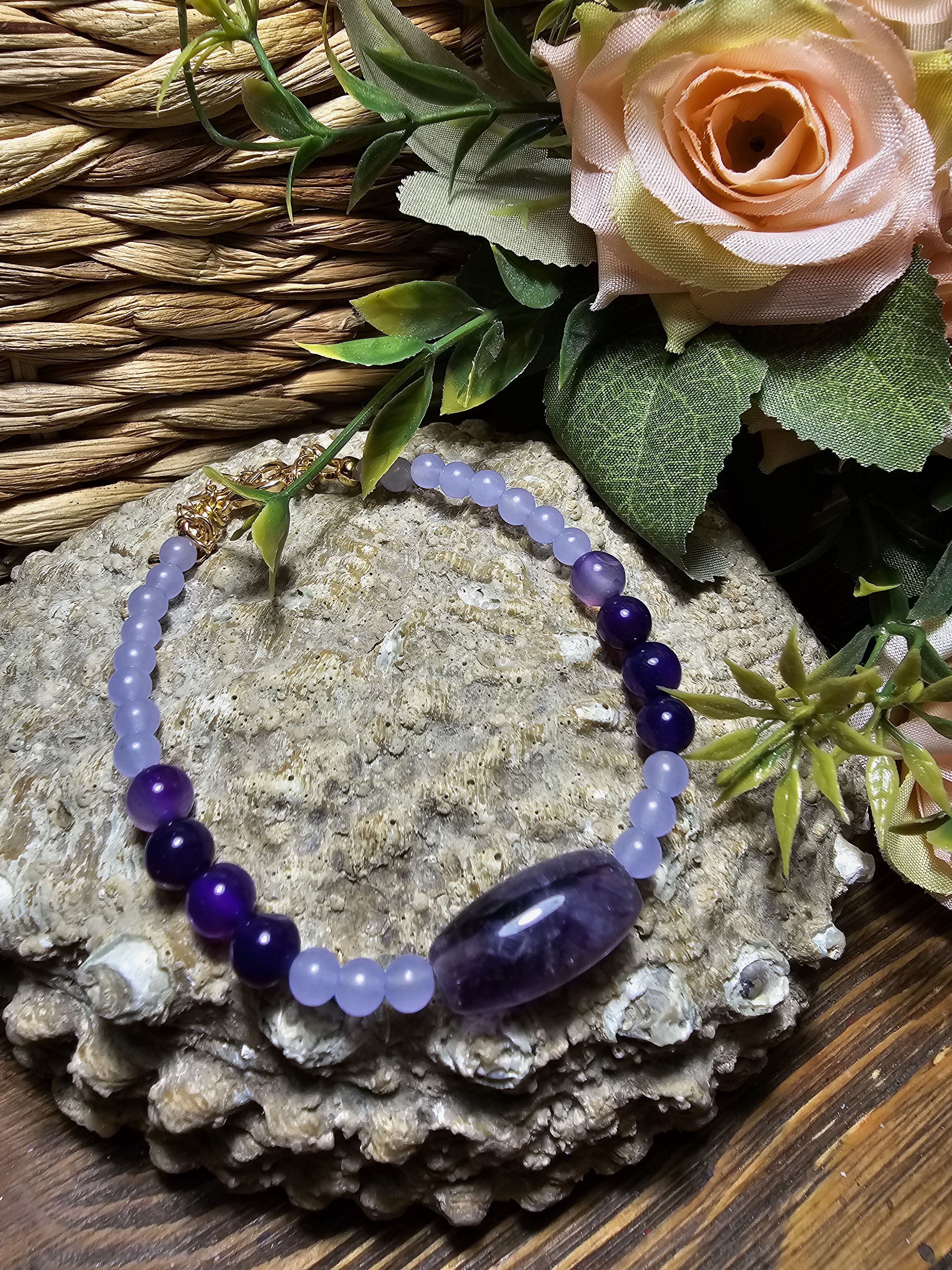 Браслет, состоящий из бусин сиреневого халцедона и фиолетового цвета агата. Он украшен крупной бусиной агата с фиолетовым отливом . Застёжка золотистого цвета с удлинительной цепочкой. Бусины равномерно нанизаны, создавая плавный переход оттенков.