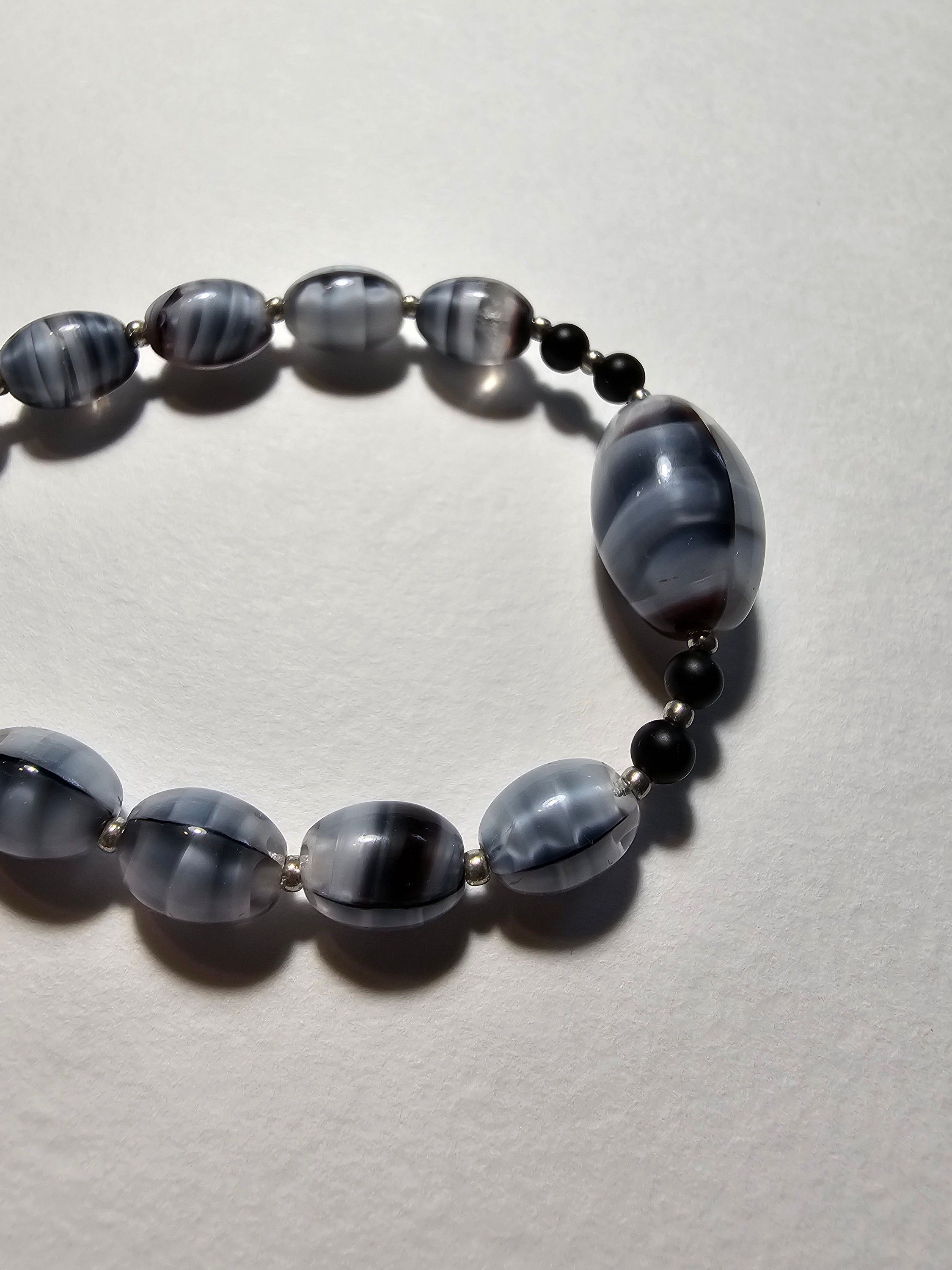 Браслет, состоящий из из разноцветных полудрагоценных камней. Камни имеют овальную и округлую форму и выложены в цепочку. Между камнями также размещены небольшие светлые бусины натурального жемчуга. Магнитная застежка золотистого цвета. Бусины равномерно нанизаны, создавая плавный переход оттенков.