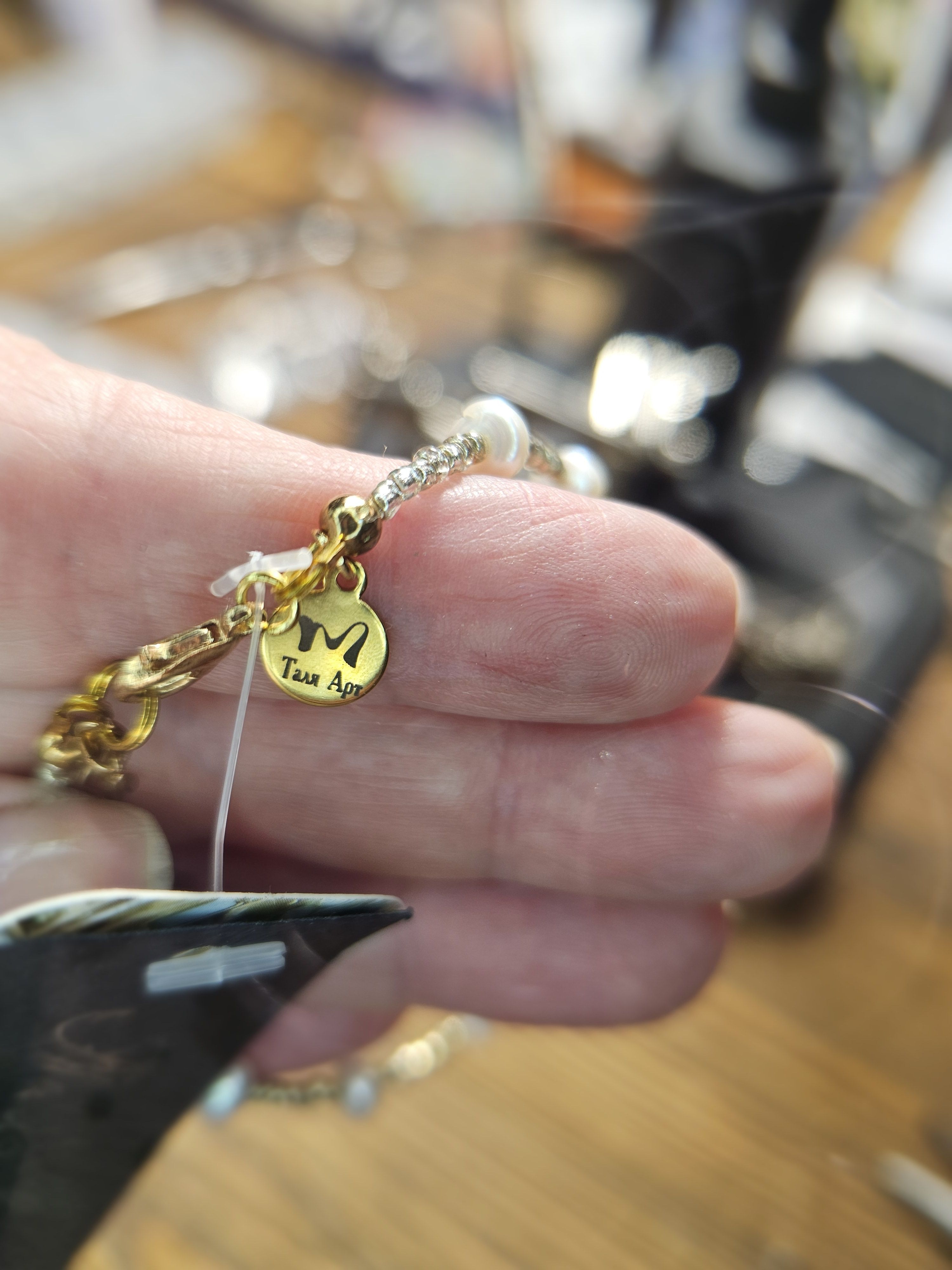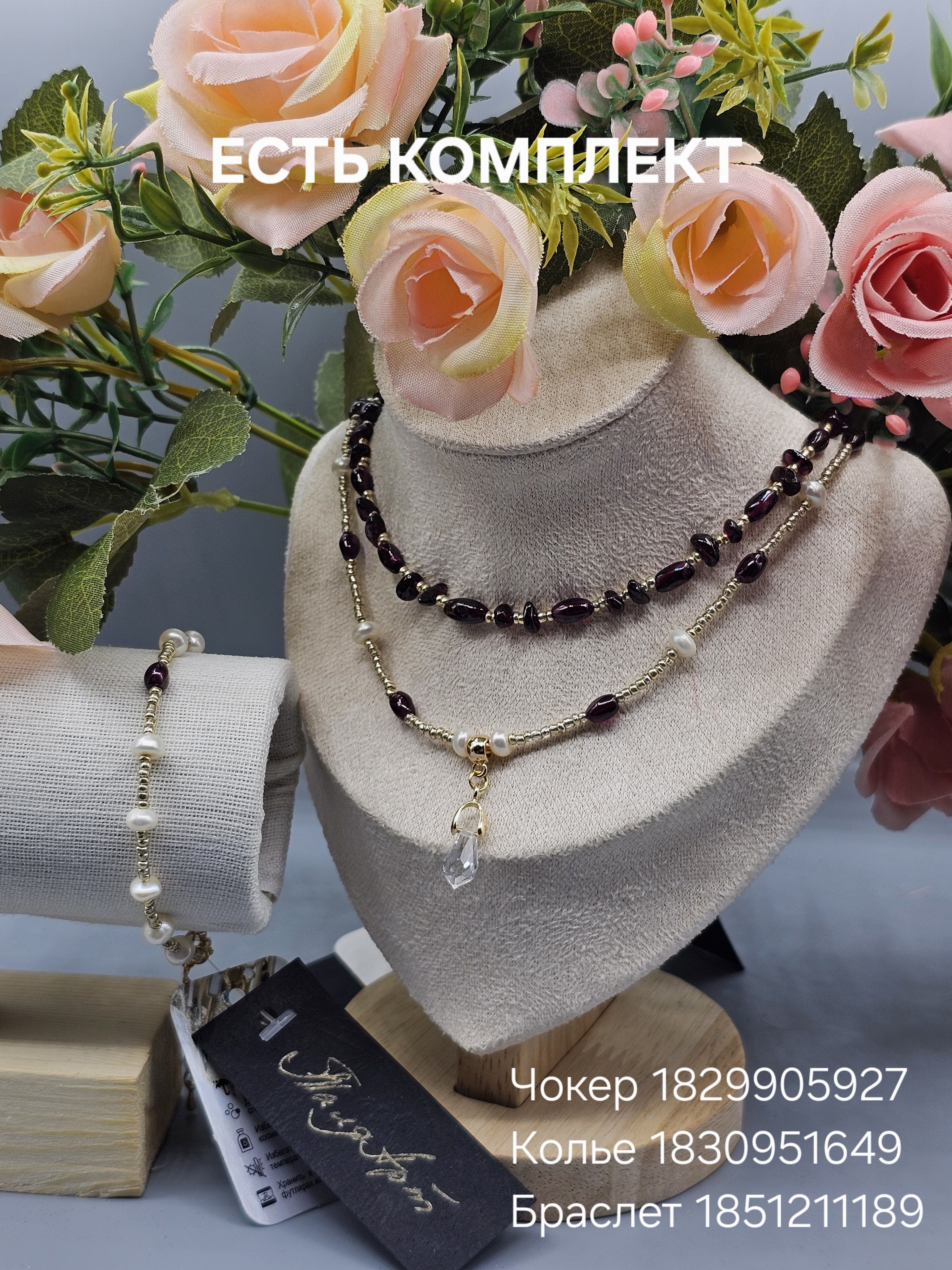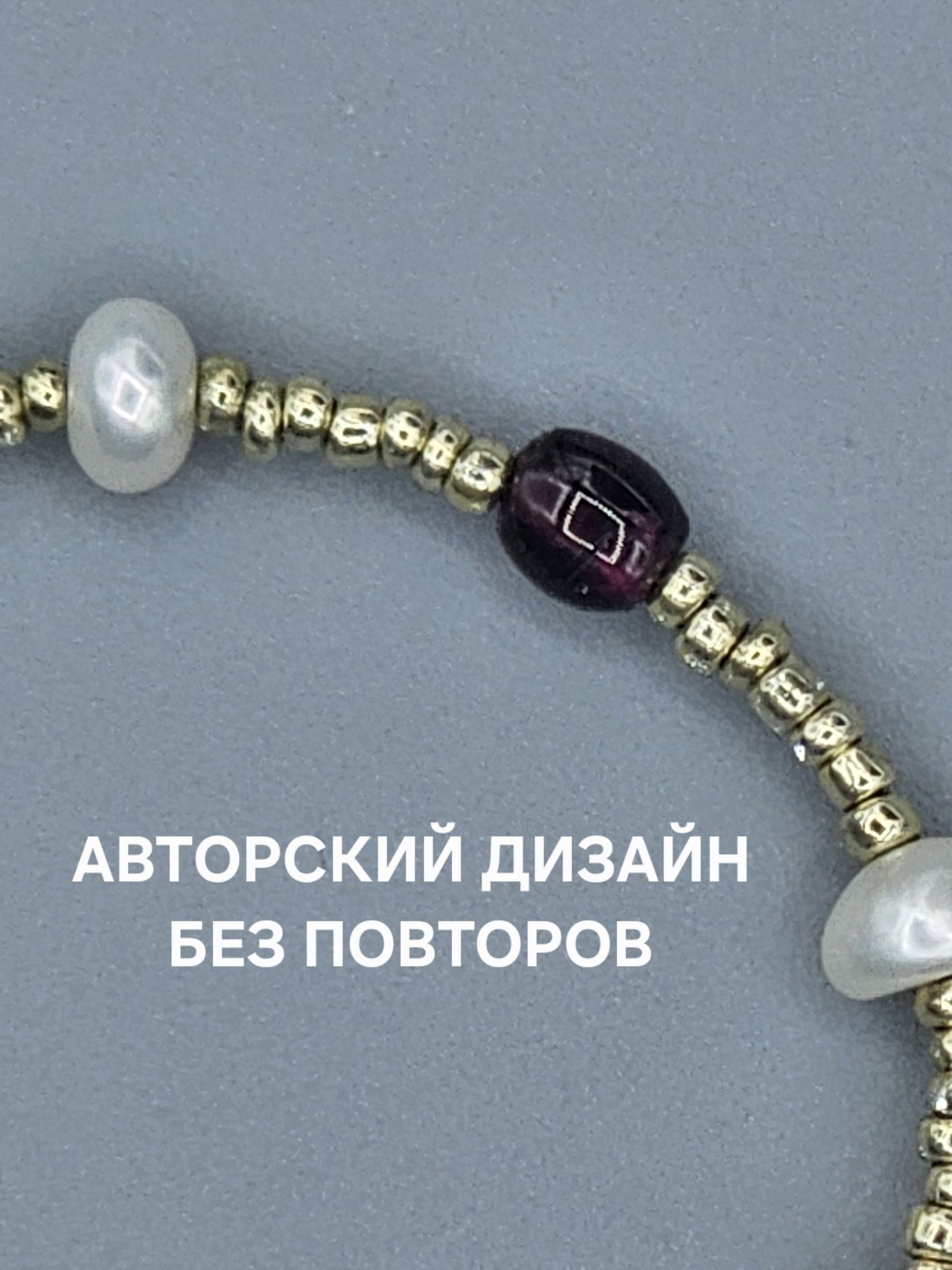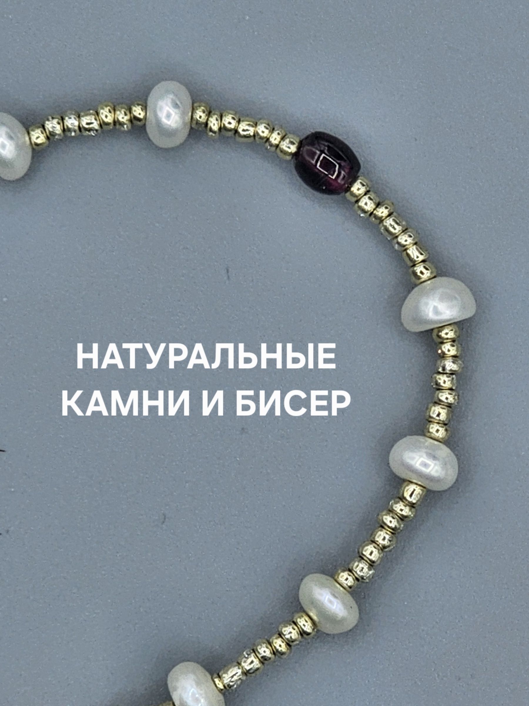 Браслет, состоящий из светлого жемчуга приплюснутой формы и полукруглой "рисинкой" - граната в центральной части. Камни имеют овальную и округлую форму и выложены в цепочку. Между камнями размещены золотистые бисерины разной формы. Застежка-карабин золотистого цвета. Бусины равномерно нанизаны, создавая плавный переход оттенков.