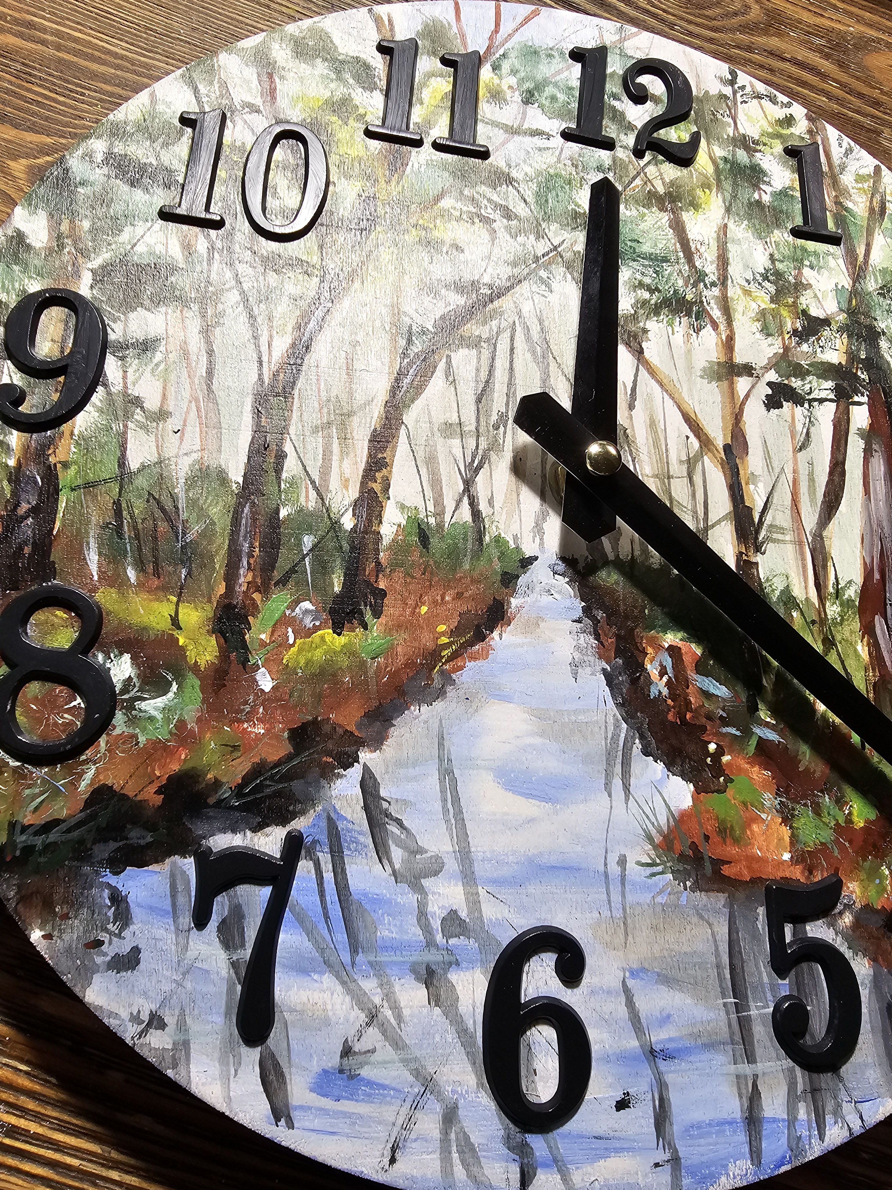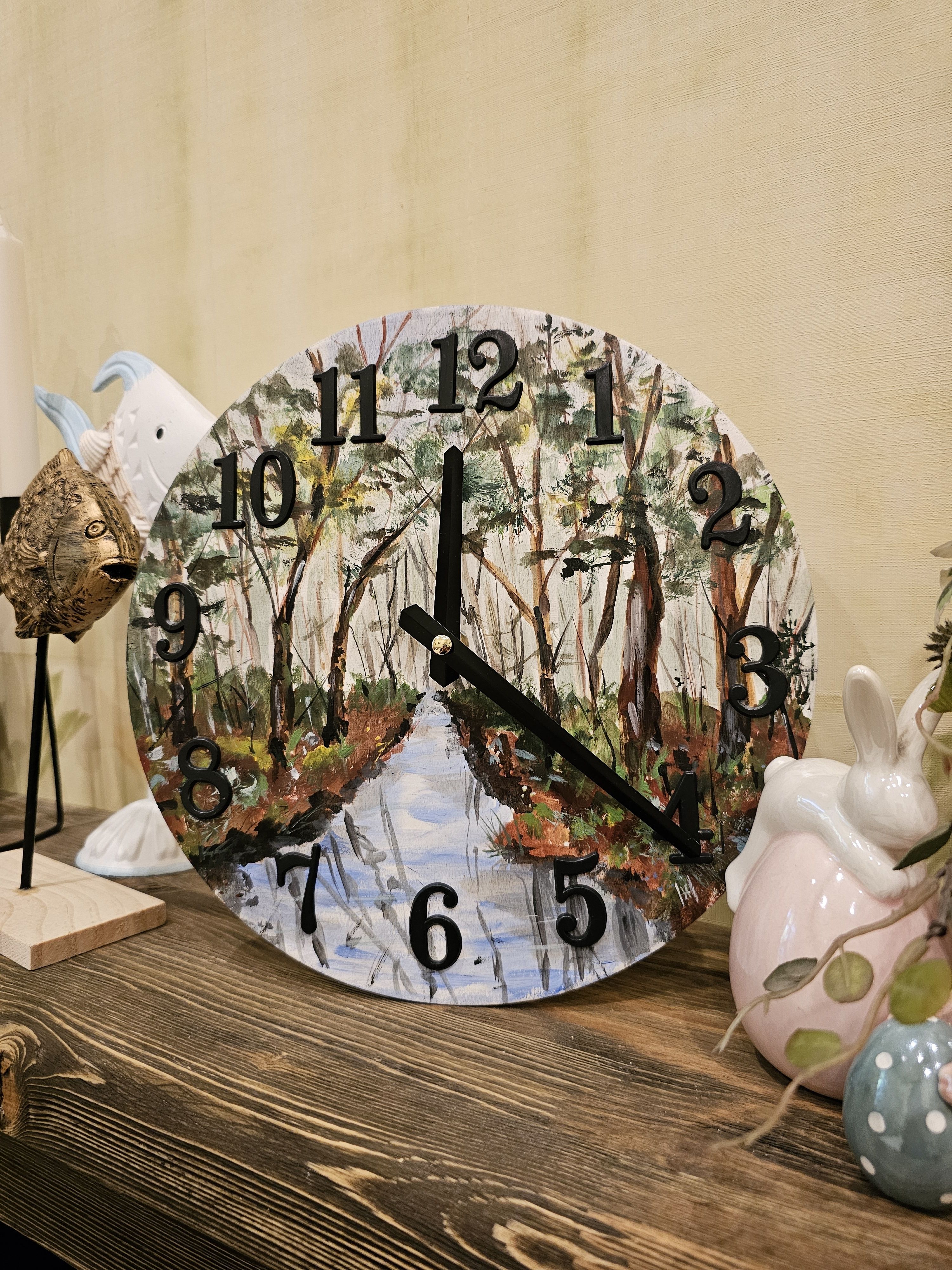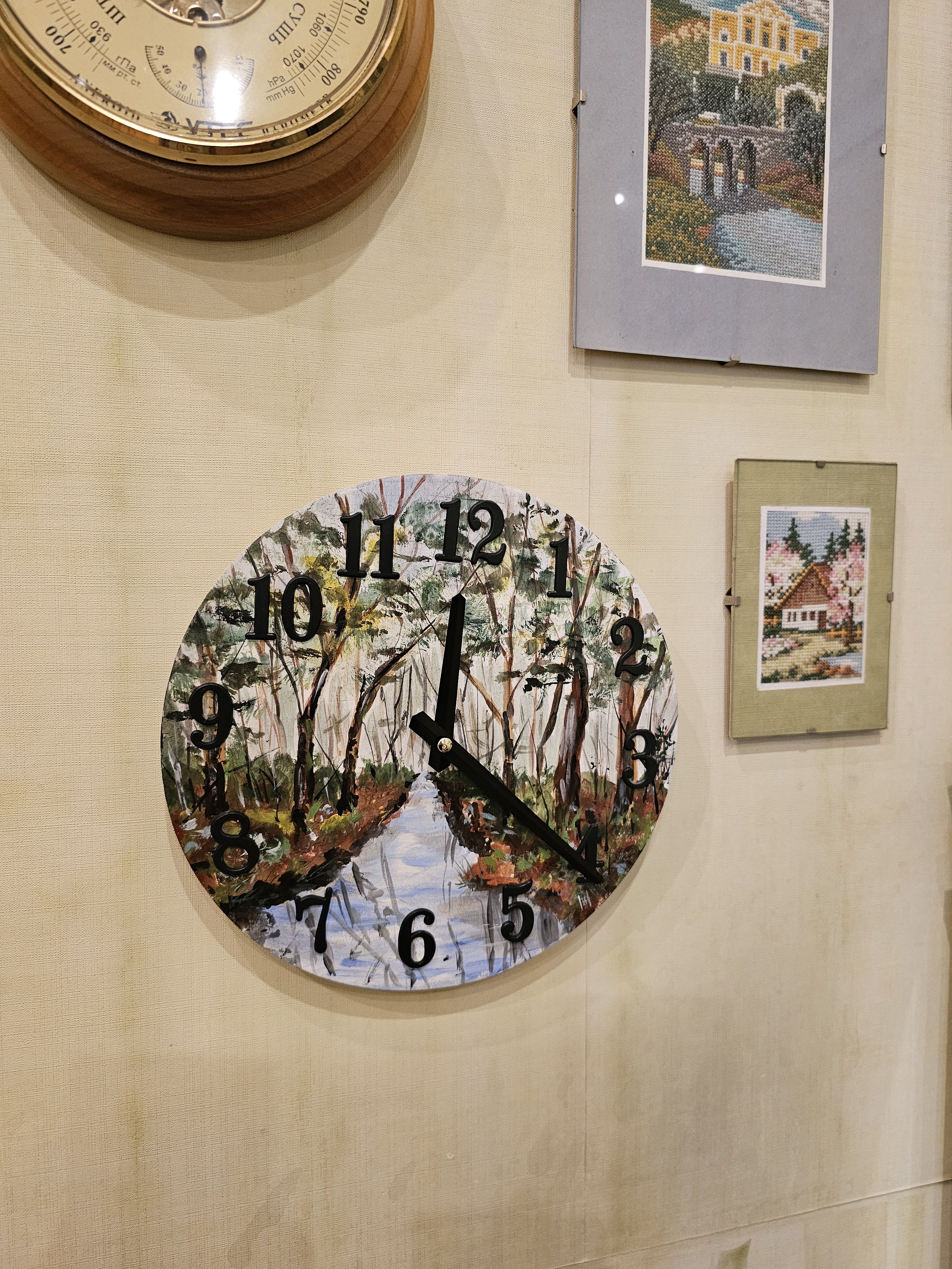 Часы ручной авторской работы станут ярким акцентом в интерьере благодаря сочетанию натурального дерева и красочного акрилового пейзажа. Диаметром 25 см они идеально впишутся в любое пространство, сохраняя элегантную форму и минималистичный дизайн.