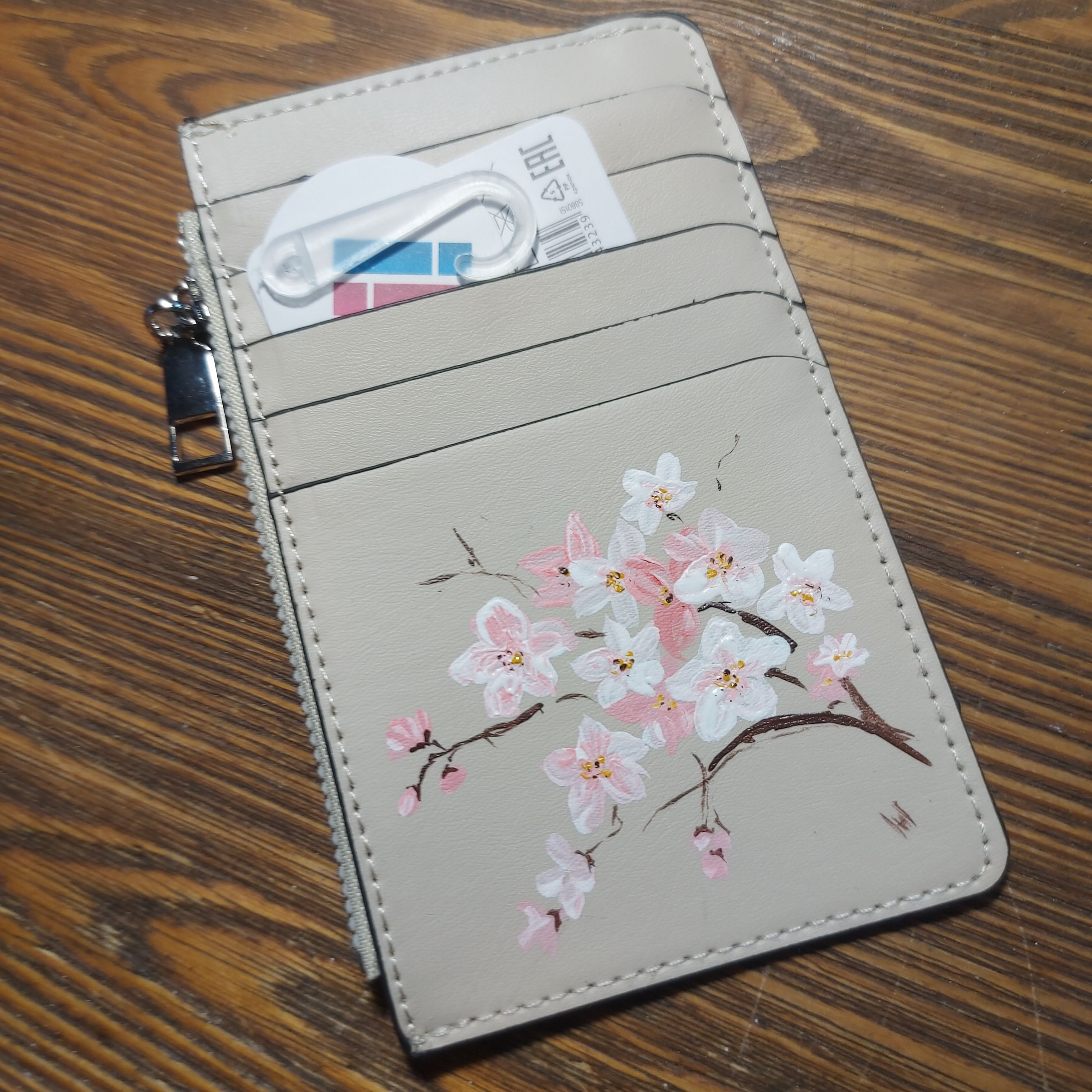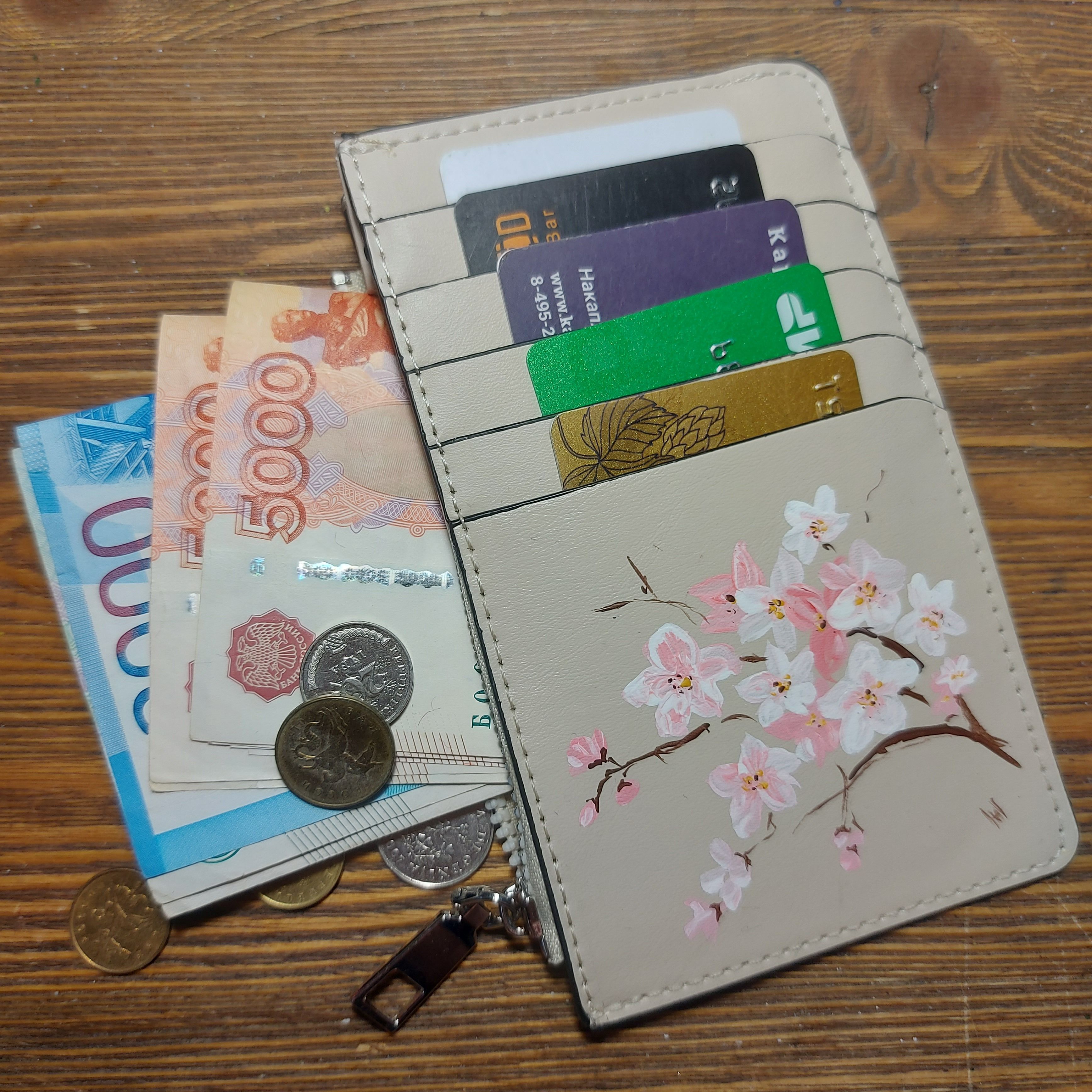 Картхолдер выполнен из искусственной кожи высокого качества с аккуратной проработкой швов . Компактный размер 15 см на 9 см позволяет носить визитницу в любом кармане или сумке. Нежная авторская роспись картхолдера станет эксклюзивным дополнением любого образа.