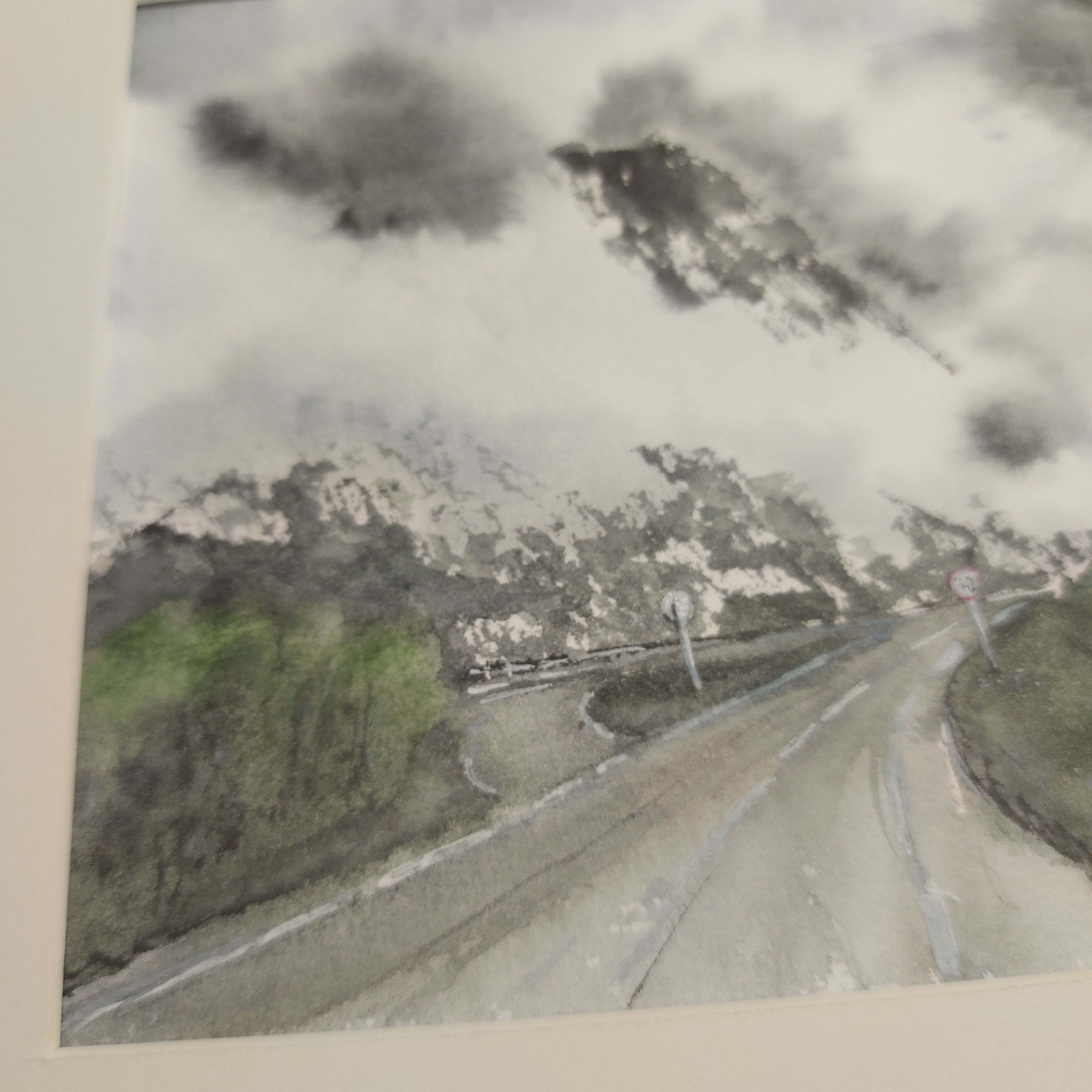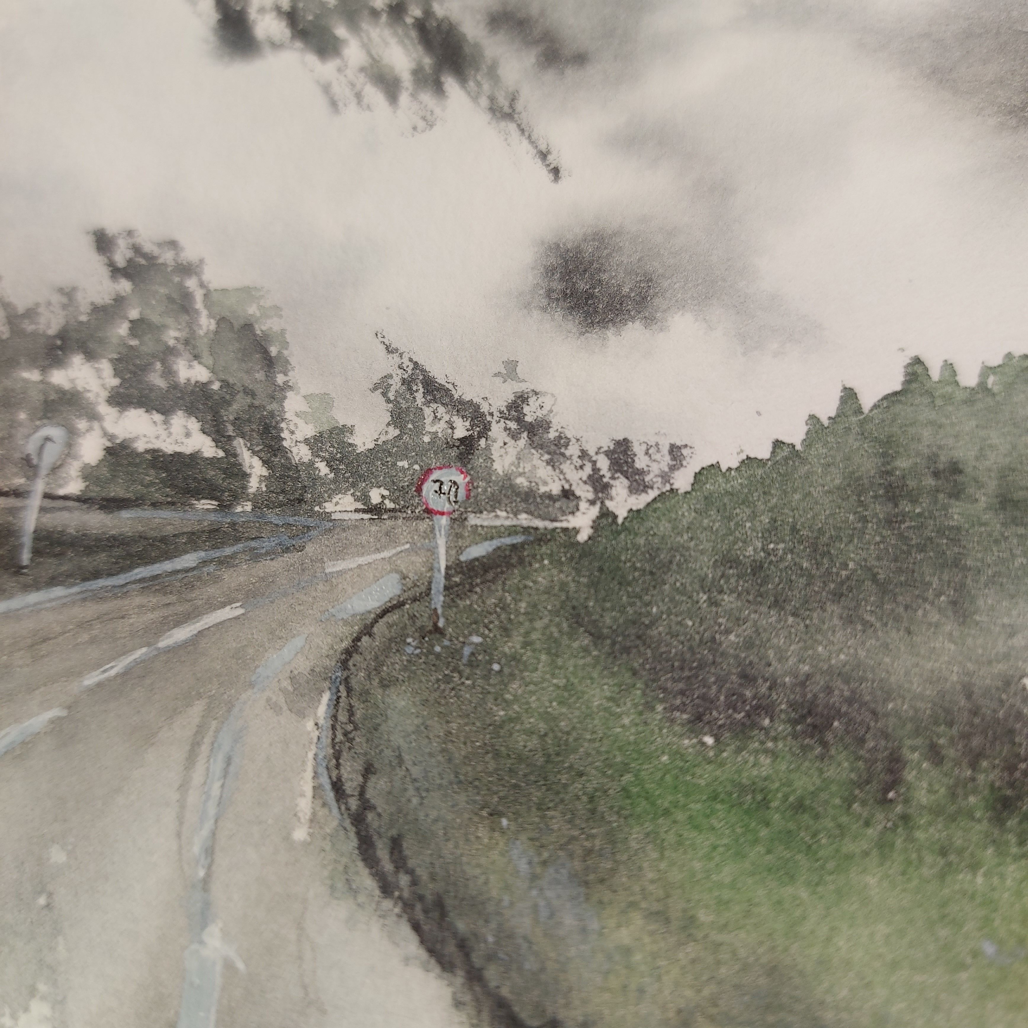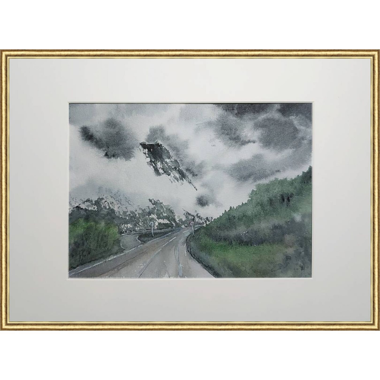 Мы видим на этой акварельной картине дорогу, идущей через горную, лесистую местность. На переднем плане видна извилистая дорога с ограничением скорости, которая ведет вглубь пейзажа. По обе стороны дороги растут деревья и кустарники; особенно густая растительность изображена справа. Вдали и справа можно увидеть горы, окутанные туманом. Небо на картине затянуто серыми облаками, что придаёт общей атмосфере картины мрачный и дождливый вид. Картина обрамлена светлым паспарту. В правом нижнем углу подпись автора.