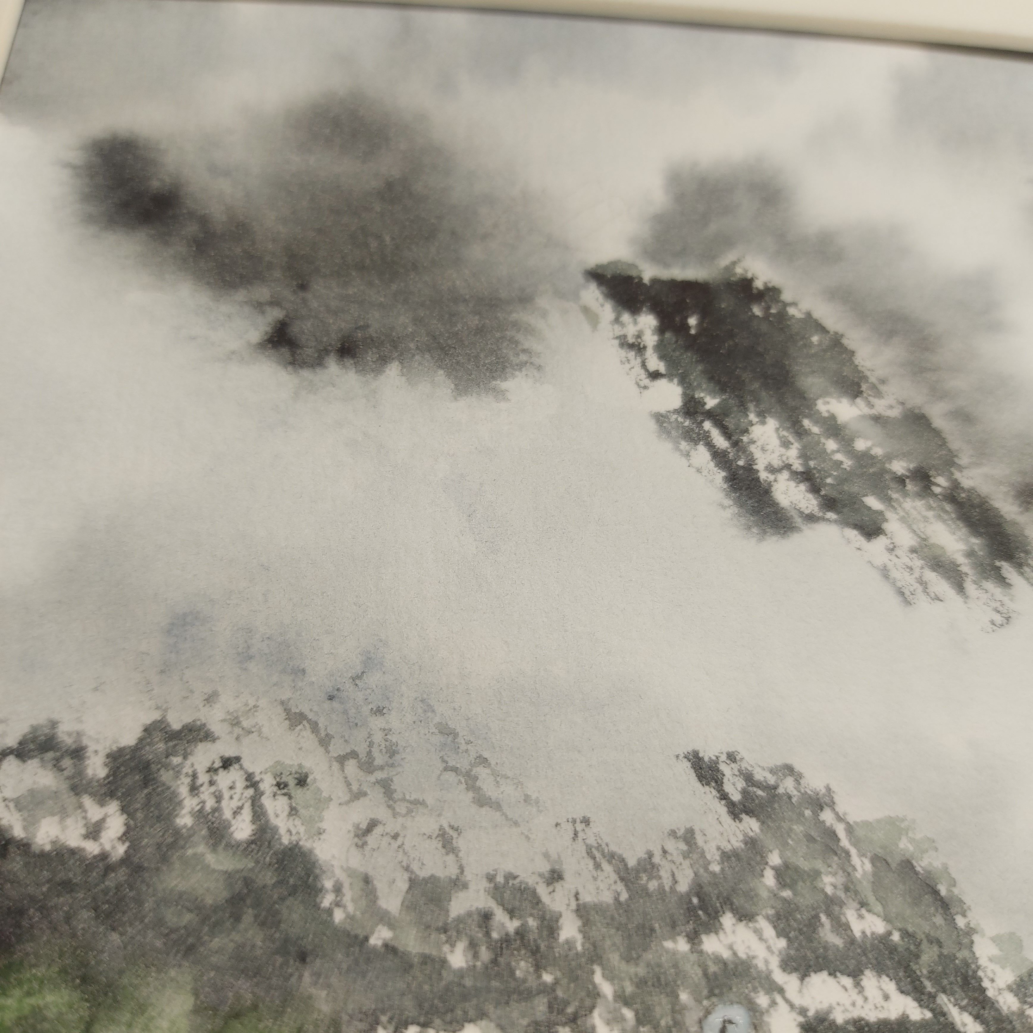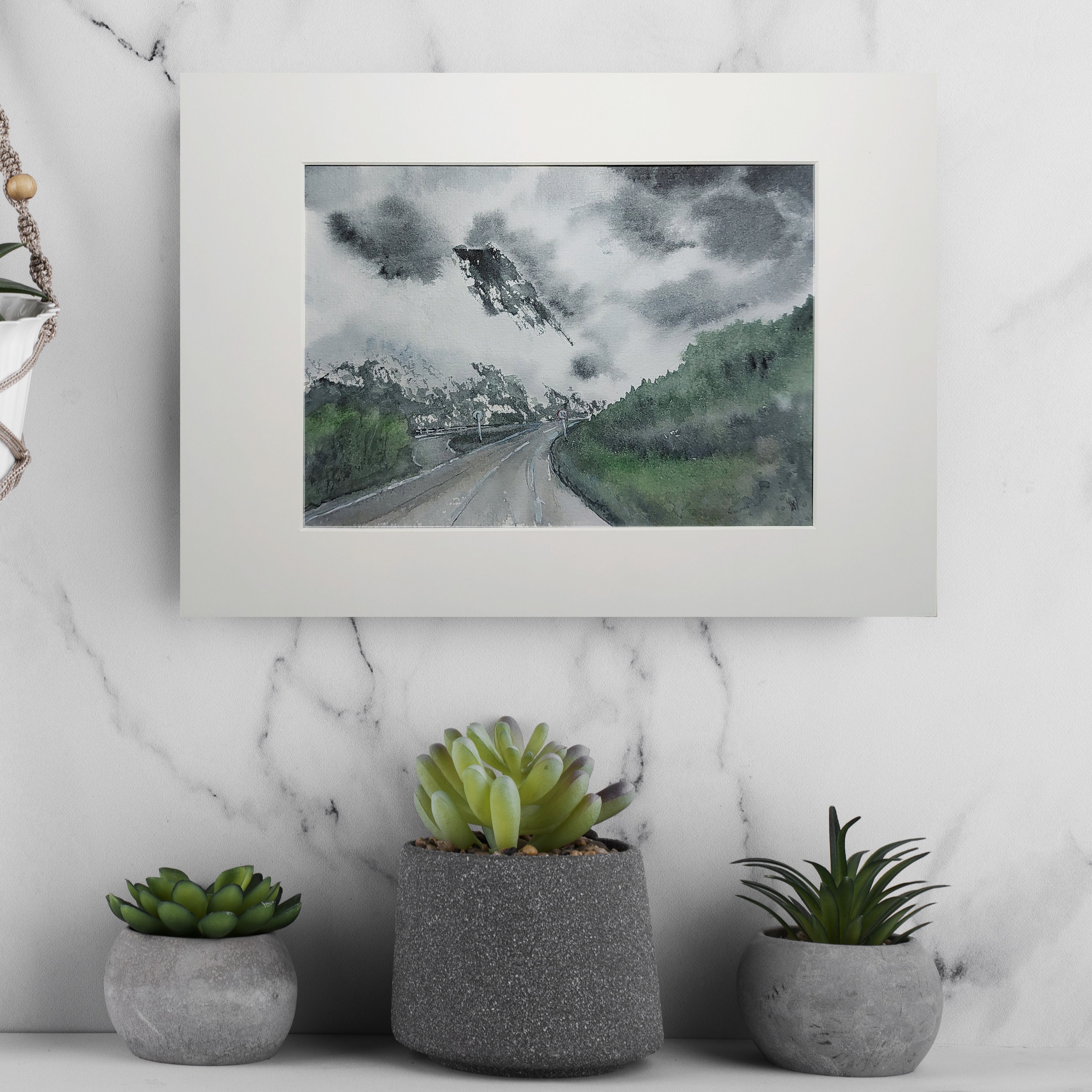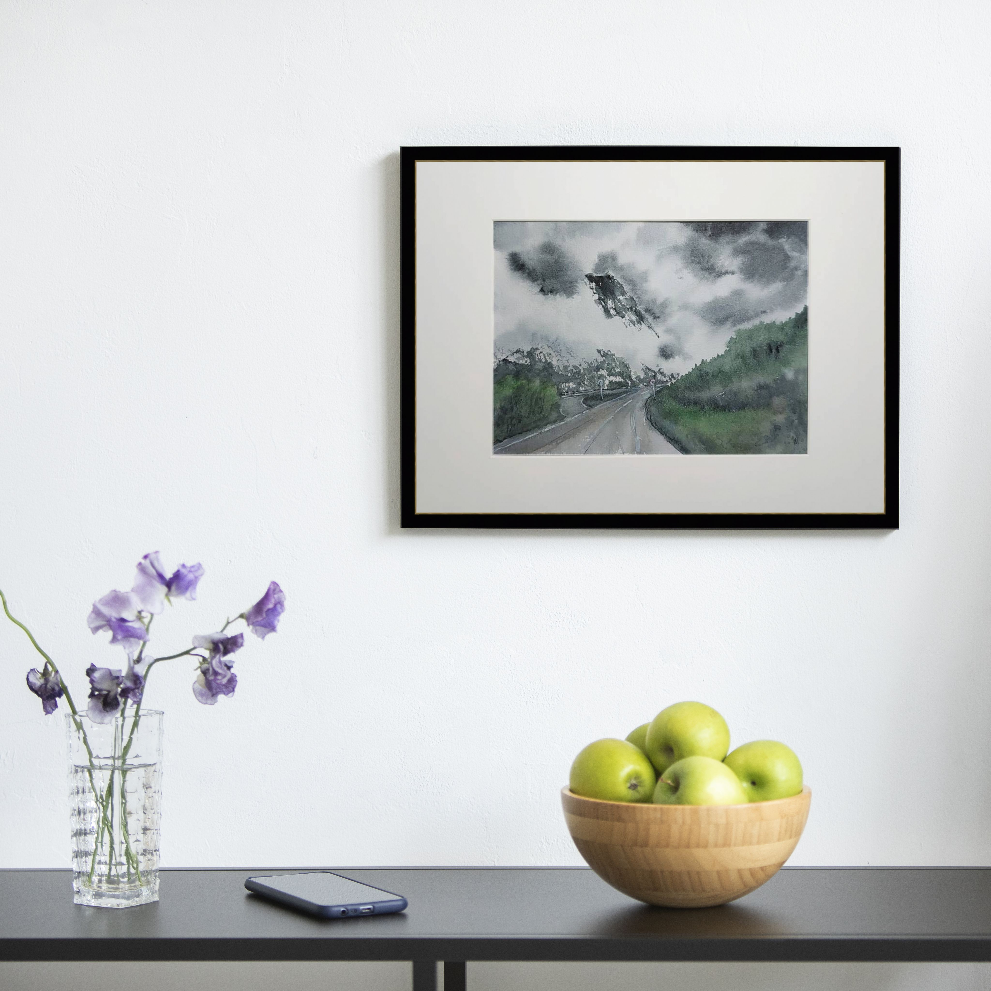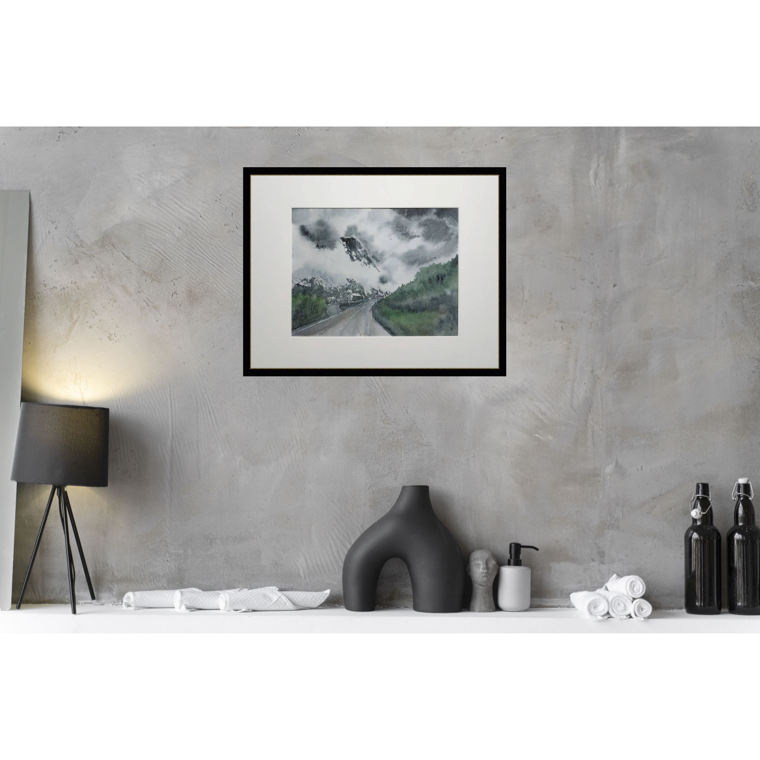 Мы видим на этой акварельной картине дорогу, идущей через горную, лесистую местность. На переднем плане видна извилистая дорога с ограничением скорости, которая ведет вглубь пейзажа. По обе стороны дороги растут деревья и кустарники; особенно густая растительность изображена справа. Вдали и справа можно увидеть горы, окутанные туманом. Небо на картине затянуто серыми облаками, что придаёт общей атмосфере картины мрачный и дождливый вид. Картина обрамлена светлым паспарту. В правом нижнем углу подпись автора.