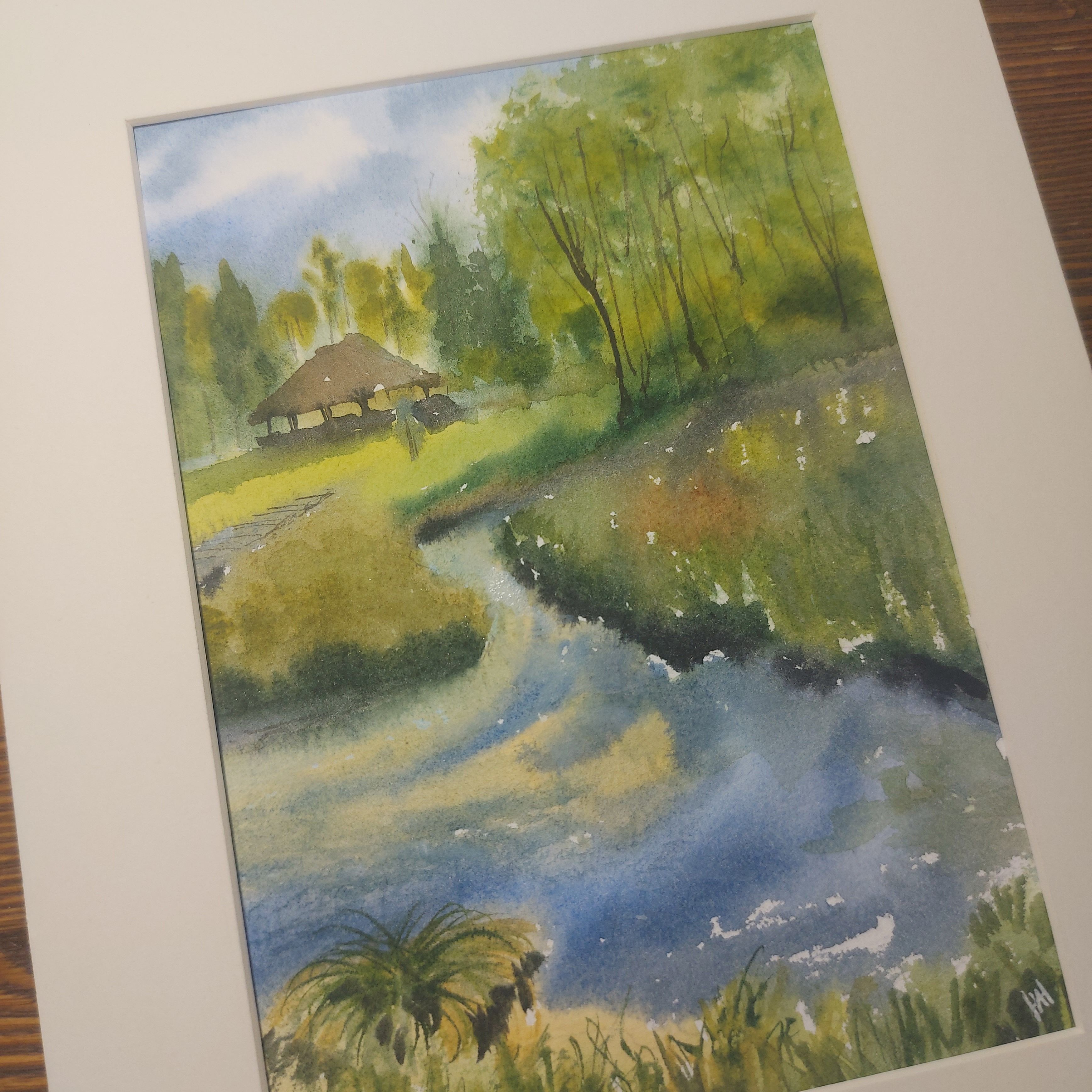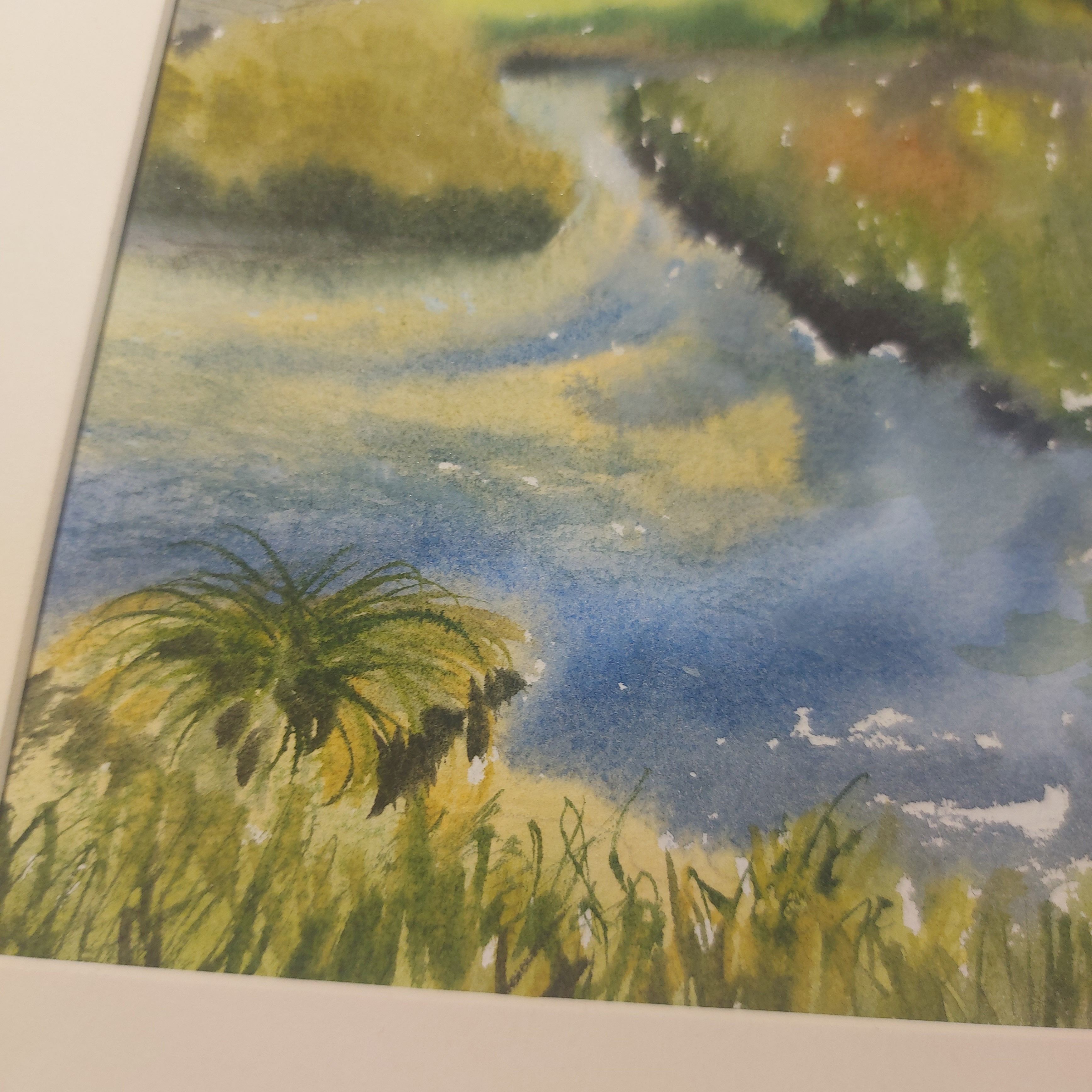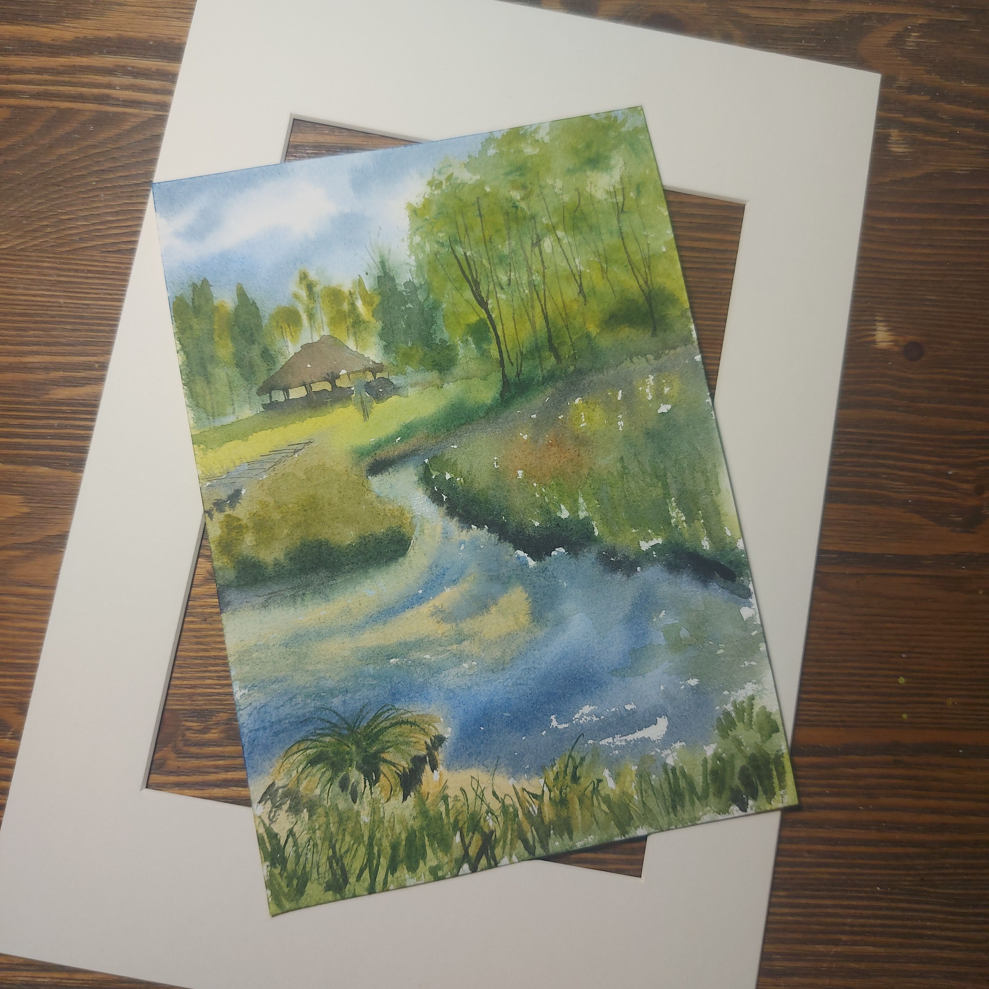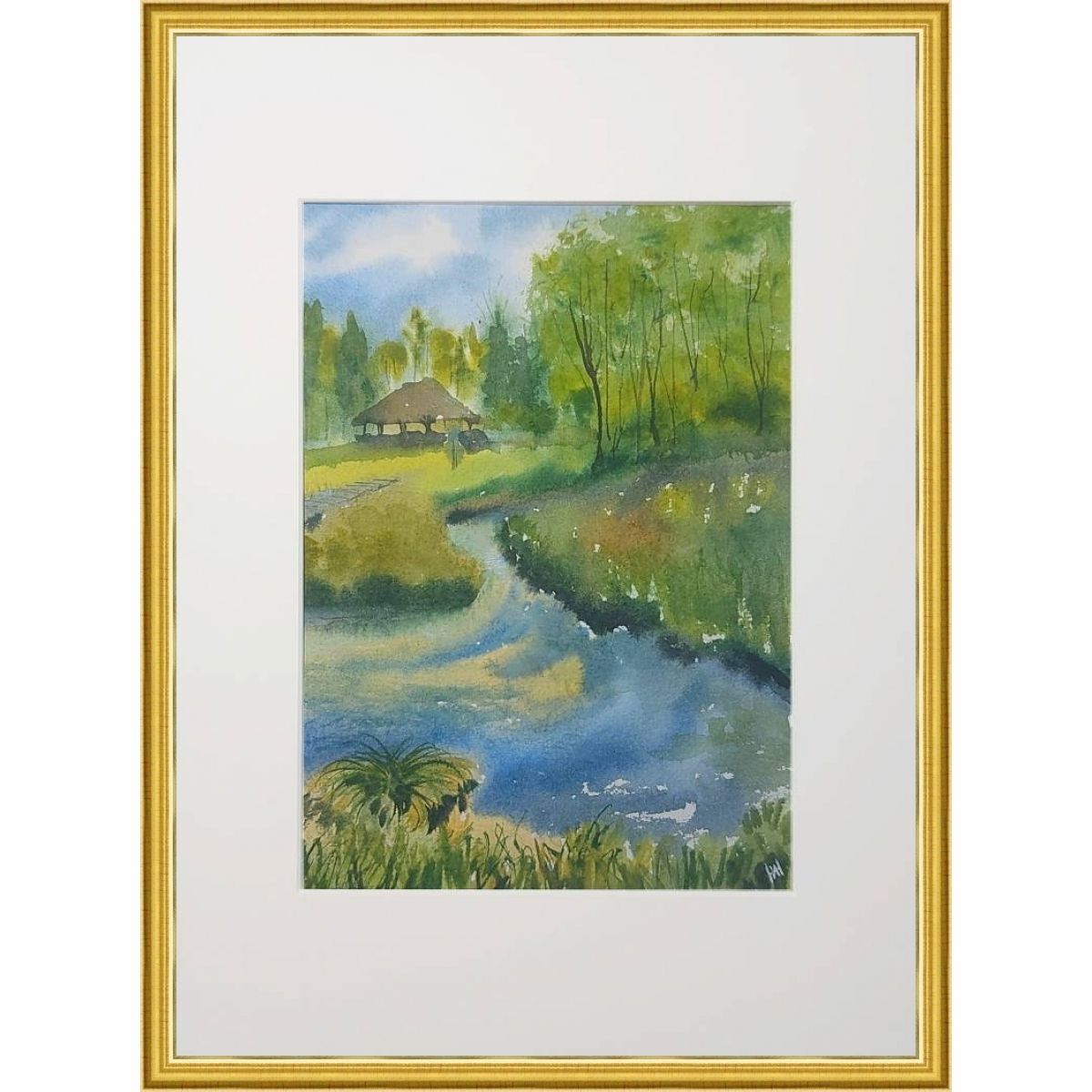 На картине живописная сцена, выполненная акварелью. На переднем плане находится спокойное русло реки, чьи голубые воды отражают свет неба. Вдоль берегов растут зеленые травы и кустарники, передающие всю красоту природы этого места.