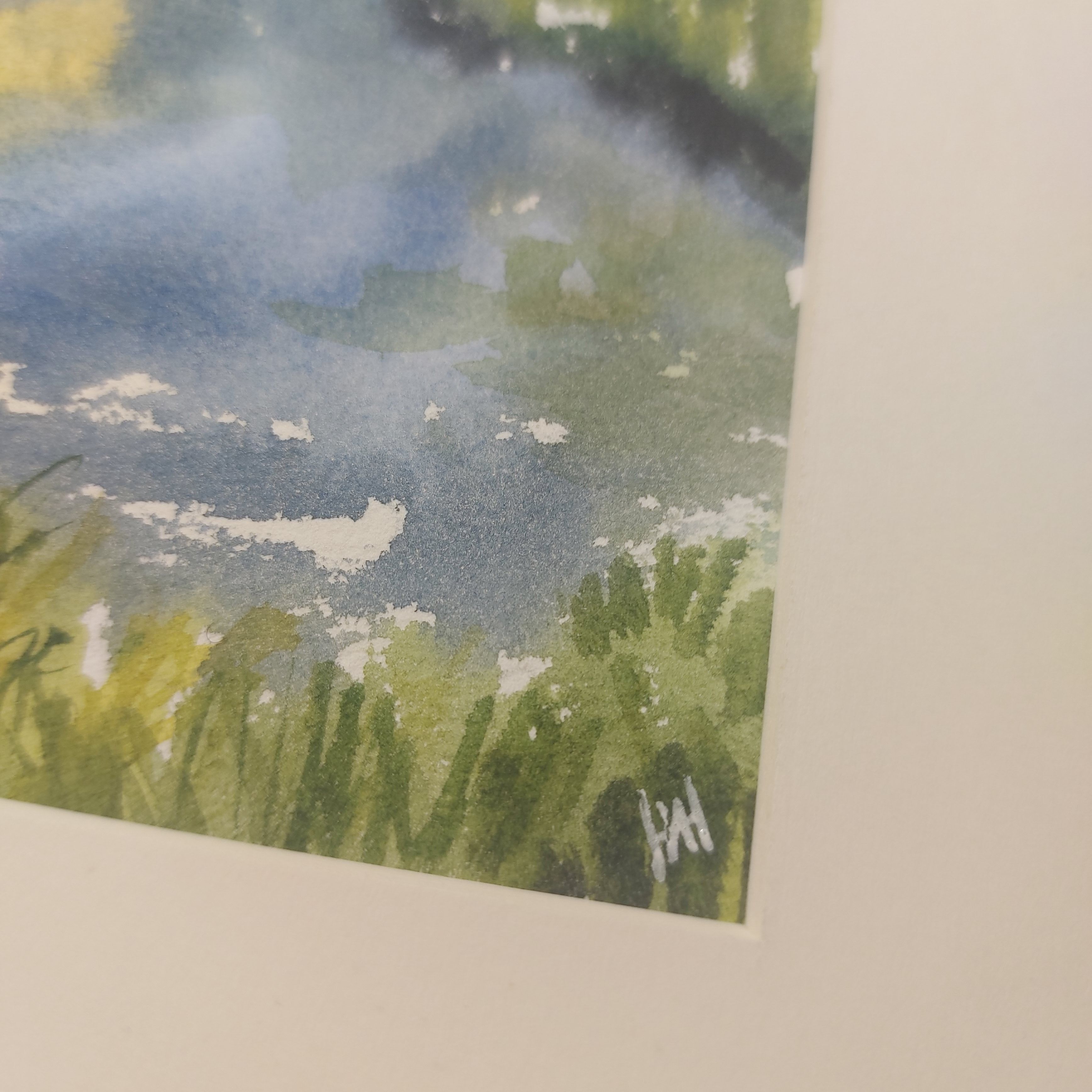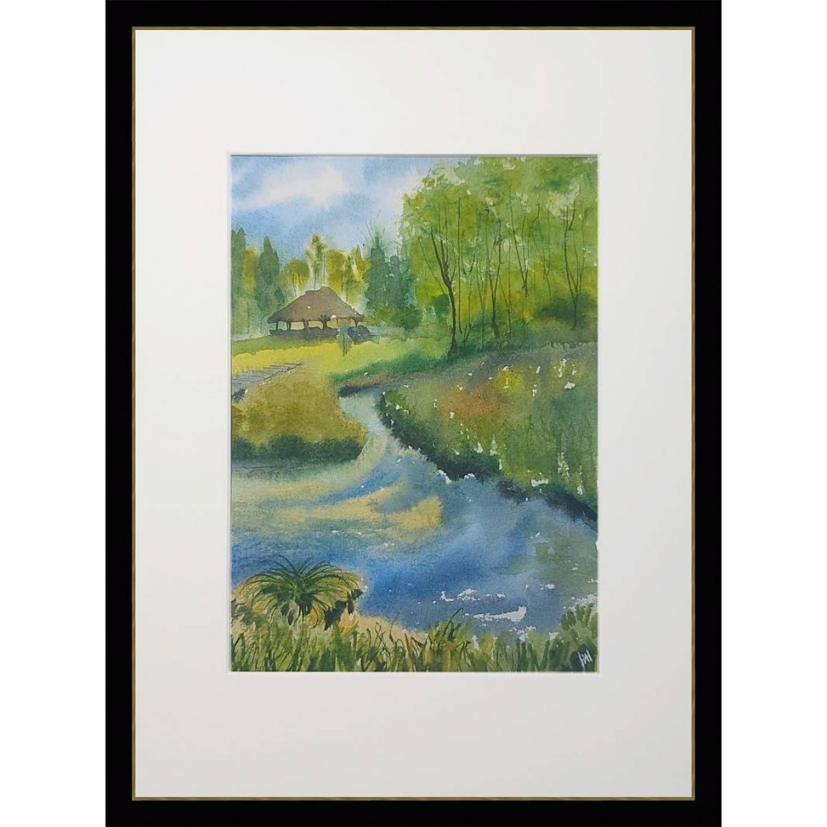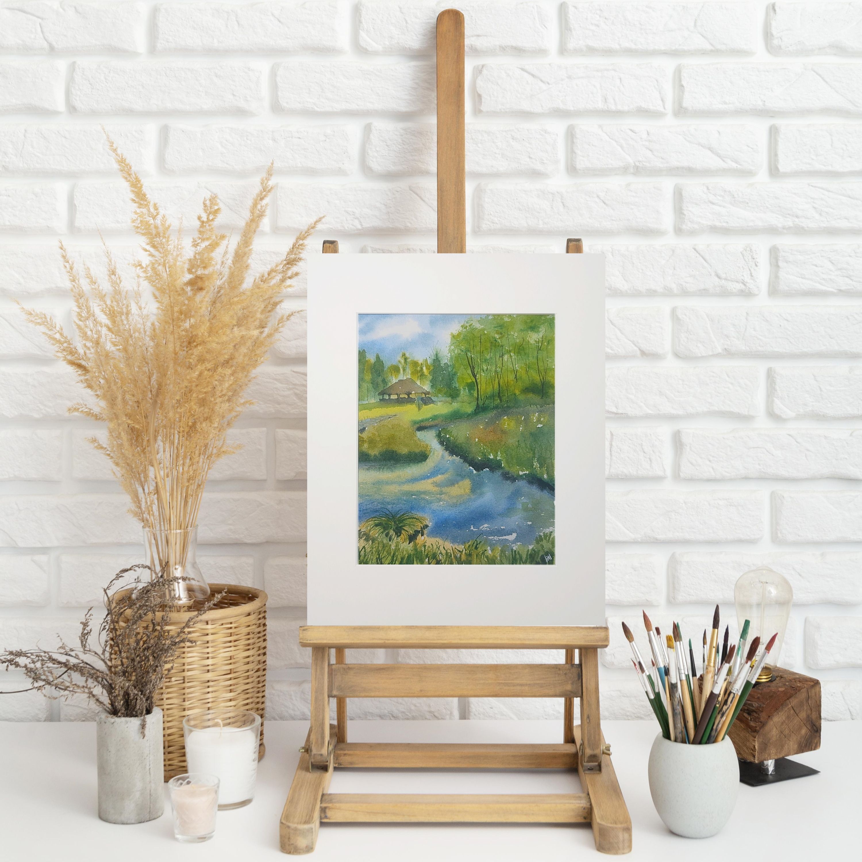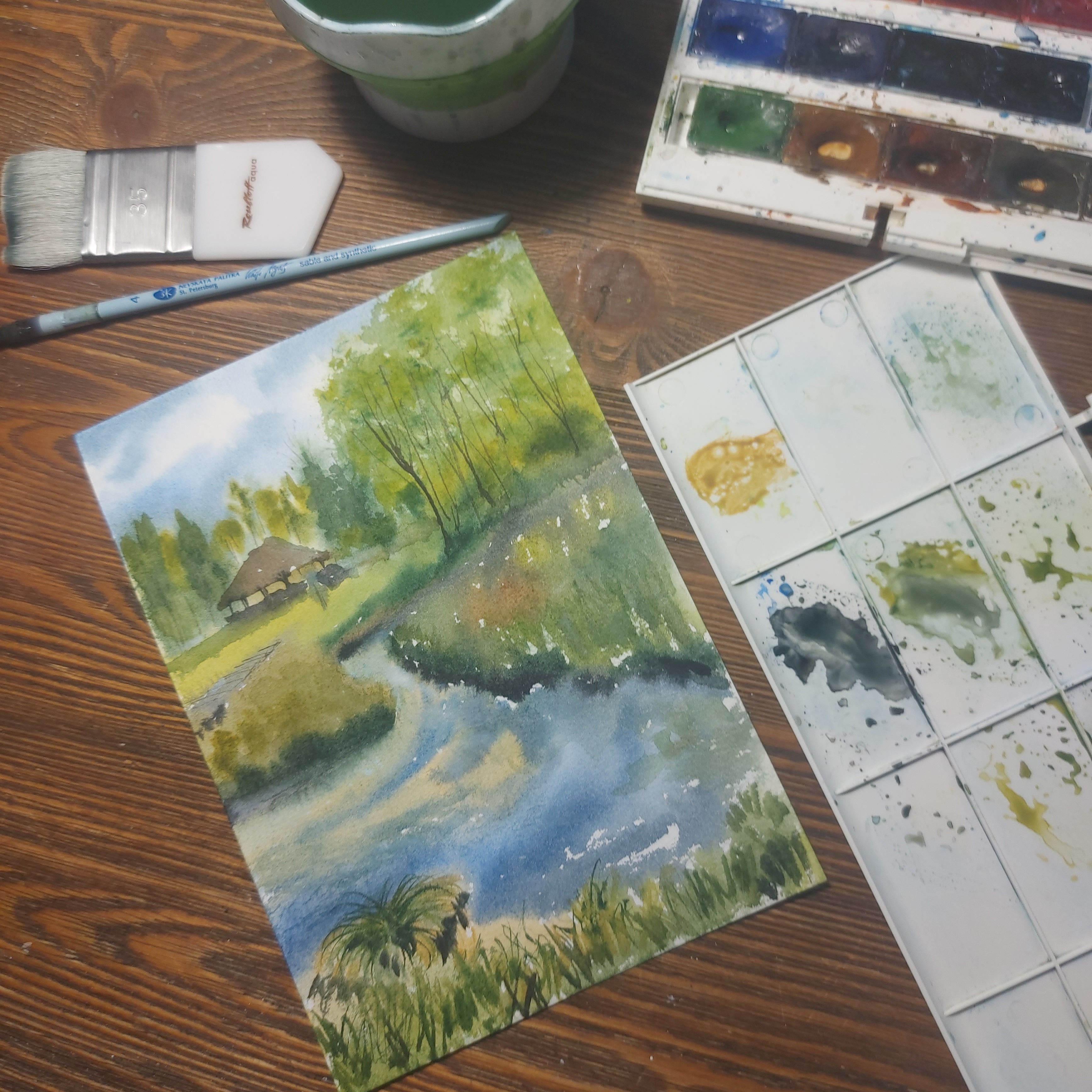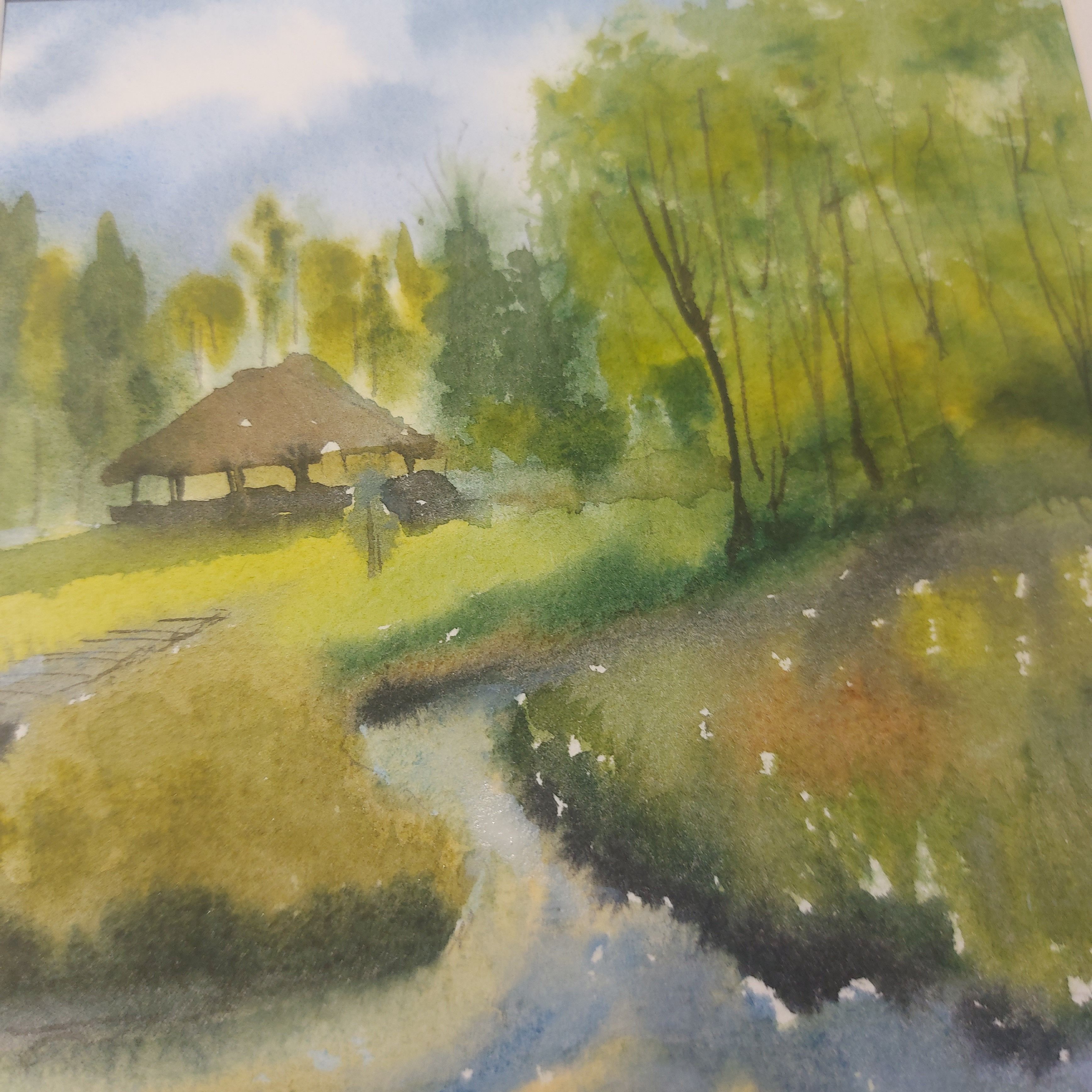На картине живописная сцена, выполненная акварелью. На переднем плане находится спокойное русло реки, чьи голубые воды отражают свет неба. Вдоль берегов растут зеленые травы и кустарники, передающие всю красоту природы этого места.