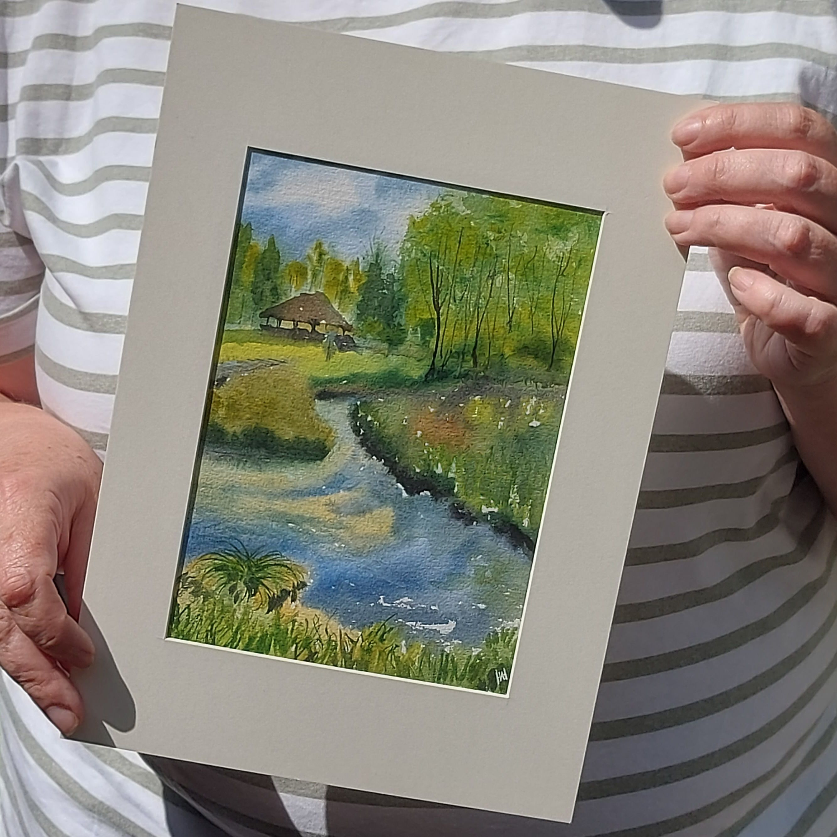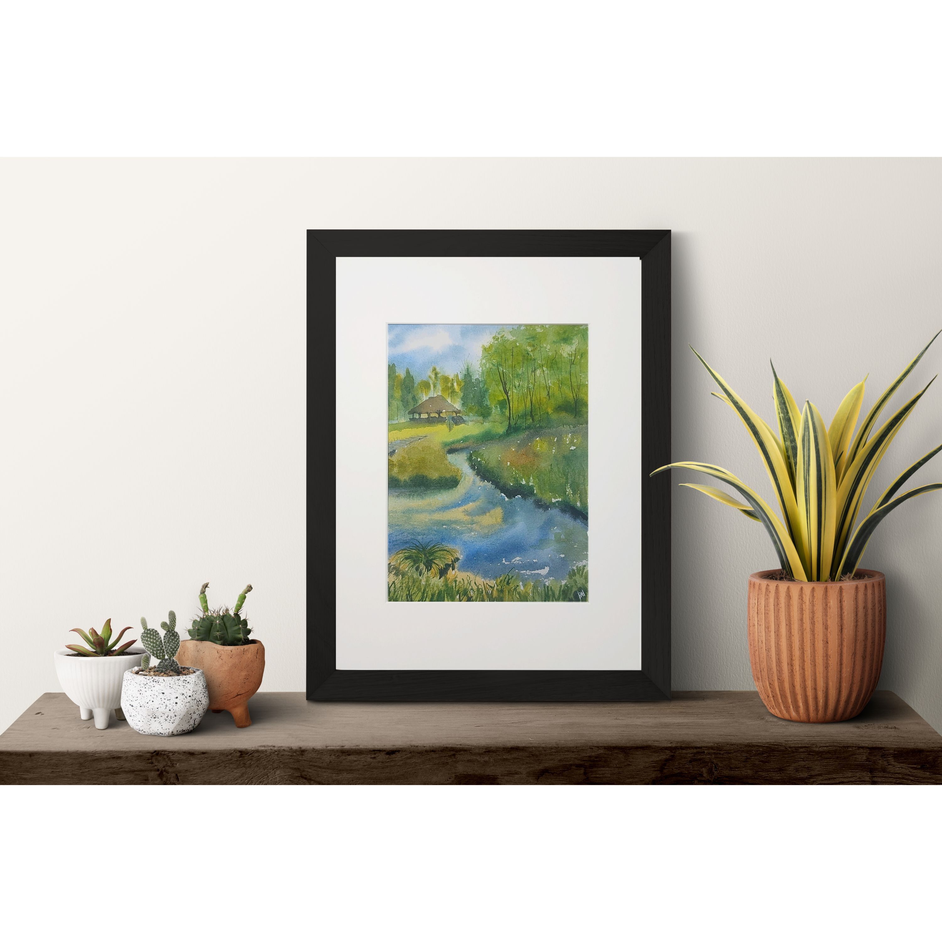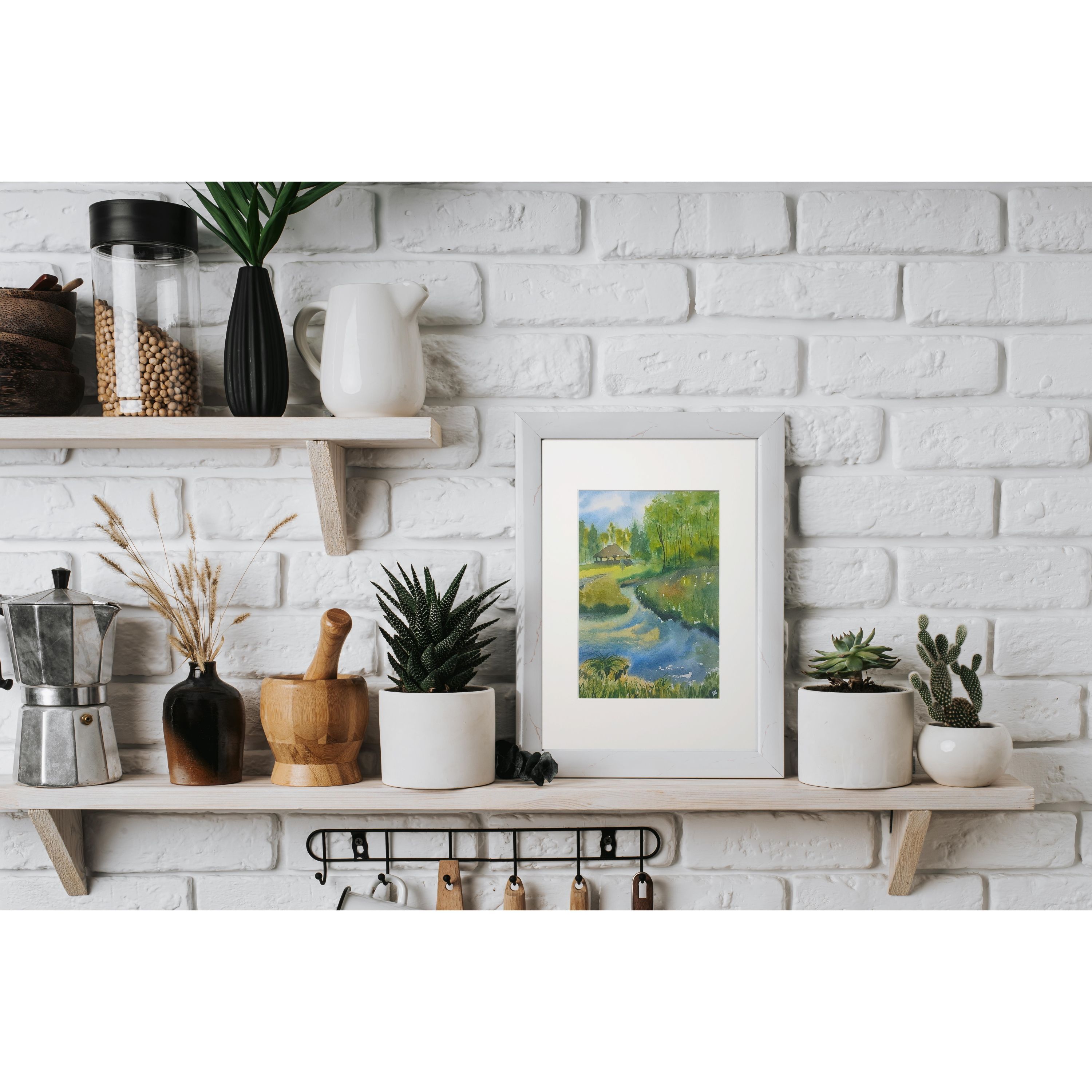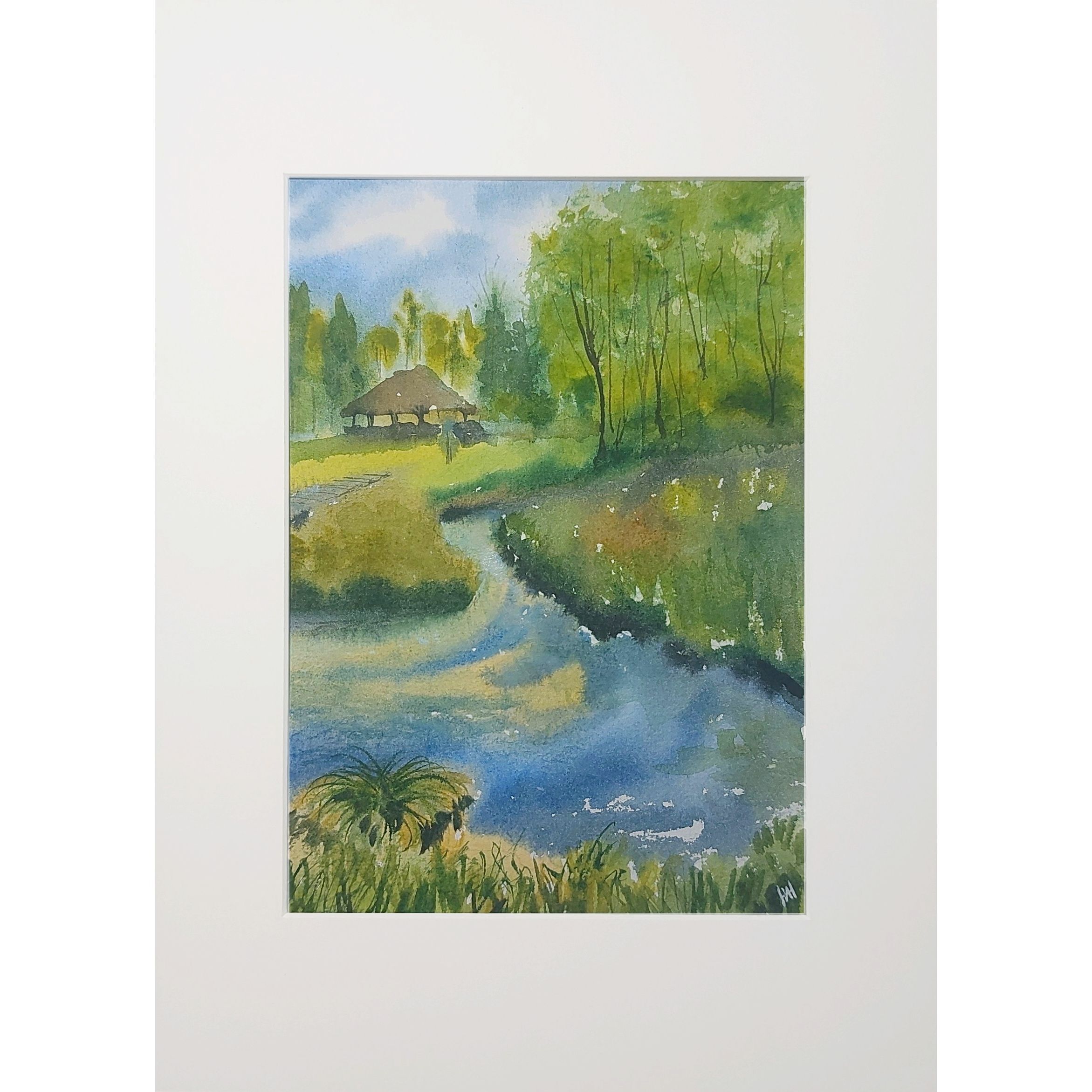На картине живописная сцена, выполненная акварелью. На переднем плане находится спокойное русло реки, чьи голубые воды отражают свет неба. Вдоль берегов растут зеленые травы и кустарники, передающие всю красоту природы этого места.