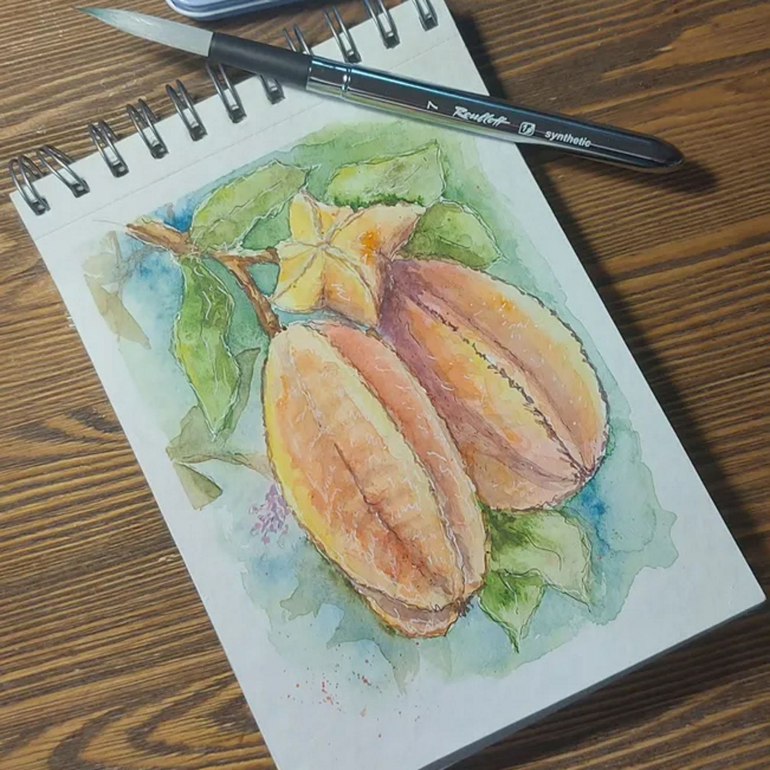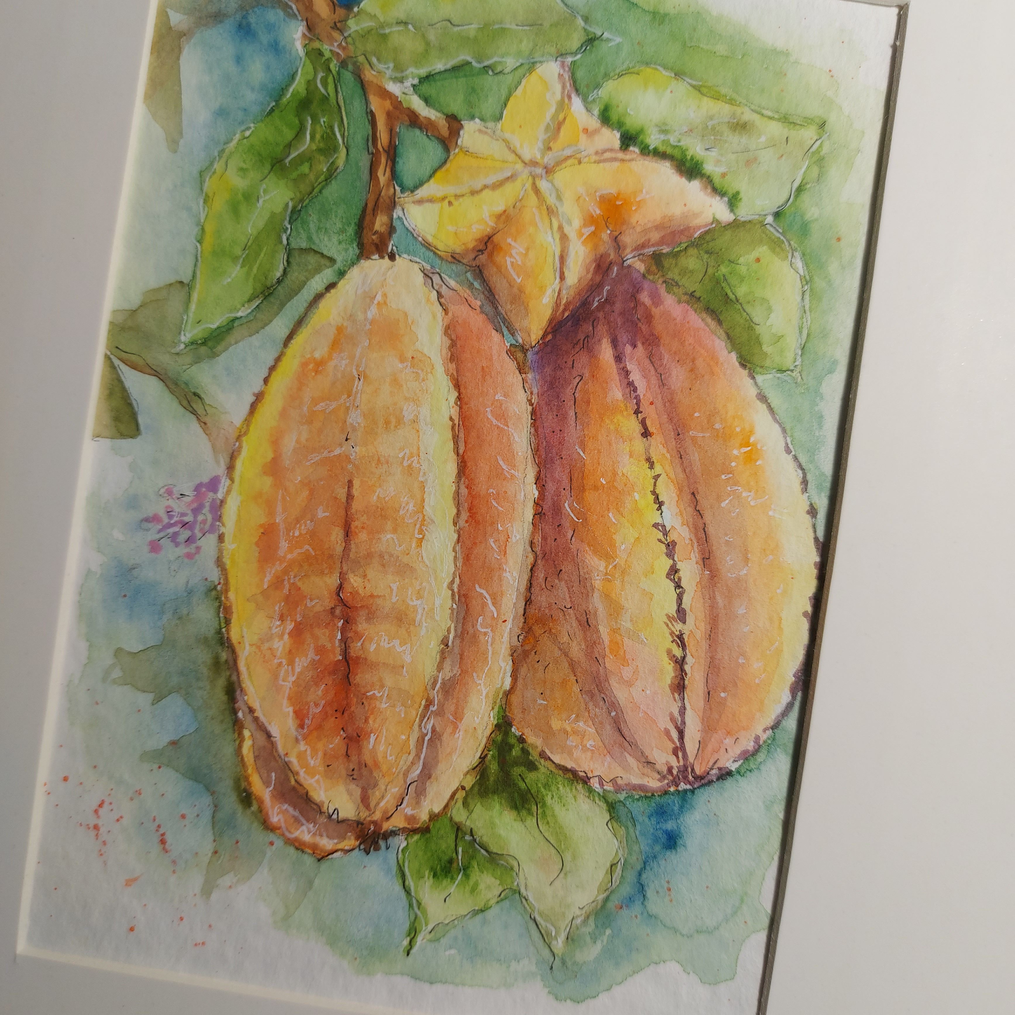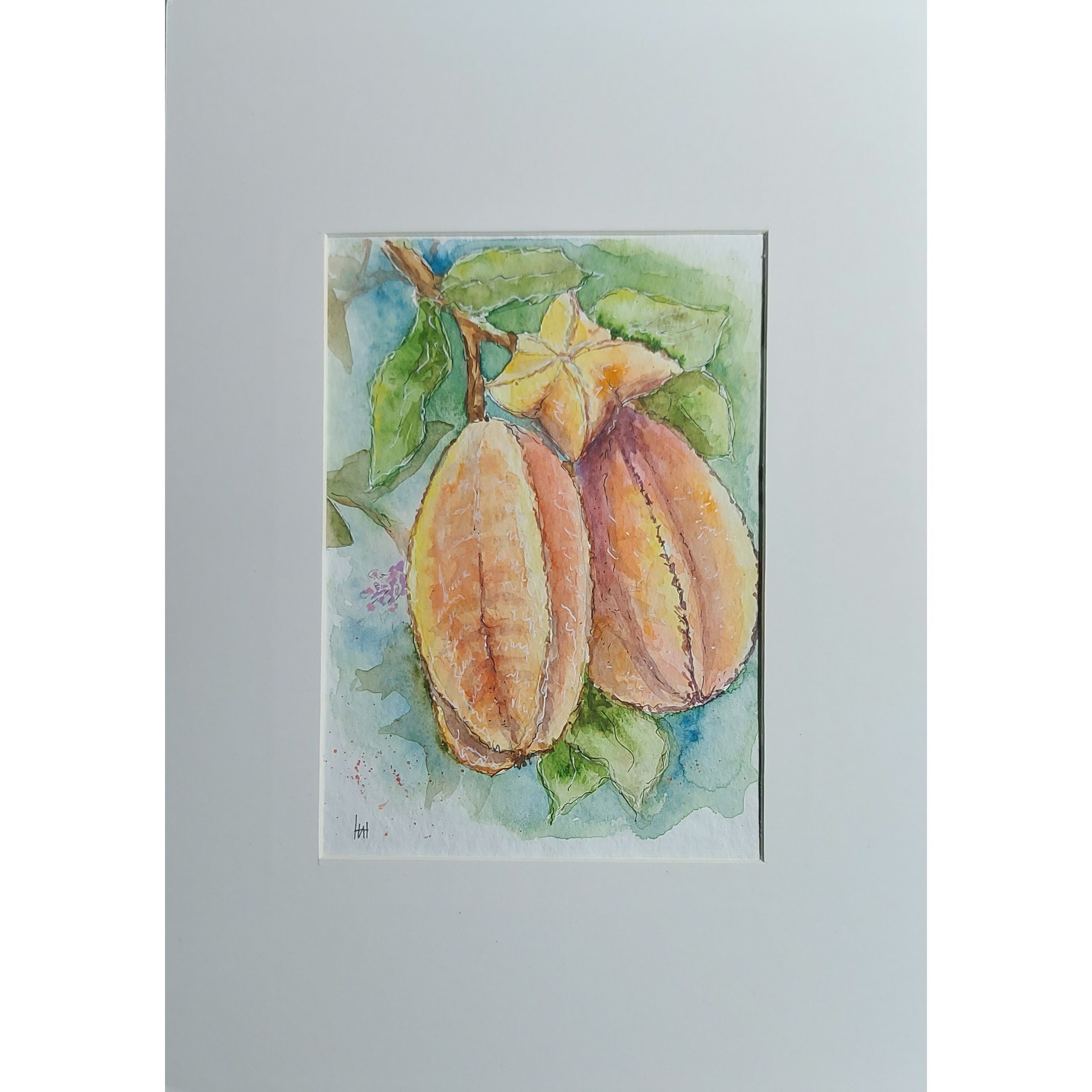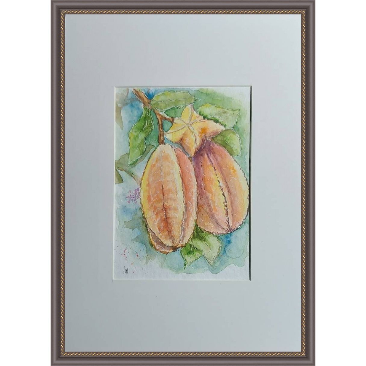 На акварельной картине изображены спелые плоды Карамболы. Они висят на ветке и окружены зелёными листьями. Цвета работы мягкие и приглушённые с преобладанием оранжевого, зелёного и коричневого оттенков. Элементы раскрашены неравномерно, что придаёт изображению характерную для акварели живость и лёгкость. Внизу справа инициалы художника. Акварель в белом паспарту и готова для дальнейшего оформления.