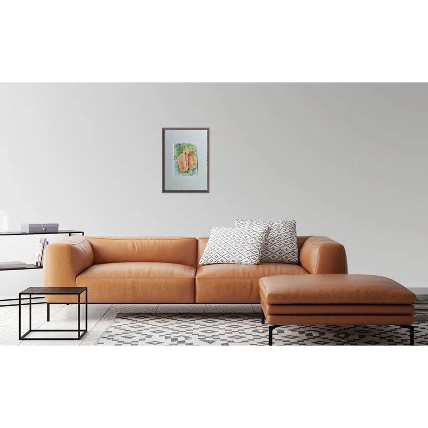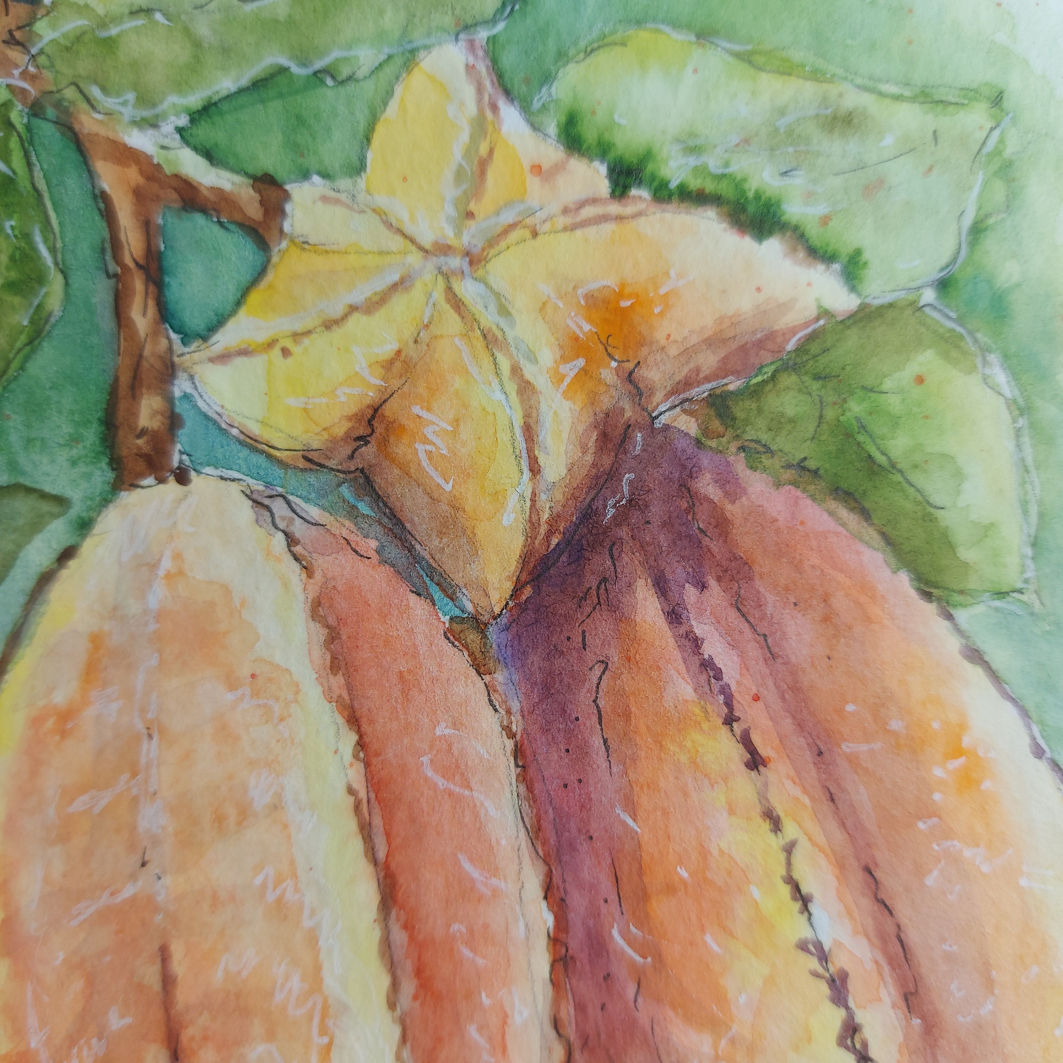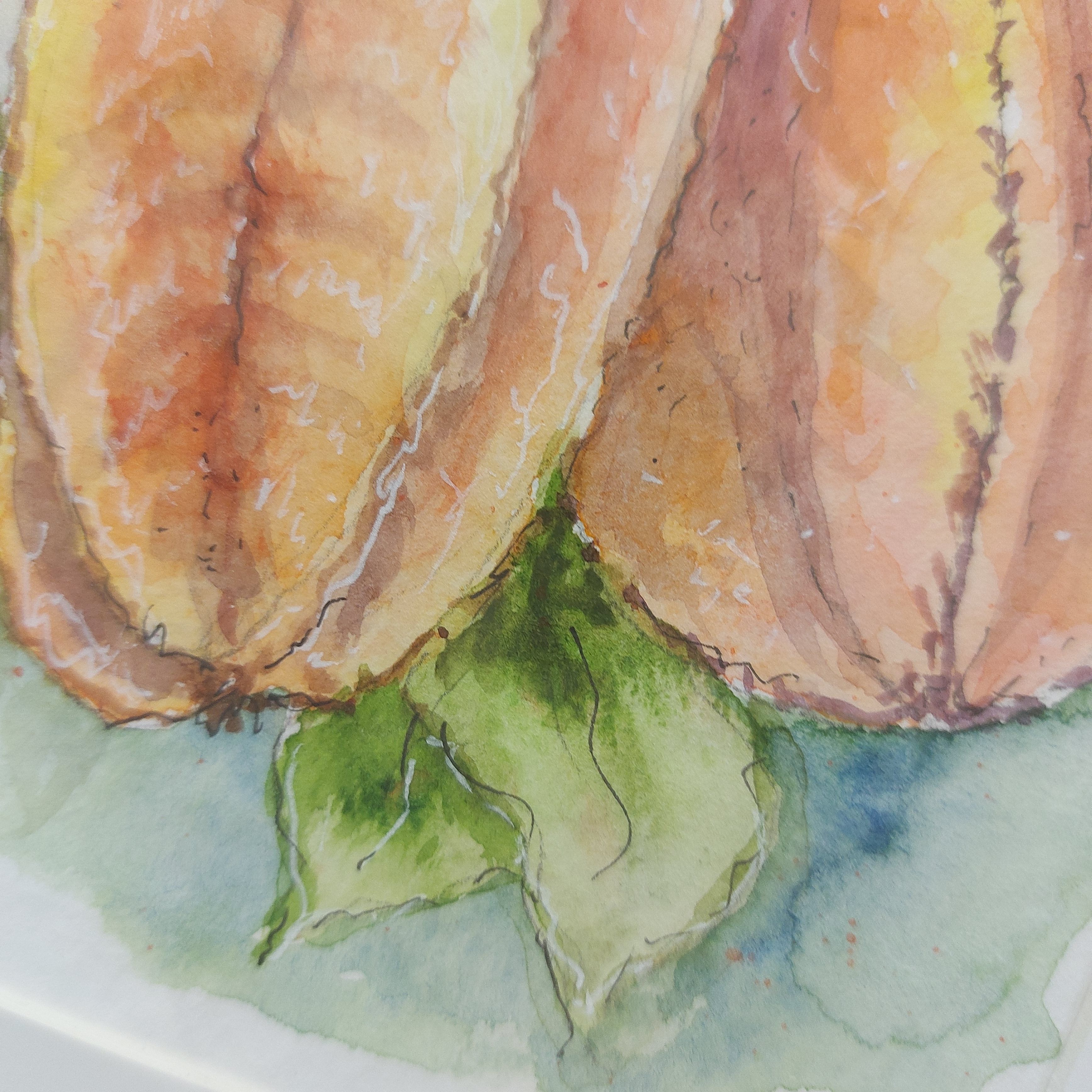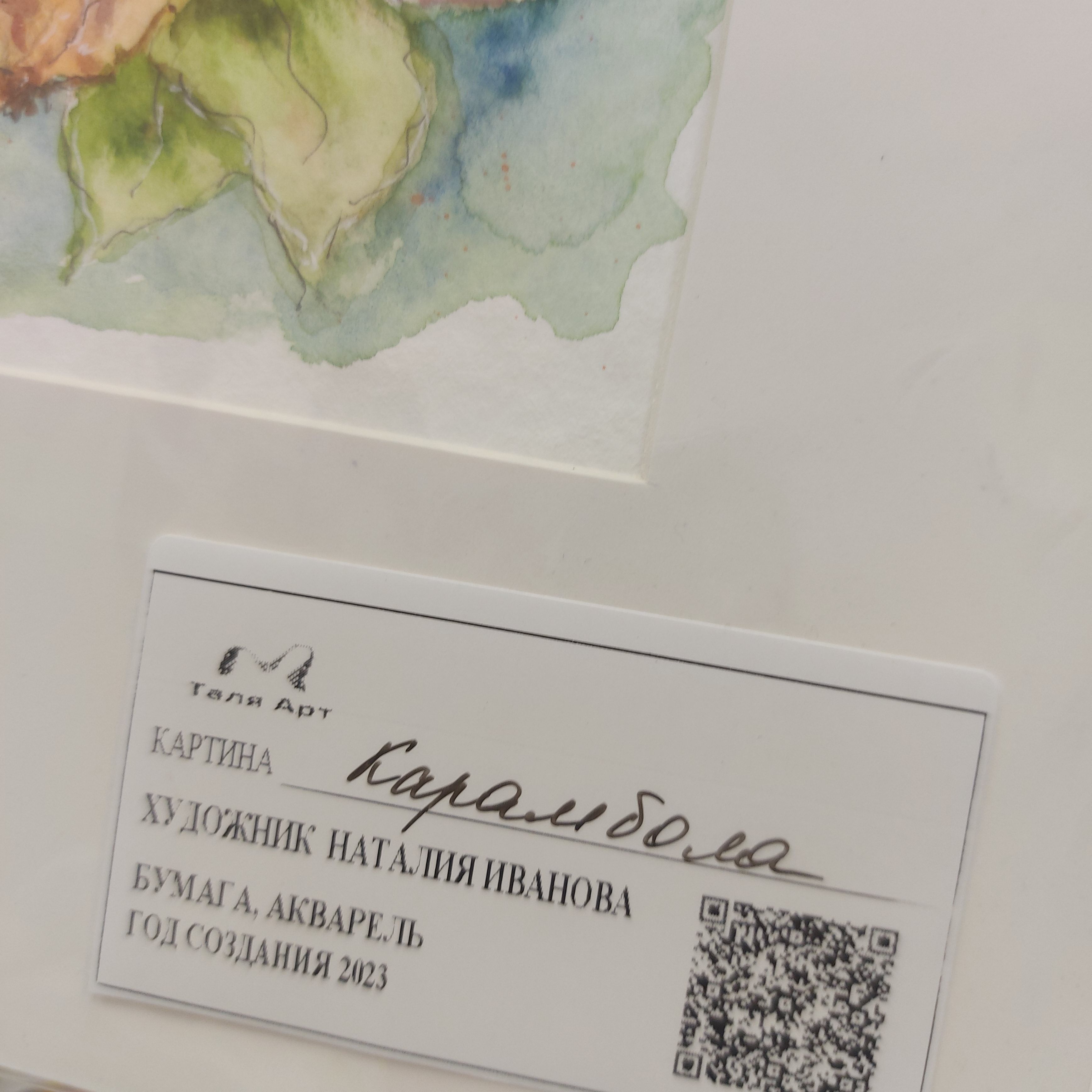 На акварельной картине изображены спелые плоды Карамболы. Они висят на ветке и окружены зелёными листьями. Цвета работы мягкие и приглушённые с преобладанием оранжевого, зелёного и коричневого оттенков. Элементы раскрашены неравномерно, что придаёт изображению характерную для акварели живость и лёгкость. Внизу справа инициалы художника. Акварель в белом паспарту и готова для дальнейшего оформления.