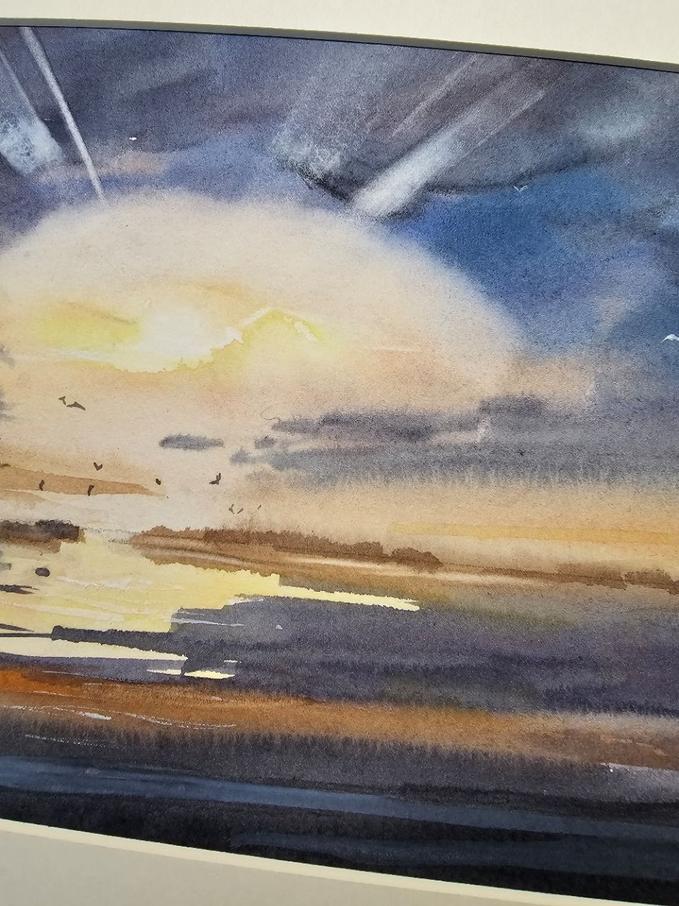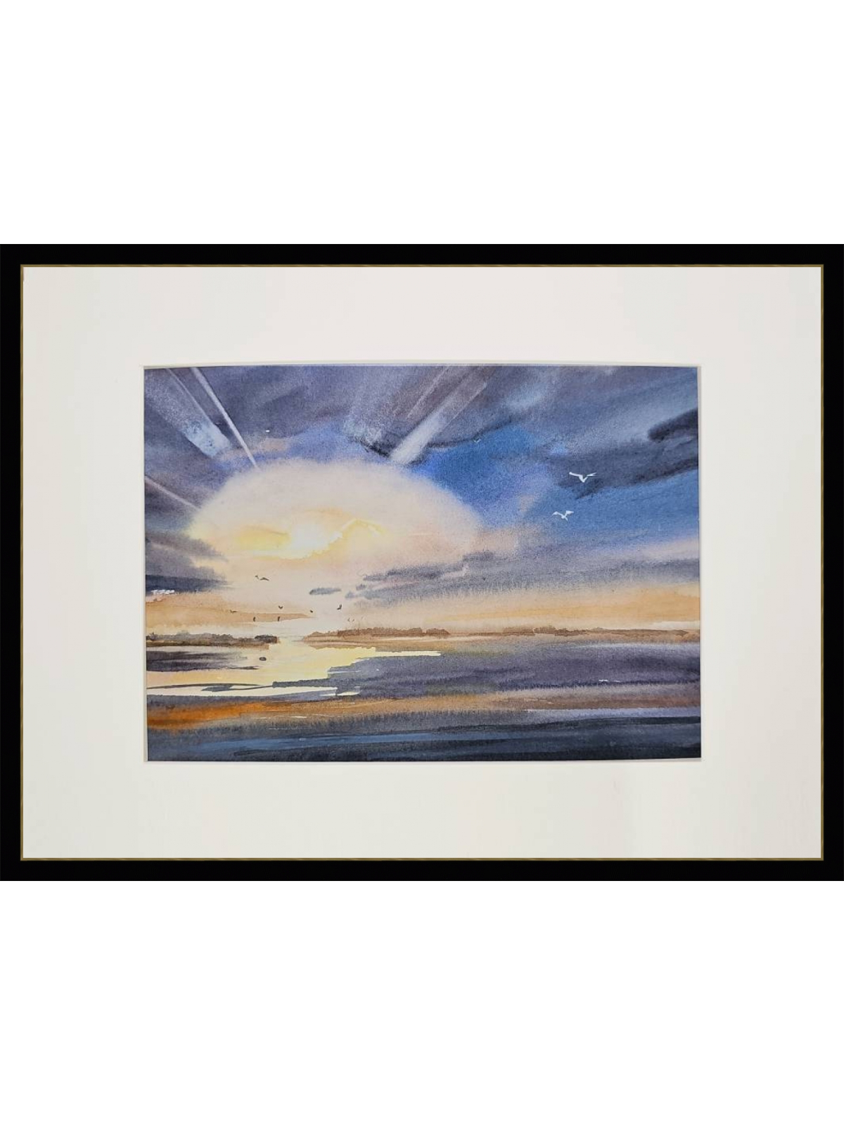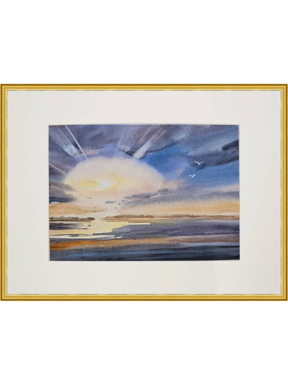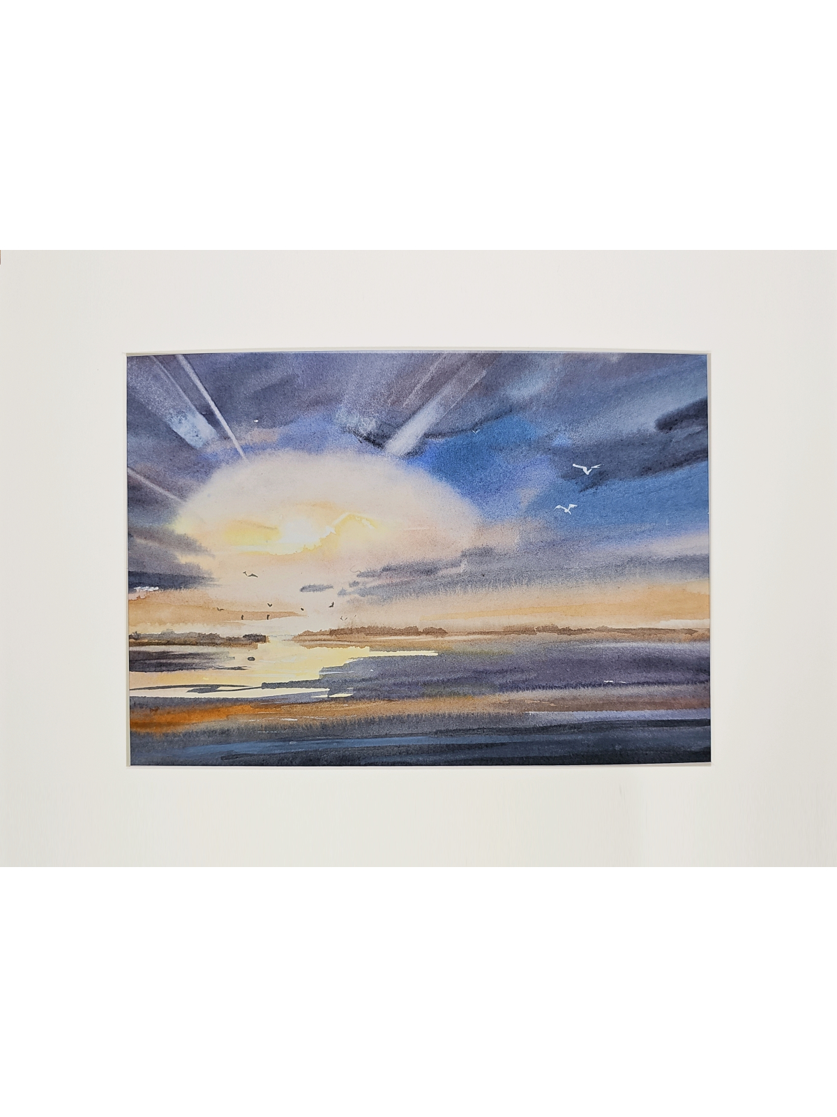 Перед нами акварельная картина, изображающая морской пейзаж во время заката. В центре композиции находится яркое солнце, частично скрытое облаками, из-за которых исходят световые лучи. Небо окрашено в оттенки синего и фиолетового, плавно переходящие в теплые оранжевые и желтые тона ближе к горизонту. На переднем плане видна водная гладь, отражающая цвета неба. В небе и над водой парят несколько птиц, добавляя динамику в спокойную атмосферу картины. Работа оформлена в светлое паспарту и подходит для стандартной рамы 21*30 см.