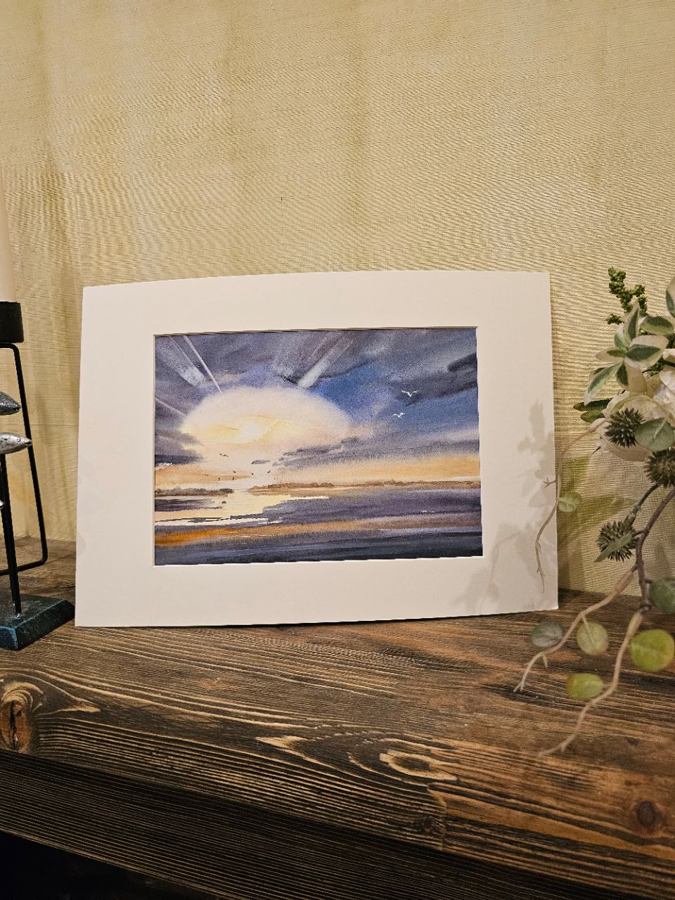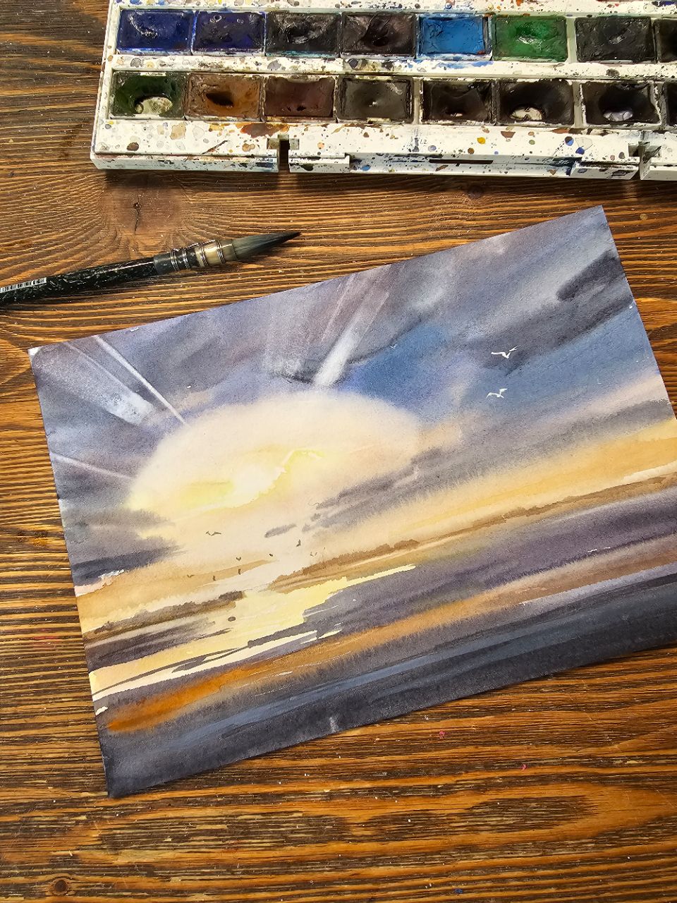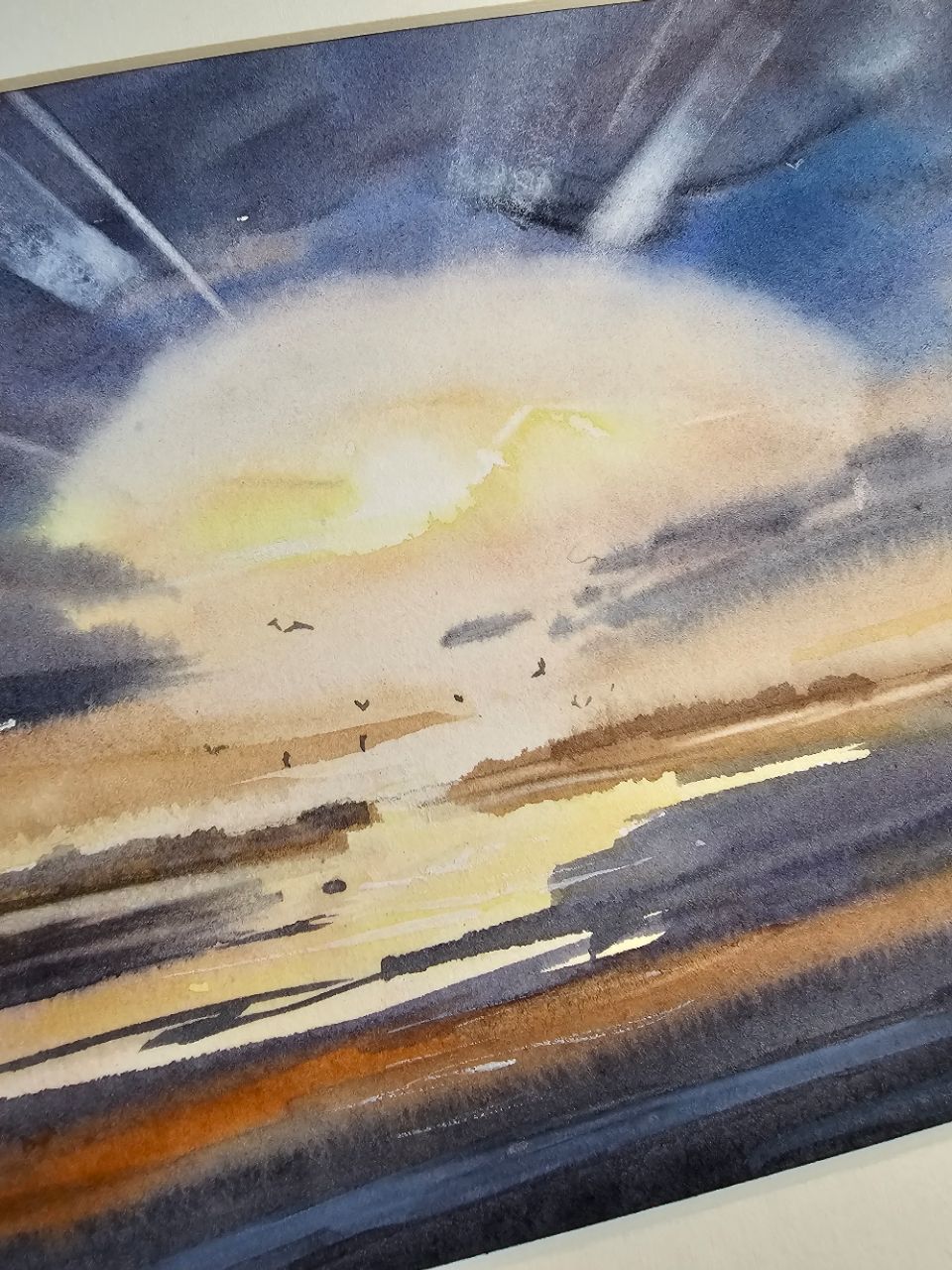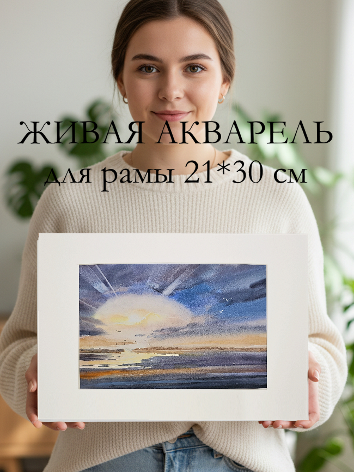 Перед нами акварельная картина, изображающая морской пейзаж во время заката. В центре композиции находится яркое солнце, частично скрытое облаками, из-за которых исходят световые лучи. Небо окрашено в оттенки синего и фиолетового, плавно переходящие в теплые оранжевые и желтые тона ближе к горизонту. На переднем плане видна водная гладь, отражающая цвета неба. В небе и над водой парят несколько птиц, добавляя динамику в спокойную атмосферу картины. Работа оформлена в светлое паспарту и подходит для стандартной рамы 21*30 см.