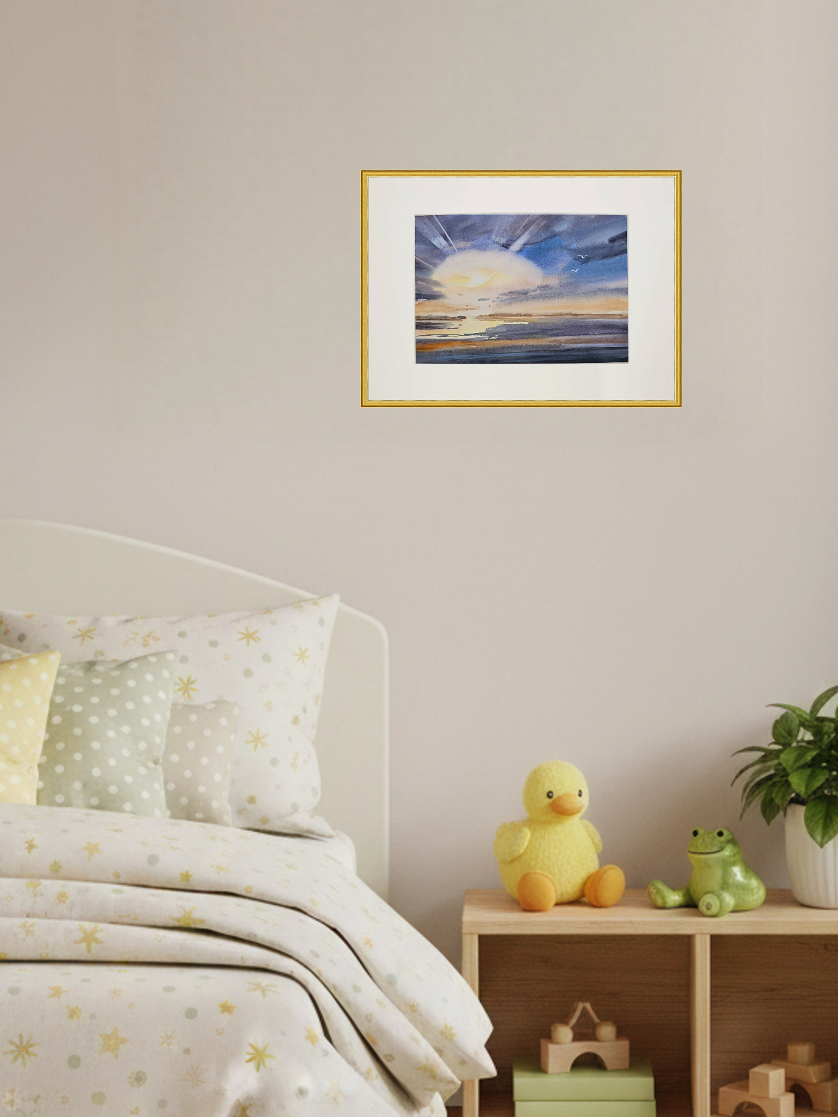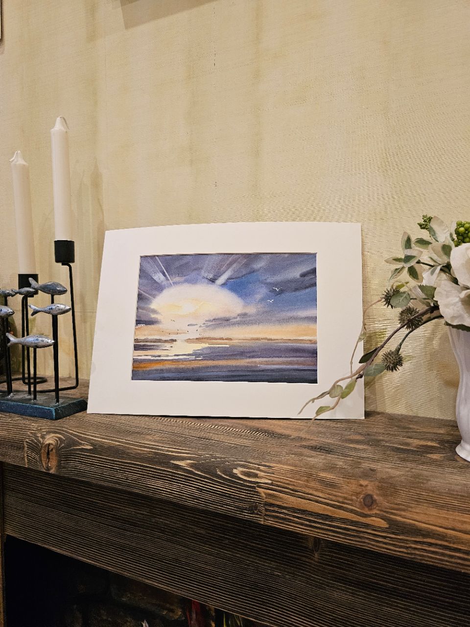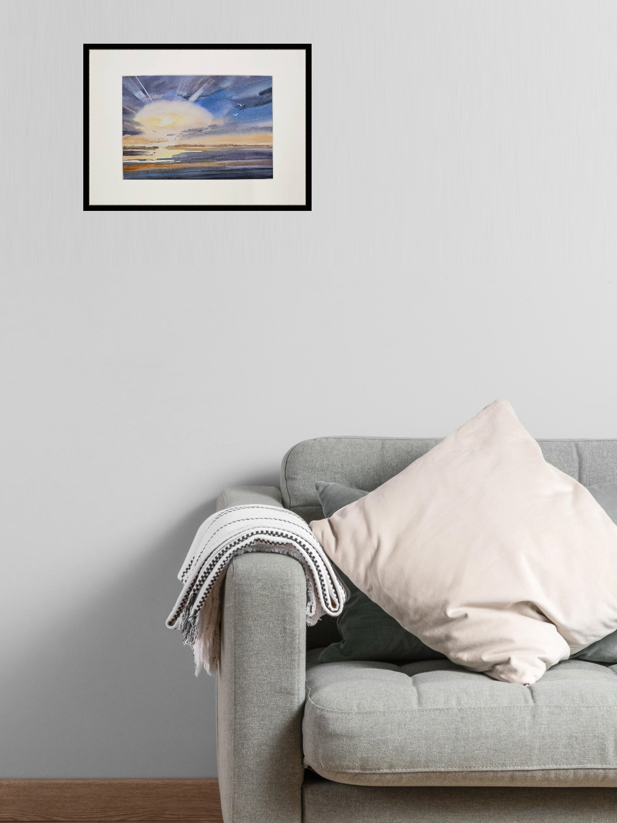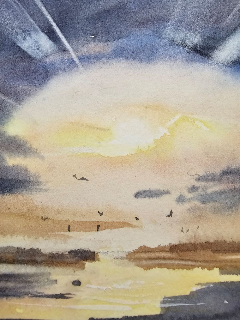 Перед нами акварельная картина, изображающая морской пейзаж во время заката. В центре композиции находится яркое солнце, частично скрытое облаками, из-за которых исходят световые лучи. Небо окрашено в оттенки синего и фиолетового, плавно переходящие в теплые оранжевые и желтые тона ближе к горизонту. На переднем плане видна водная гладь, отражающая цвета неба. В небе и над водой парят несколько птиц, добавляя динамику в спокойную атмосферу картины. Работа оформлена в светлое паспарту и подходит для стандартной рамы 21*30 см.