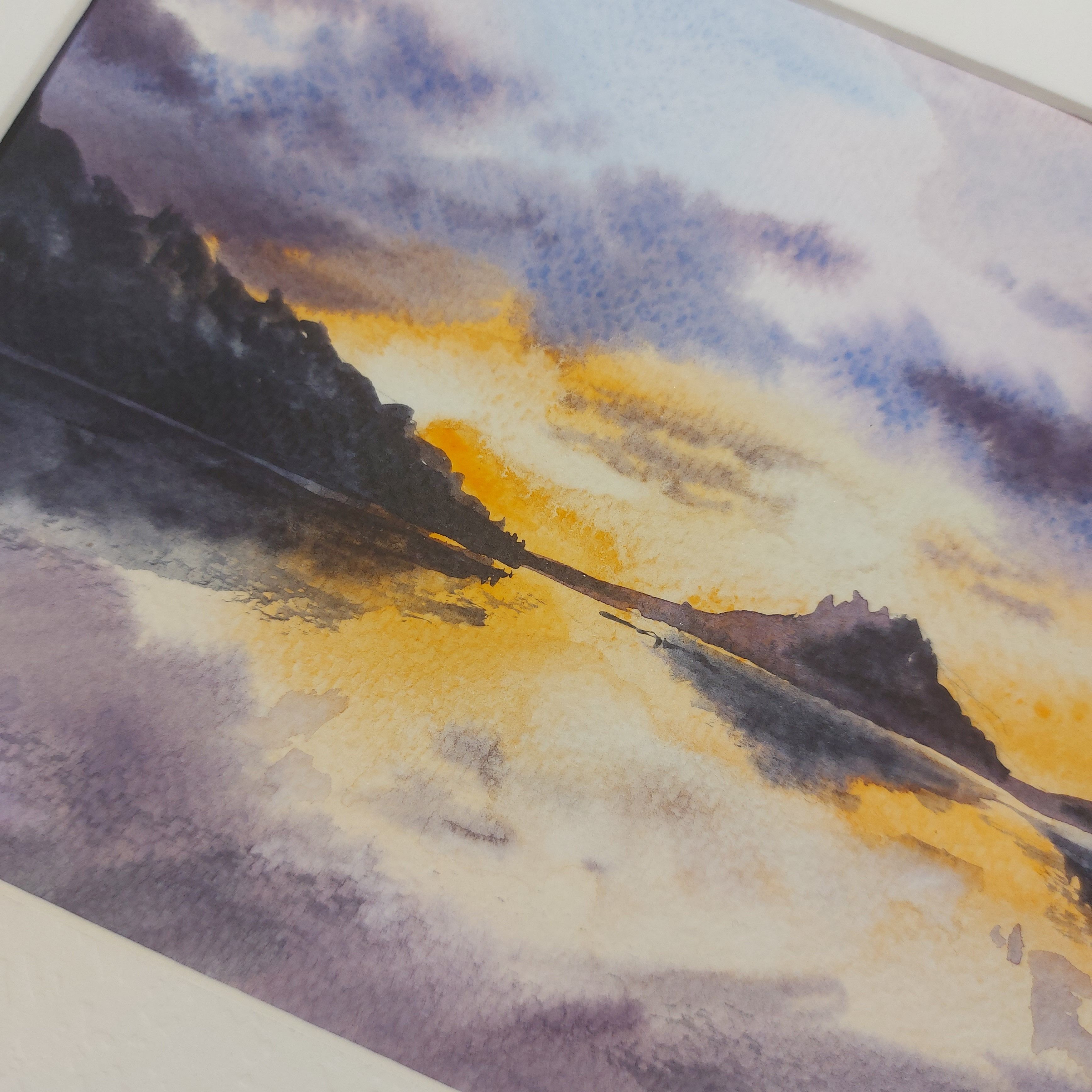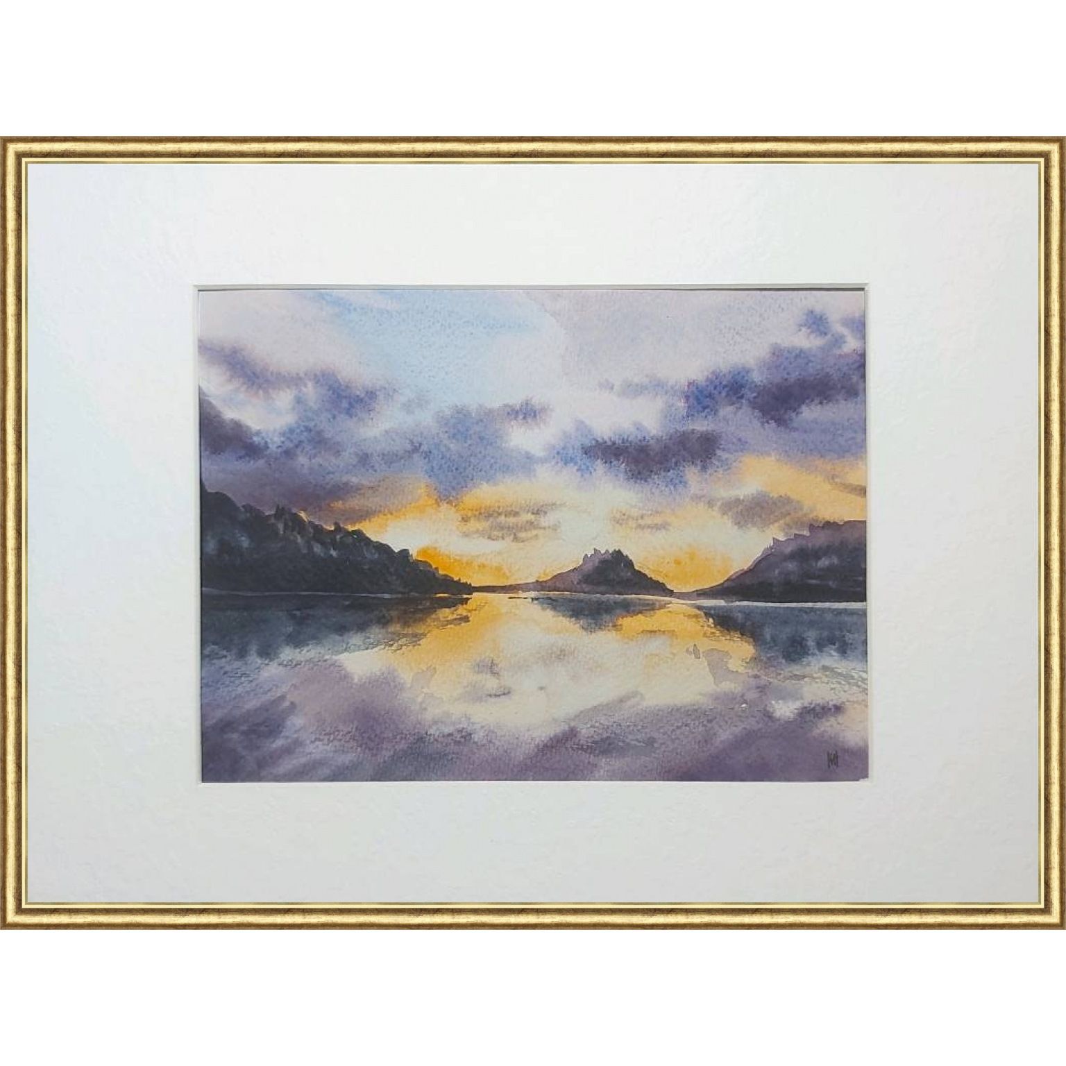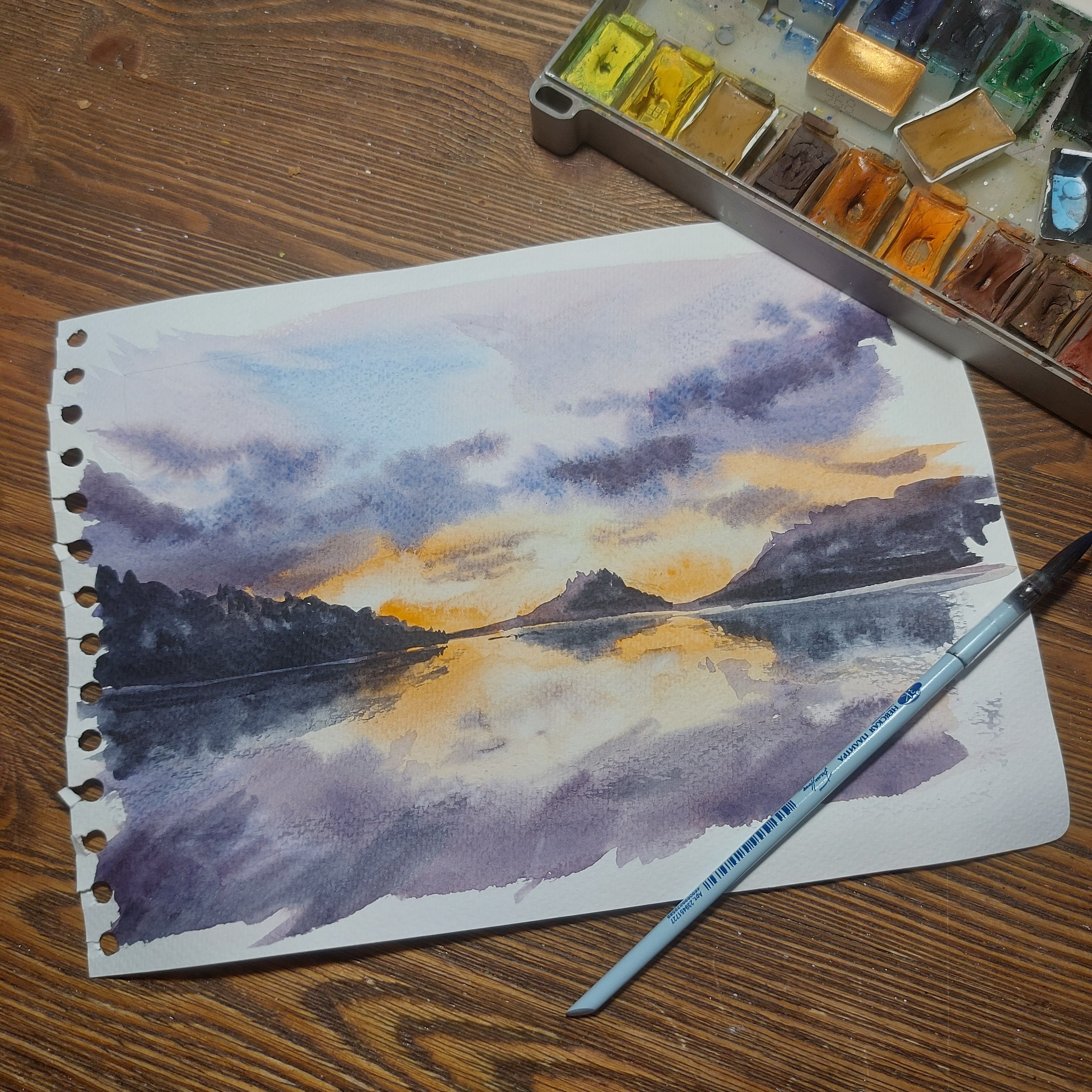 Отражение солнца на воде создает длинный светящийся путь от горизонта к переднему плану картины. Силуэты гор размещаются слева и справа от центра изображения, подчеркивая симметричность и глубину сцены. Цвета переходят друг в друга со множеством тонких оттенков и полутонов, демонстрируя технику работы с акварелью, где вода создает мягкие градиенты.