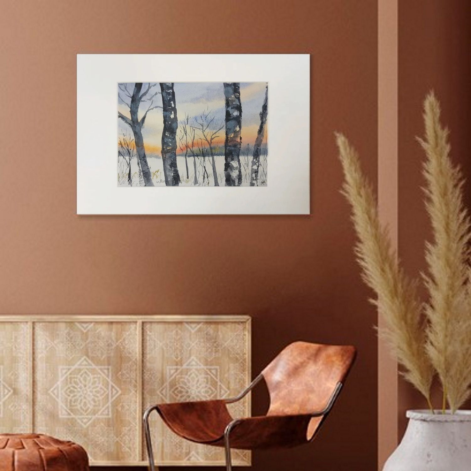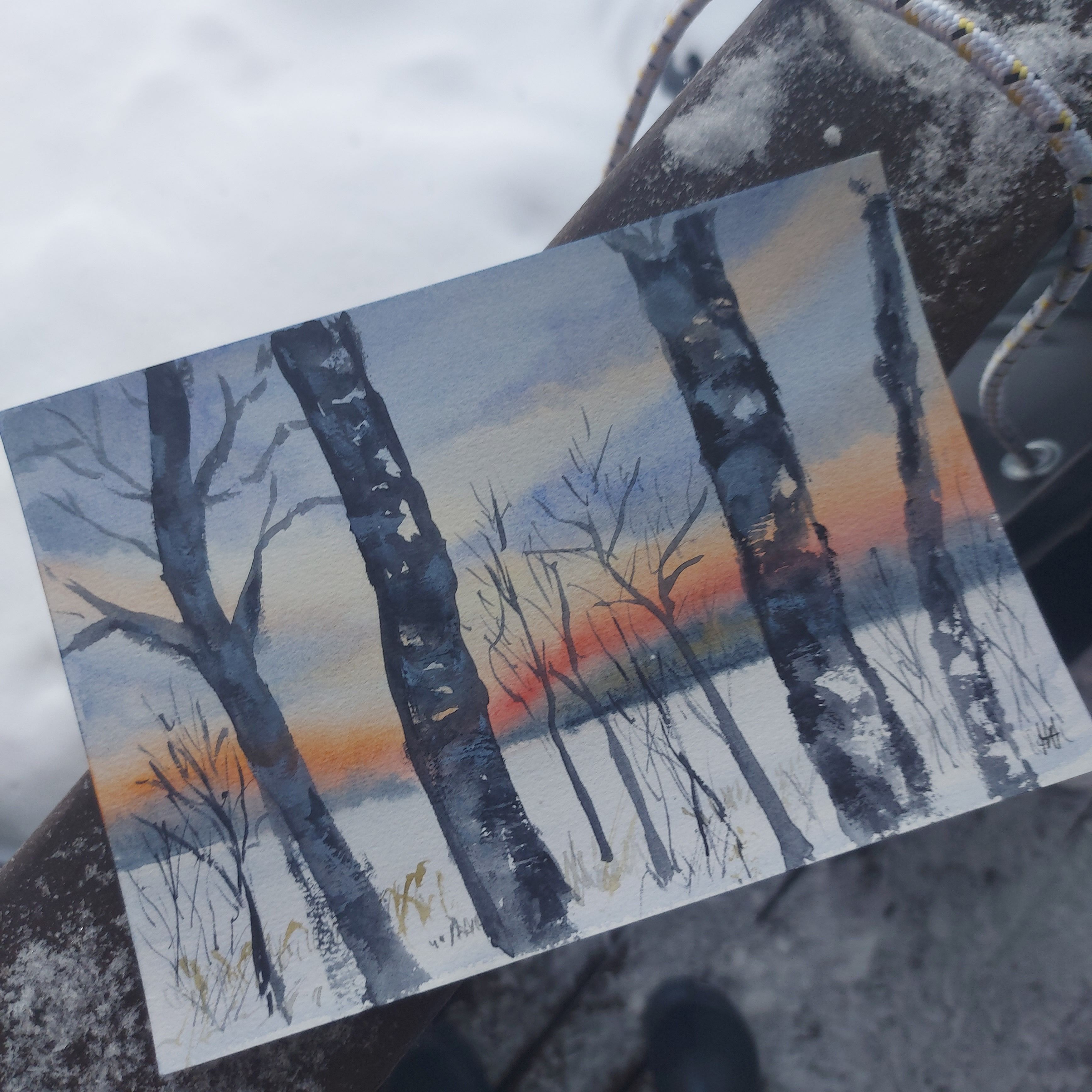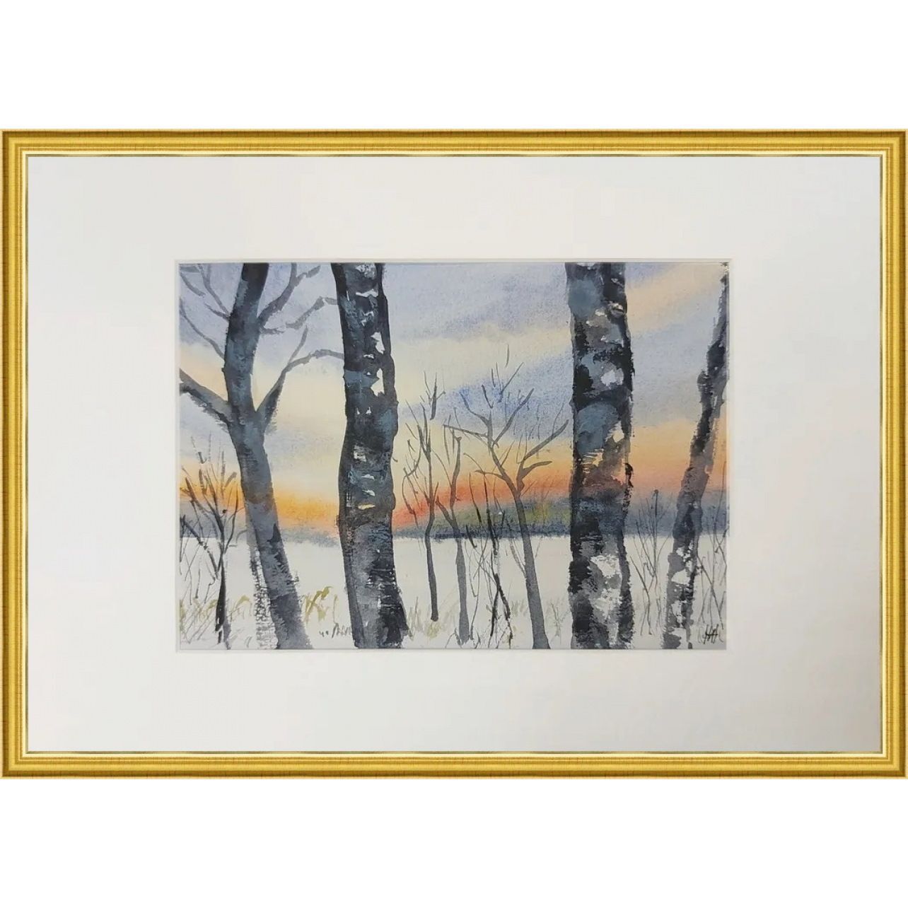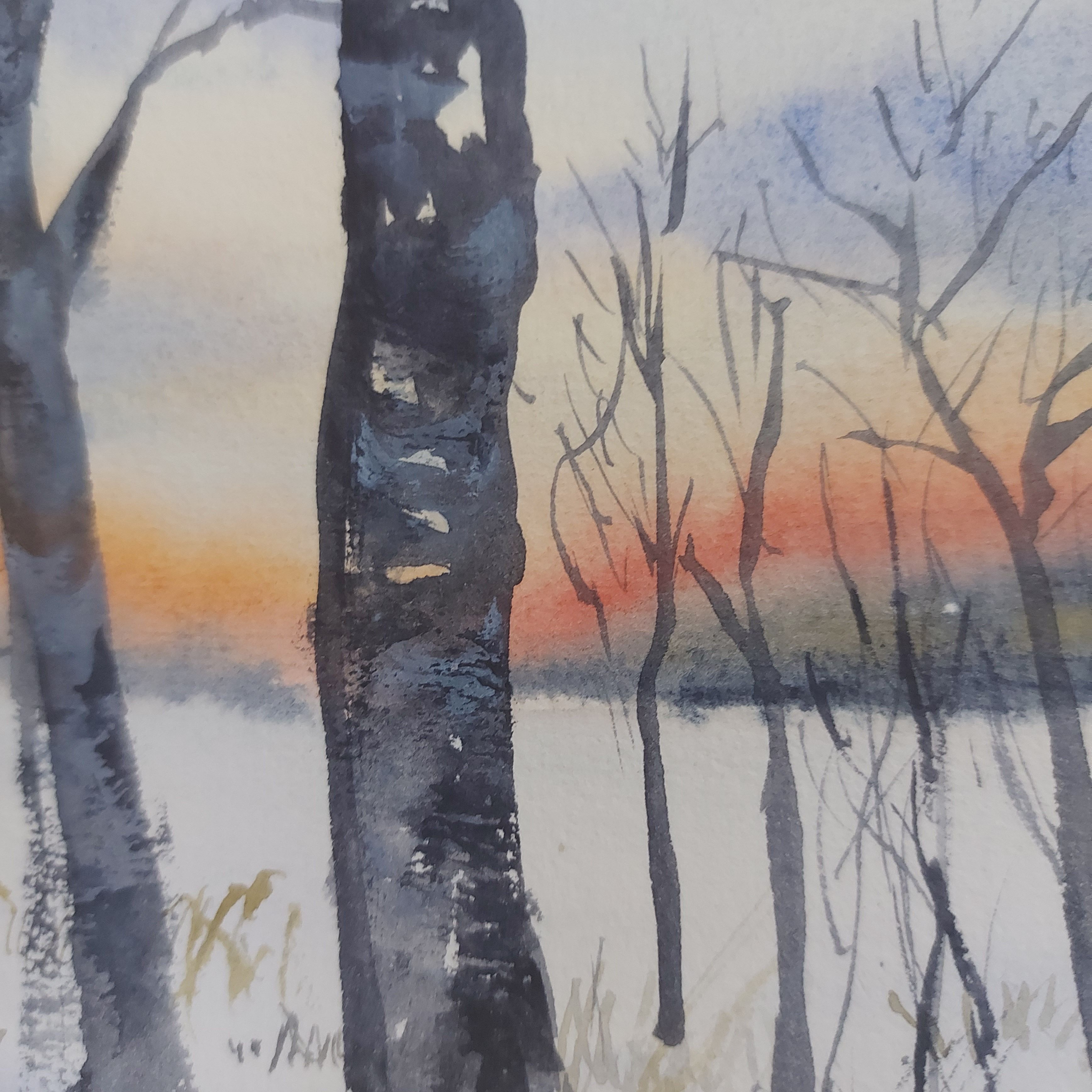 На картине мы видим акварельные рисунок, представляющий собой живописную природную сцену. На переднем плане заметны контрастные силуэты берёз с их характерной белой корой и черными полосами и пятнами Между и за деревьями виднеются голые ветви кустарников и молодых деревьев. На фоне изображен зимний рассвет, небо окрашено в теплые оттенки оранжевого, которые плавно переходят в бледно-голубые и серые тона, создавая ощущение прохлады. Серовато-коричневатая линия леса на горизонте отделяет небо от замерзшей водной глади озера.