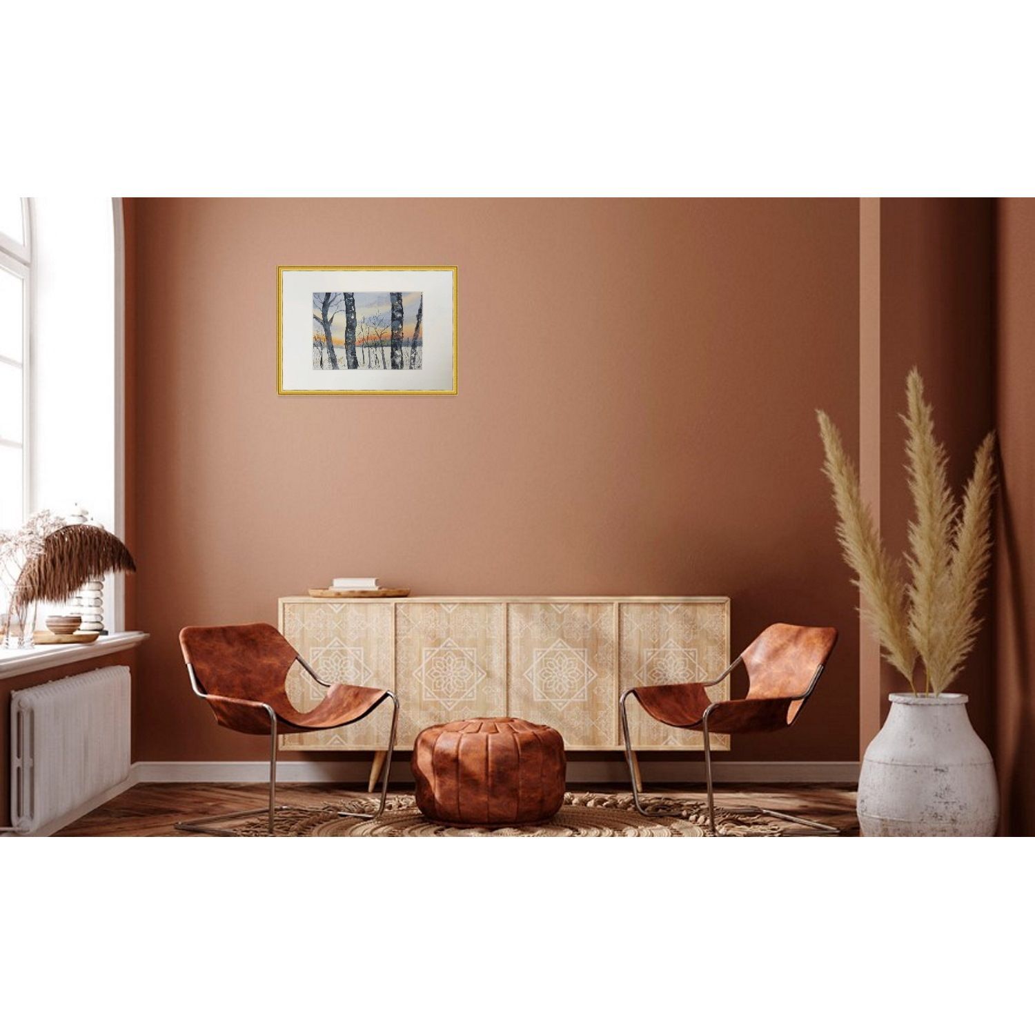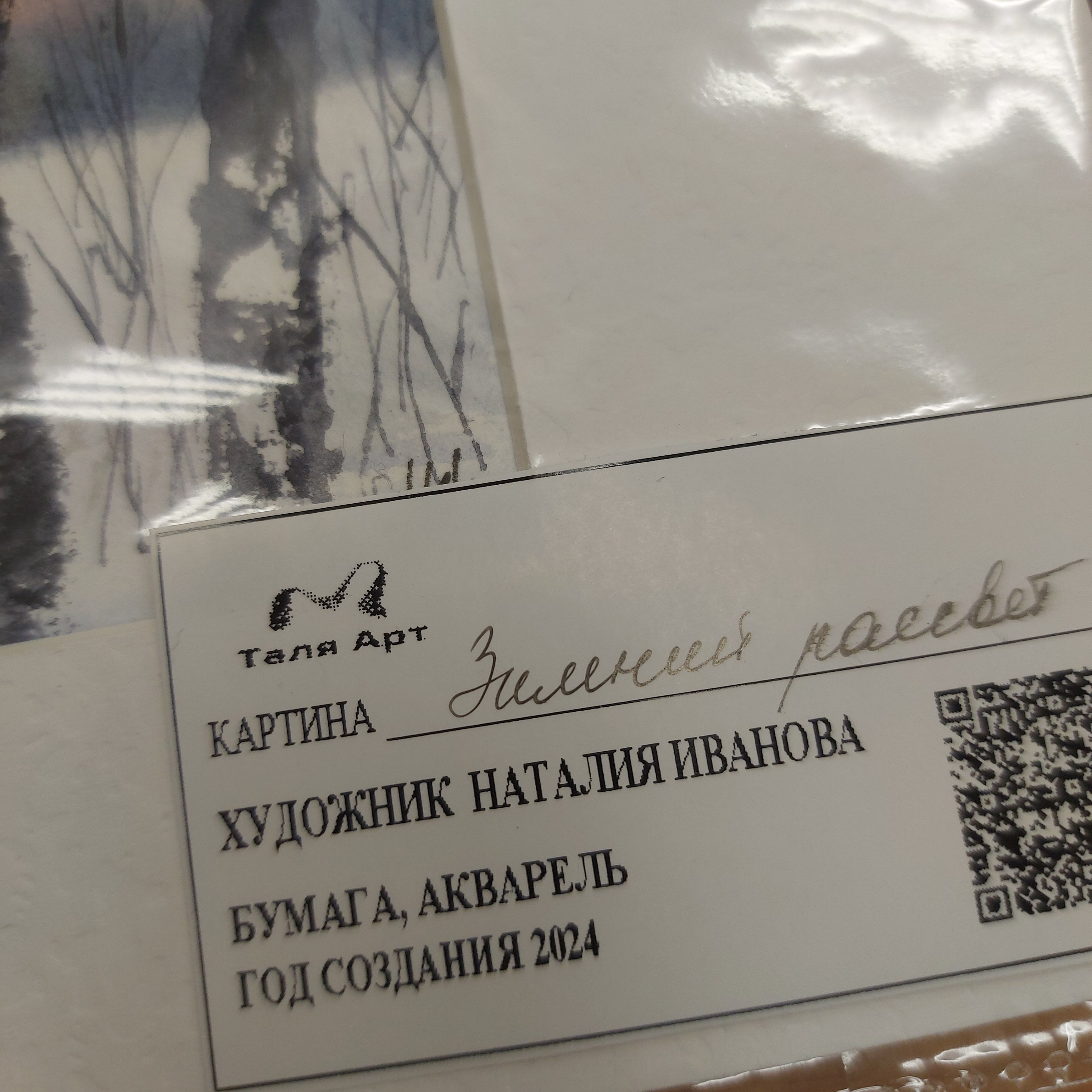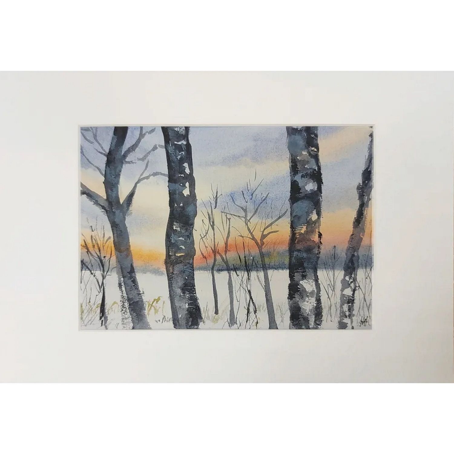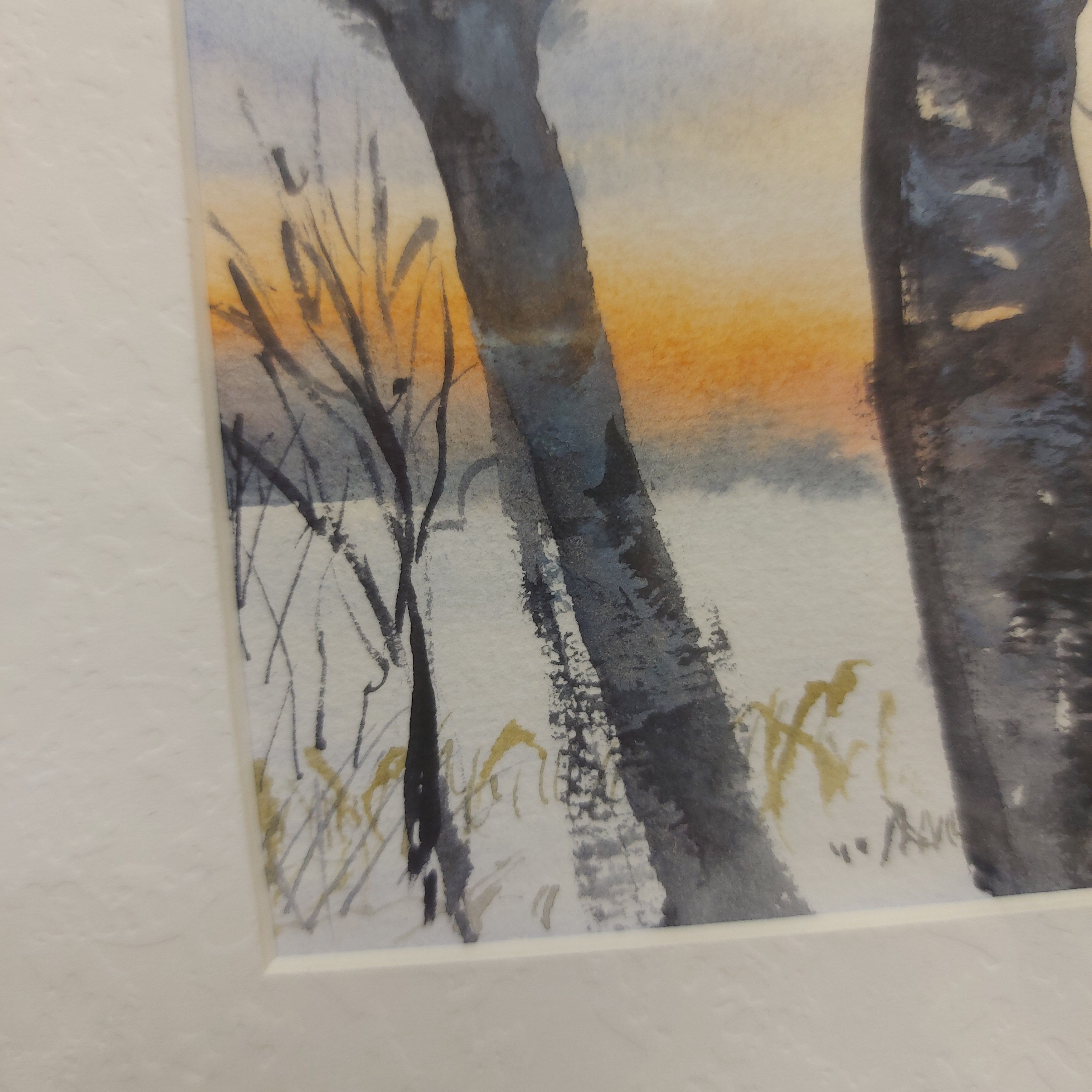 На картине мы видим акварельные рисунок, представляющий собой живописную природную сцену. На переднем плане заметны контрастные силуэты берёз с их характерной белой корой и черными полосами и пятнами Между и за деревьями виднеются голые ветви кустарников и молодых деревьев. На фоне изображен зимний рассвет, небо окрашено в теплые оттенки оранжевого, которые плавно переходят в бледно-голубые и серые тона, создавая ощущение прохлады. Серовато-коричневатая линия леса на горизонте отделяет небо от замерзшей водной глади озера.