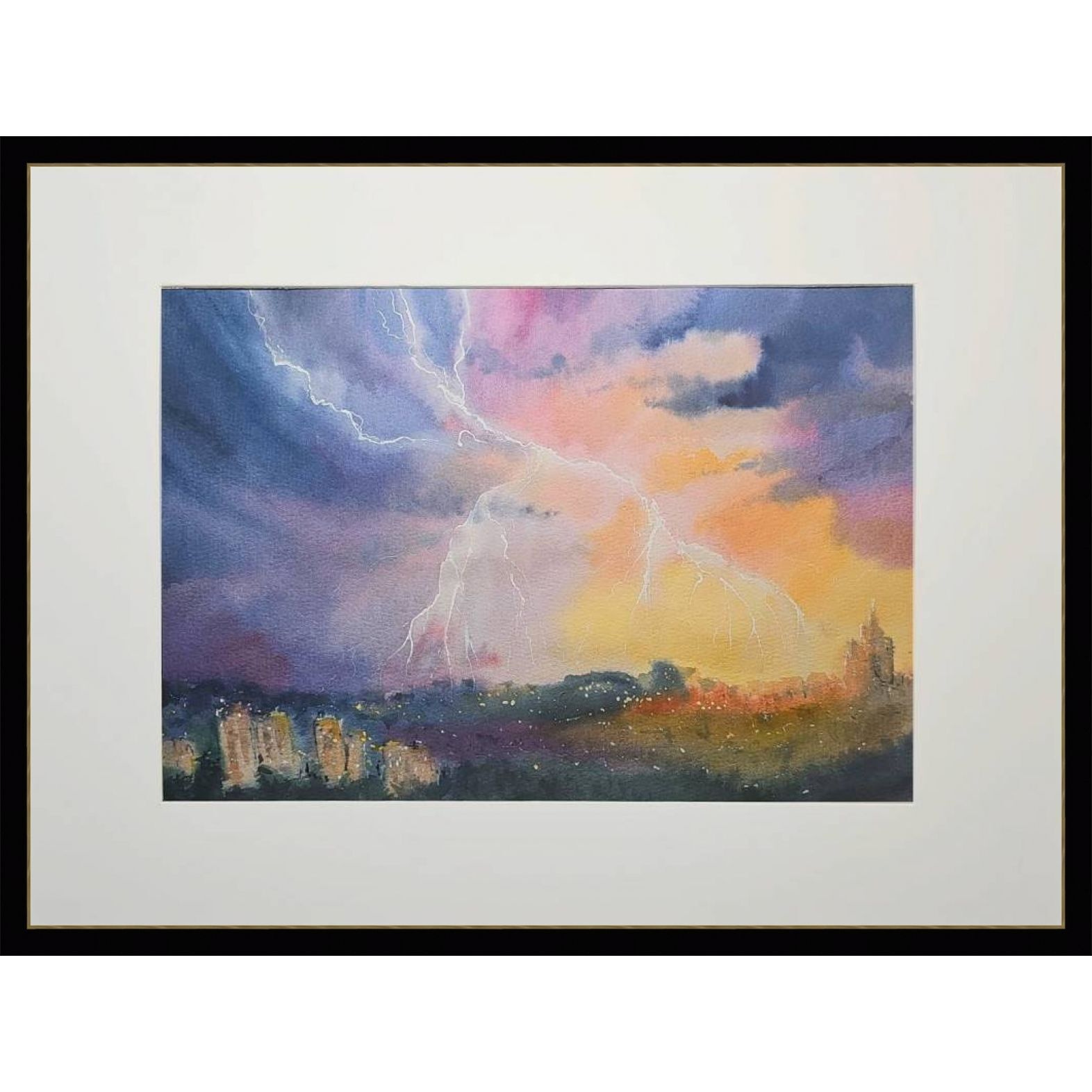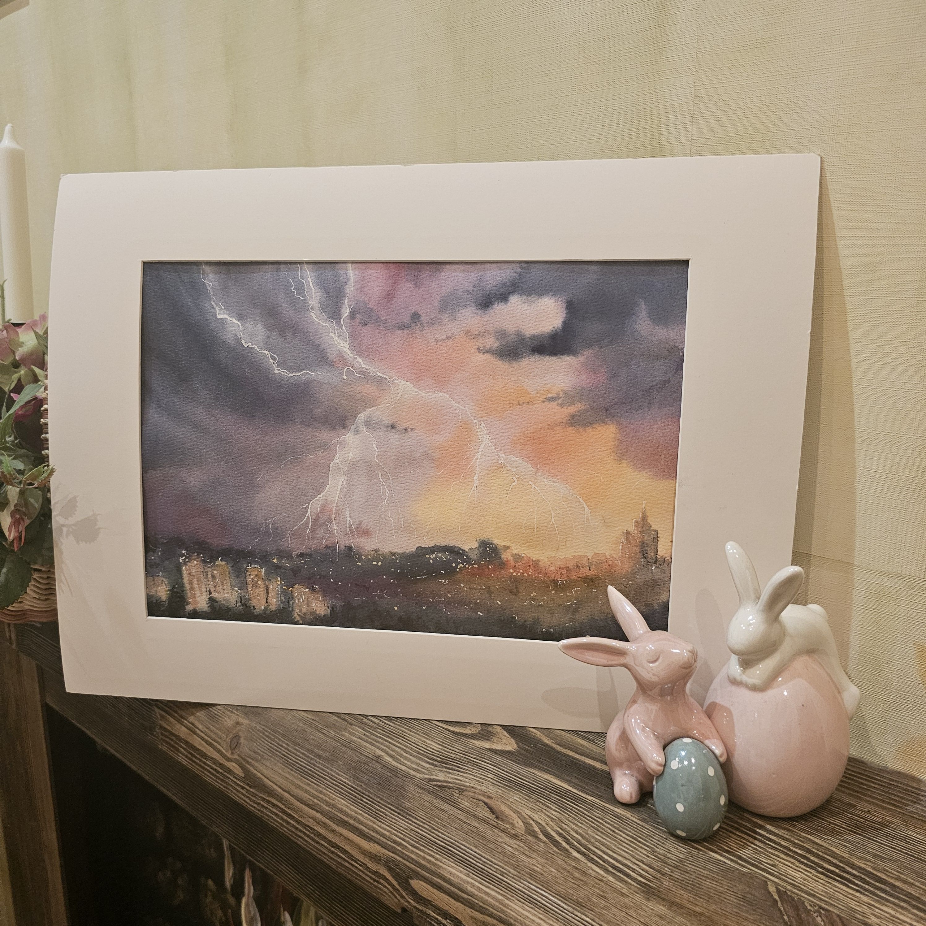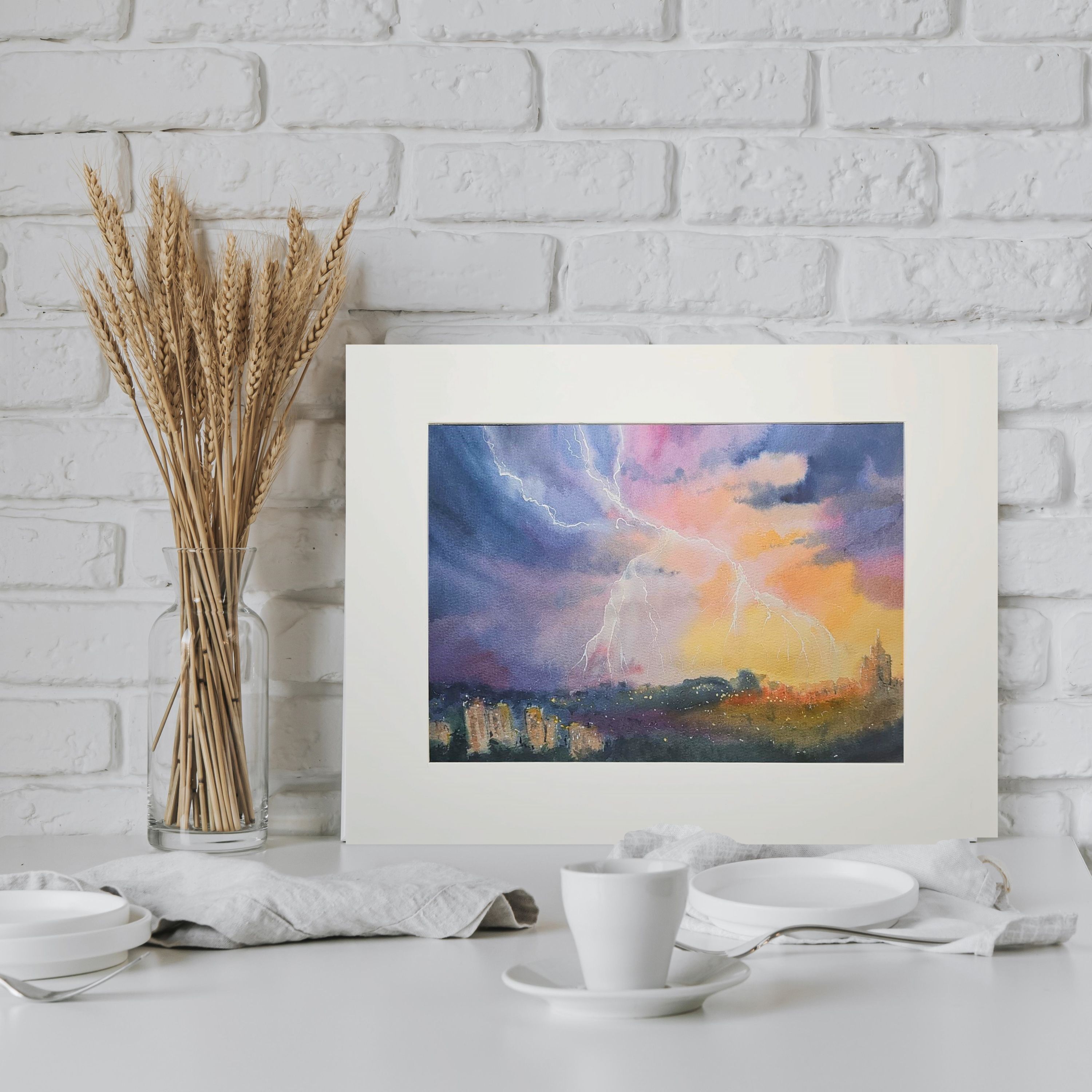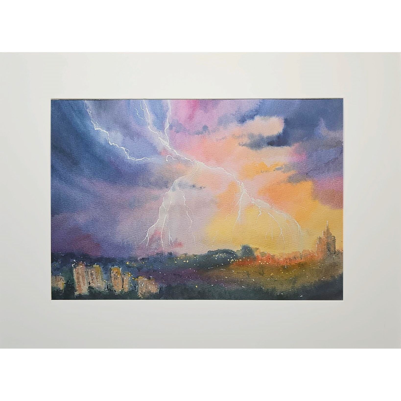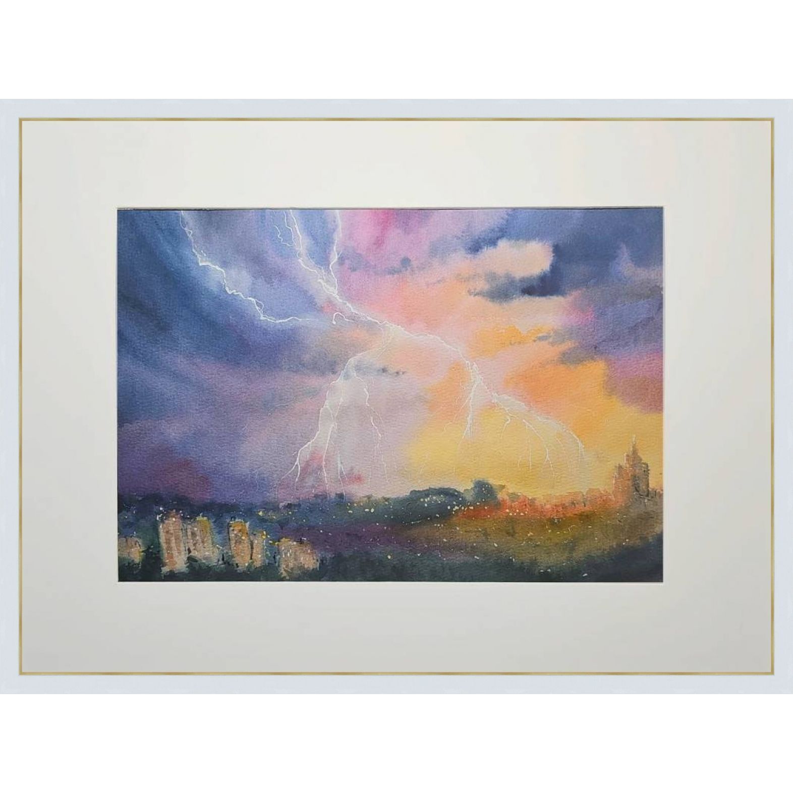 Нам представлена акварельная картина, где главное действие происходит в ночном грозовом небе на Москвой. Небо, освещенное вспышкой молнии раскрасилось от насыщенно-синего до нежно-розового и оранжевого цветов. На переднем плане виден силуэт города, освещённый сполохами молнии, что добавляет драматичности и контраста. Рисунок заключён в светлое паспарту и готов к размещению в раме.