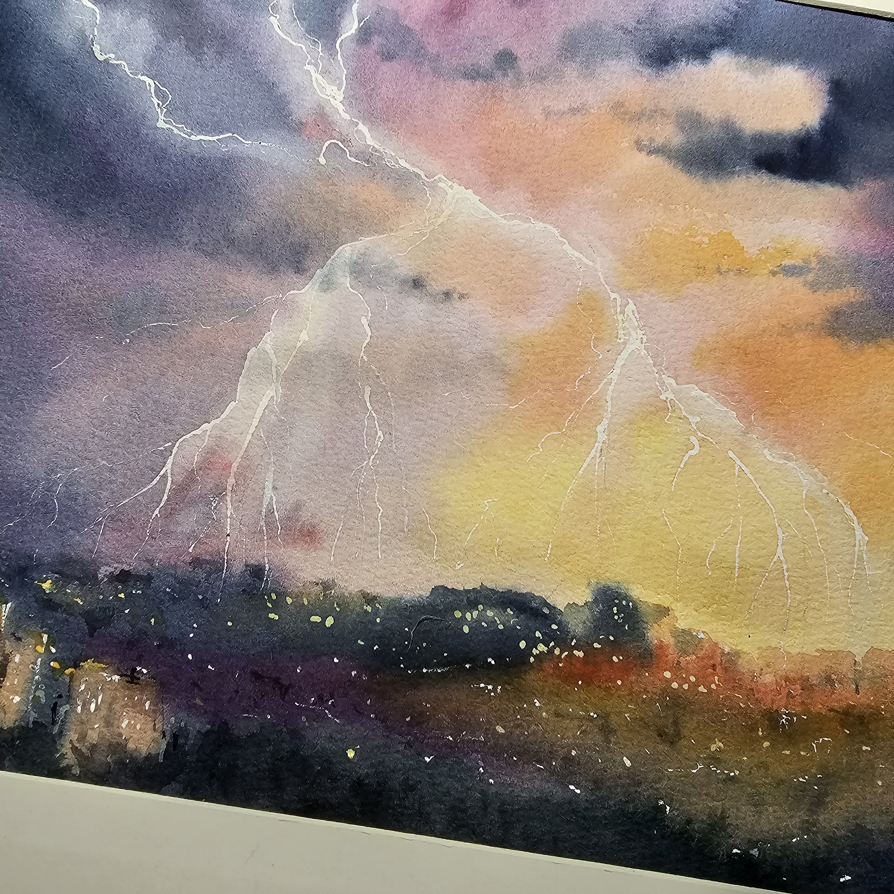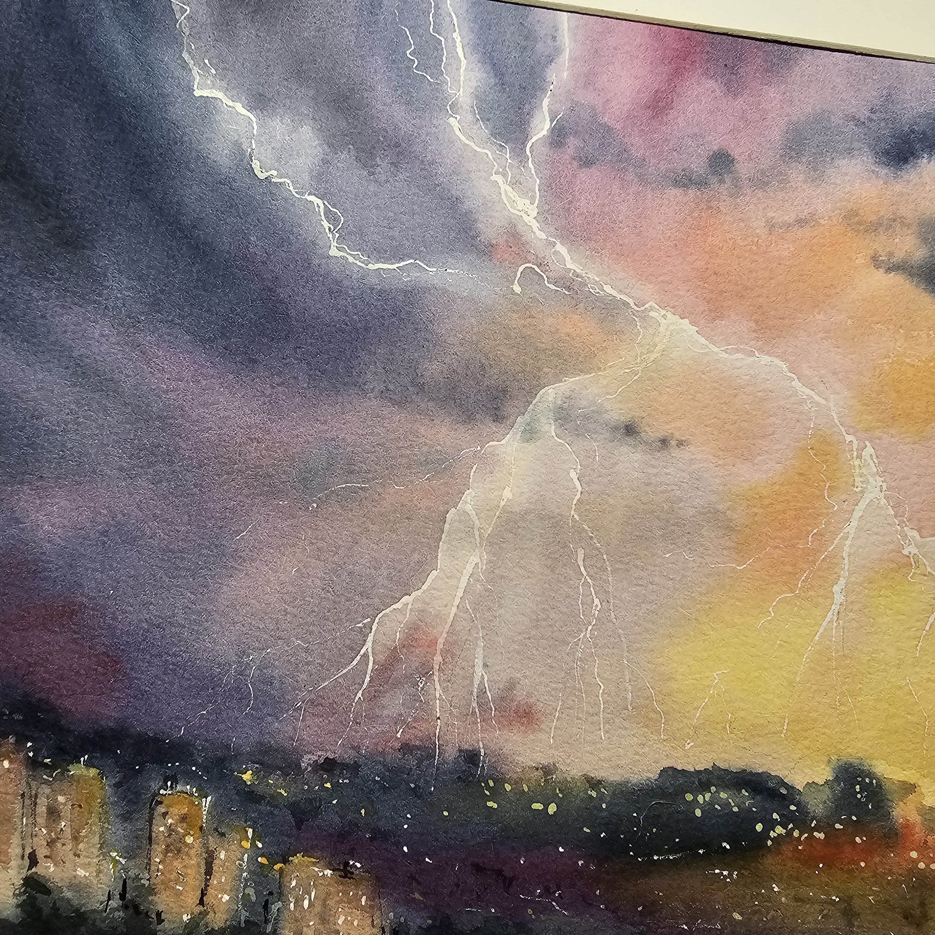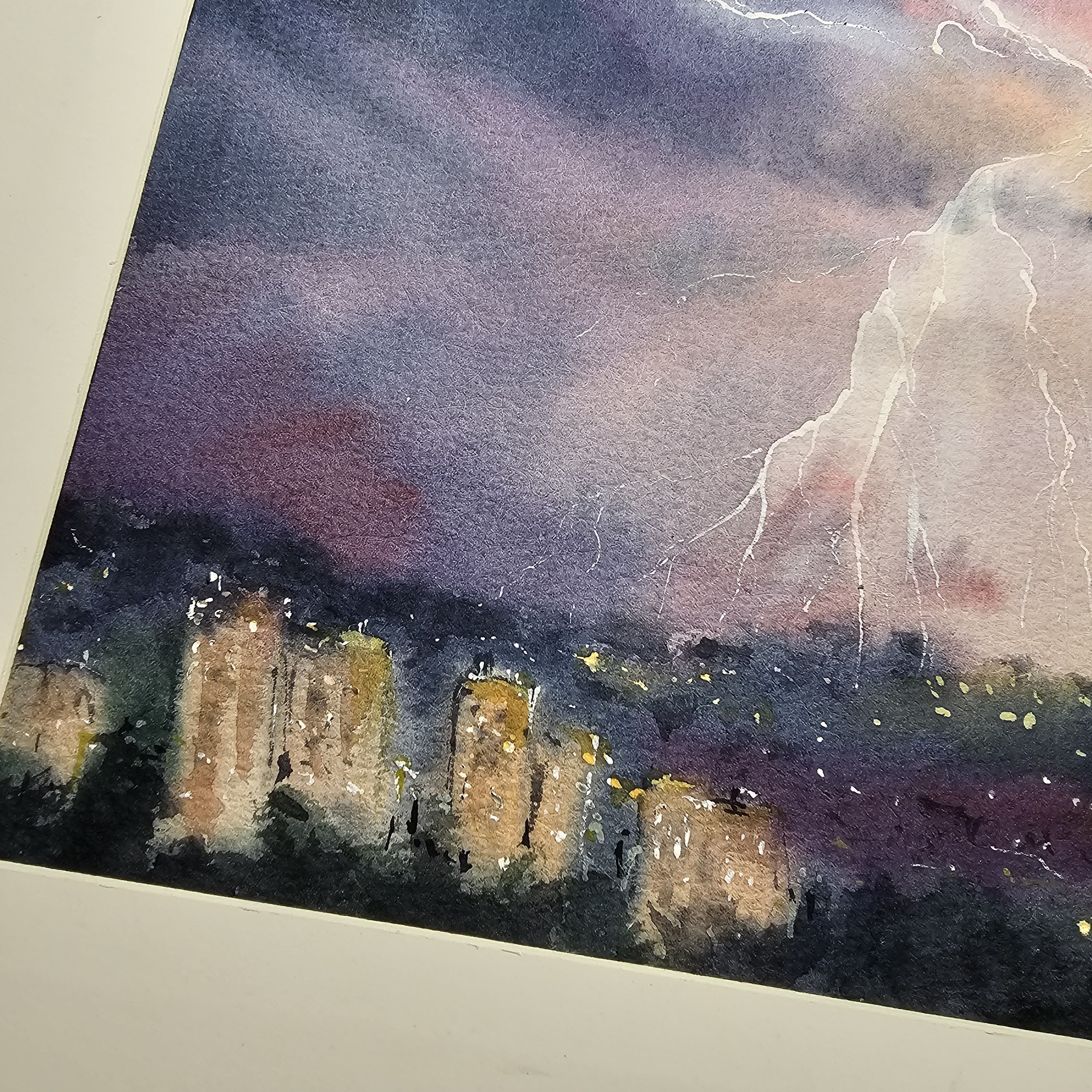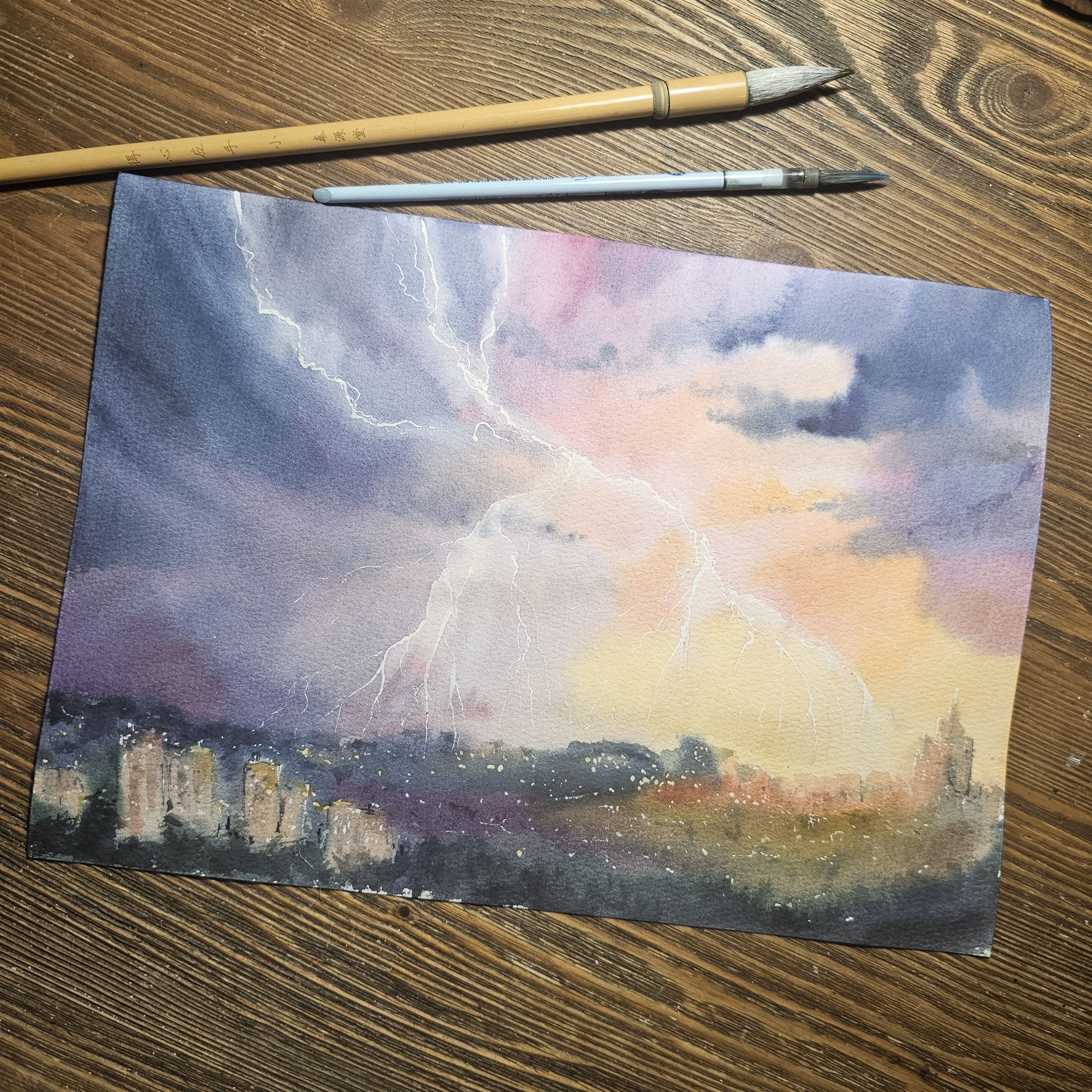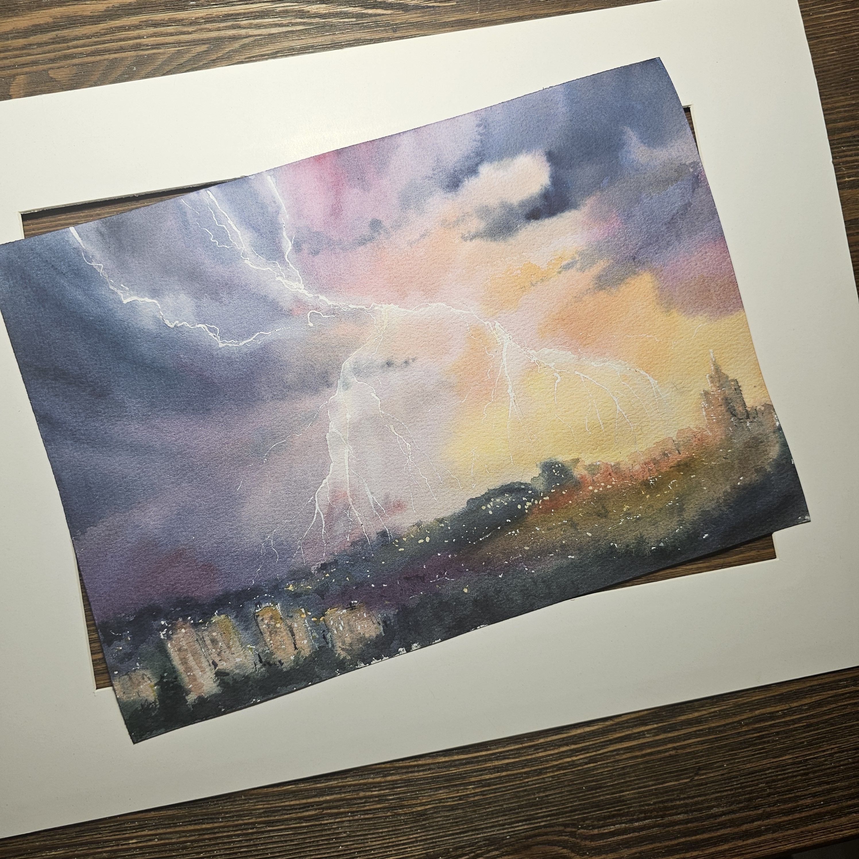 Нам представлена акварельная картина, где главное действие происходит в ночном грозовом небе на Москвой. Небо, освещенное вспышкой молнии раскрасилось от насыщенно-синего до нежно-розового и оранжевого цветов. На переднем плане виден силуэт города, освещённый сполохами молнии, что добавляет драматичности и контраста. Рисунок заключён в светлое паспарту и готов к размещению в раме.