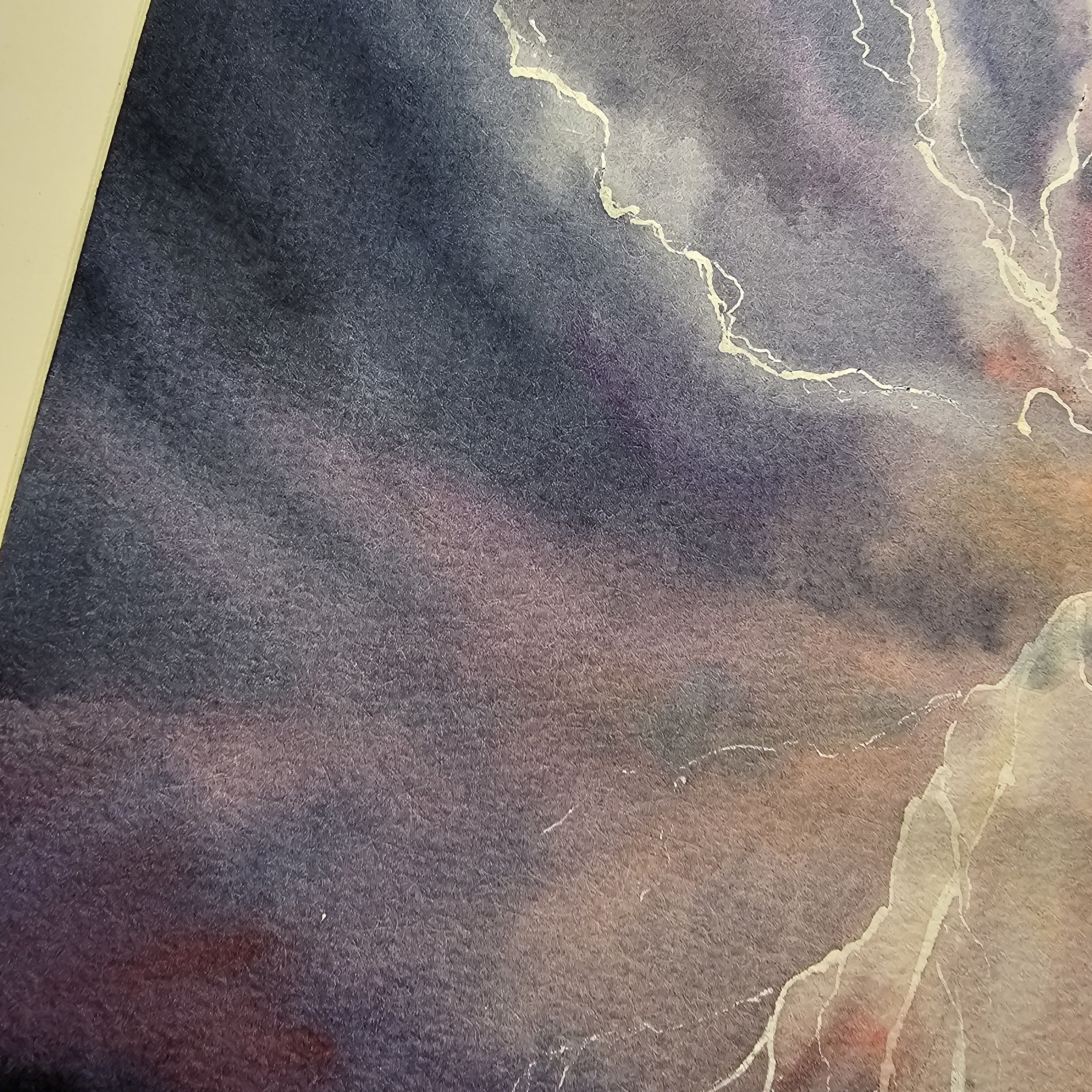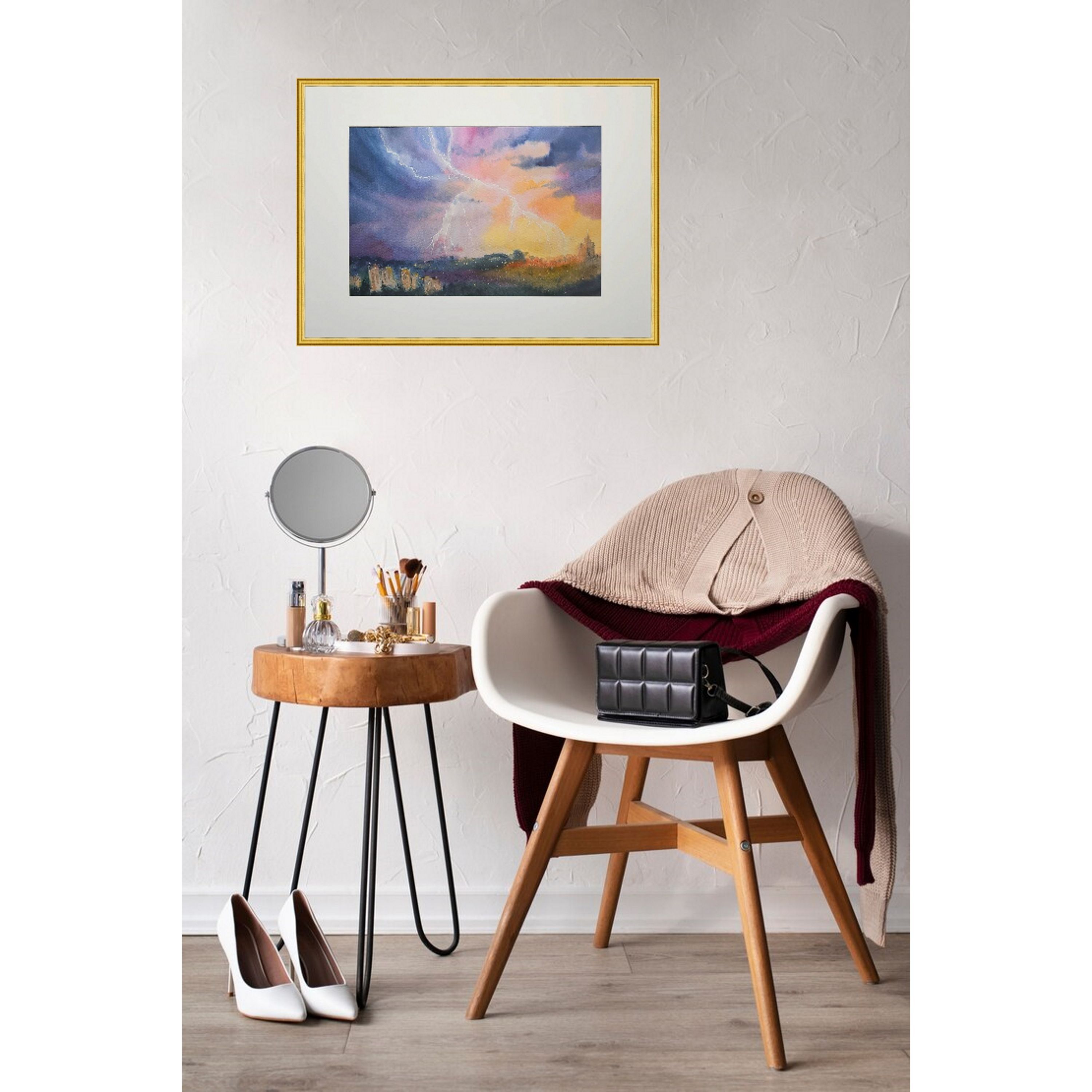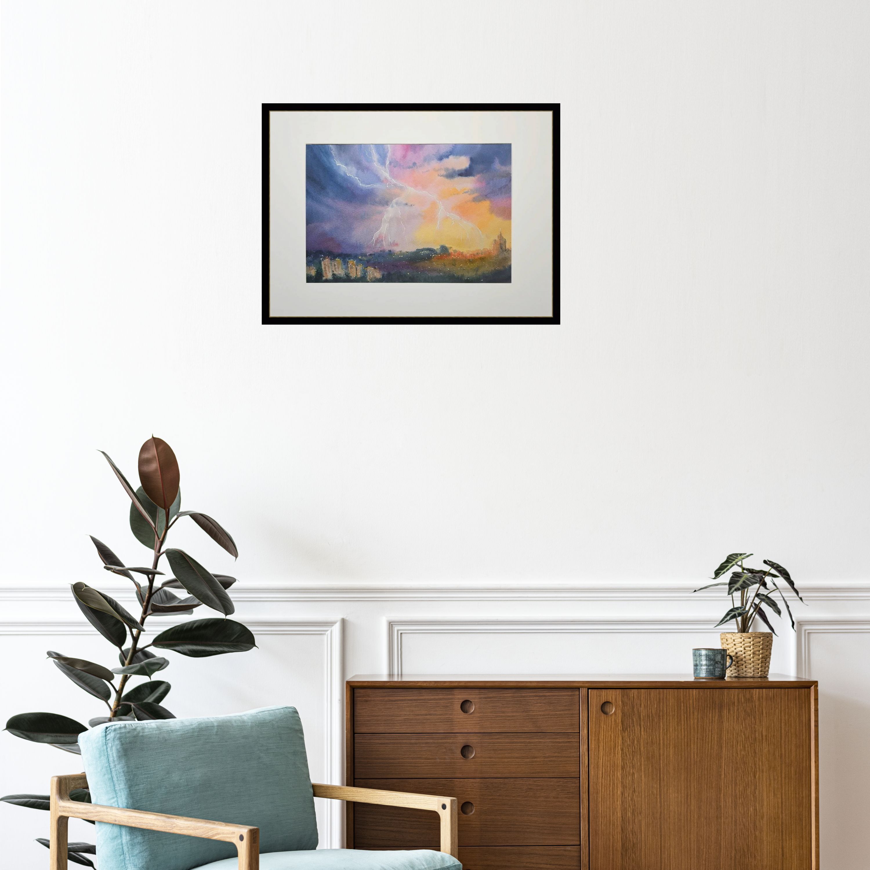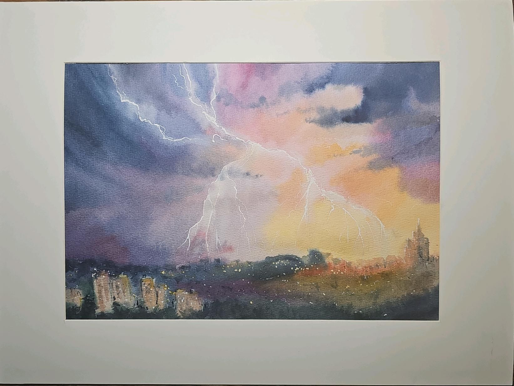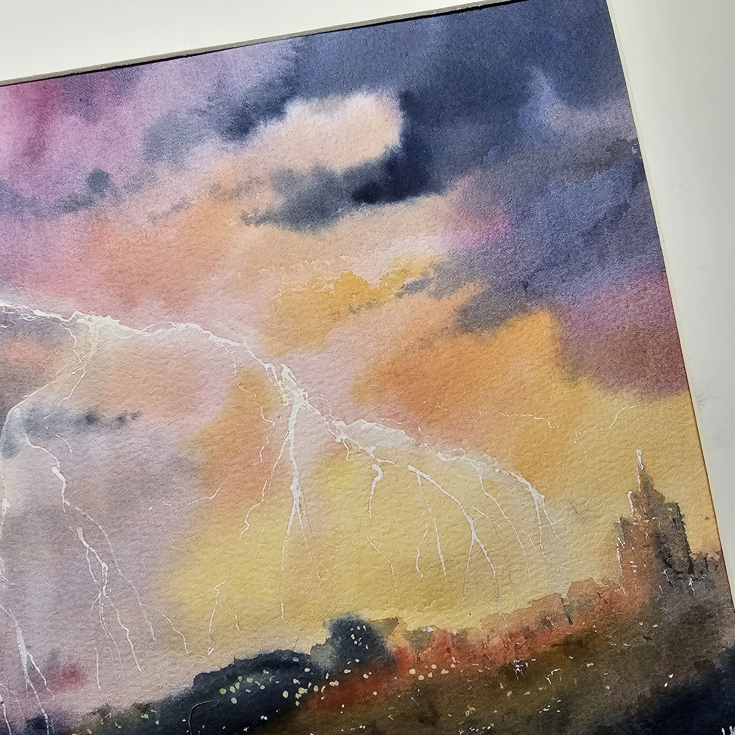 Нам представлена акварельная картина, где главное действие происходит в ночном грозовом небе на Москвой. Небо, освещенное вспышкой молнии раскрасилось от насыщенно-синего до нежно-розового и оранжевого цветов. На переднем плане виден силуэт города, освещённый сполохами молнии, что добавляет драматичности и контраста. Рисунок заключён в светлое паспарту и готов к размещению в раме.
