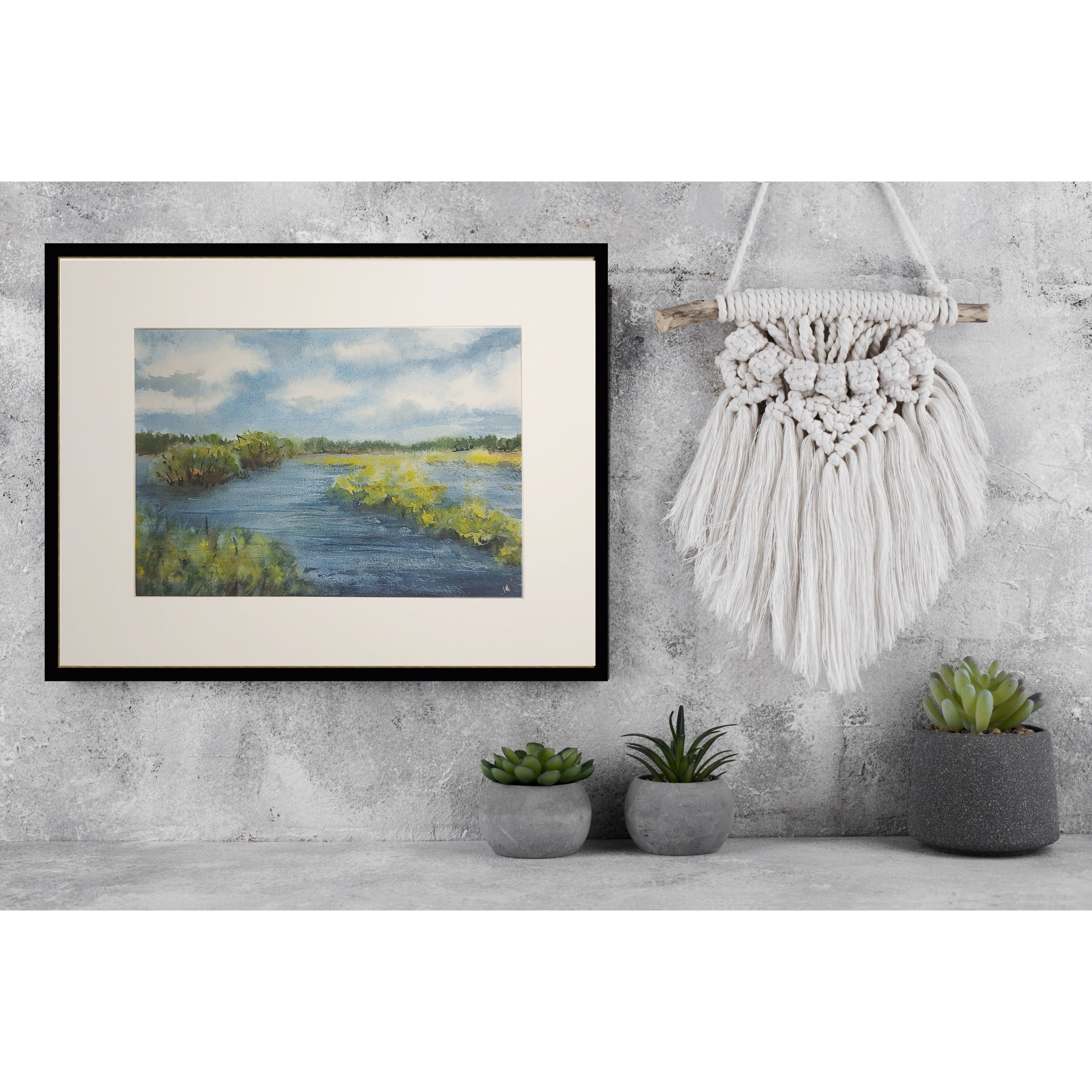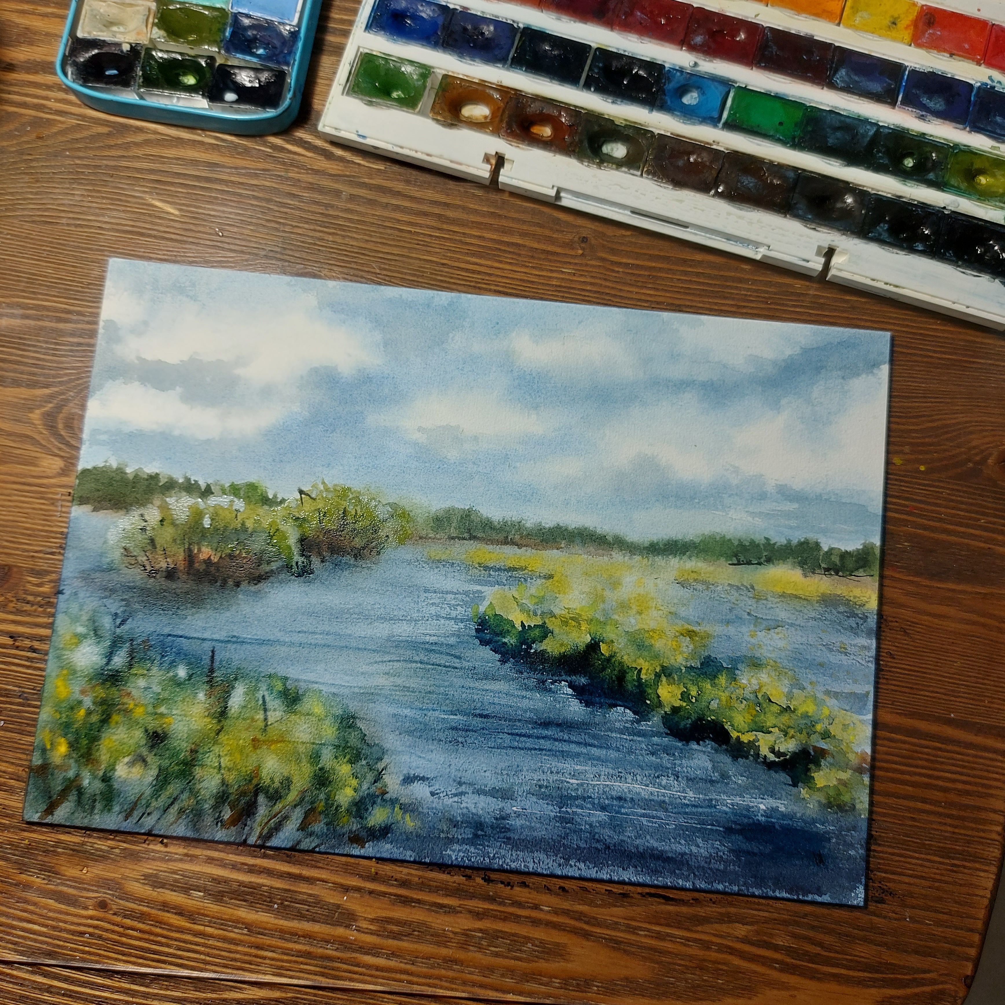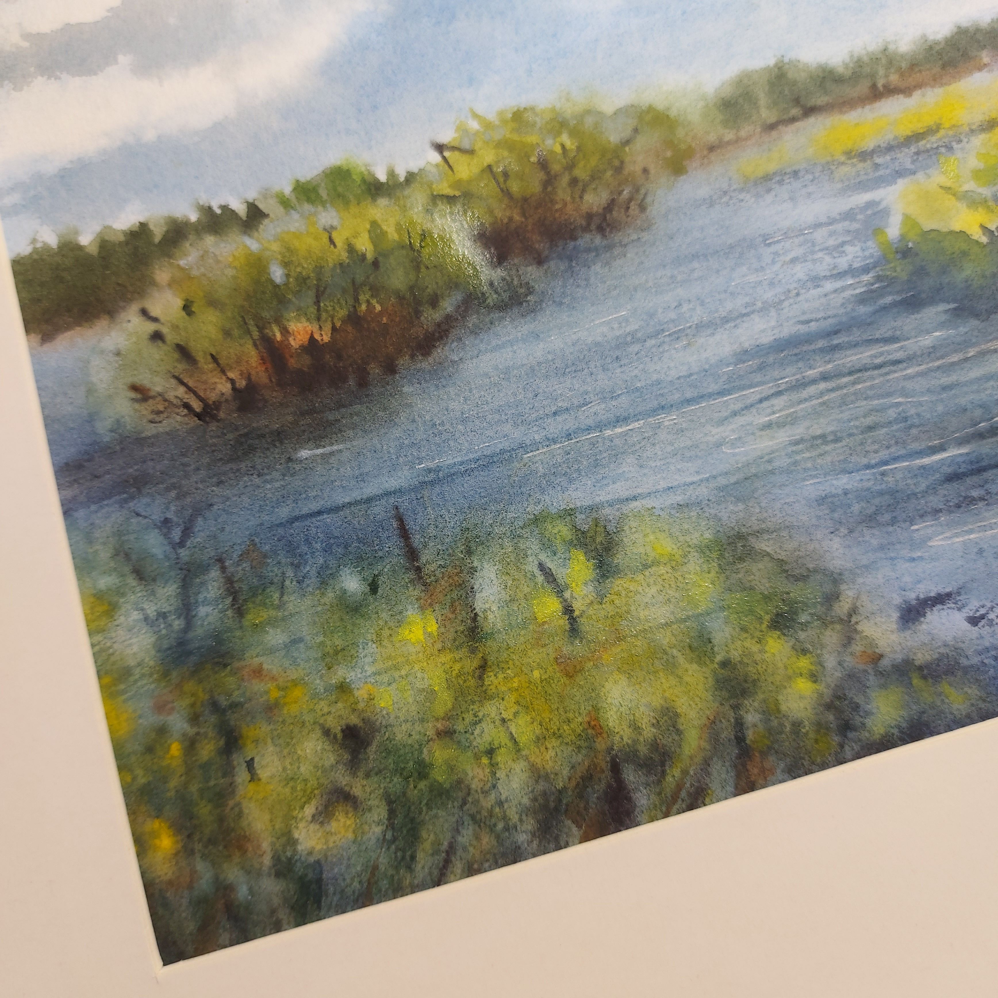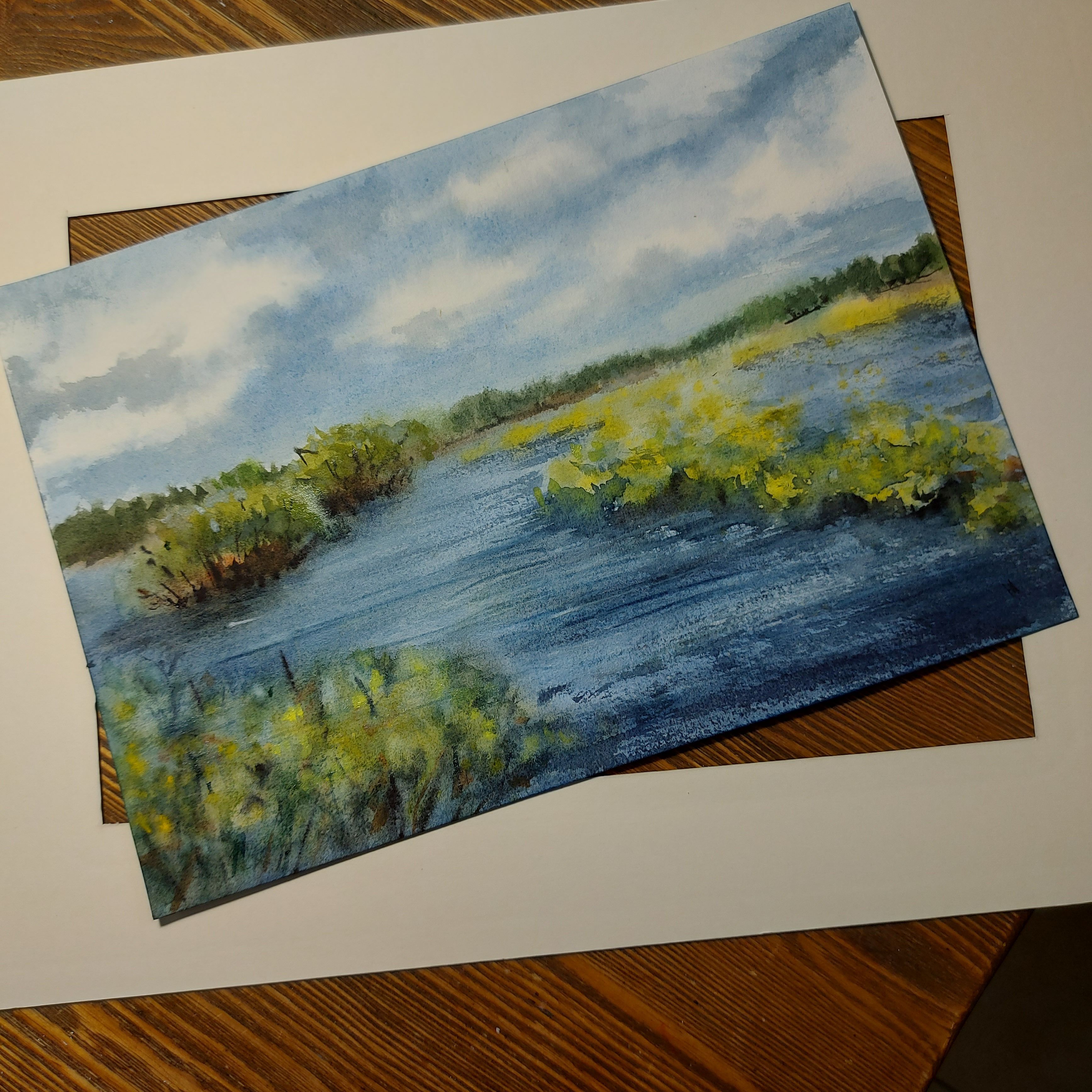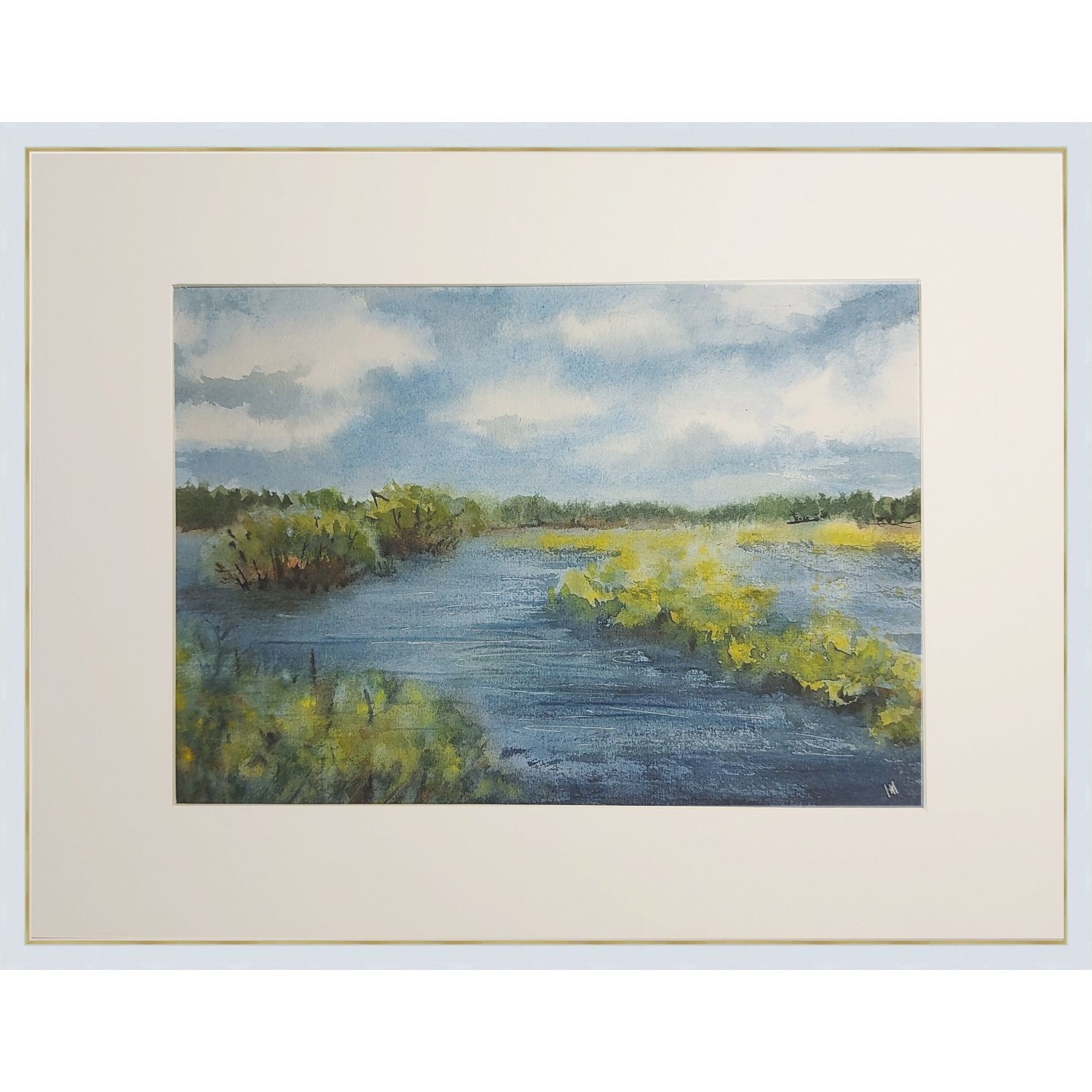 Нам представлен акварельный пейзаж. В центре изображена водная гладь, окруженная зелеными кустарниками и травами. Вдалеке виднеется лесистая зона, а небо покрыто облаками. Картина выполнена в спокойных оттенках синего, зеленого и желтого цветов, создавая умиротворяющую атмосферу природы. Пейзаж заключен в светлое паспарту, которое позволяет подобрать для картины раму любого цвета.