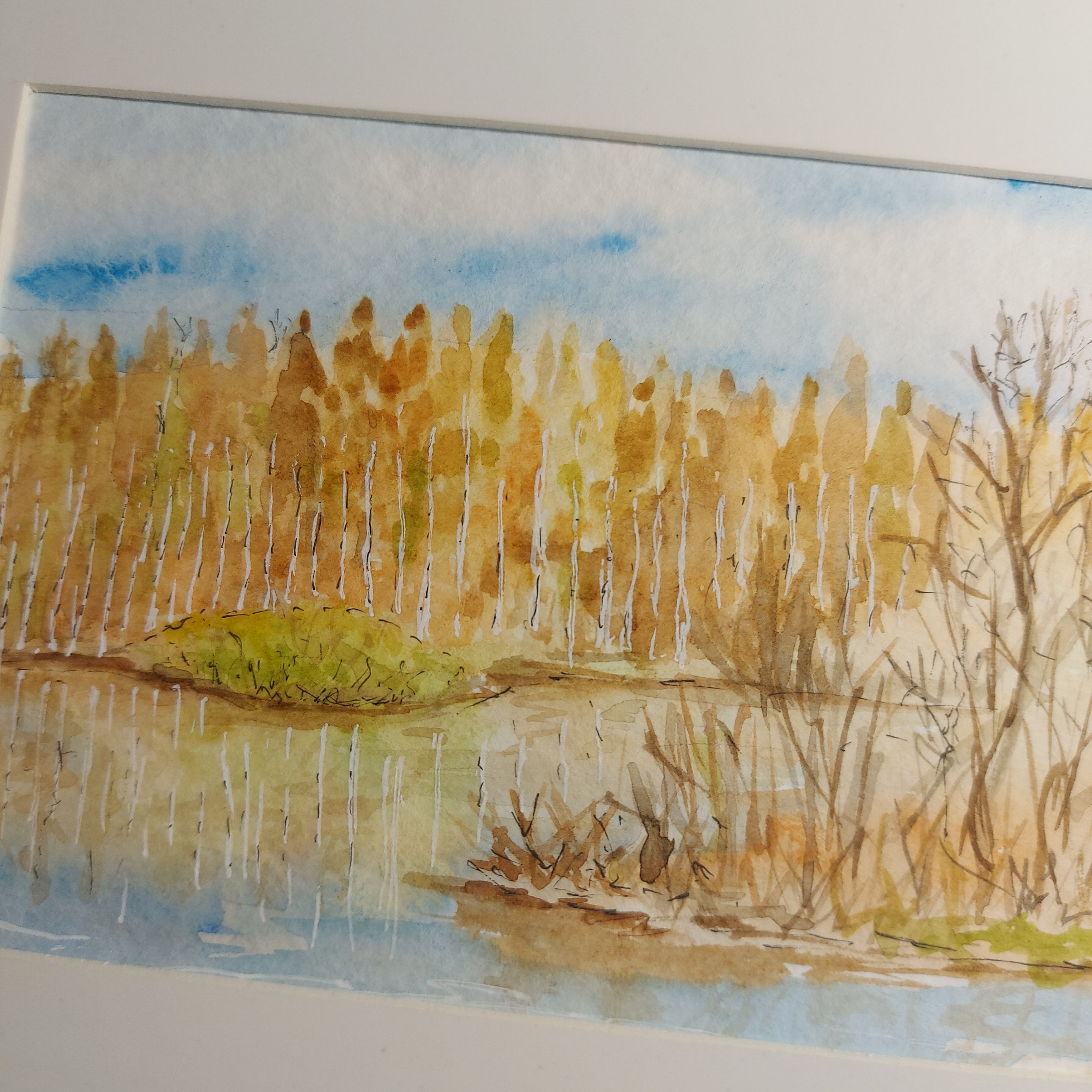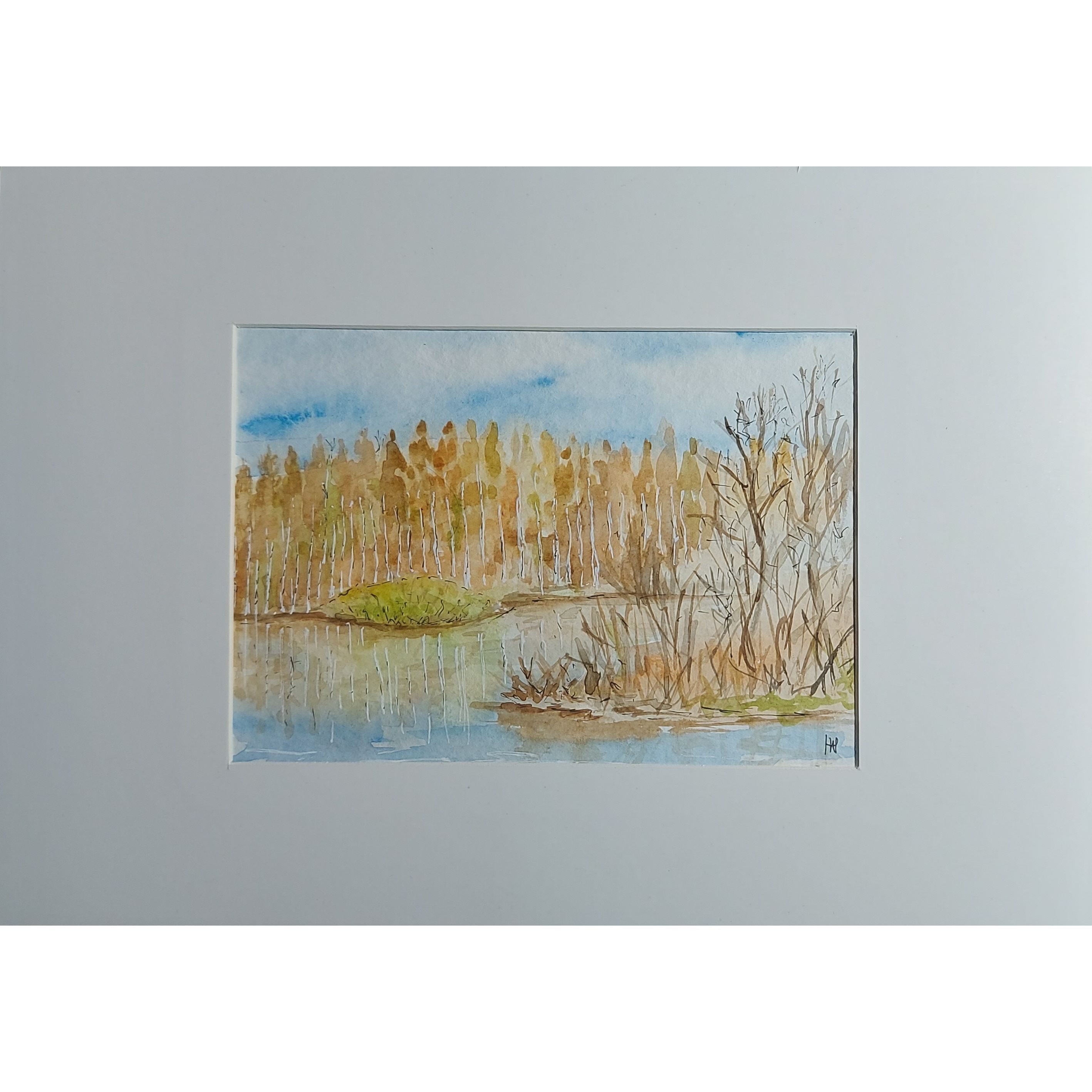 Мы видим акварельную картину, оформленную в светлую раму с паспарту. Картина представляет собой весенний пейзаж,с видом на водоем.
