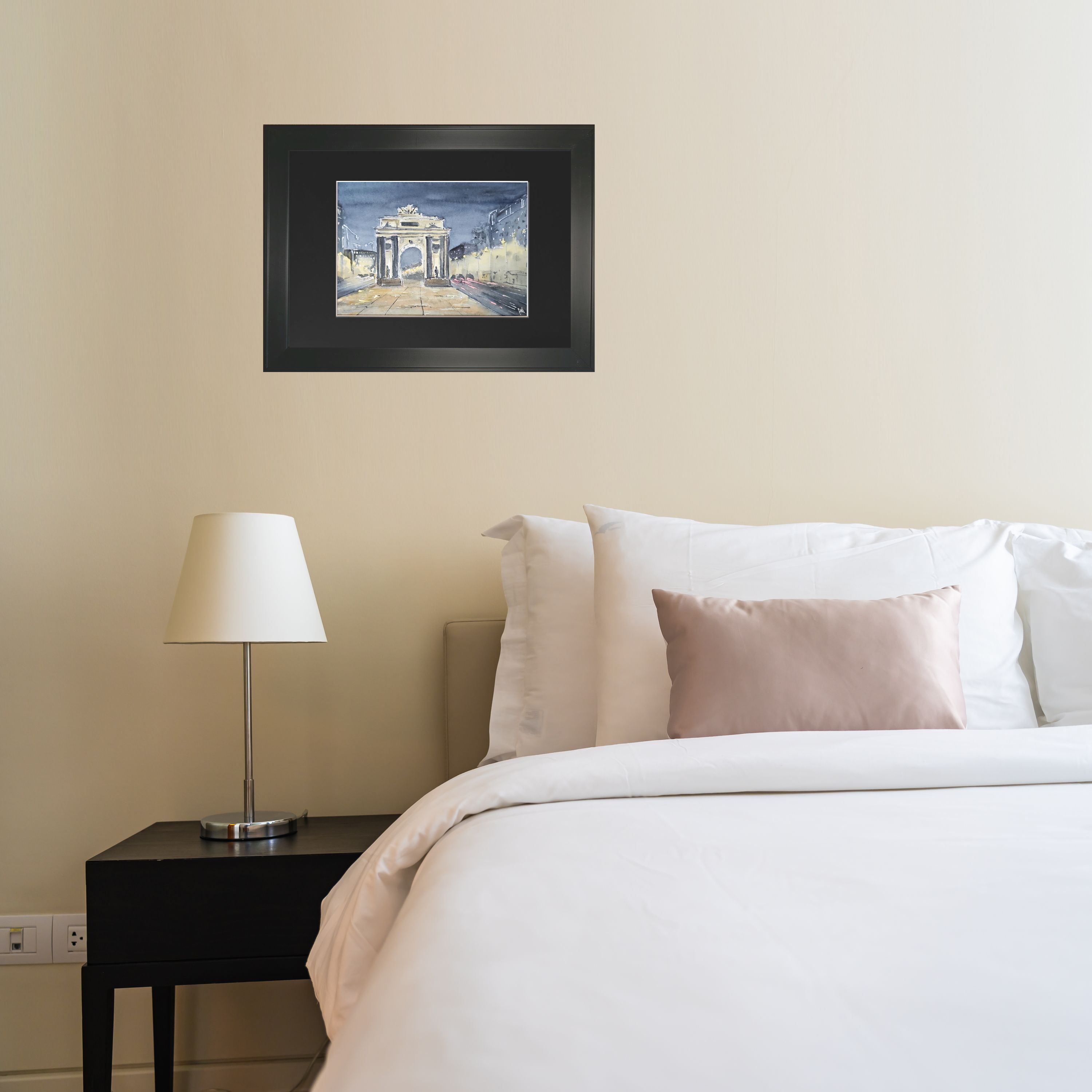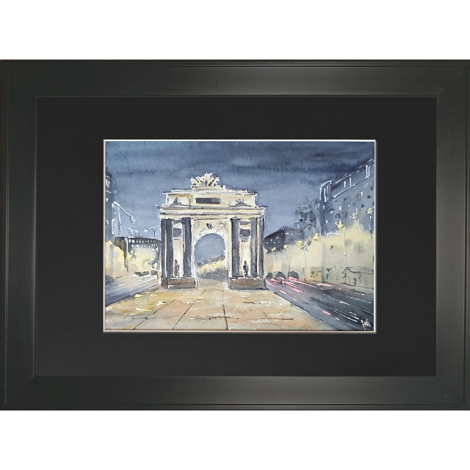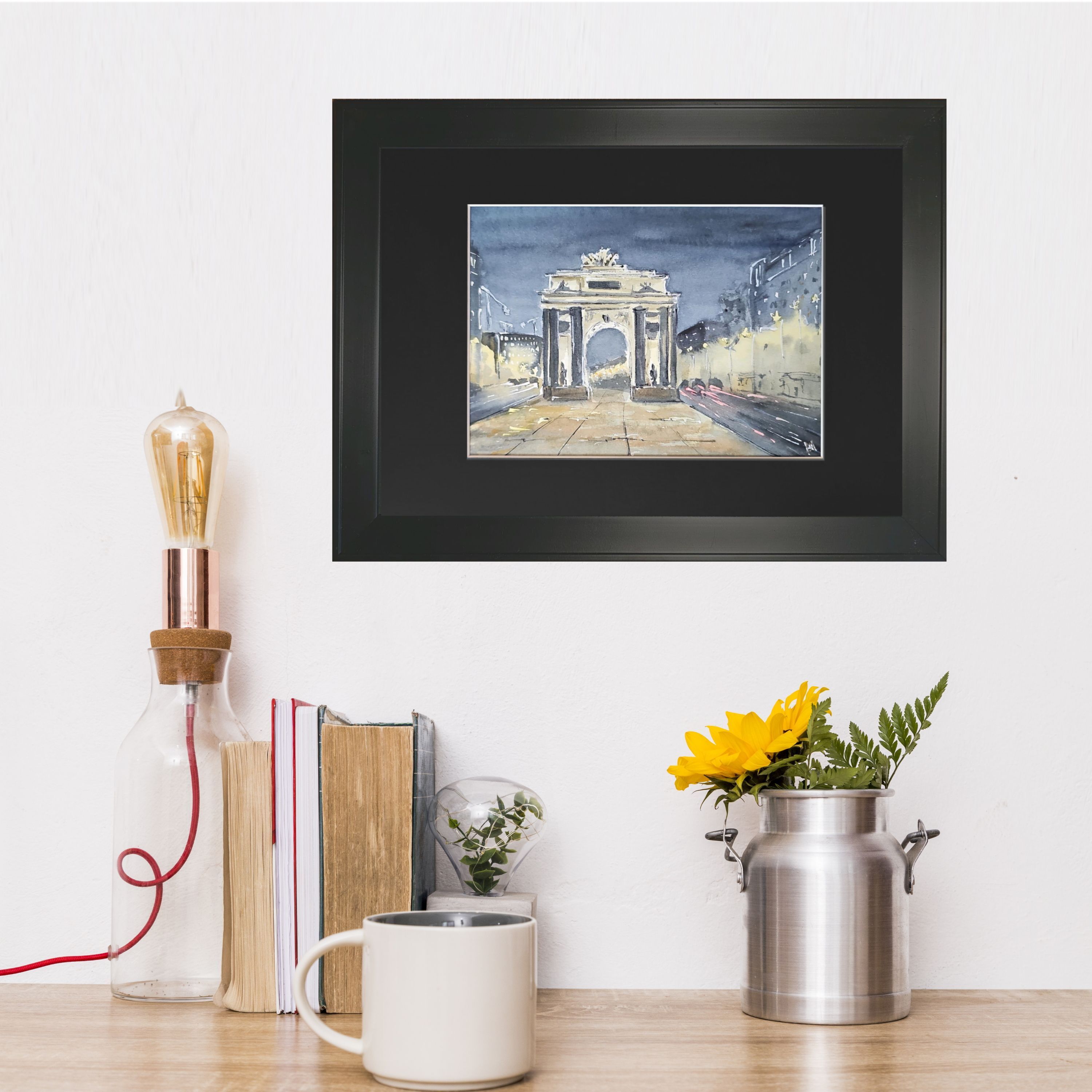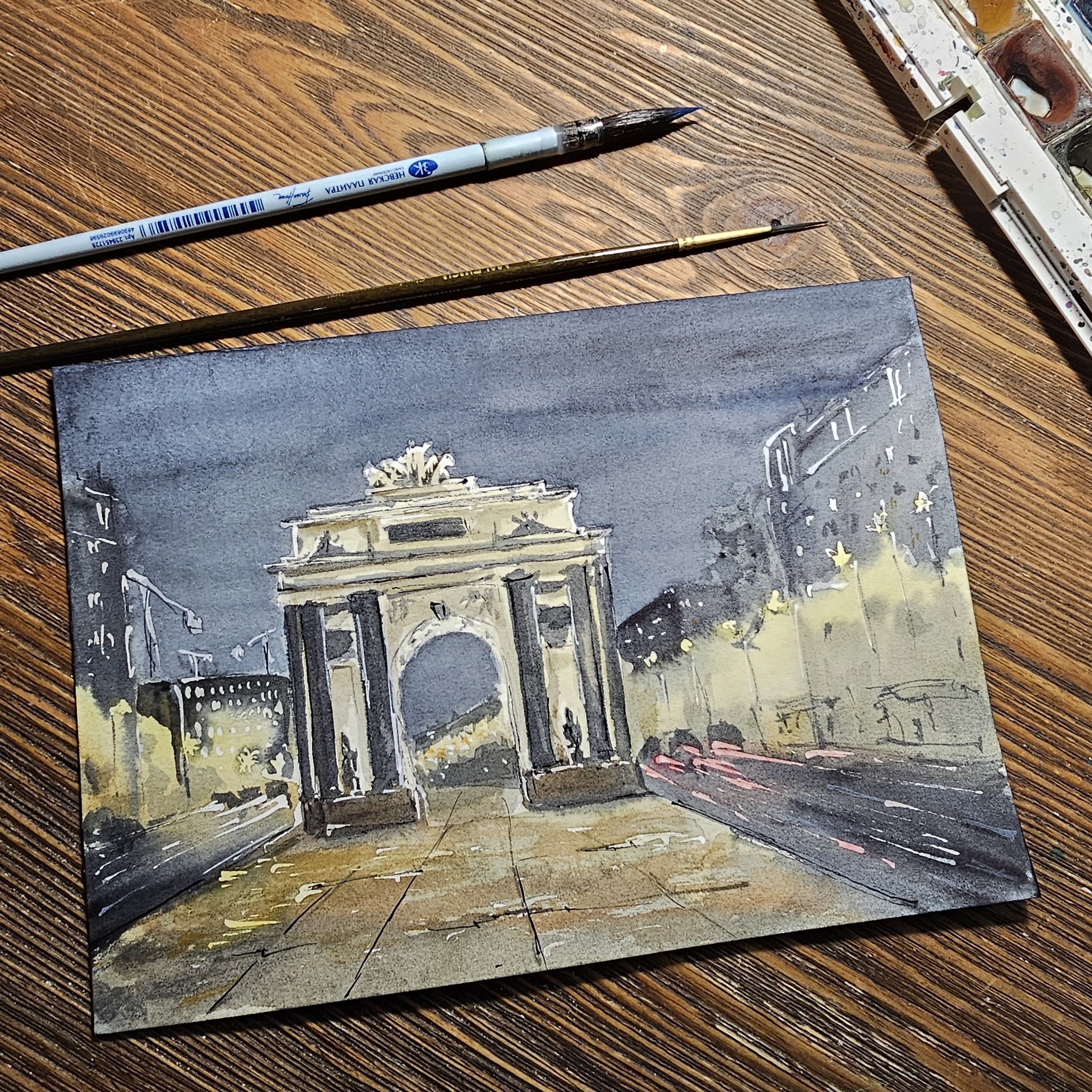 Нам представлена художественная картина, изображающая Триумфальную арку, в городском пейзаже Москвы. Арка выполнена в классическом стиле, с колоннами и декоративными элементами на вершине. Картина выполнена в ночное время, что подчеркивается темным небом и яркими светами, которые освещают улицы и здания по краям. На картине запечатлена перспектива улицы, ведущая через арку, создавая ощущение глубины. Цветовая гамма картины включает в себя темные и светлые оттенки, что придаёт ей атмосферу ночного города. Картина дополнена темным паспарту и черной рамой со стеклом.