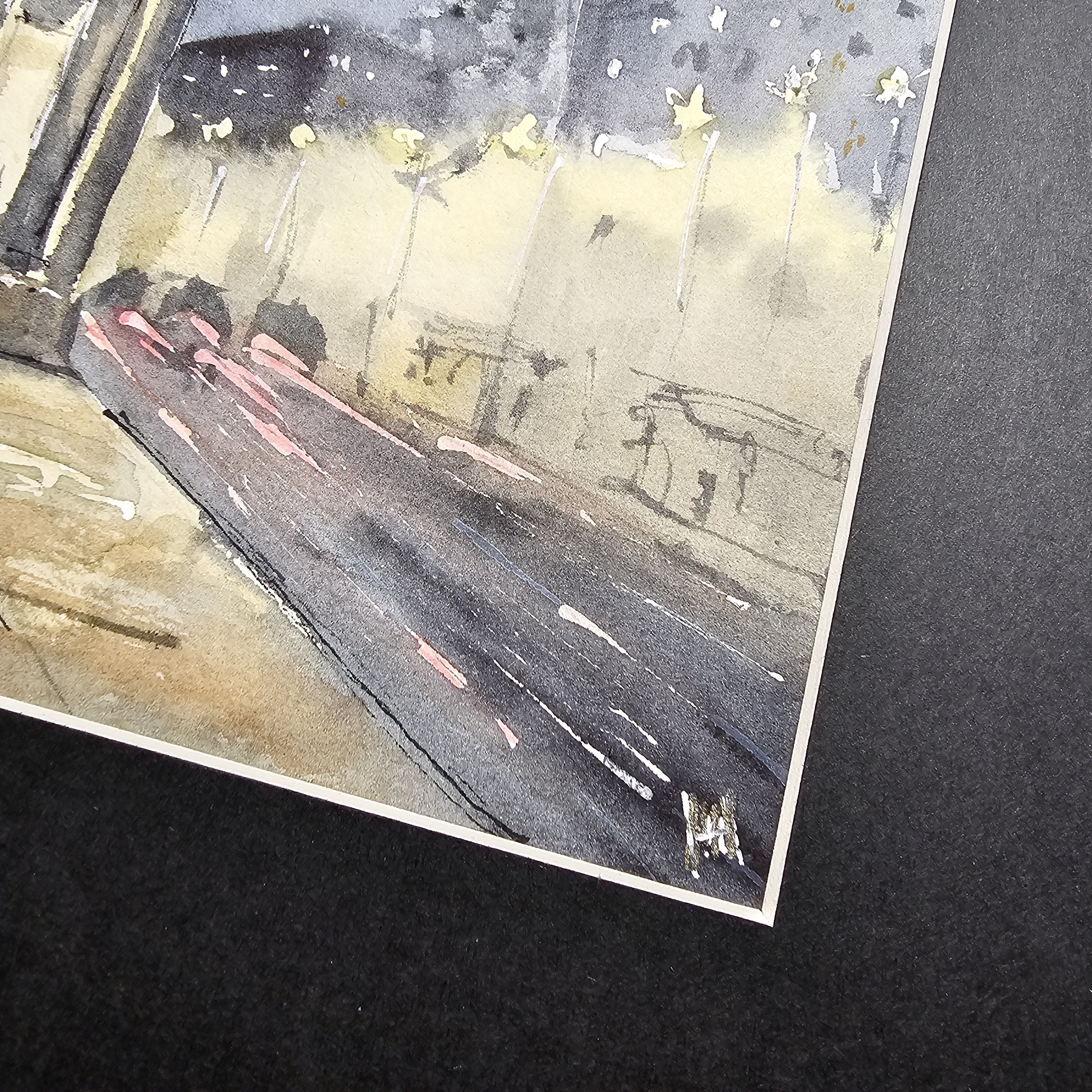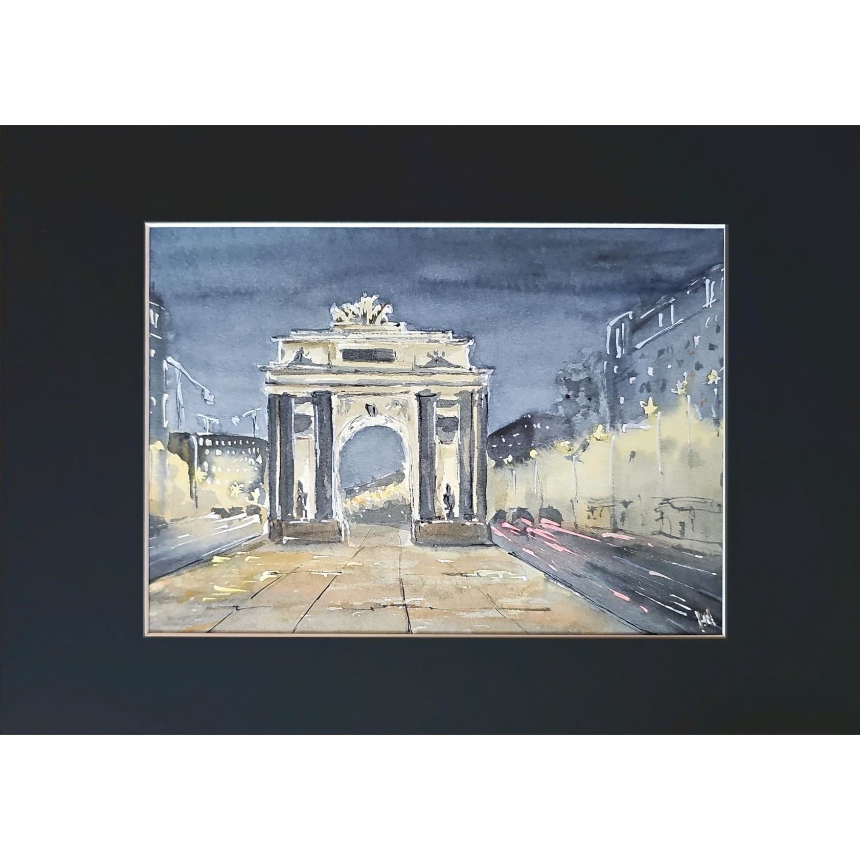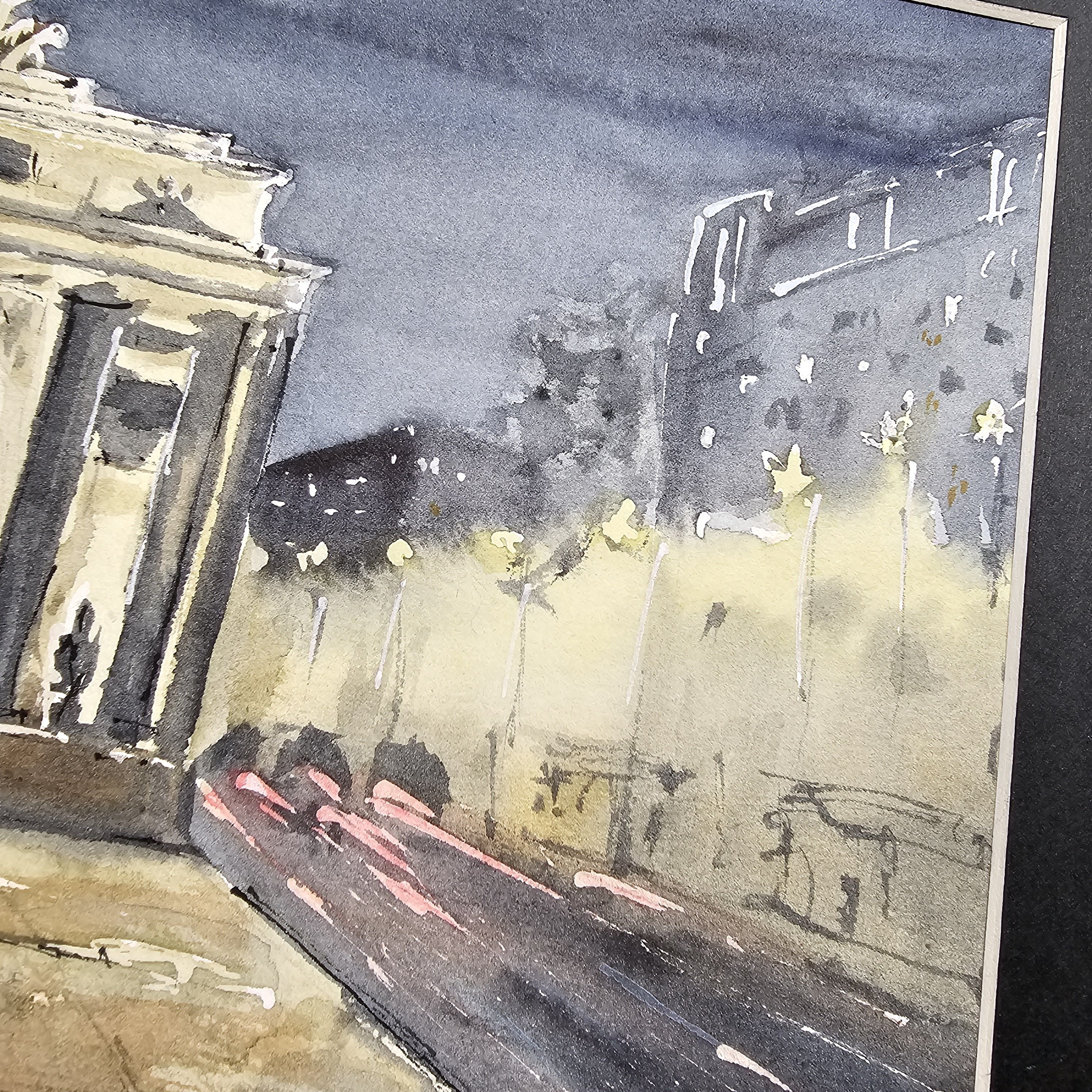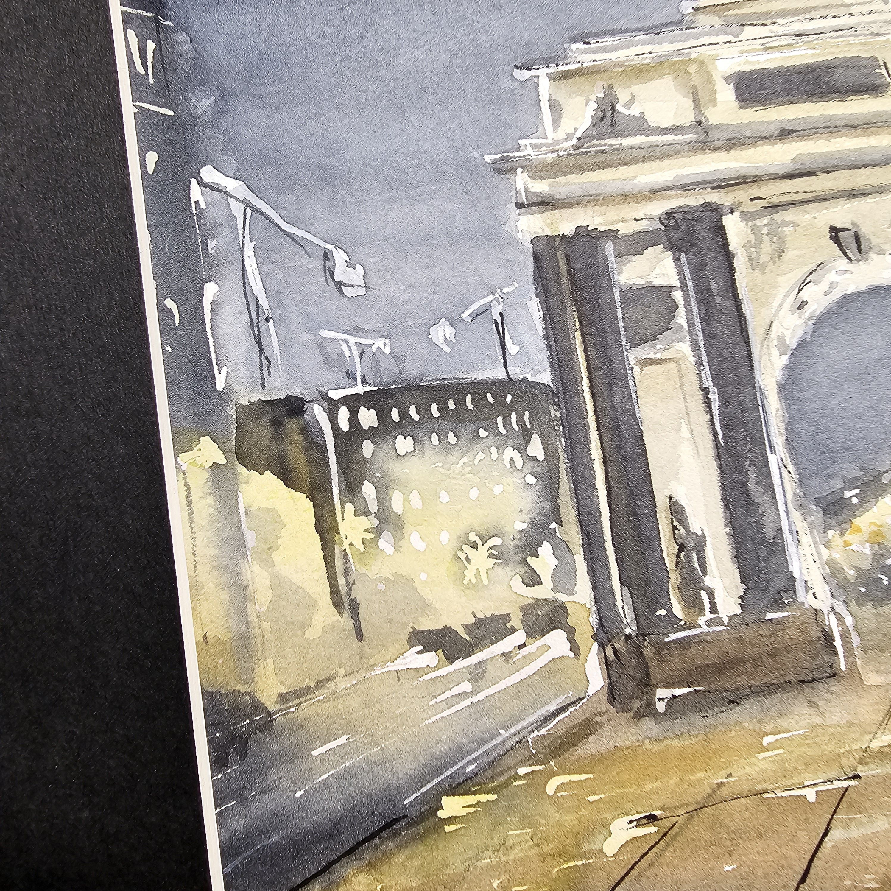 Нам представлена художественная картина, изображающая Триумфальную арку, в городском пейзаже Москвы. Арка выполнена в классическом стиле, с колоннами и декоративными элементами на вершине. Картина выполнена в ночное время, что подчеркивается темным небом и яркими светами, которые освещают улицы и здания по краям. На картине запечатлена перспектива улицы, ведущая через арку, создавая ощущение глубины. Цветовая гамма картины включает в себя темные и светлые оттенки, что придаёт ей атмосферу ночного города. Картина дополнена темным паспарту и черной рамой со стеклом.