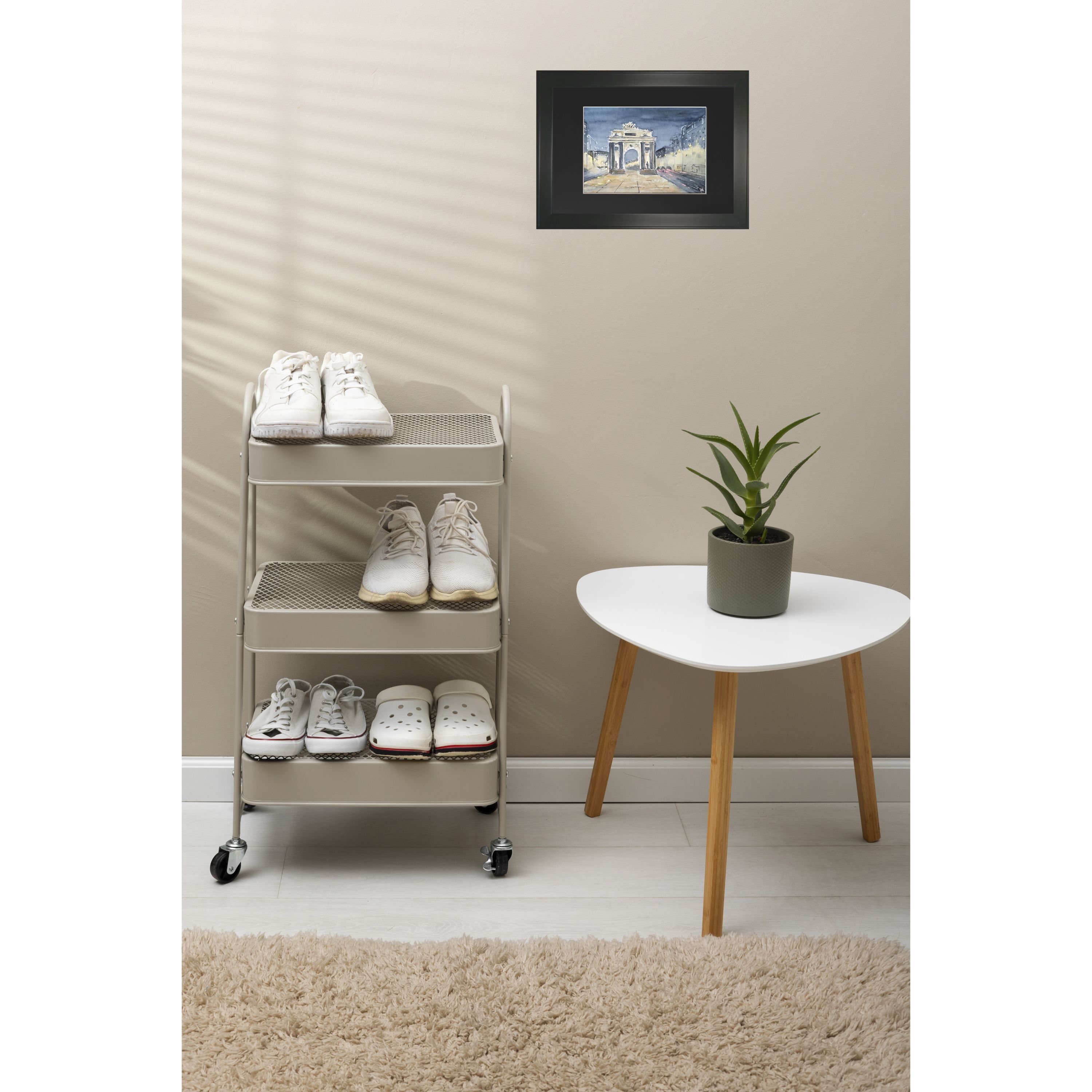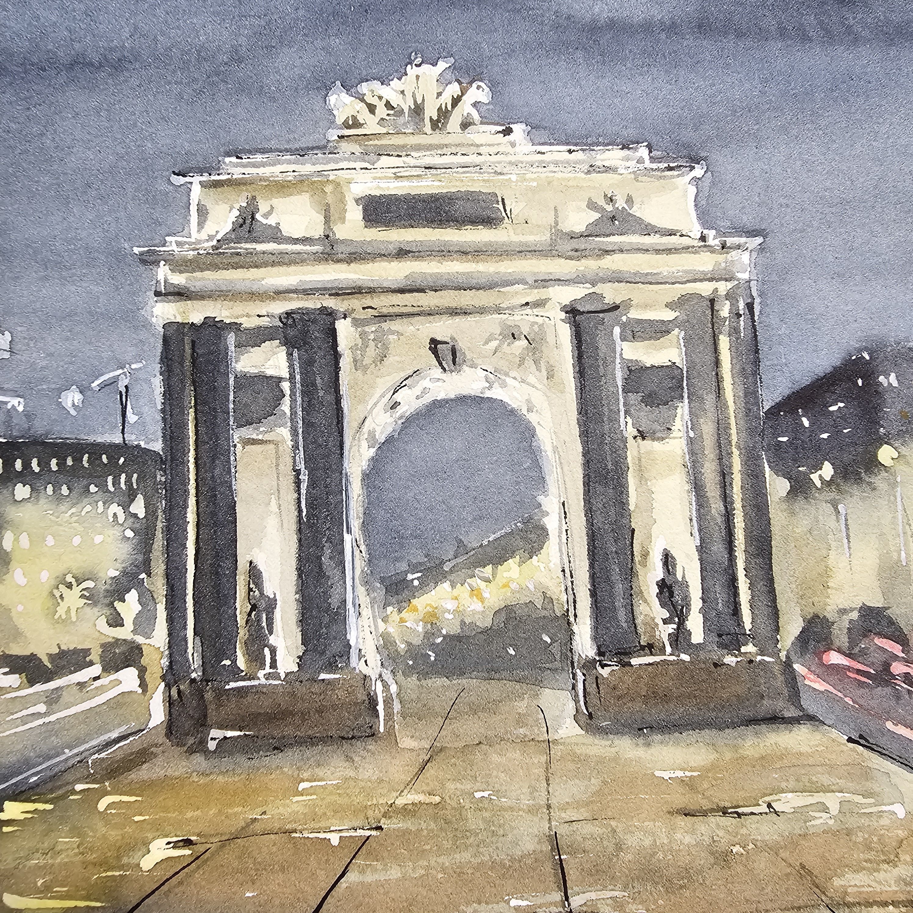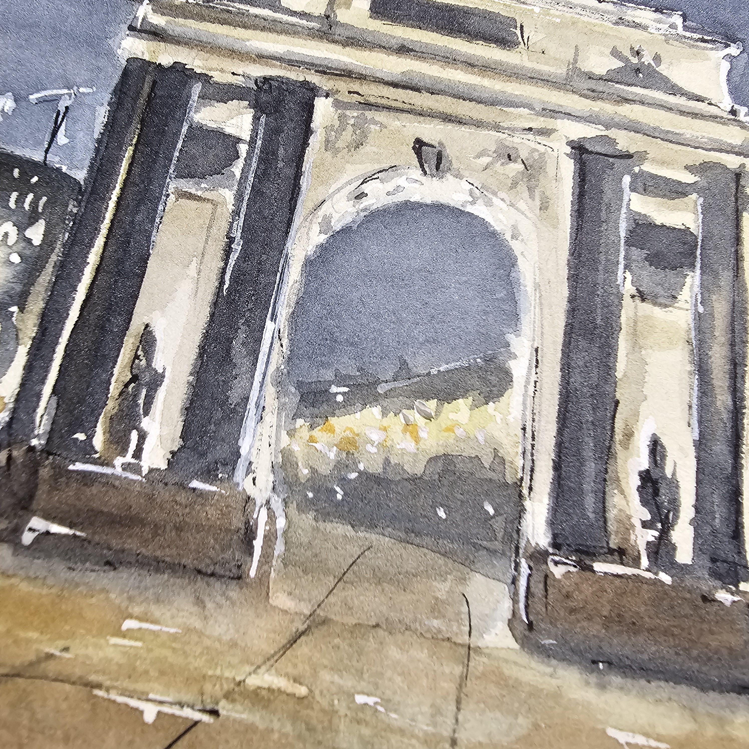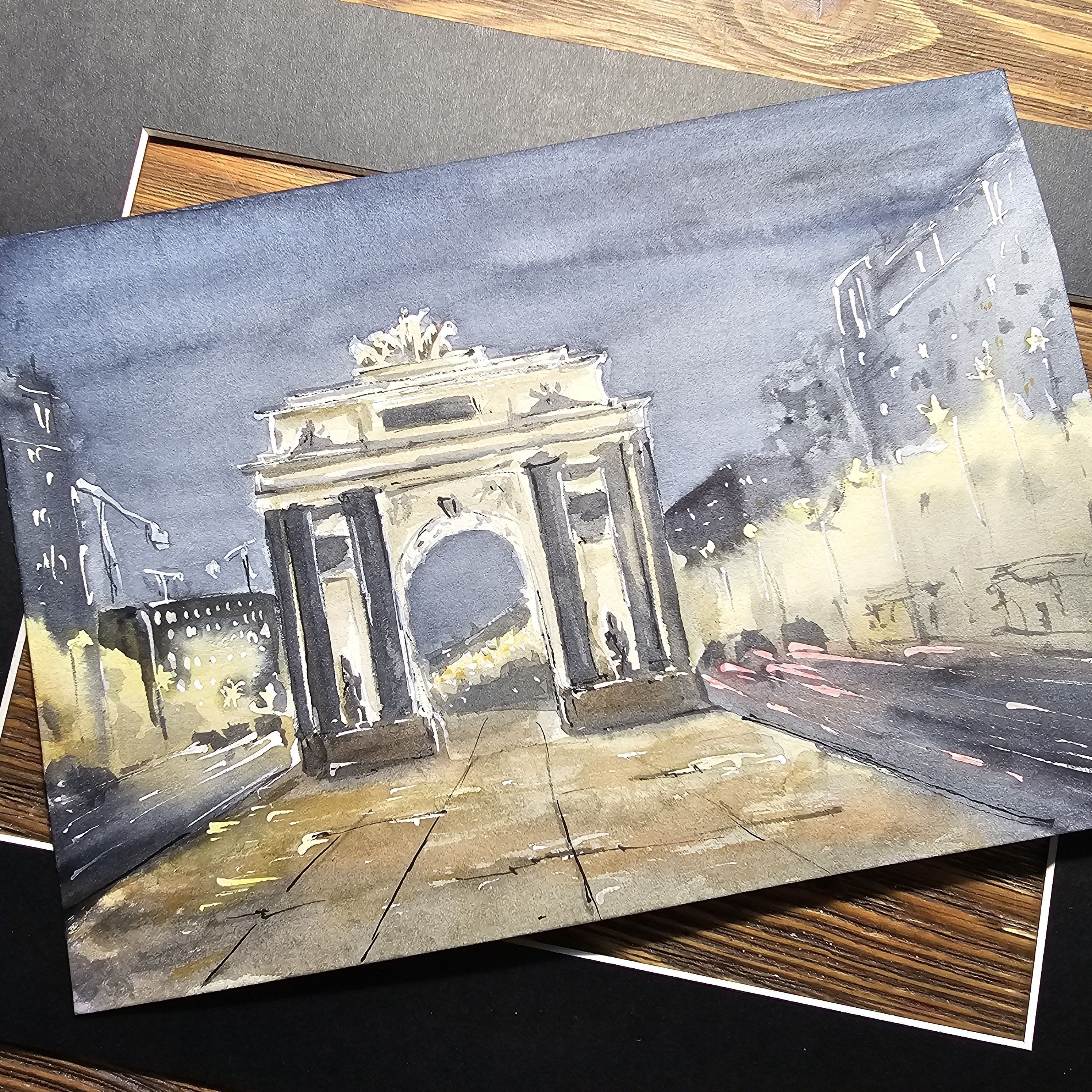 Нам представлена художественная картина, изображающая Триумфальную арку, в городском пейзаже Москвы. Арка выполнена в классическом стиле, с колоннами и декоративными элементами на вершине. Картина выполнена в ночное время, что подчеркивается темным небом и яркими светами, которые освещают улицы и здания по краям. На картине запечатлена перспектива улицы, ведущая через арку, создавая ощущение глубины. Цветовая гамма картины включает в себя темные и светлые оттенки, что придаёт ей атмосферу ночного города. Картина дополнена темным паспарту и черной рамой со стеклом.