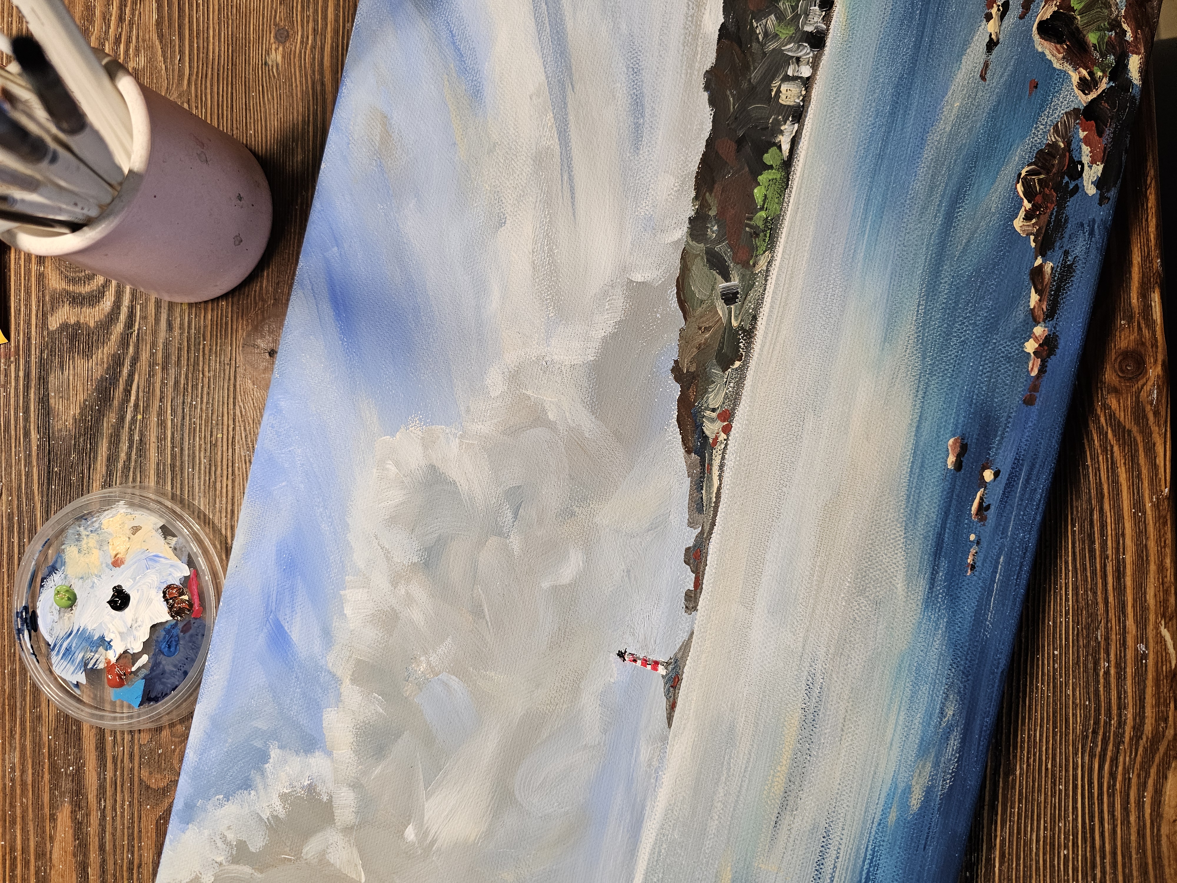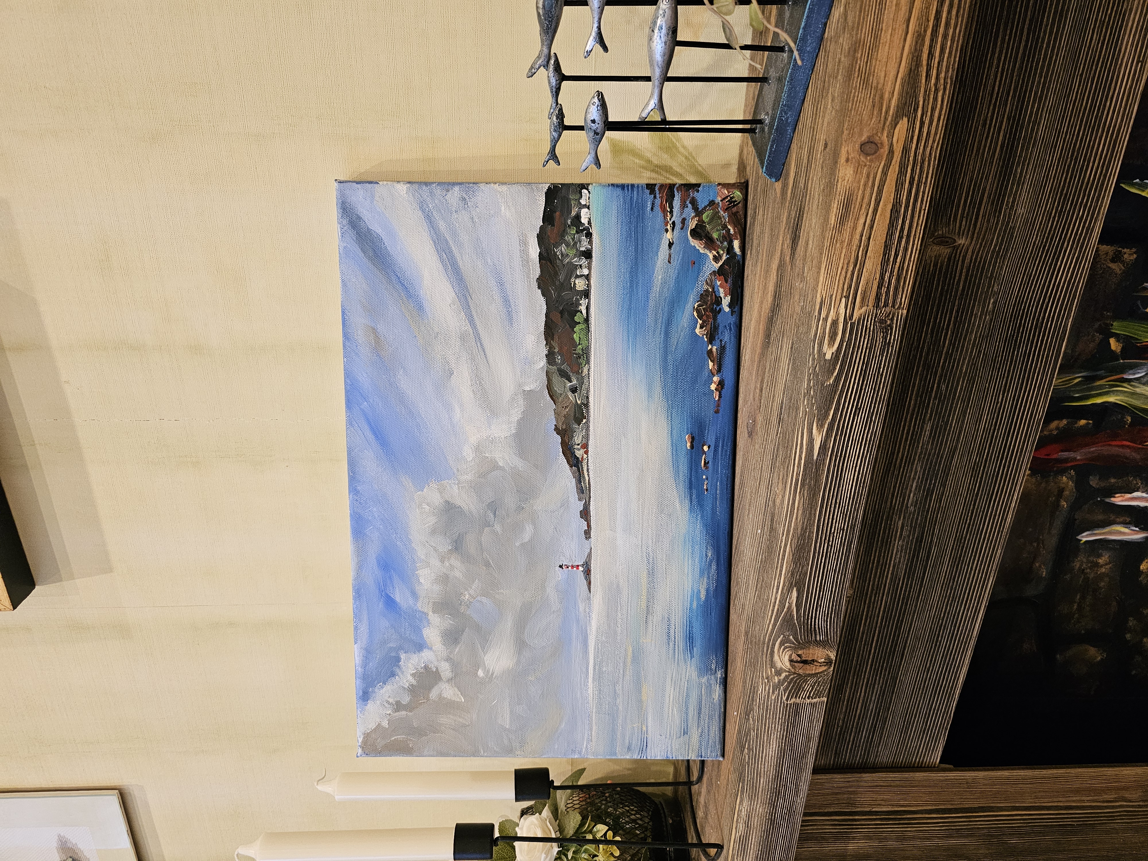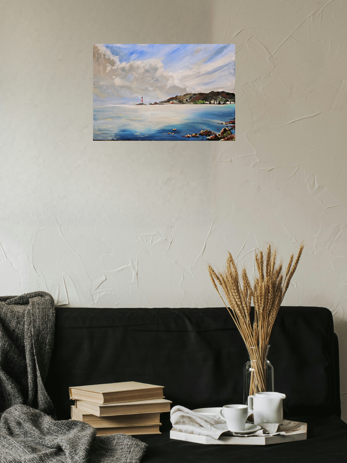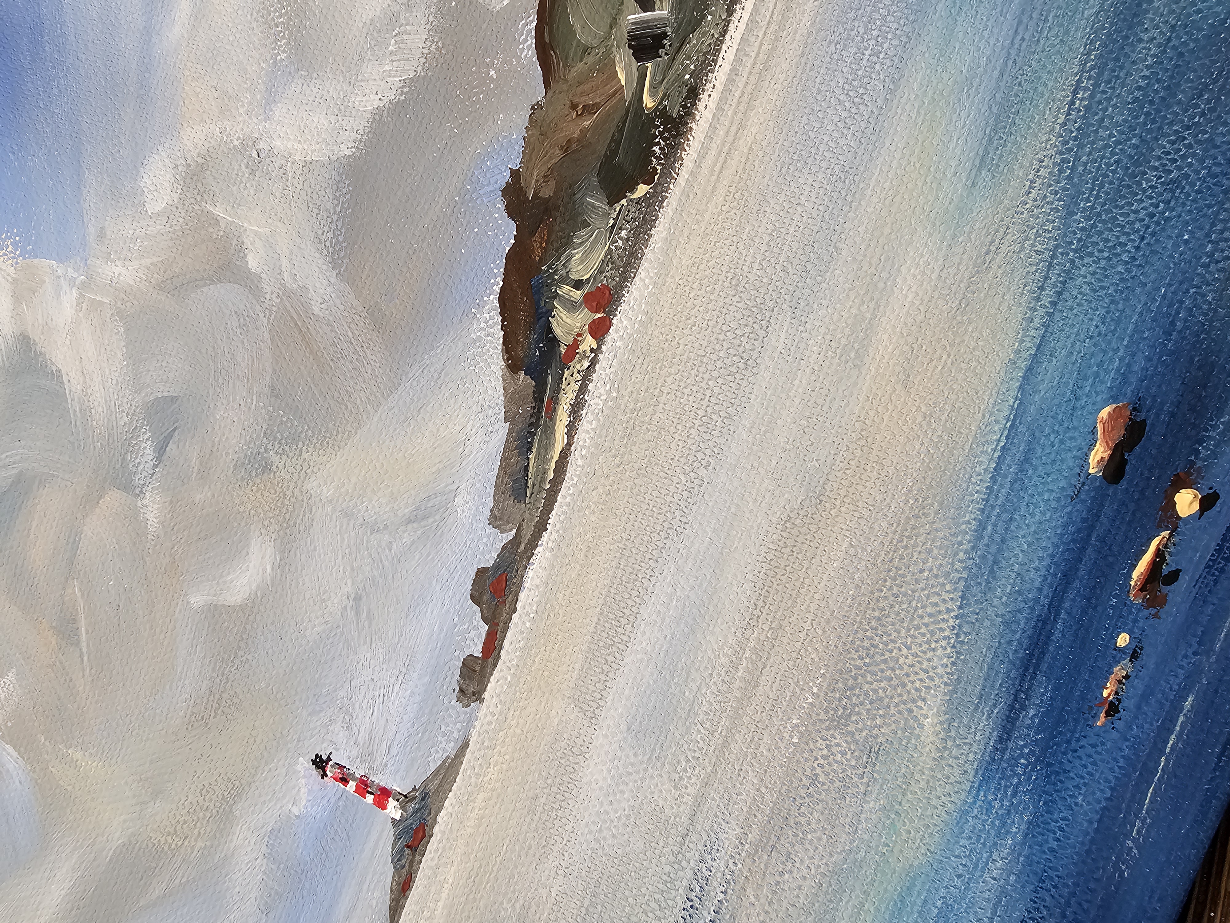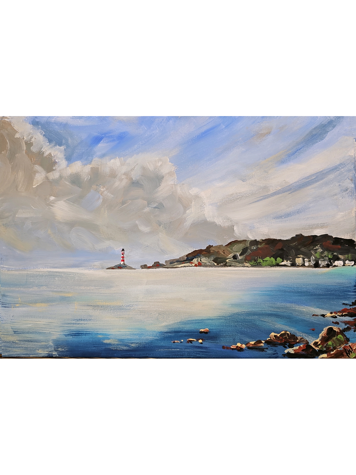 Нам представлена живописная картина с морским пейзажем. На переднем плане видна спокойная водная гладь с отражением неба. В правой части картины изображены камни, выступающие из воды. На заднем плане, в центре, находится остров с маяком, который окрашен в красно-белые полосы. Над морем раскинулось небо с большими облаками, создающими ощущение лёгкости и простора. Справа виден берег с холмами и зелёной растительностью. Картина выполнена в ярких и насыщенных тонах, передающих атмосферу спокойствия и умиротворения.