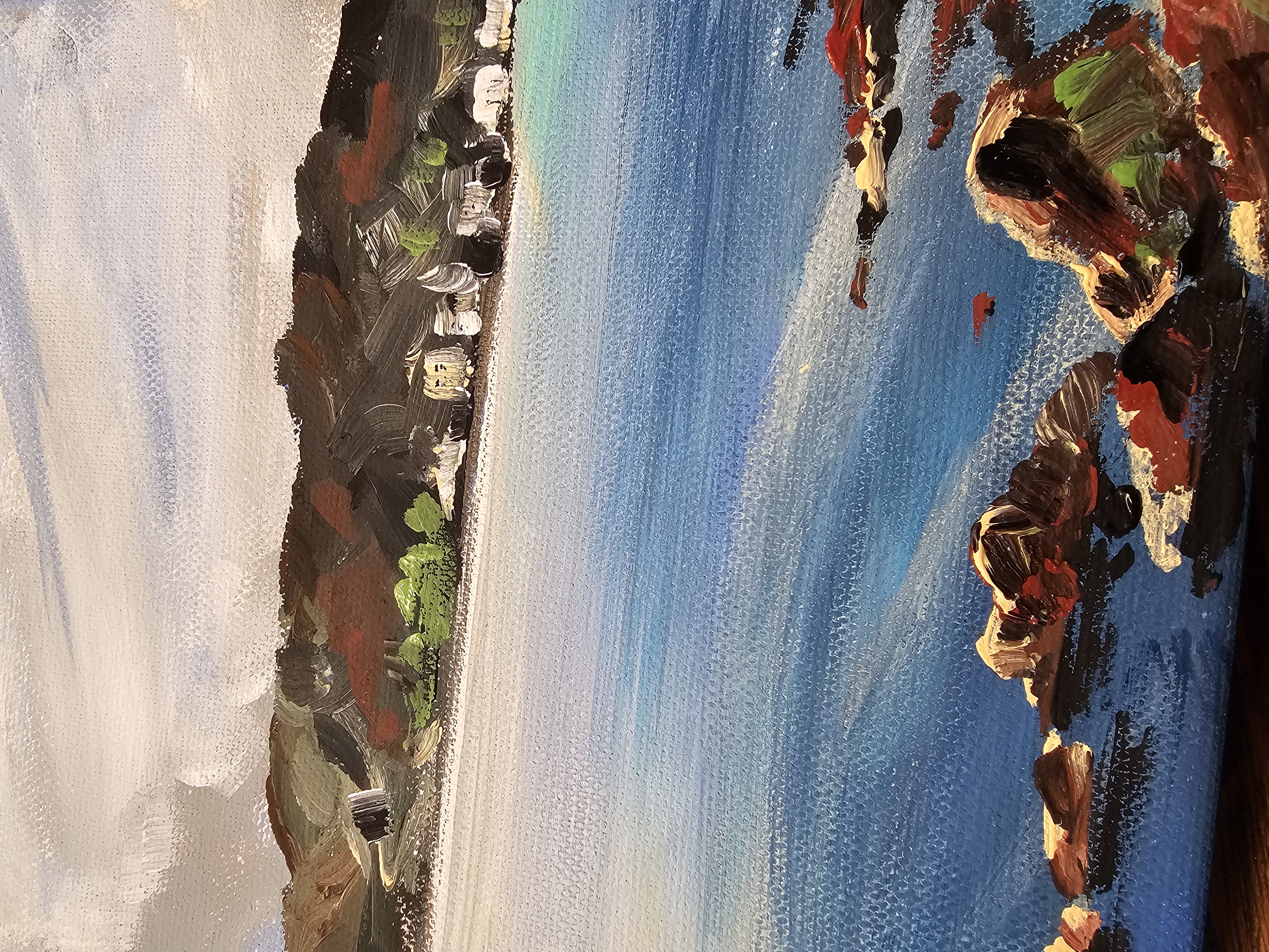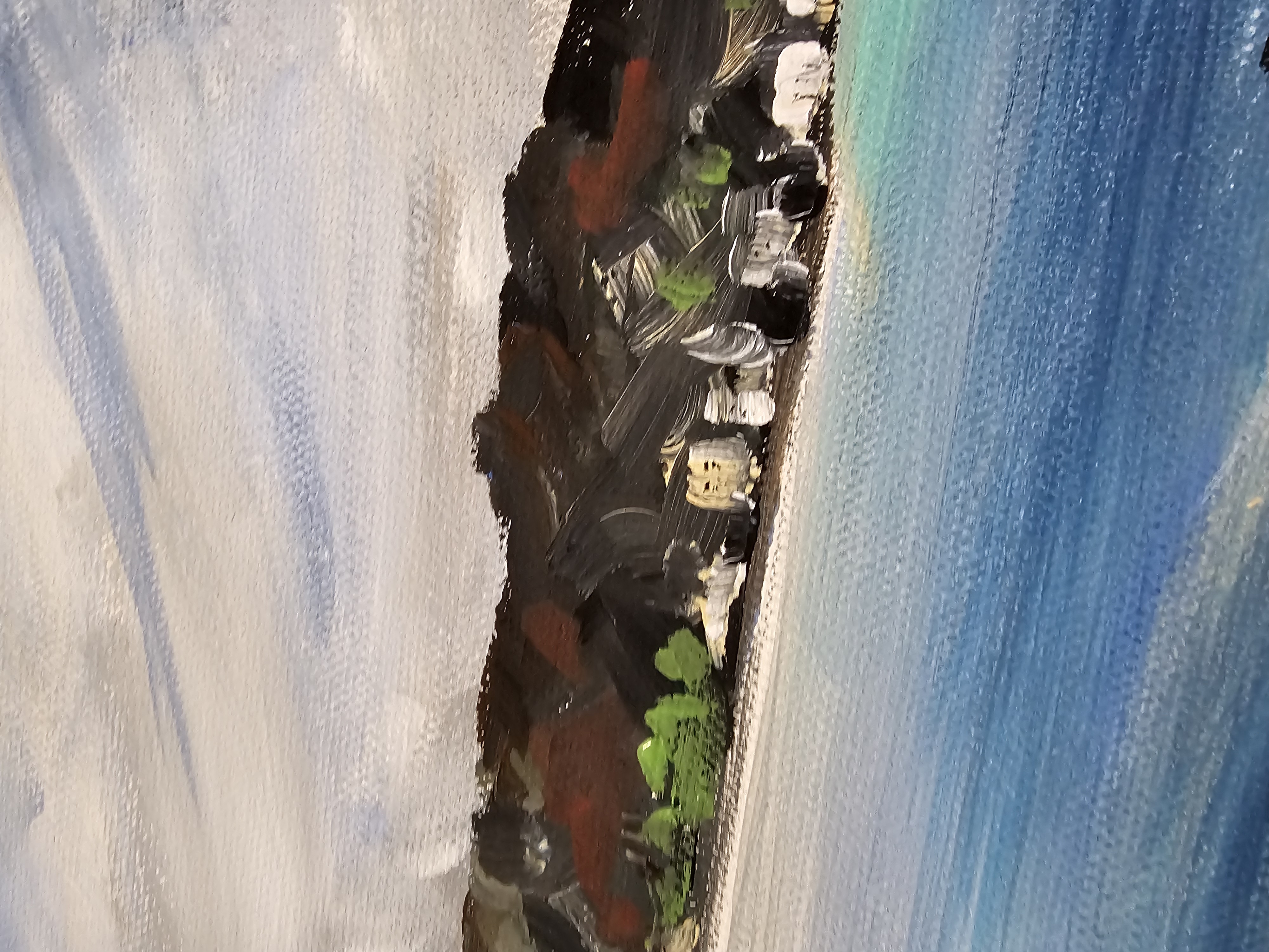 У картины галерейная натяжка, поэтому еее допустимо вешать без дополнительной рамы.