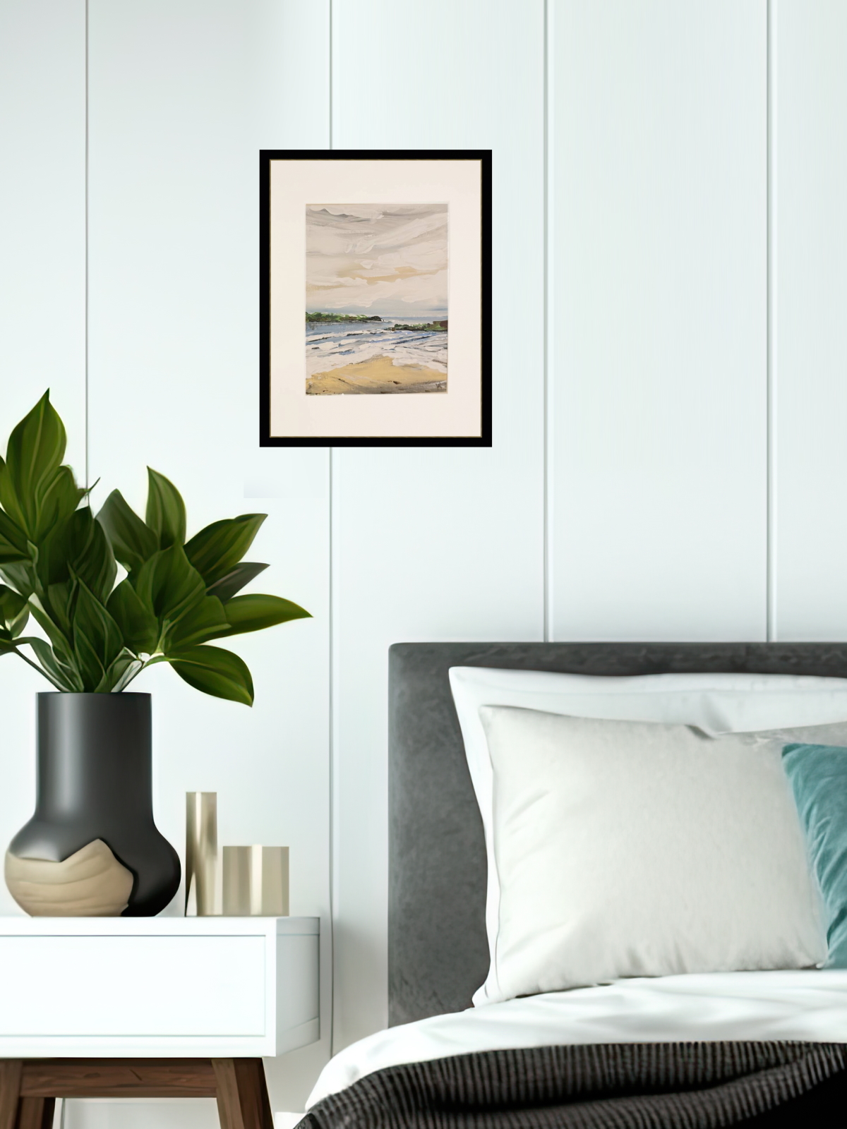 Нам представлена картина, выполненная в технике абстрактной живописи. На картине изображён морской пейзаж. На переднем плане виден песчаный пляж, переходящий в морские волны. Волны изображены белыми и синими мазками, что создаёт эффект движения воды. На заднем плане виднеется линия горизонта, за которой находятся зелёные холмы или скалы. Небо покрыто облаками, выполненными широкими белыми и серыми мазками, что создаёт впечатление облачной погоды.