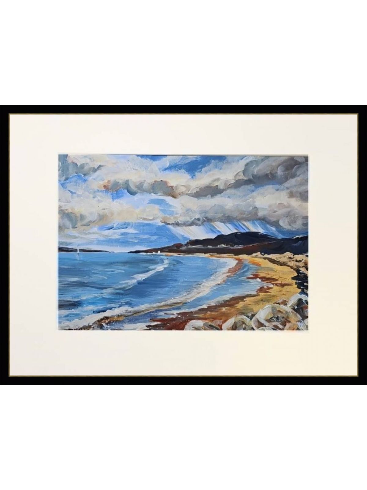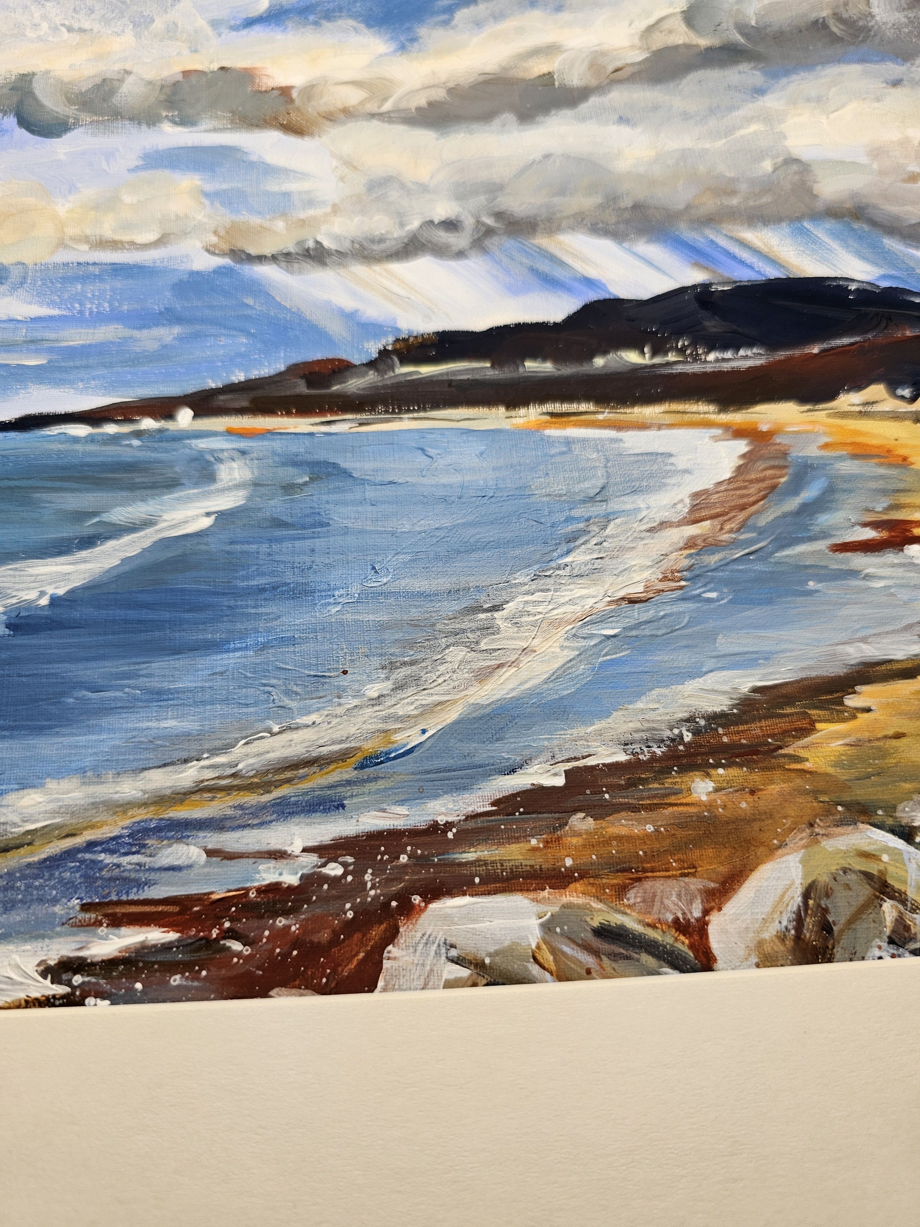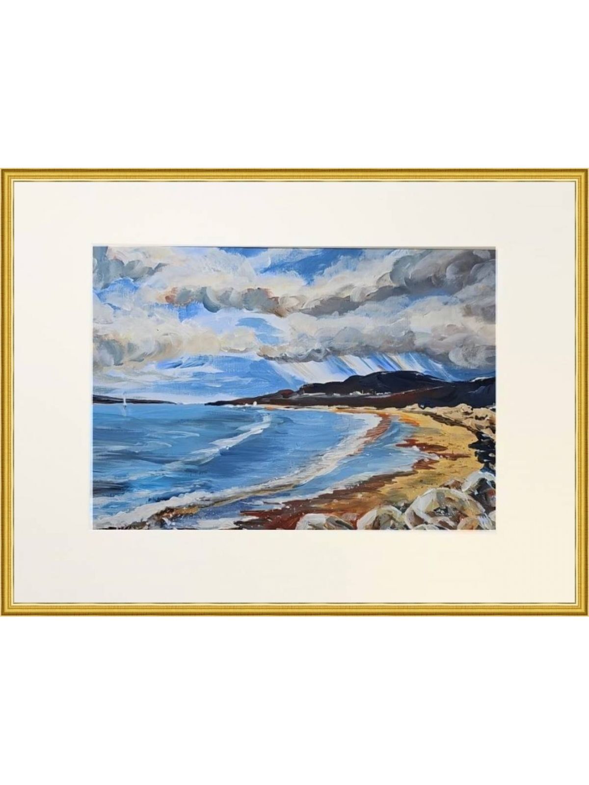 Нам представлена живописная картина, изображающая морскую береговую линию. На переднем плане виден пляж с песчаным берегом, который переходит в морские воды. Волны катятся к берегу, создавая плавные линии на поверхности моря. Небо покрыто облаками, которые придают картине динамичности и объема. На горизонте видны горы, подчеркивающие природную красоту сцены. А за ними идет дождь. Картина выполнена в ярких, насыщенных тонах, с преобладанием синих и коричневых оттенков.