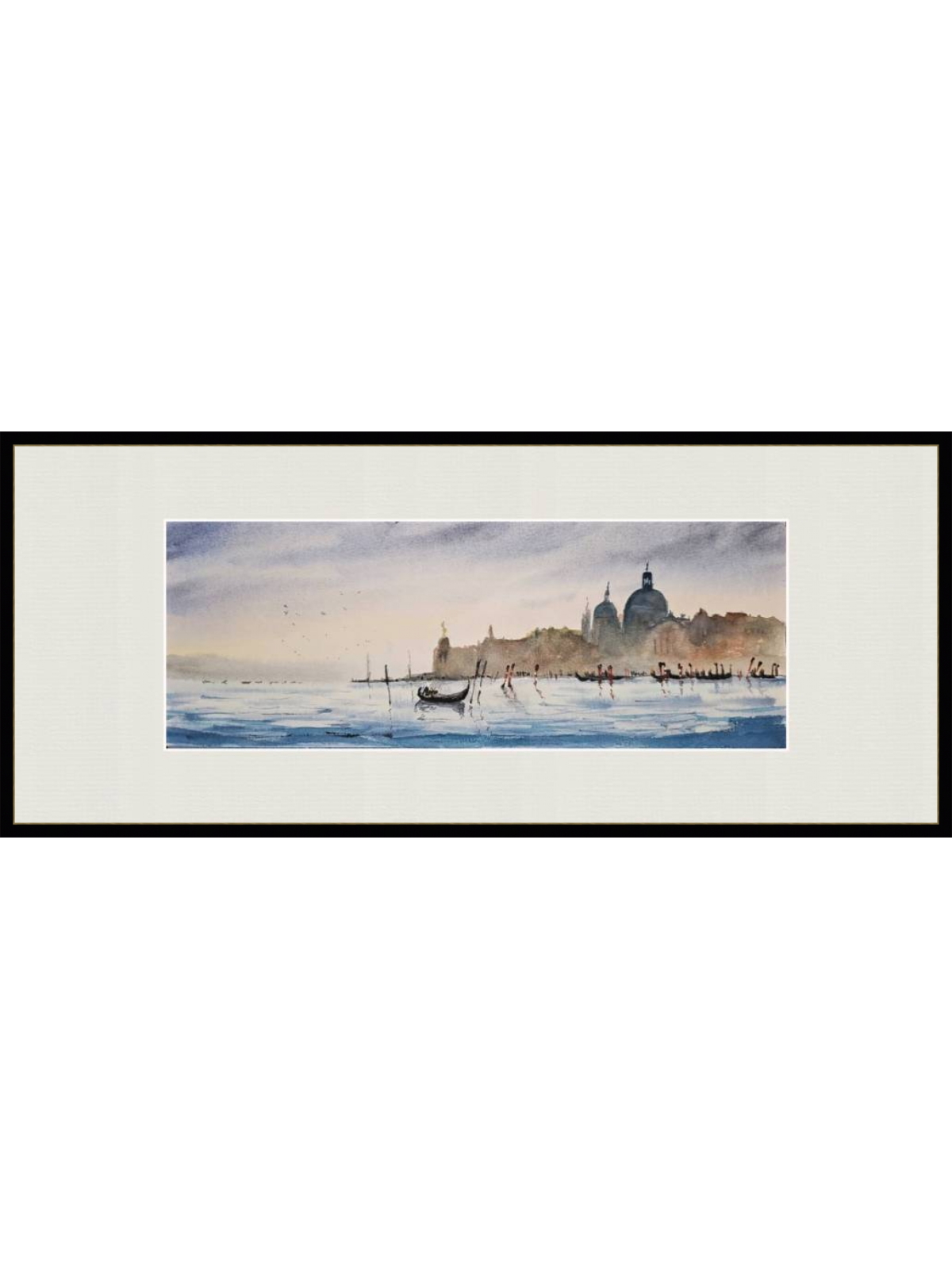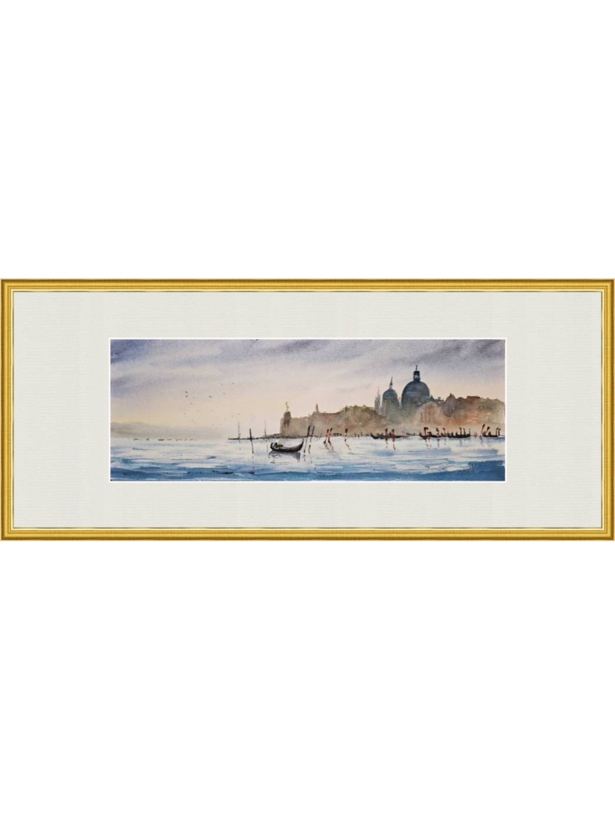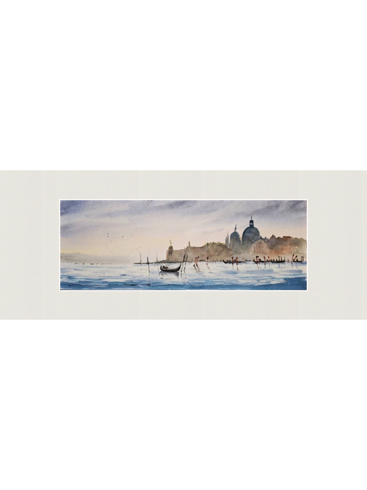 Нам представлена акварельная картина с видом на водную гладь и город на заднем плане. На переднем плане видна гондола, плывущая по спокойной воде. Вдалеке можно увидеть очертания зданий с куполами и башнями, которые создают атмосферу старинного европейского города Венеции. Цвета картины преимущественно мягкие и пастельные, с преобладанием голубых и бежевых тонов, что придаёт изображению спокойствие и романтичность. Работа оформлена в светлое паспарту и готова к размещению в стандартной раме 20*50 см.