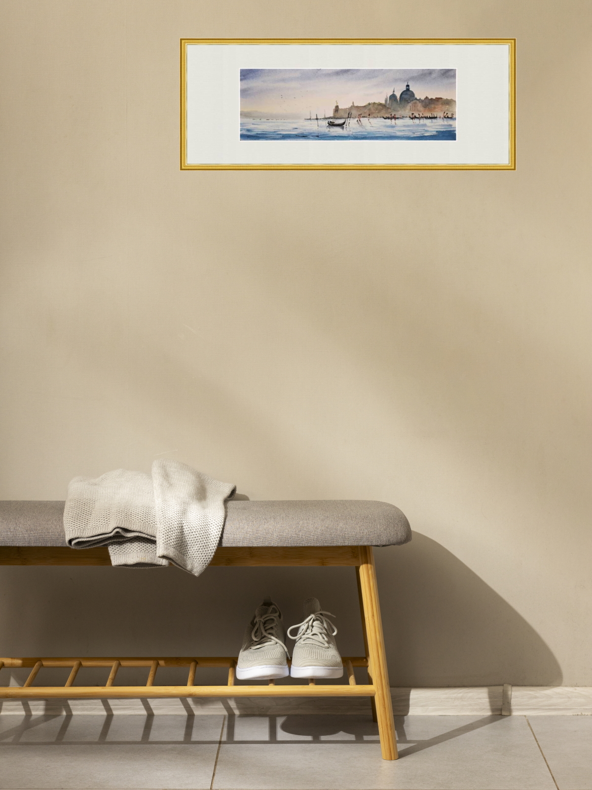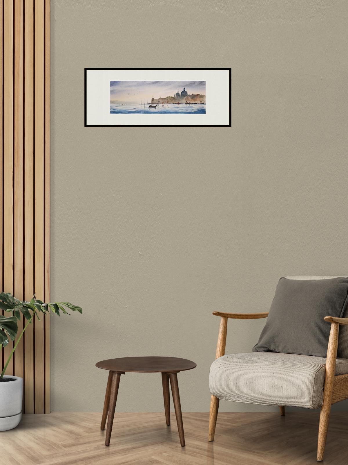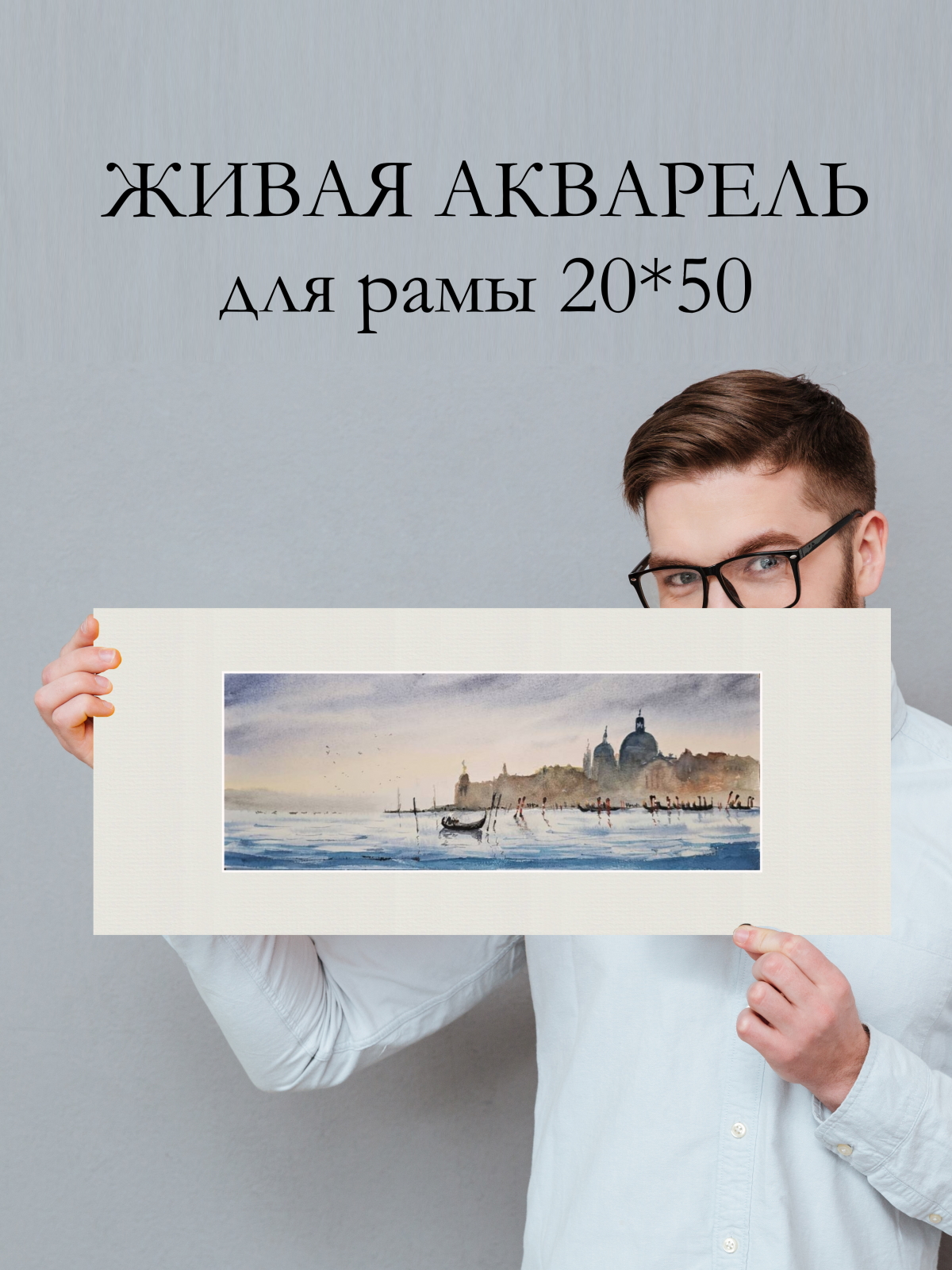 Нам представлена акварельная картина с видом на водную гладь и город на заднем плане. На переднем плане видна гондола, плывущая по спокойной воде. Вдалеке можно увидеть очертания зданий с куполами и башнями, которые создают атмосферу старинного европейского города Венеции. Цвета картины преимущественно мягкие и пастельные, с преобладанием голубых и бежевых тонов, что придаёт изображению спокойствие и романтичность. Работа оформлена в светлое паспарту и готова к размещению в стандартной раме 20*50 см.