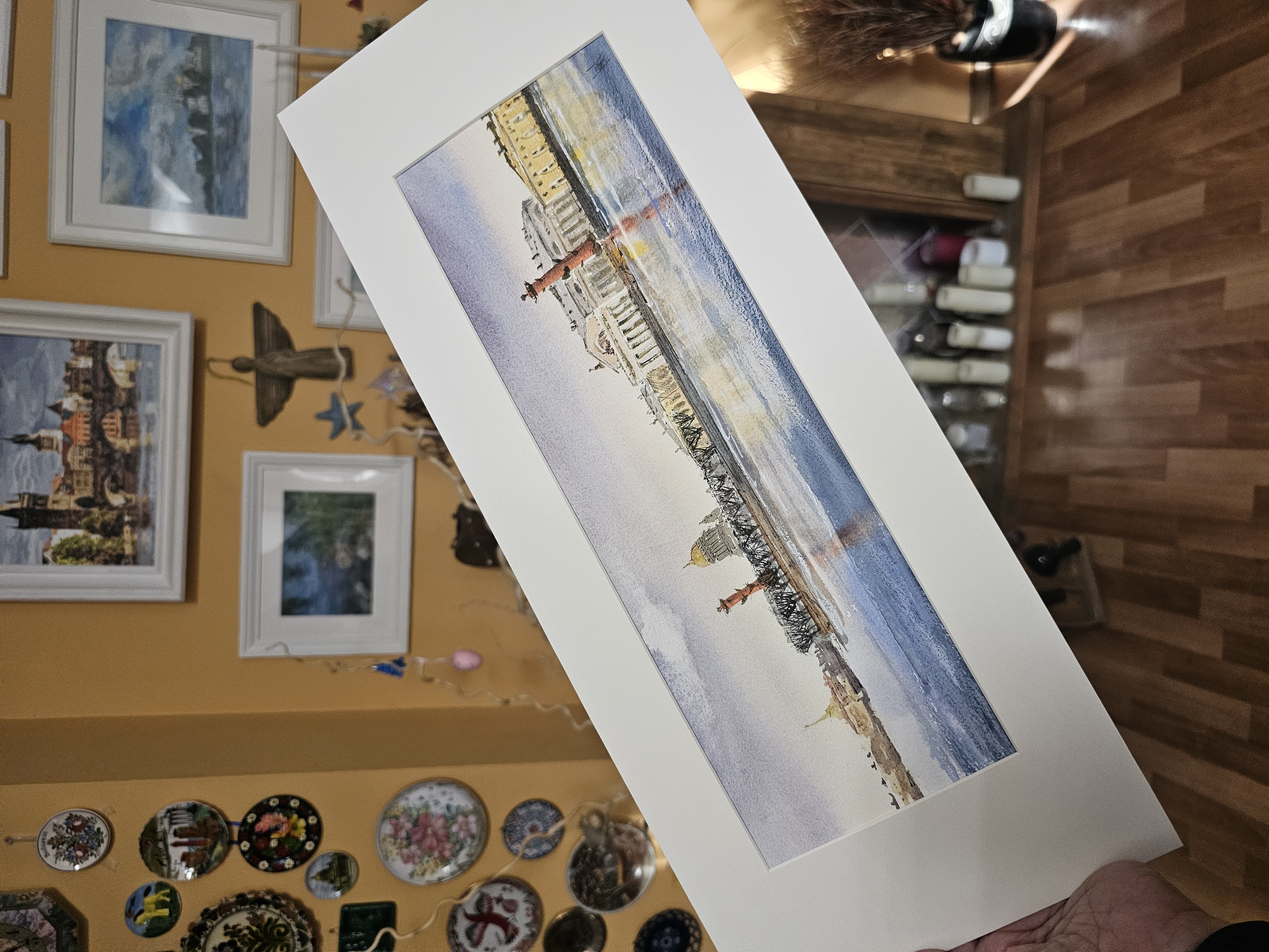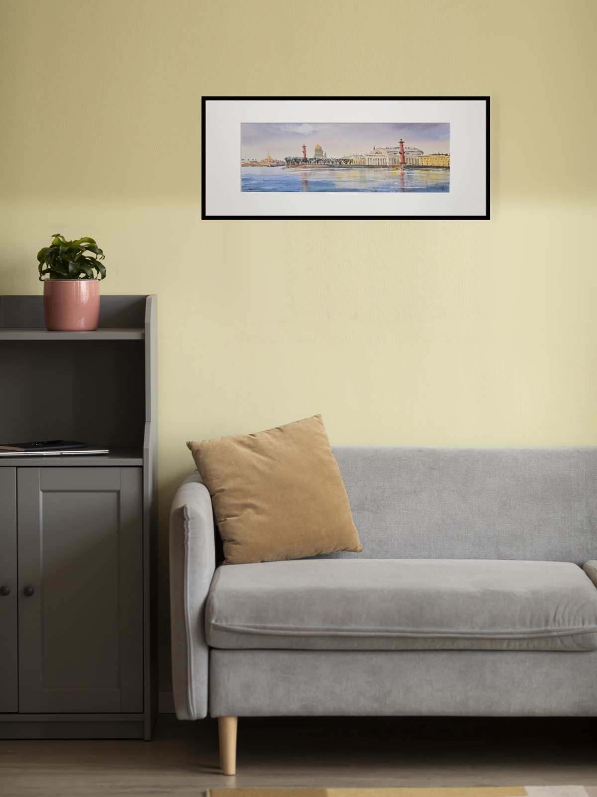 Нам представлена акварельная картина с панорамным видом набережной. На переднем плане изображена водная гладь, отражающая здания и архитектурные элементы. В центре композиции находятся две красные колонны, известные как Ростральные колонны. Справа от них виднеется здание с колоннадой и куполом, подтверждая архитектуру Санкт-Петербурга. На заднем плане можно увидеть купол и шпиль, относящиеся к известным достопримечательностям города. Картина выполнена в мягких пастельных тонах, создающих атмосферу спокойствия и гармонии. Работа оформлена в светлое паспарту и готова к размещению в стандартной раме 20*50 см.