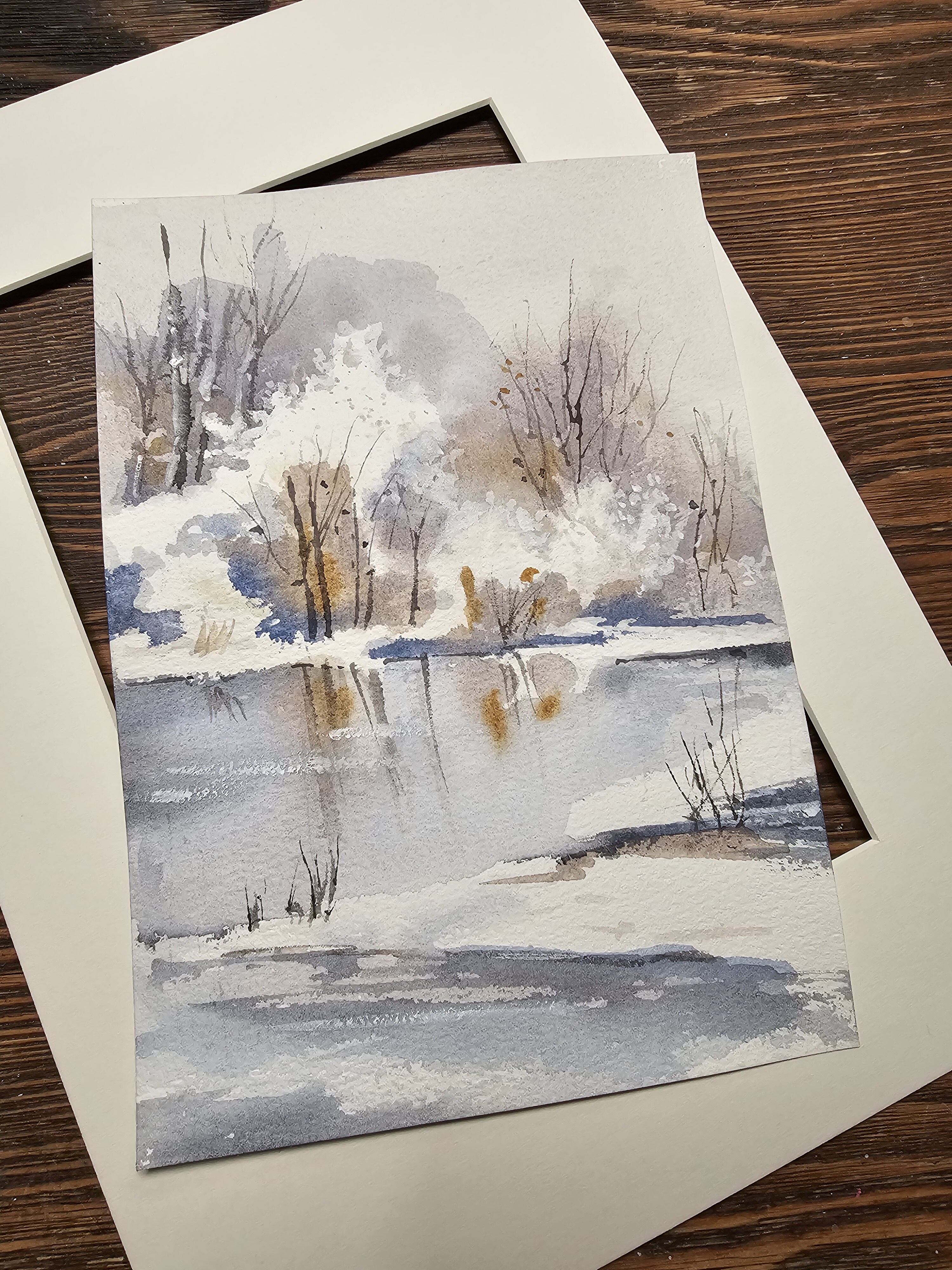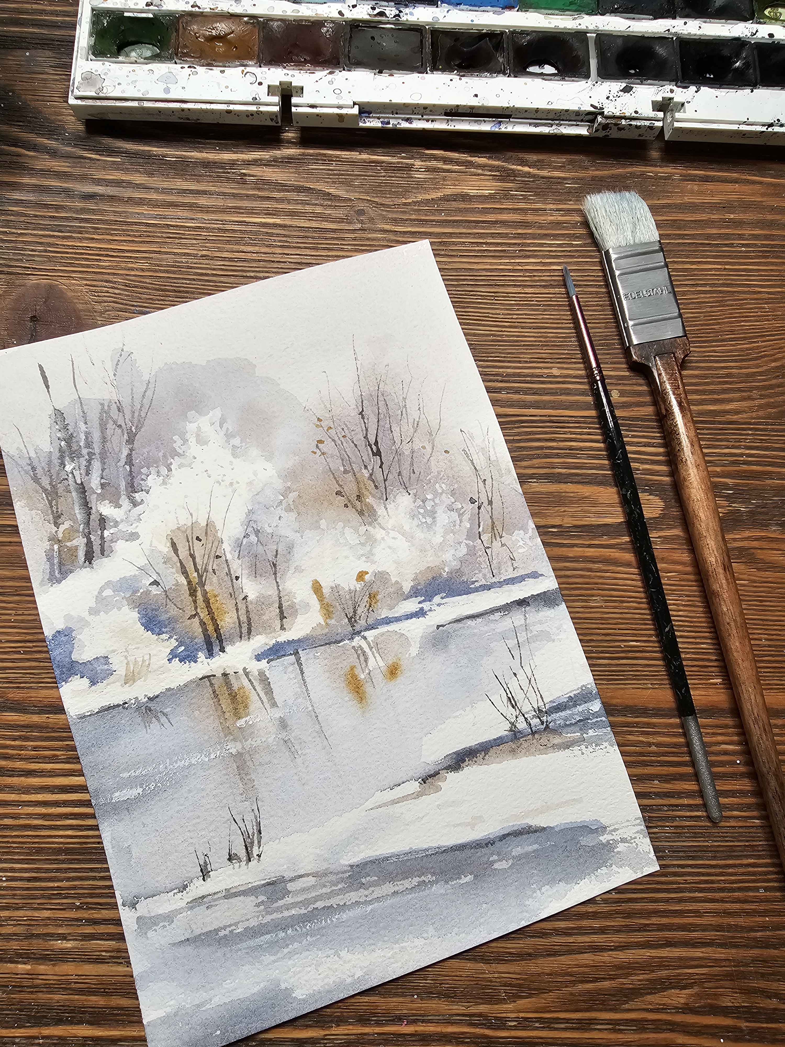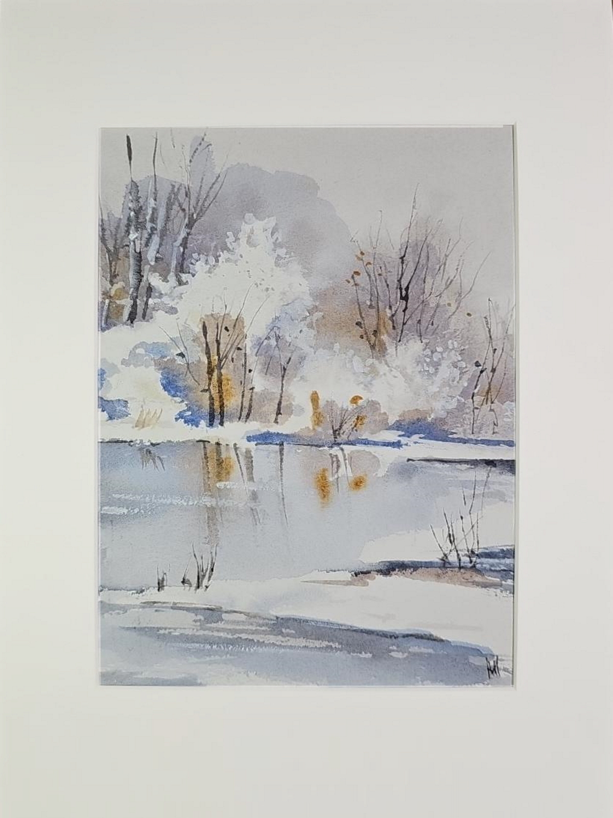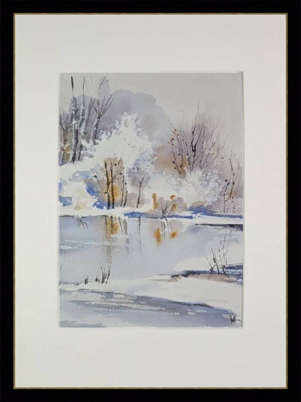 Нам представлена акварельная картина зимнего пейзажа. На переднем плане виден замерзший водоем, на поверхности которого отражаются деревья. Вдоль берега растут голые деревья и кустарники, покрытые снегом. Картина выполнена в холодных тонах, с преобладанием белого, серого и голубого цветов, что создает ощущение зимней тишины и покоя.