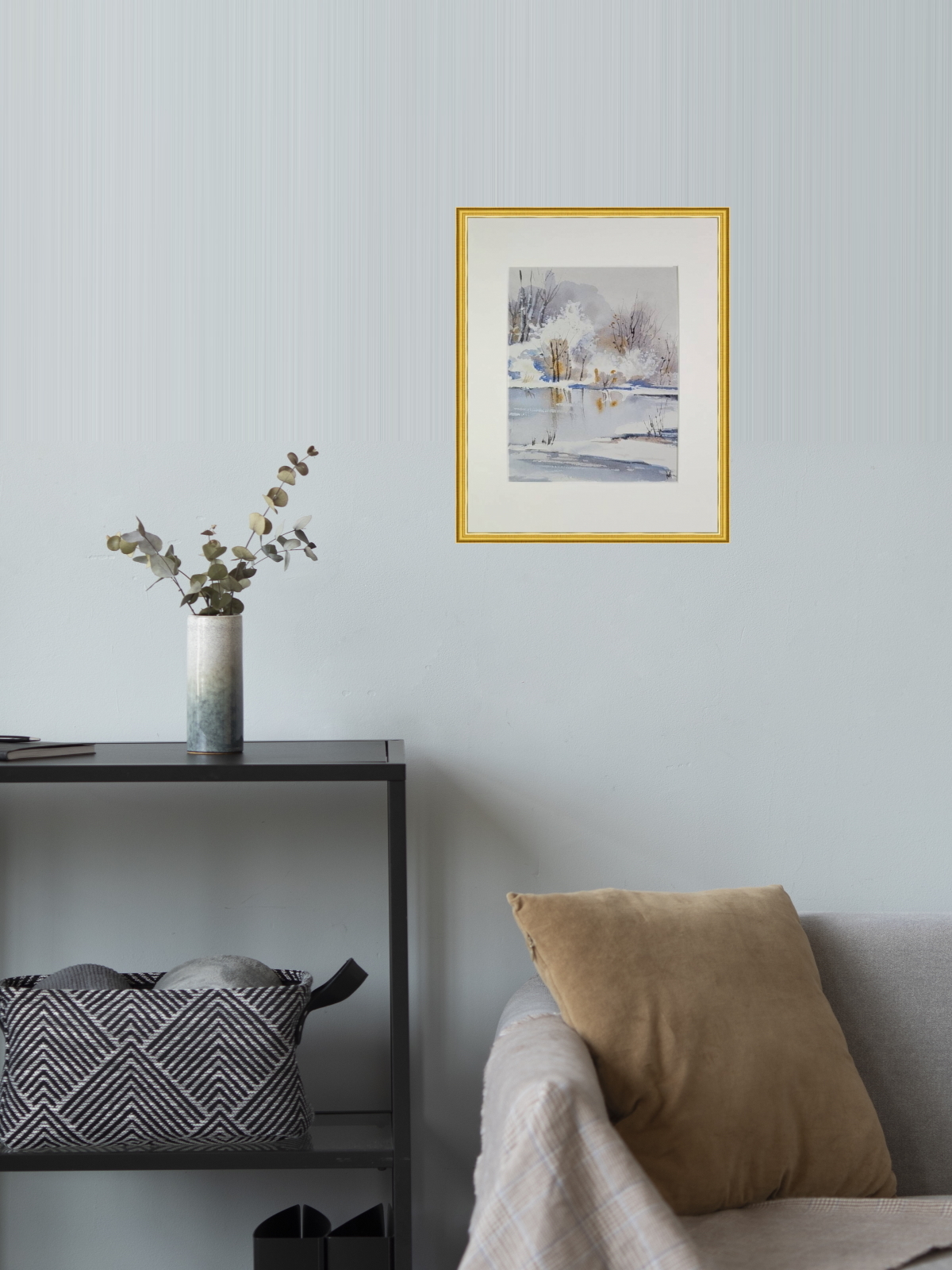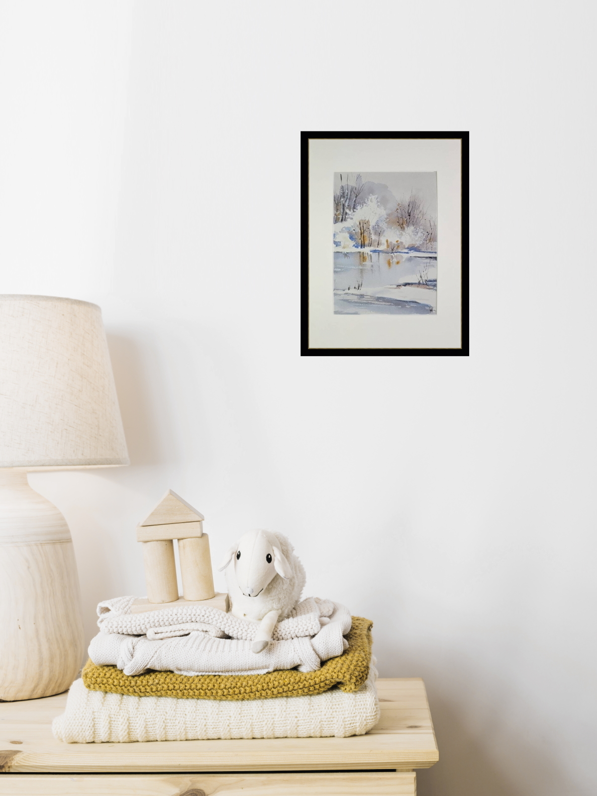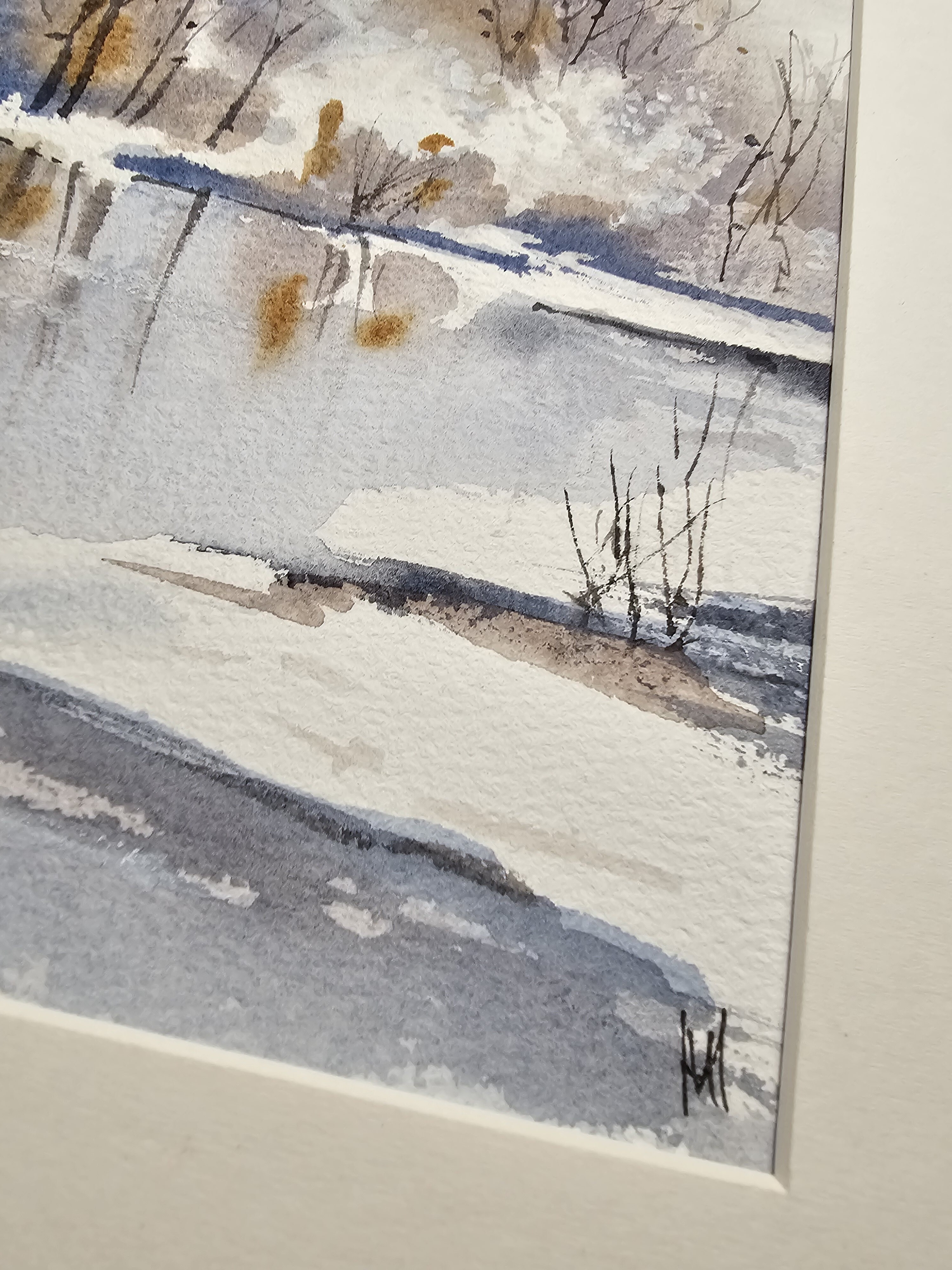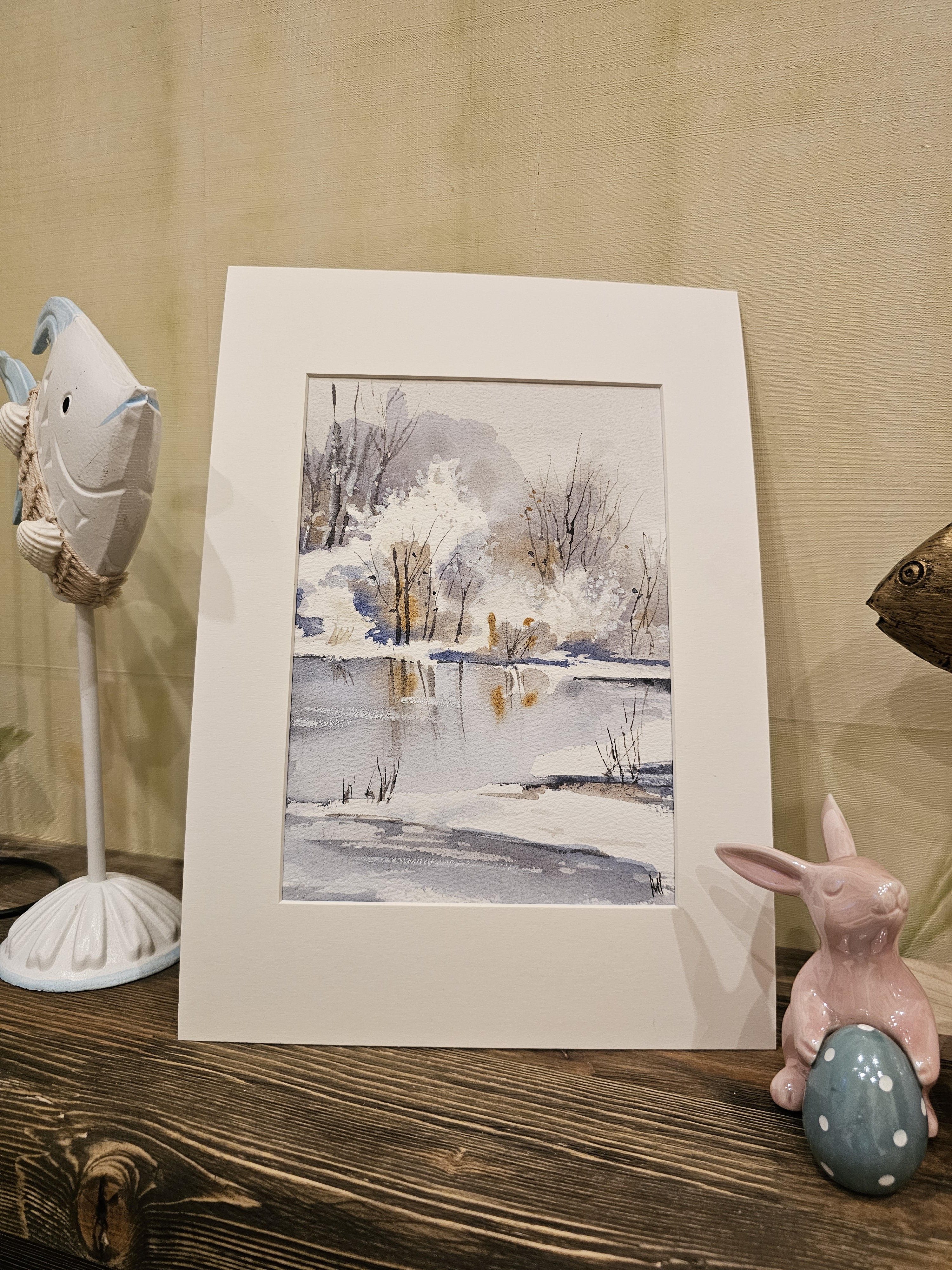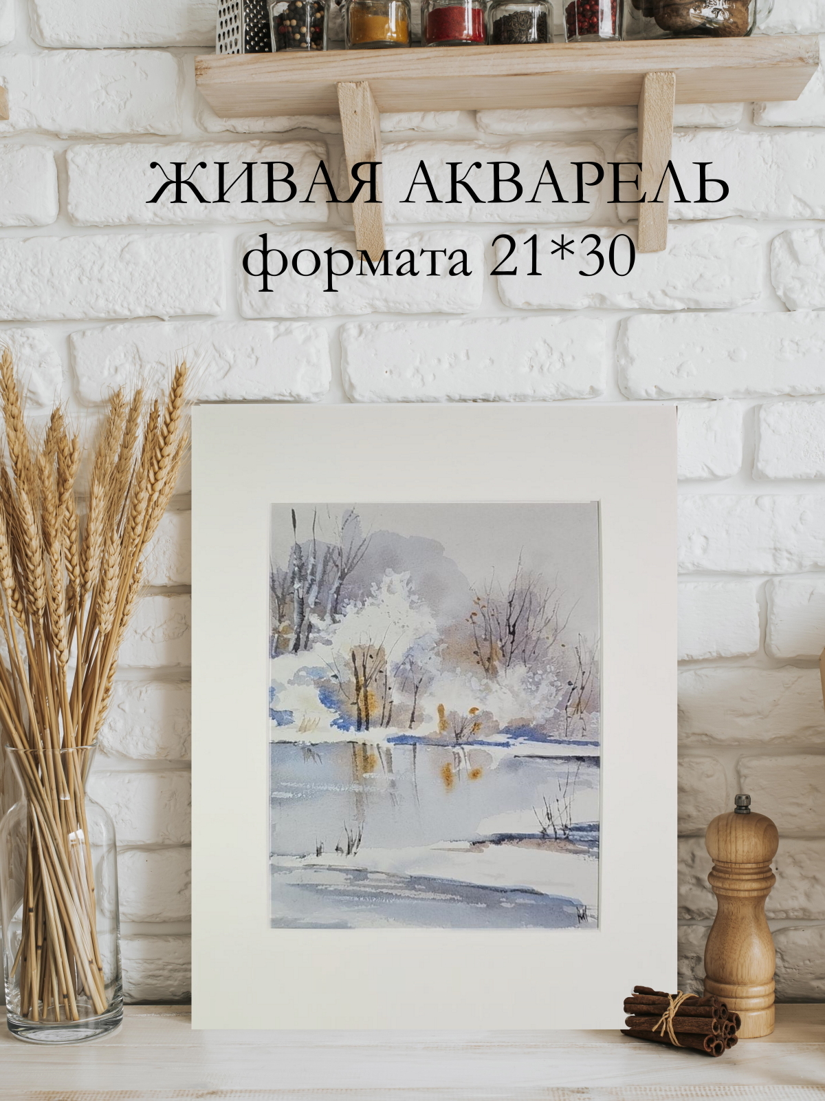 Нам представлена акварельная картина зимнего пейзажа. На переднем плане виден замерзший водоем, на поверхности которого отражаются деревья. Вдоль берега растут голые деревья и кустарники, покрытые снегом. Картина выполнена в холодных тонах, с преобладанием белого, серого и голубого цветов, что создает ощущение зимней тишины и покоя.