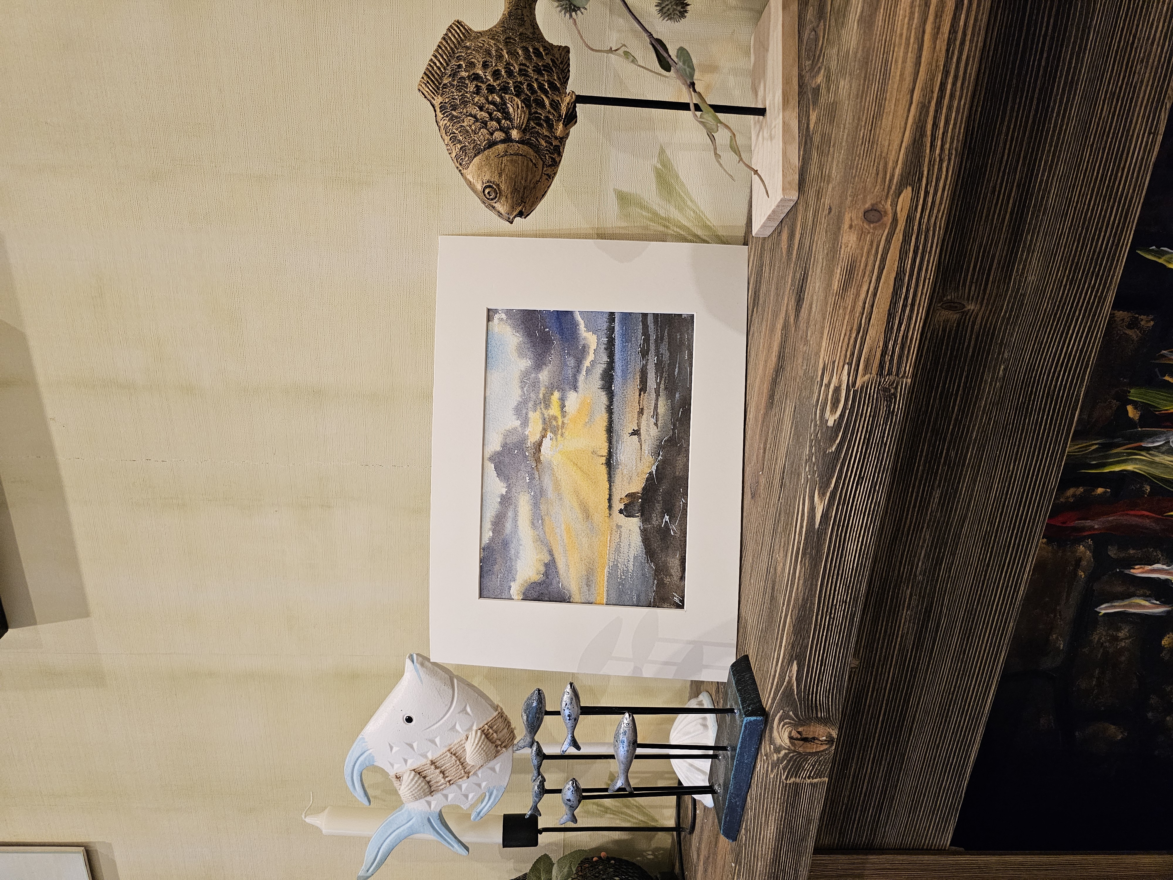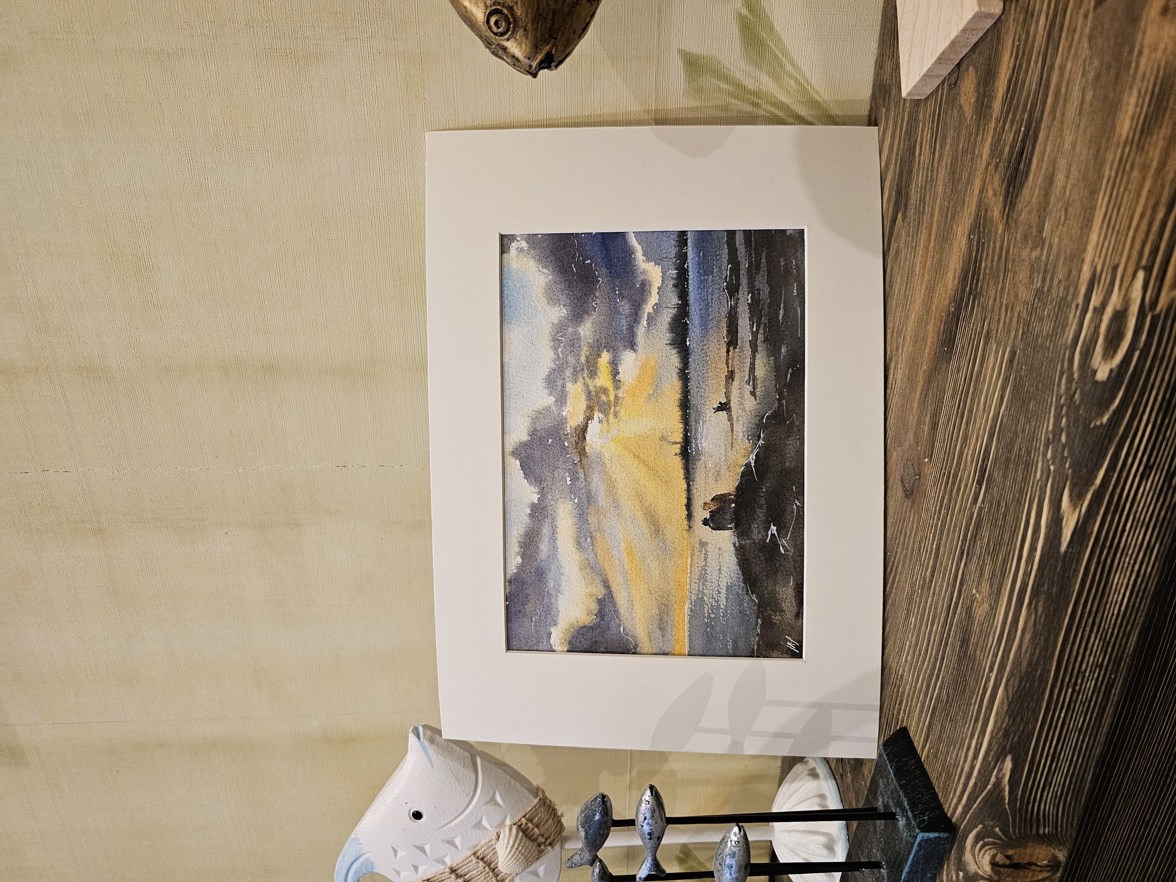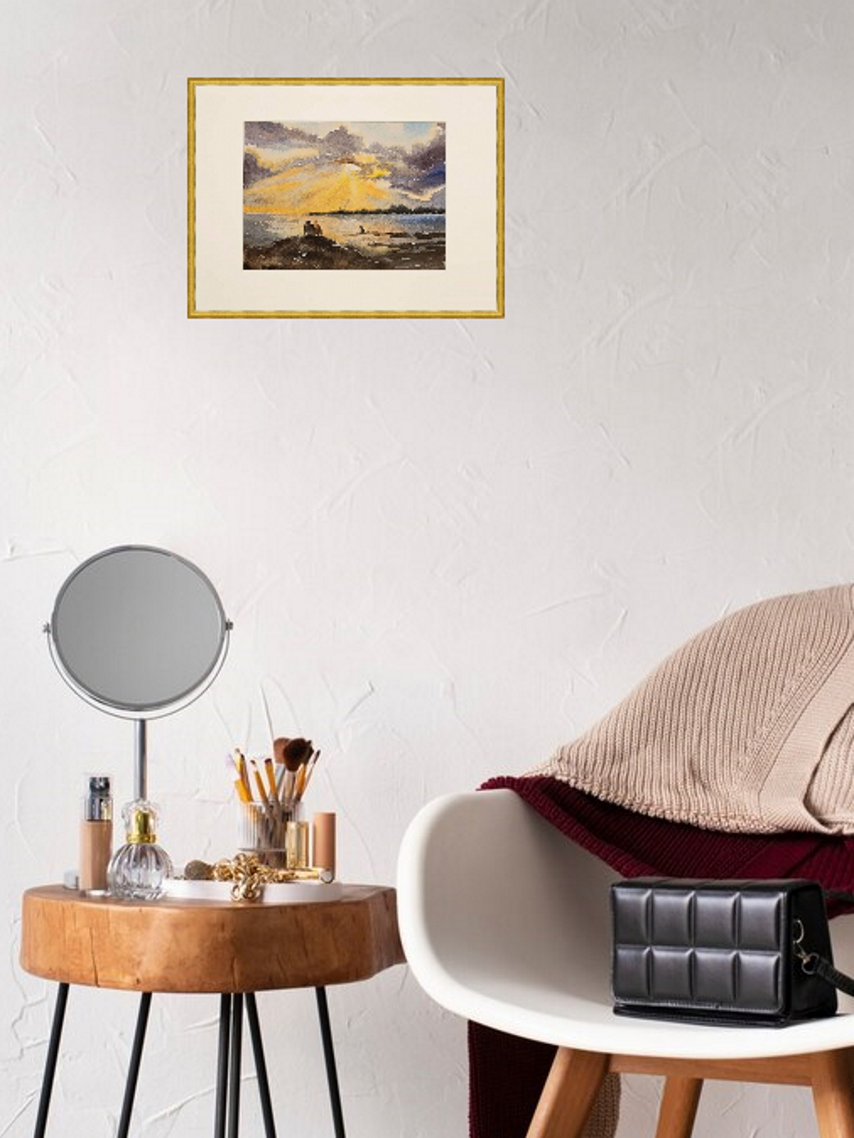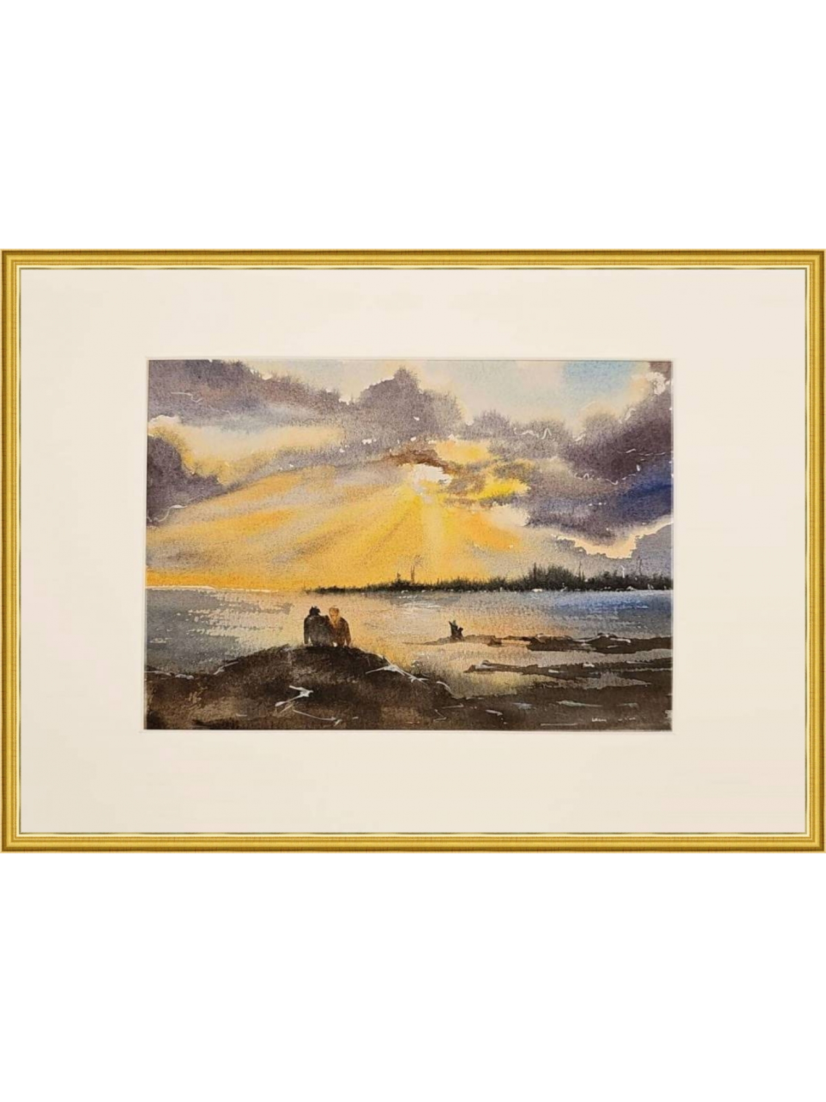 Нам представлена акварельная картина, изображающая закат над водоемом. На переднем плане видны две фигуры и собака. Пара, сидящая на камне у воды, вероятно, наблюдает закат. Солнце скрывается за горизонтом, создавая яркие лучи, которые пробиваются сквозь облака. Небо окрашено в теплые оттенки желтого, оранжевого и синего. На заднем плане виден силуэт берега. Картина создает атмосферу спокойствия и уединения. Картина оформлена в светлое паспарту и готова к оформлению в раму.