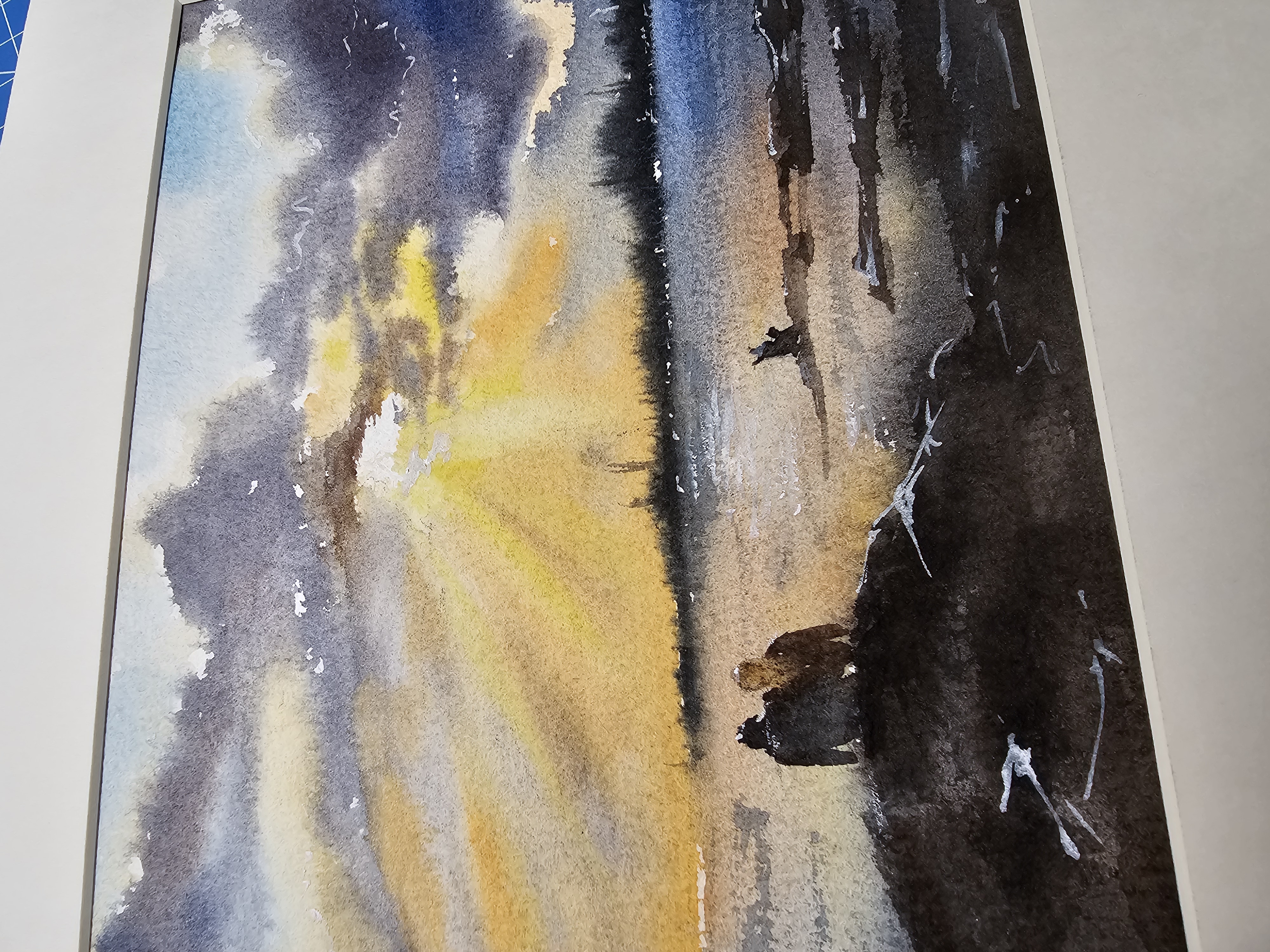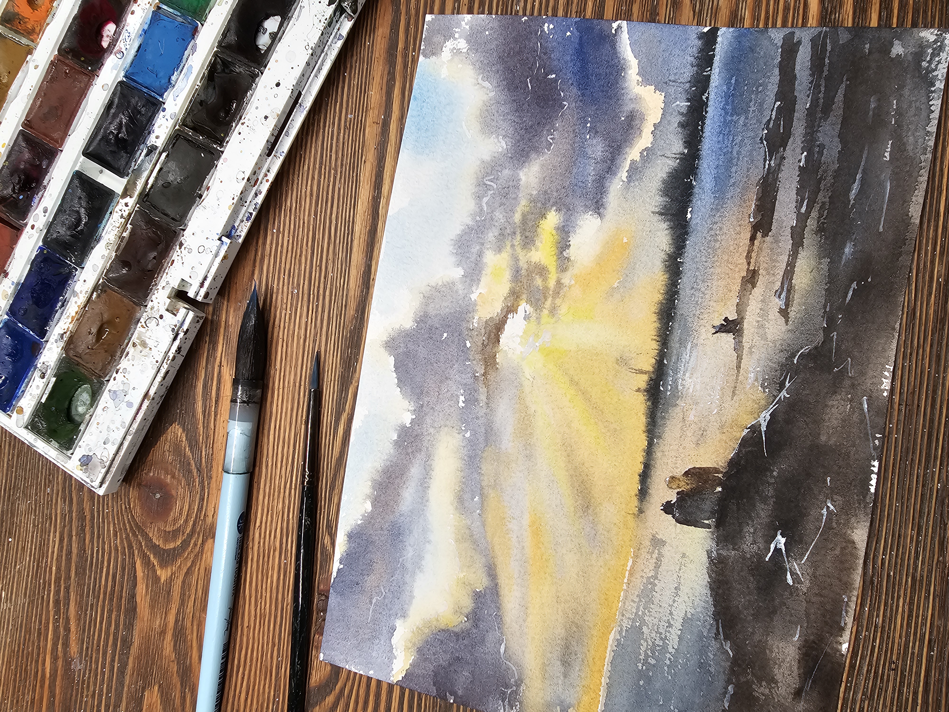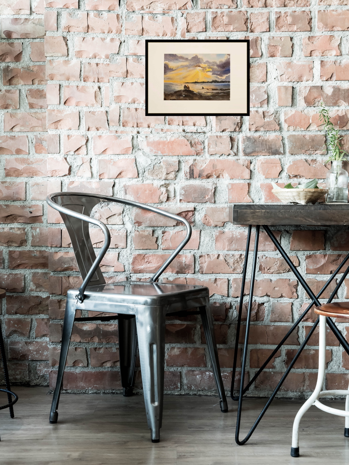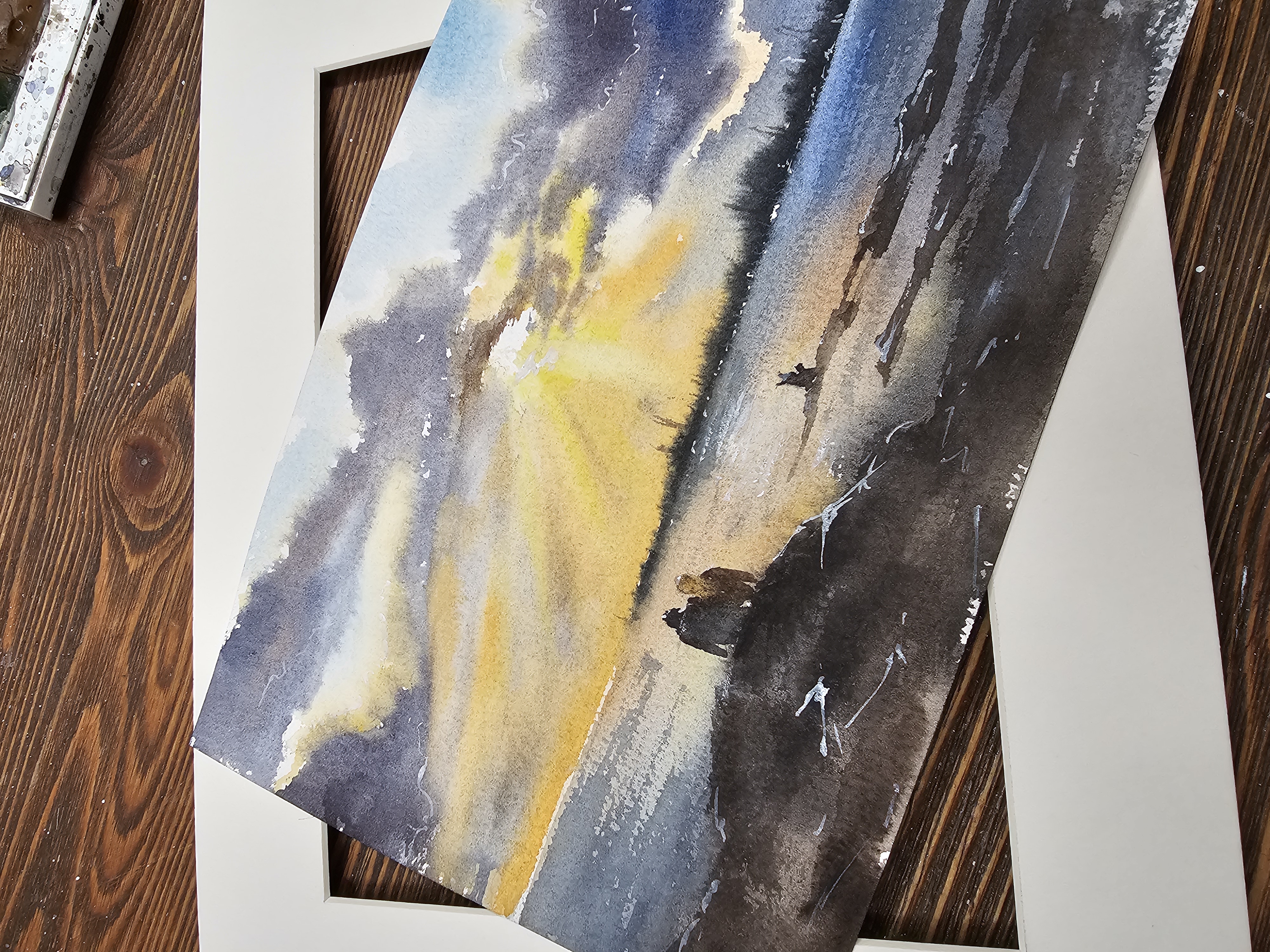 Нам представлена акварельная картина, изображающая закат над водоемом. На переднем плане видны две фигуры и собака. Пара, сидящая на камне у воды, вероятно, наблюдает закат. Солнце скрывается за горизонтом, создавая яркие лучи, которые пробиваются сквозь облака. Небо окрашено в теплые оттенки желтого, оранжевого и синего. На заднем плане виден силуэт берега. Картина создает атмосферу спокойствия и уединения. Картина оформлена в светлое паспарту и готова к оформлению в раму.