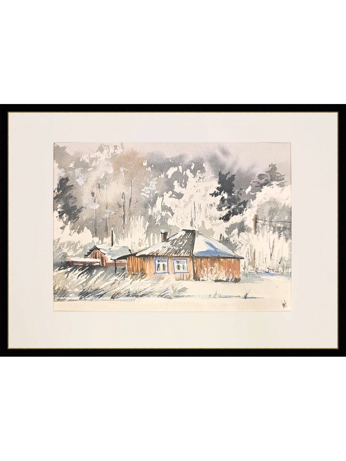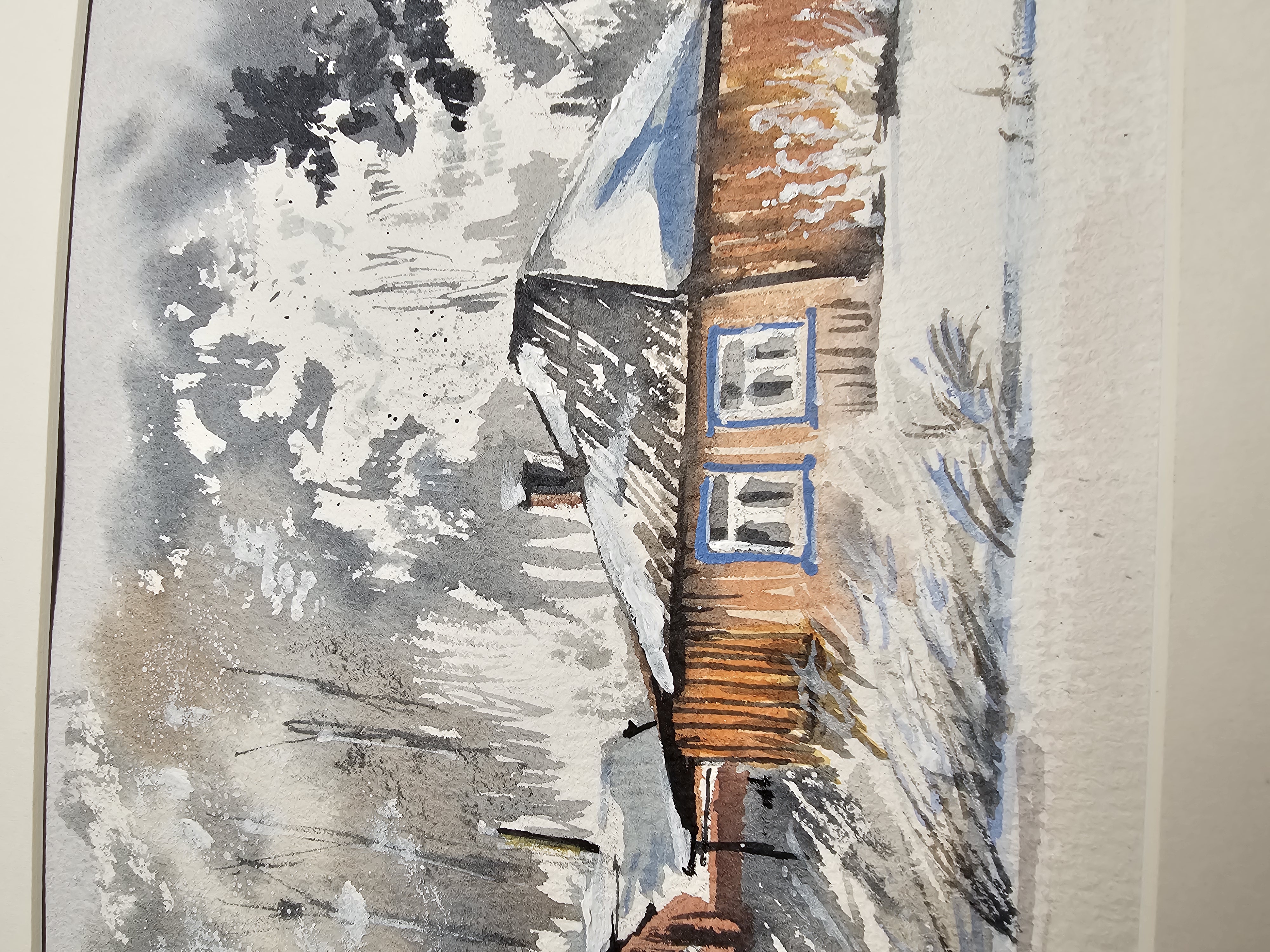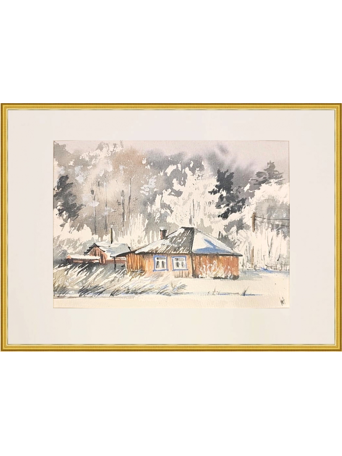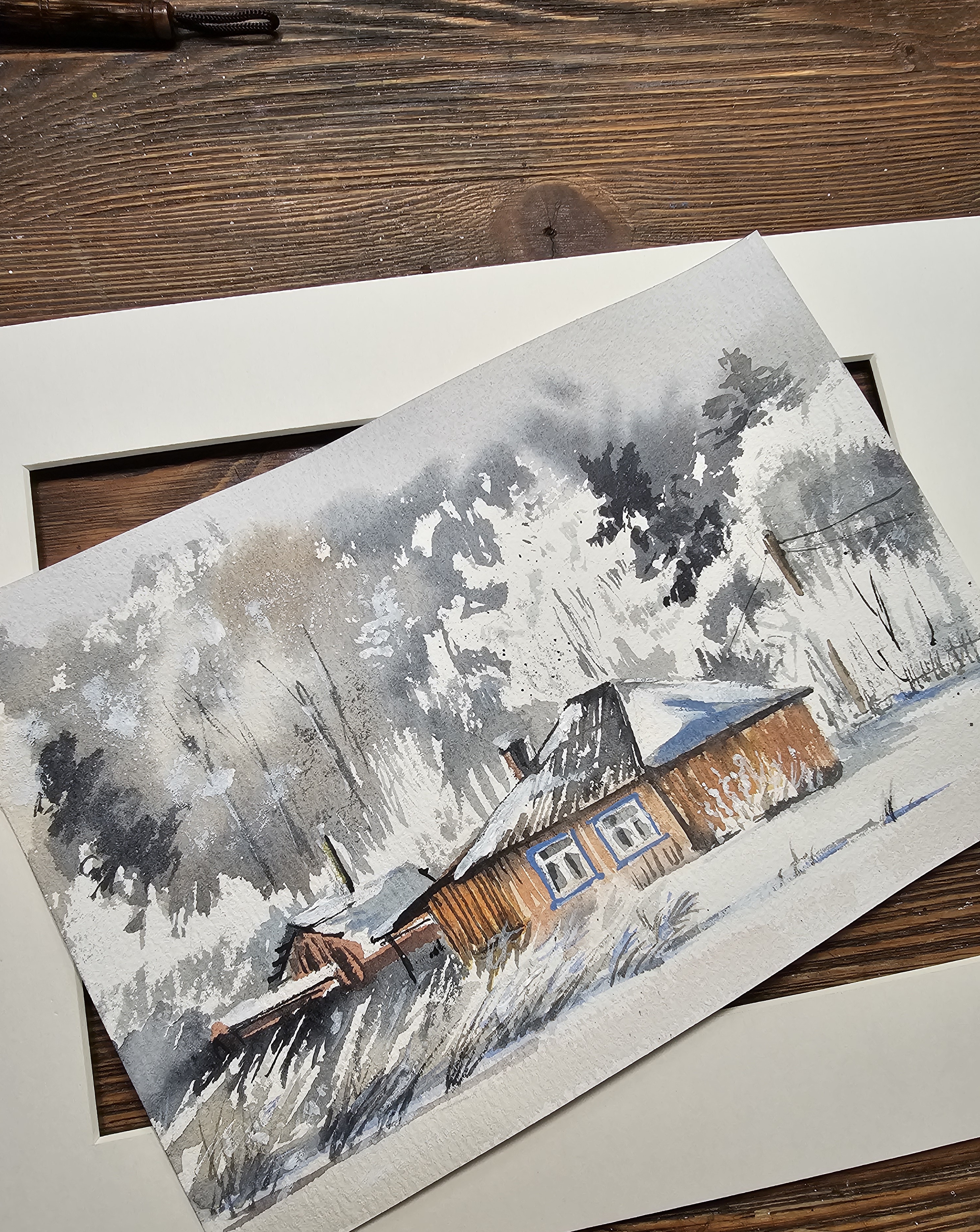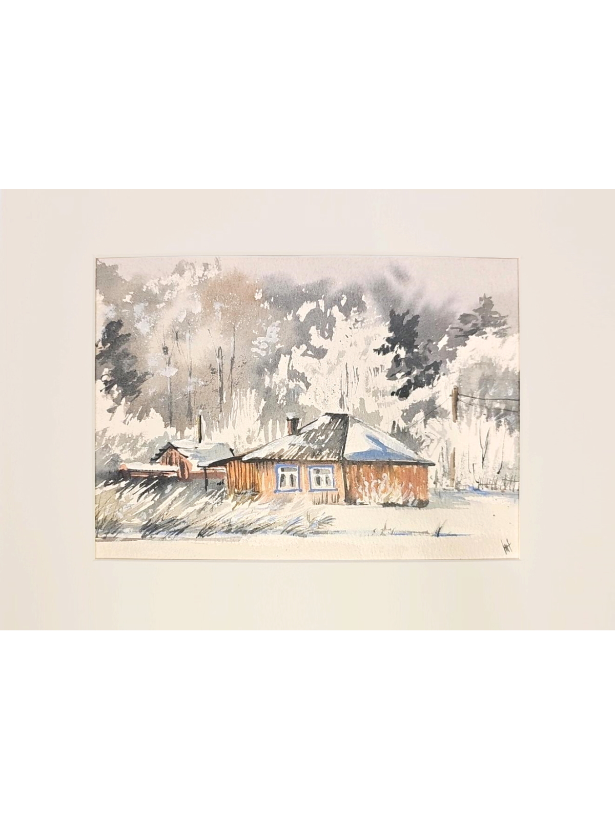Нам представлена акварельная картина, изображающая зимний пейзаж с деревянным домом. Дом имеет тёмную крышу, покрытую снегом, и светлые стены. Окно дома выделено голубым наличником. На заднем плане виден лес с деревьями, покрытыми снегом. Небо серое, создающее ощущение зимней пасмурной погоды. Впереди дома видна заснеженная земля с редкой травой. Картина выполнена в мягких, приглушённых тонах, что придаёт ей спокойное и умиротворяющее настроение.