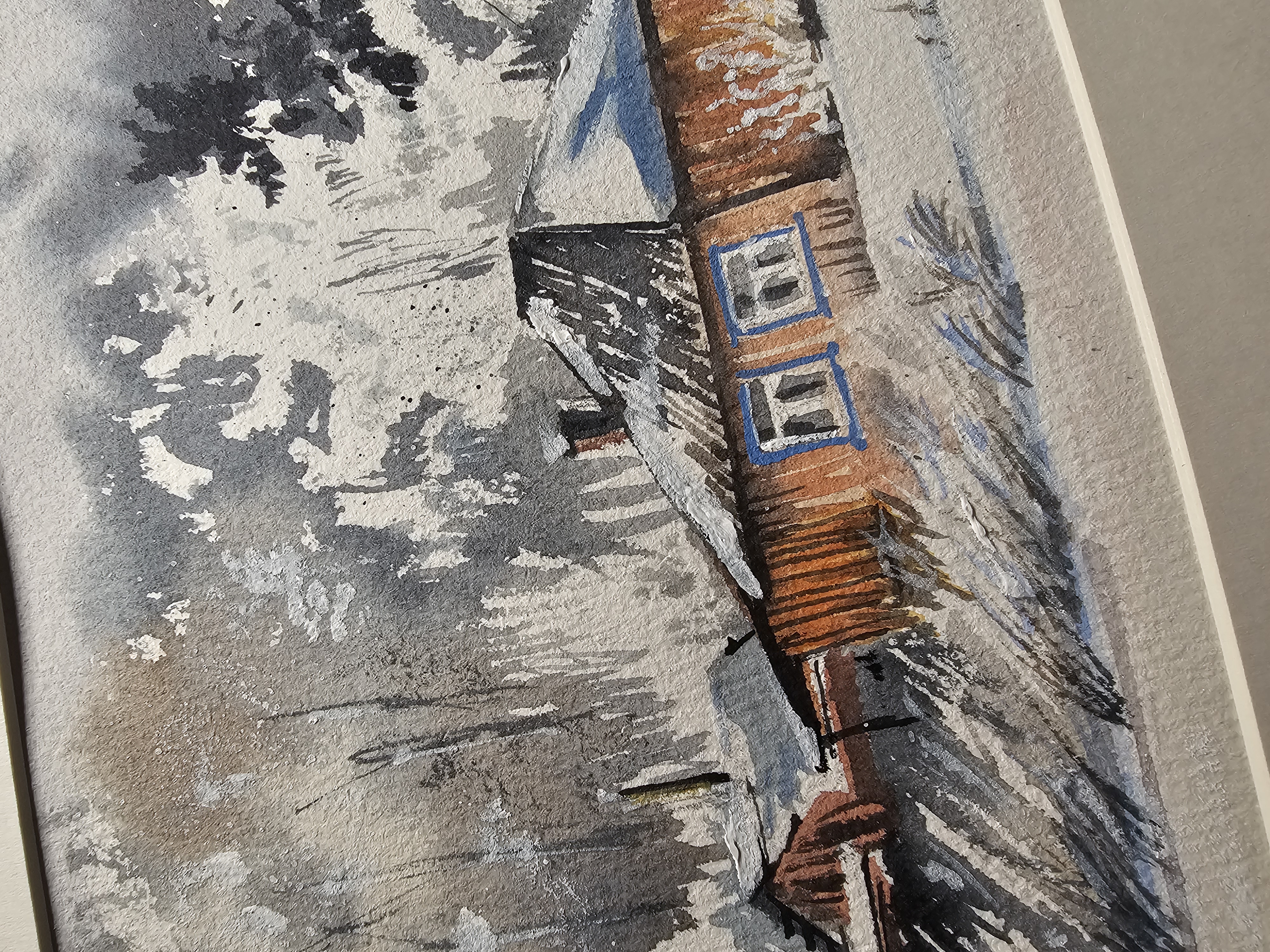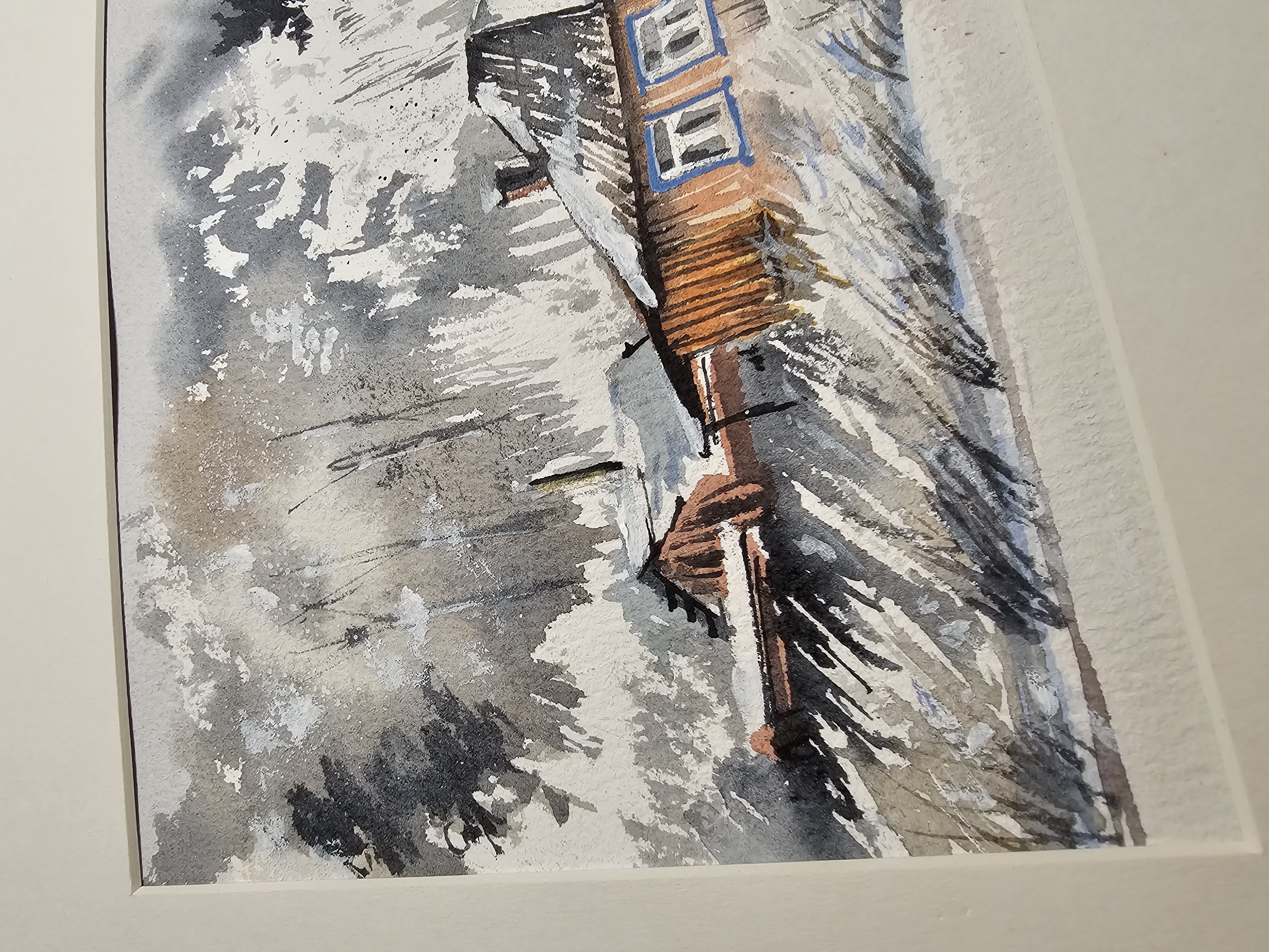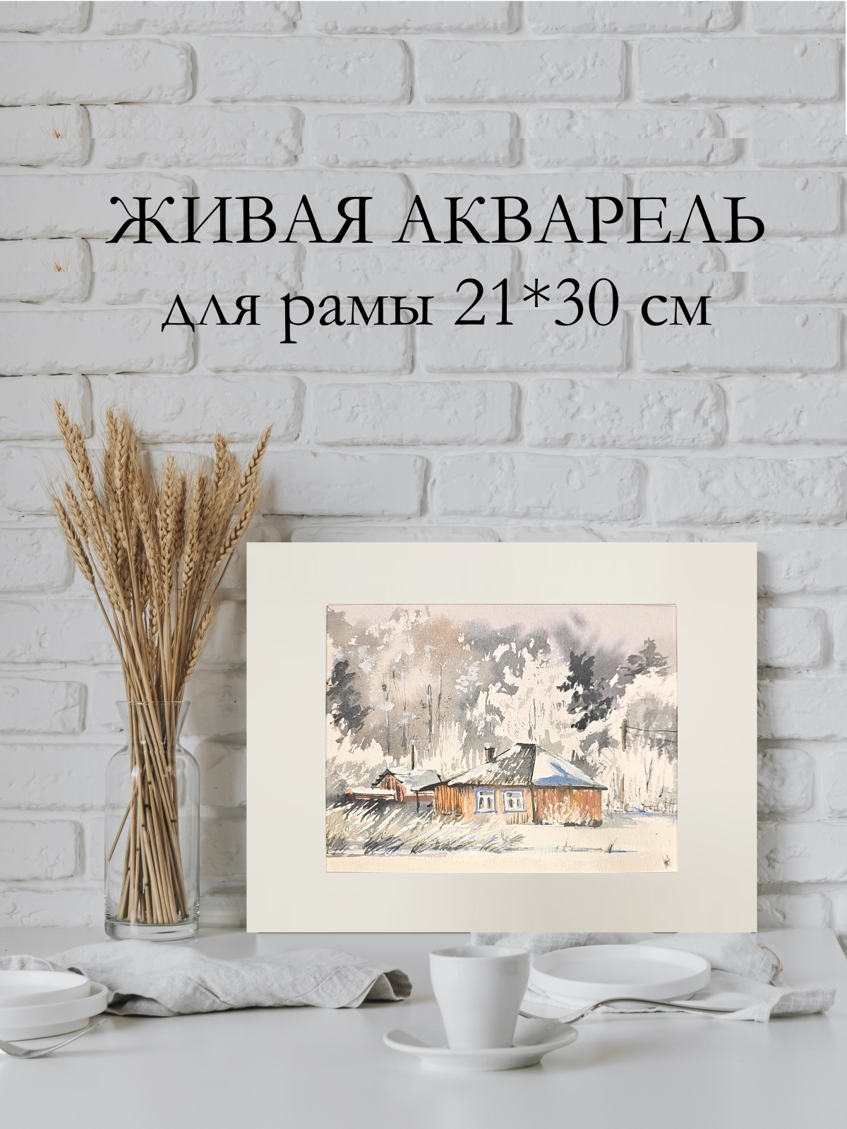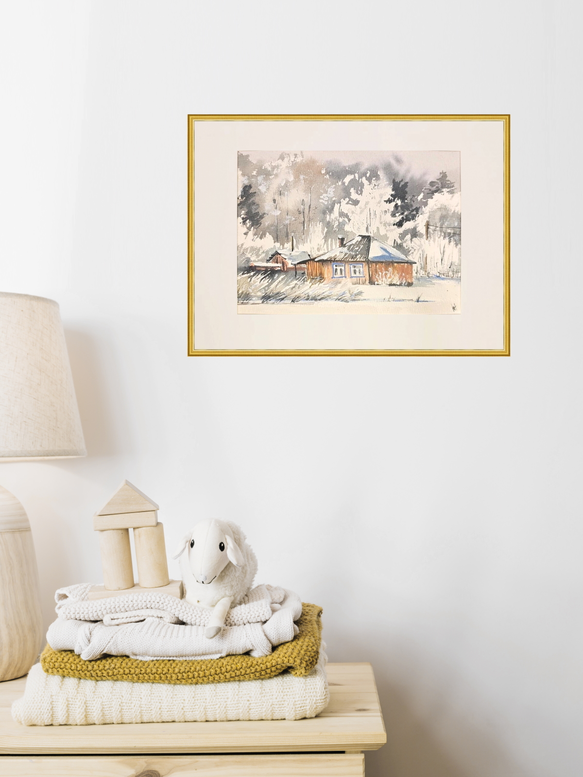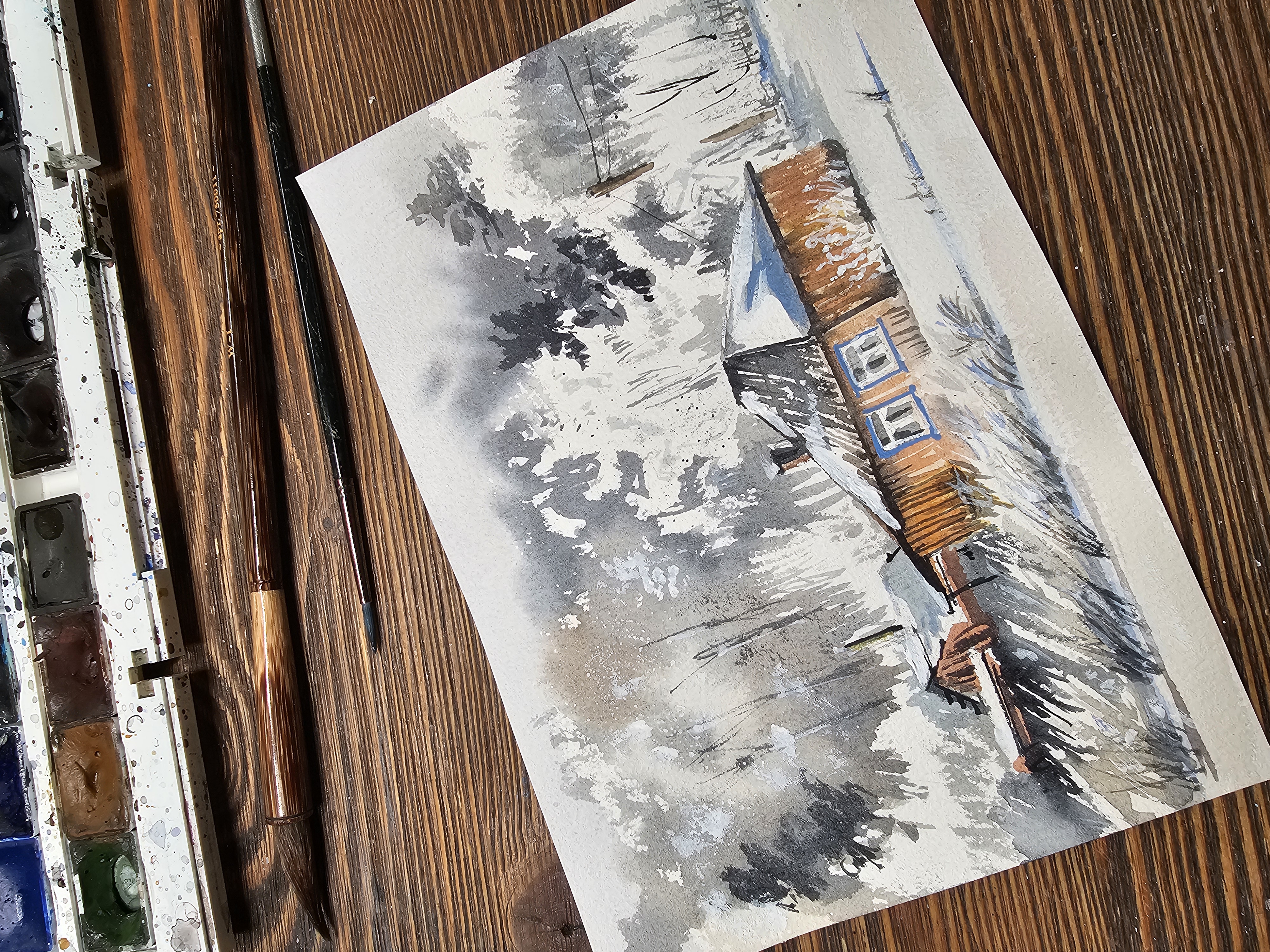 Нам представлена акварельная картина, изображающая зимний пейзаж с деревянным домом. Дом имеет тёмную крышу, покрытую снегом, и светлые стены. Окно дома выделено голубым наличником. На заднем плане виден лес с деревьями, покрытыми снегом. Небо серое, создающее ощущение зимней пасмурной погоды. Впереди дома видна заснеженная земля с редкой травой. Картина выполнена в мягких, приглушённых тонах, что придаёт ей спокойное и умиротворяющее настроение.