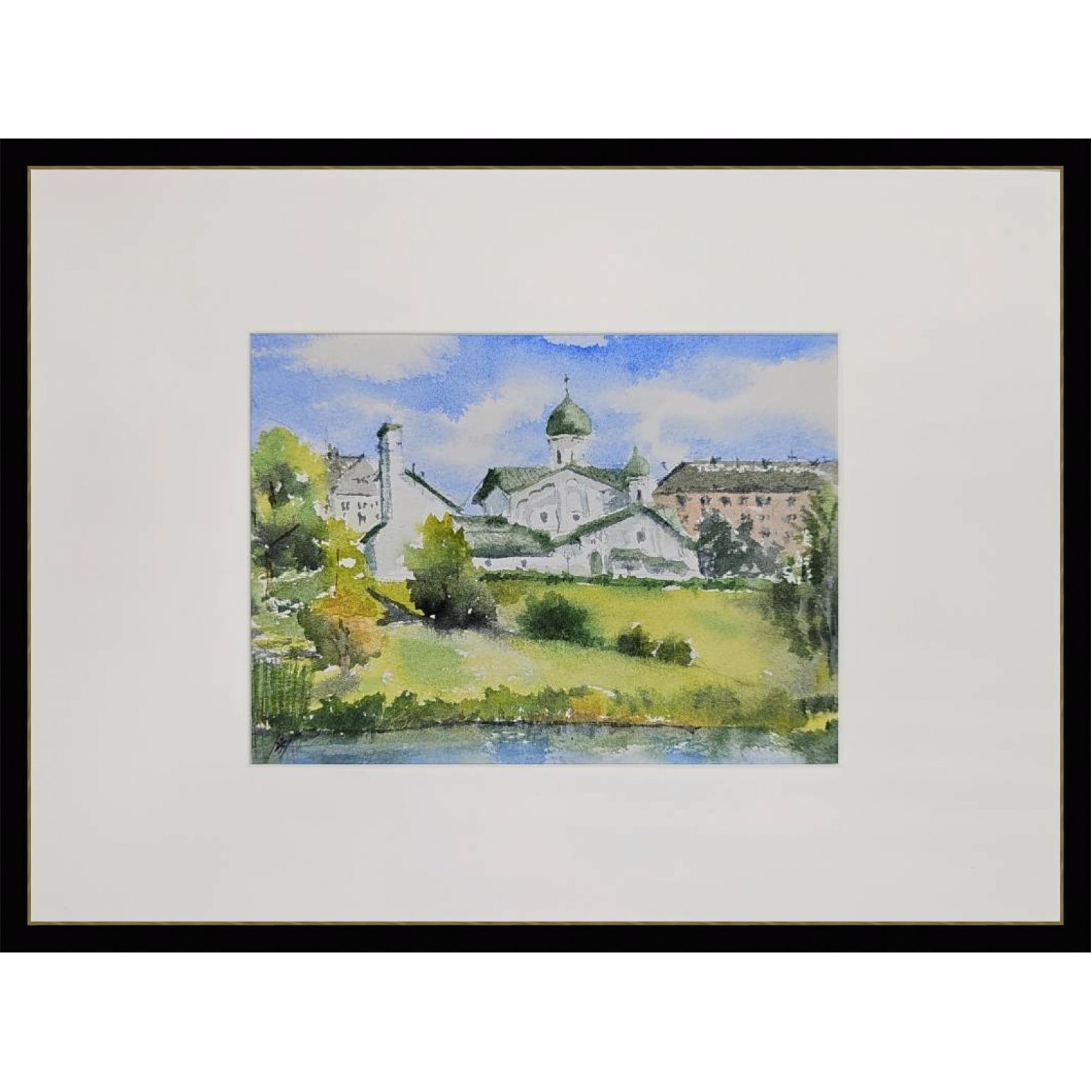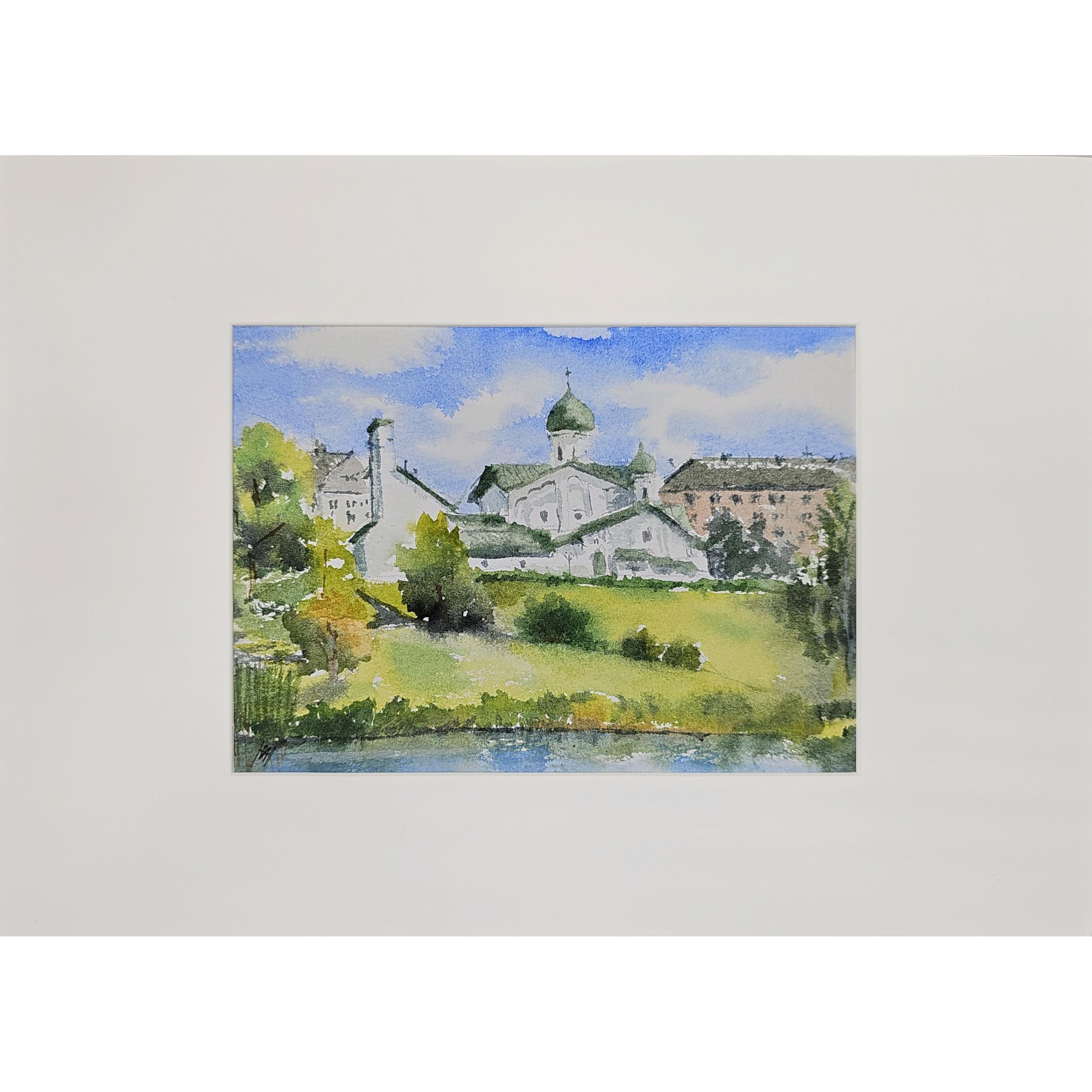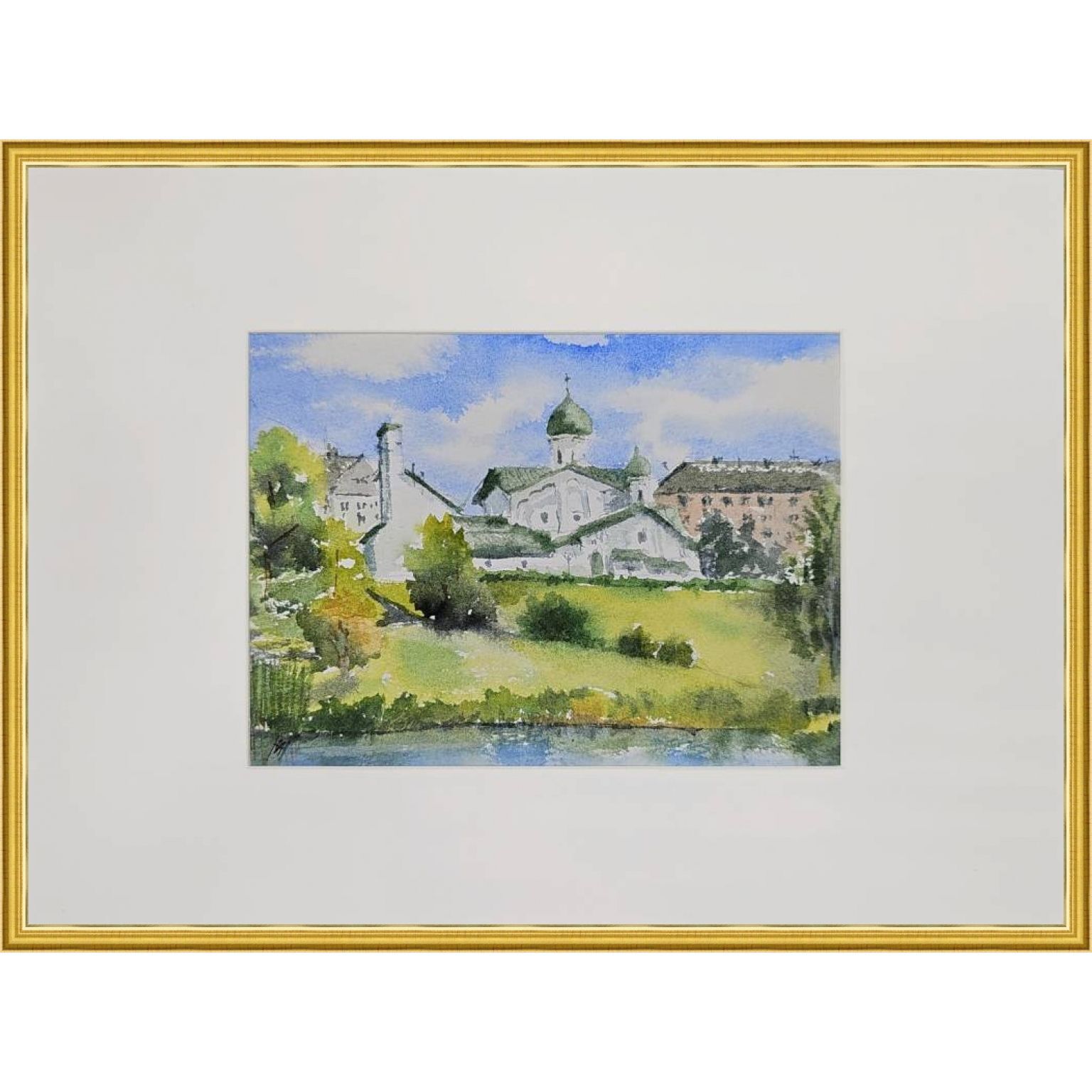 Перед нами акварельная картина с пейзажем. В центре картины изображена церковь с зелёными куполами. На переднем плане зелёная лужайка с деревьями и кустарниками. В левом верхнем углу картины изображены здания, окружённые деревьями. На горизонте виден голубой небосвод с лёгкими облаками. Картина выполнена в светлых и мягких тонах, создавая ощущение спокойствия и умиротворения. Этот вид был написан на летней веранды ресторана Гельд в Пскове.