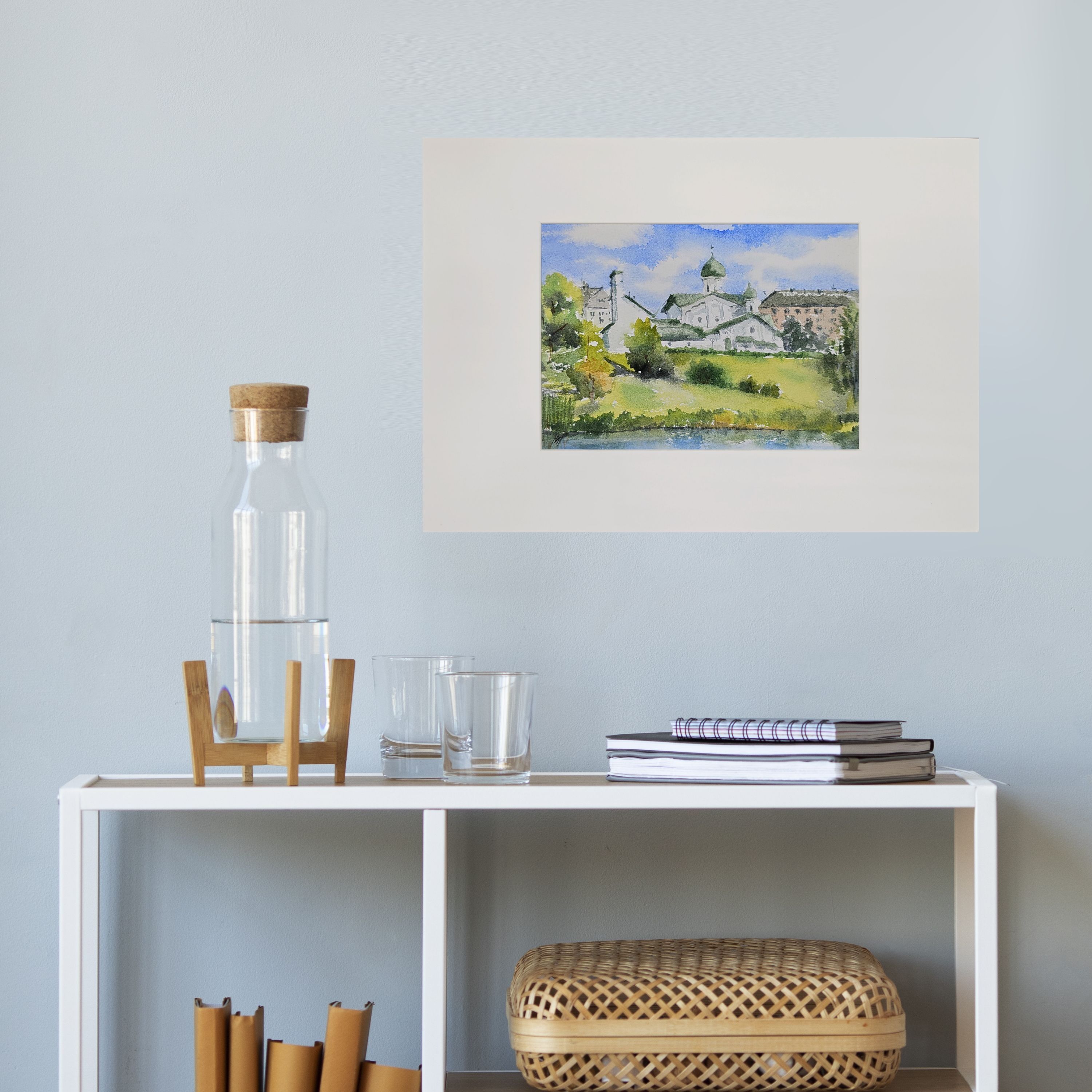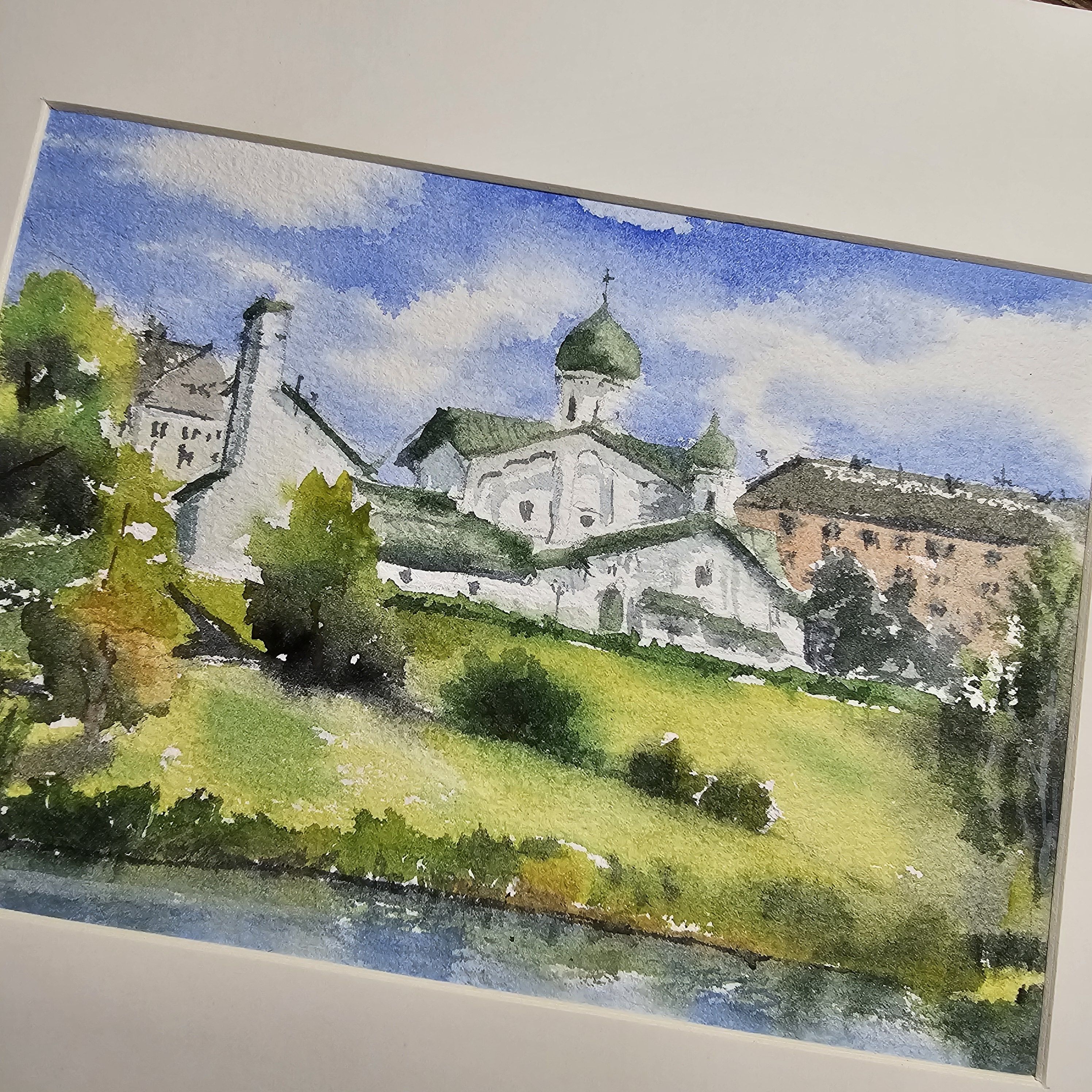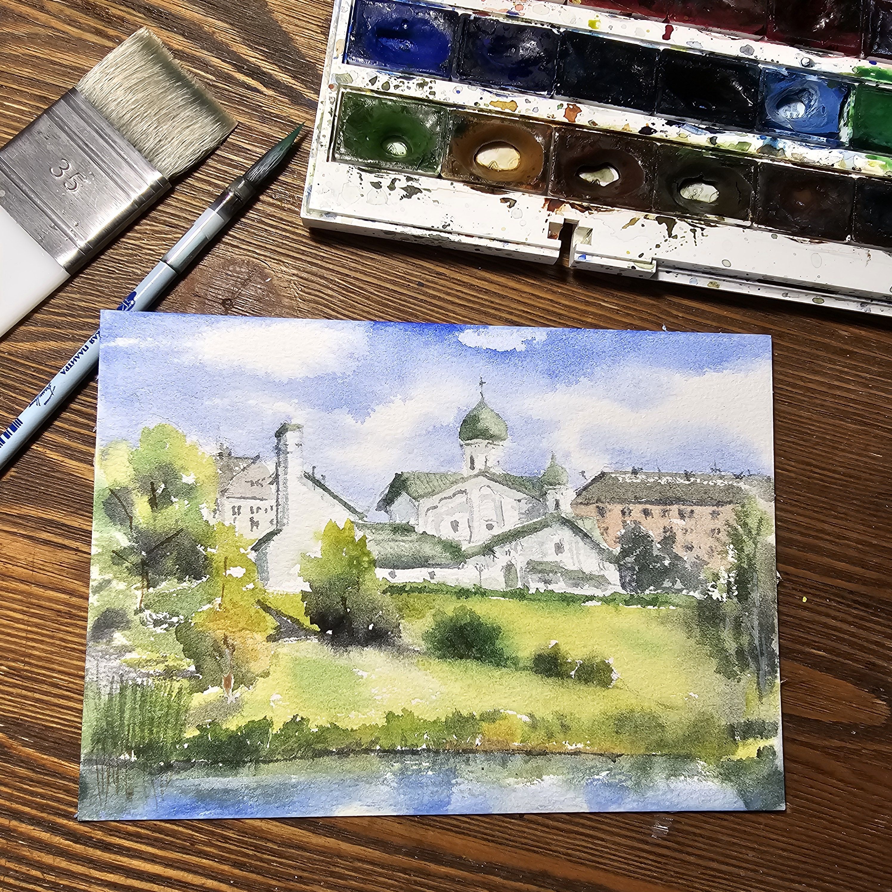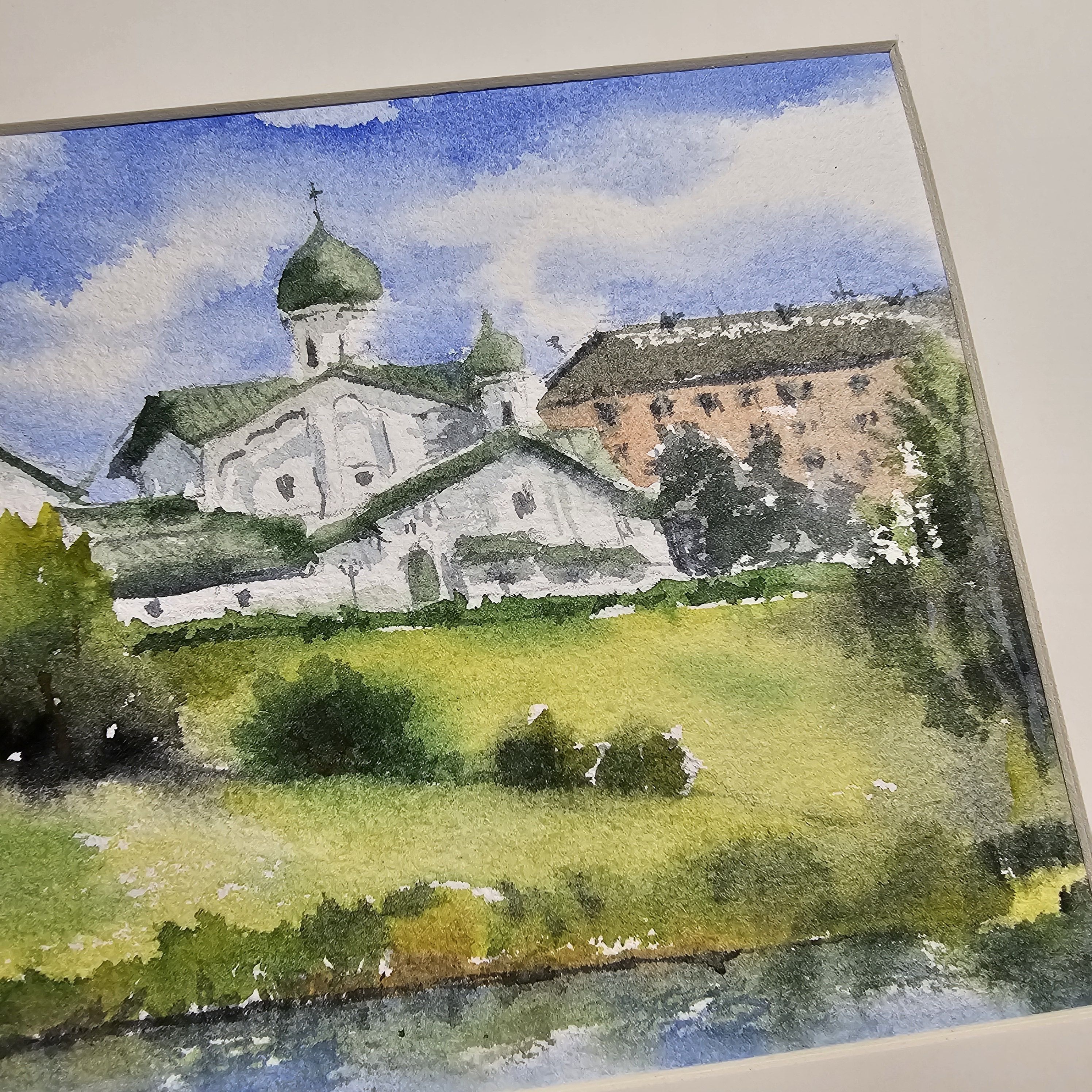 Перед нами акварельная картина с пейзажем. В центре картины изображена церковь с зелёными куполами. На переднем плане зелёная лужайка с деревьями и кустарниками. В левом верхнем углу картины изображены здания, окружённые деревьями. На горизонте виден голубой небосвод с лёгкими облаками. Картина выполнена в светлых и мягких тонах, создавая ощущение спокойствия и умиротворения. Этот вид был написан на летней веранды ресторана Гельд в Пскове.